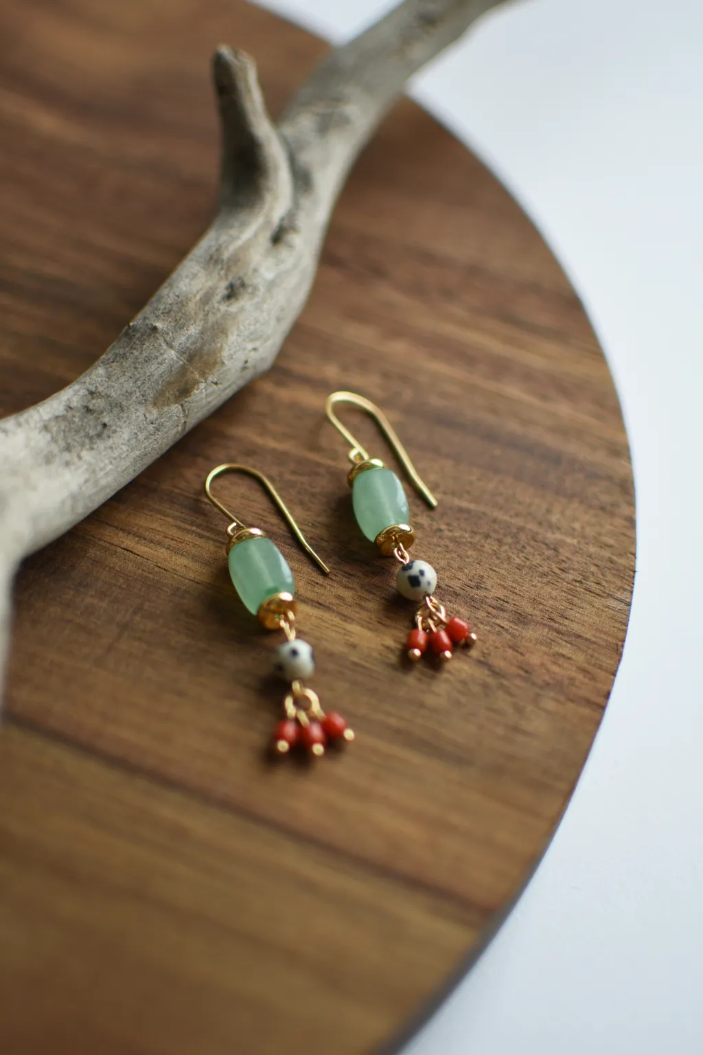 Яркие серьги с зелёным авантюрином, порфиром (яшма далматин) и кораллом.