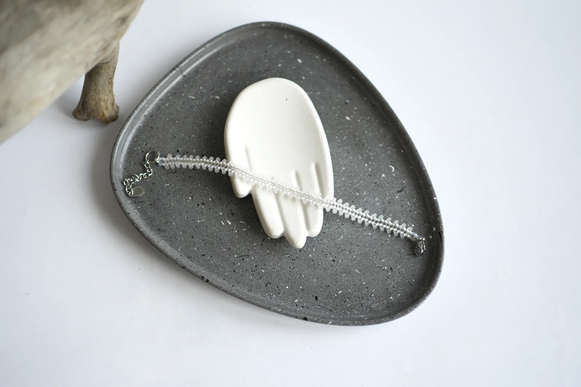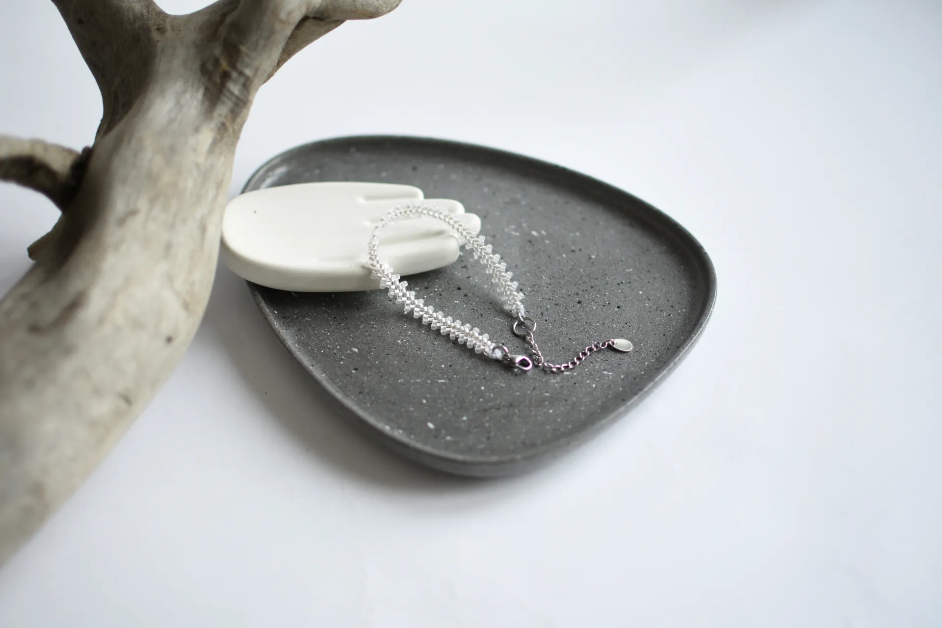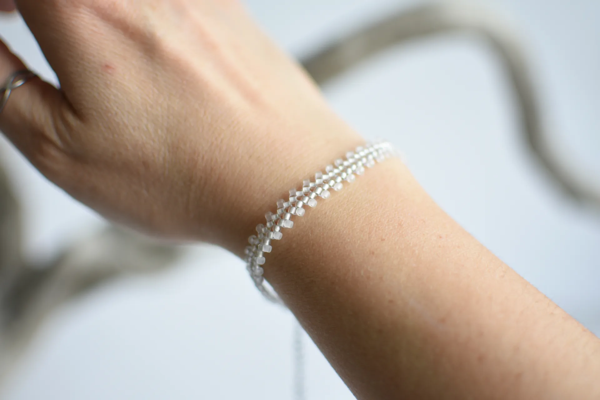 Нежный тонкий браслет из матового серебристого и полупрозрачного белого бисера.