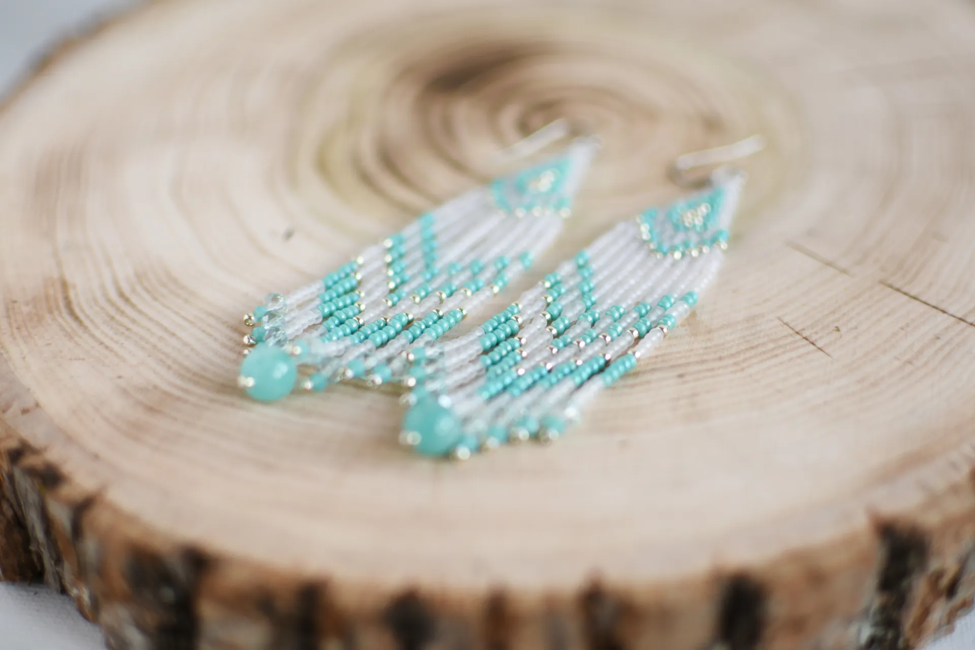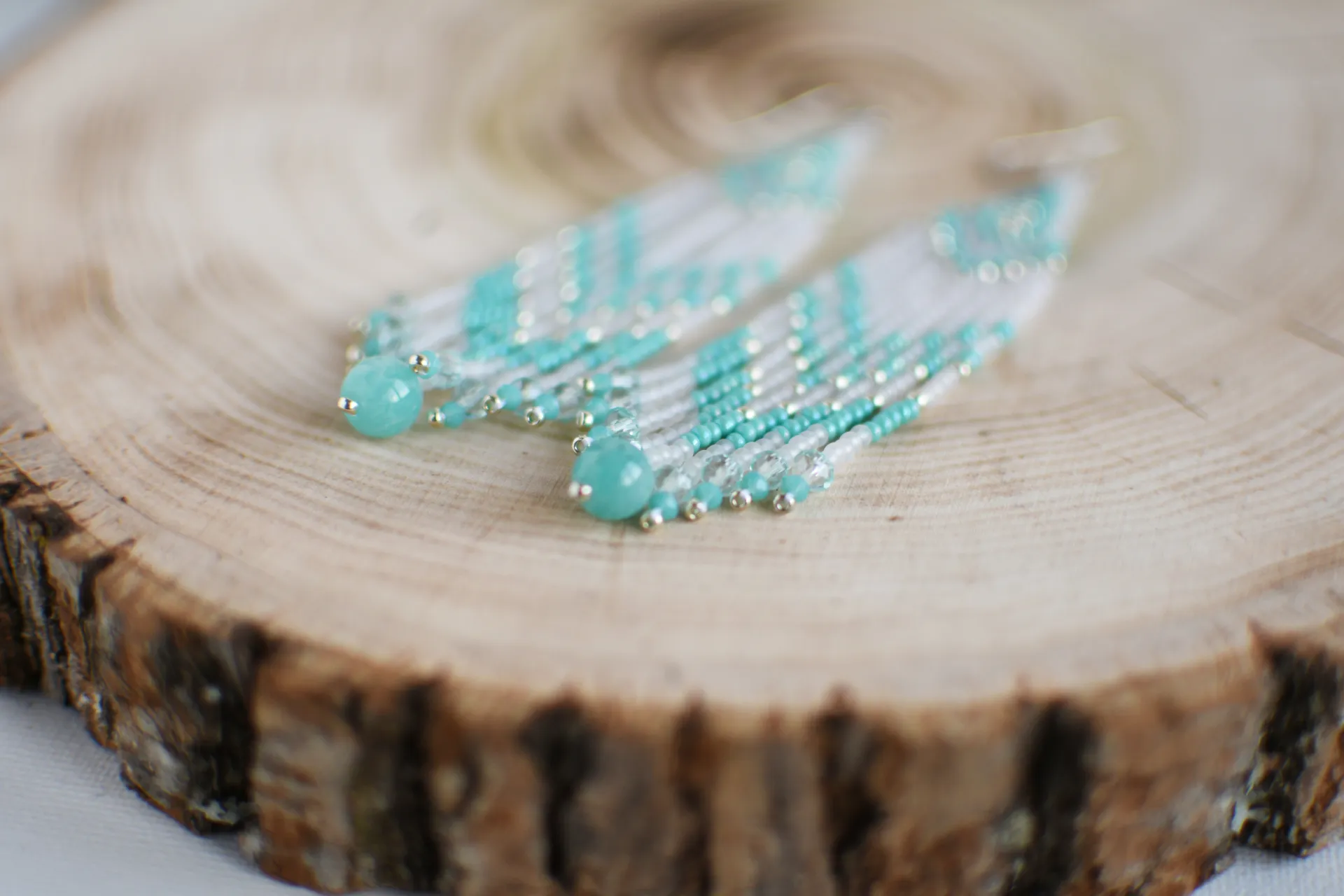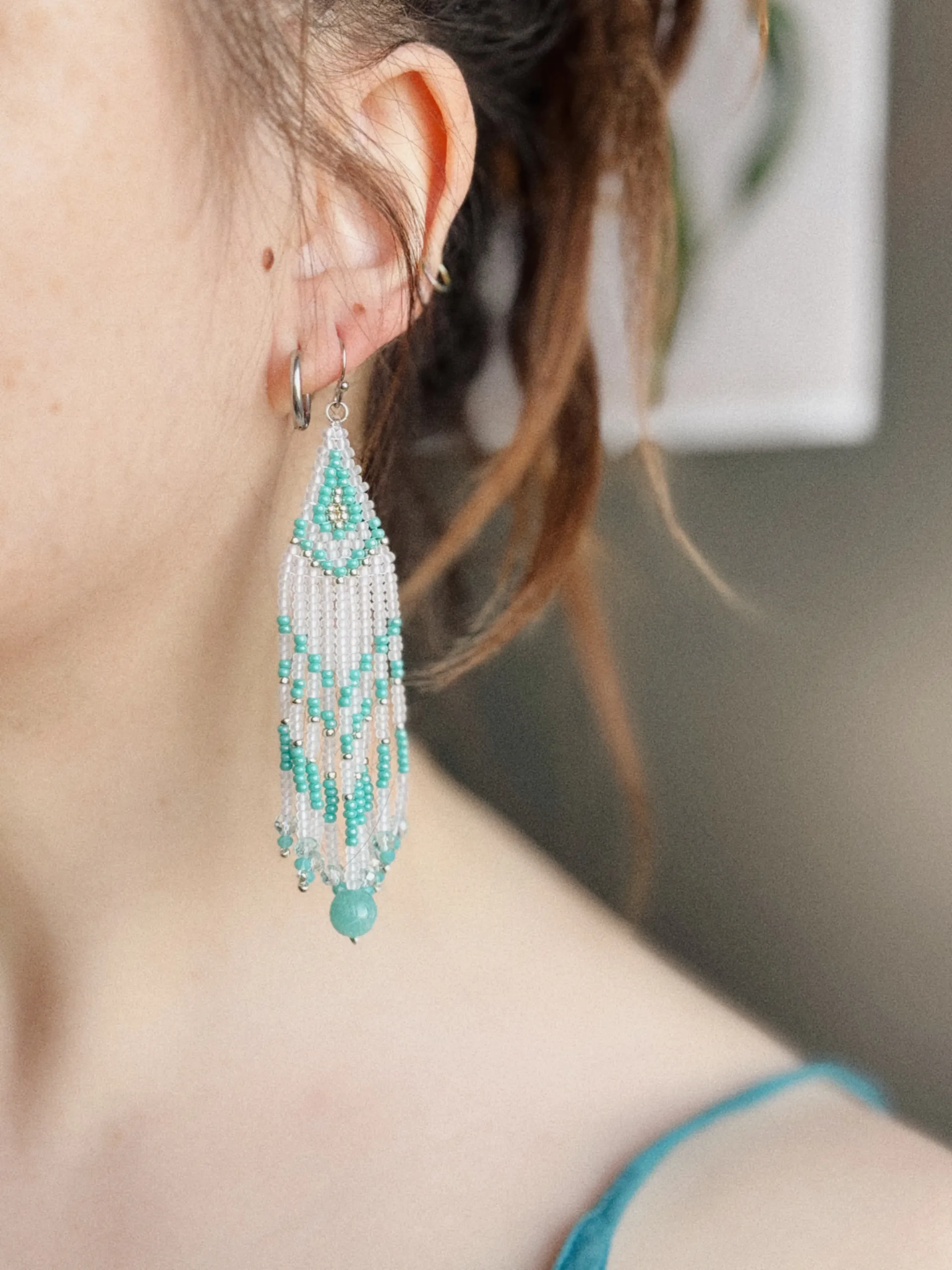 Яркие серьги из полупрозрачного матового и бирюзового бисера. Бахрома дополнена стеклянными бусинами и бусиной яркого амазонита.