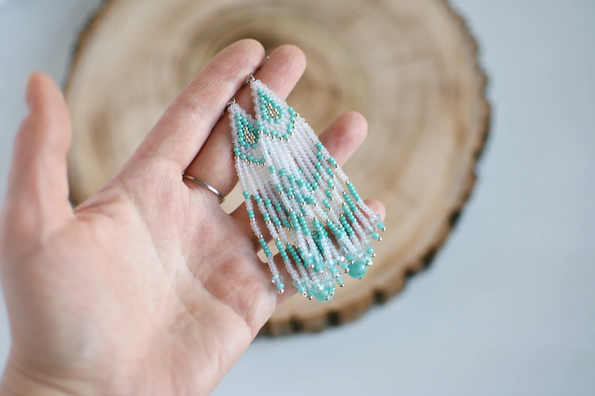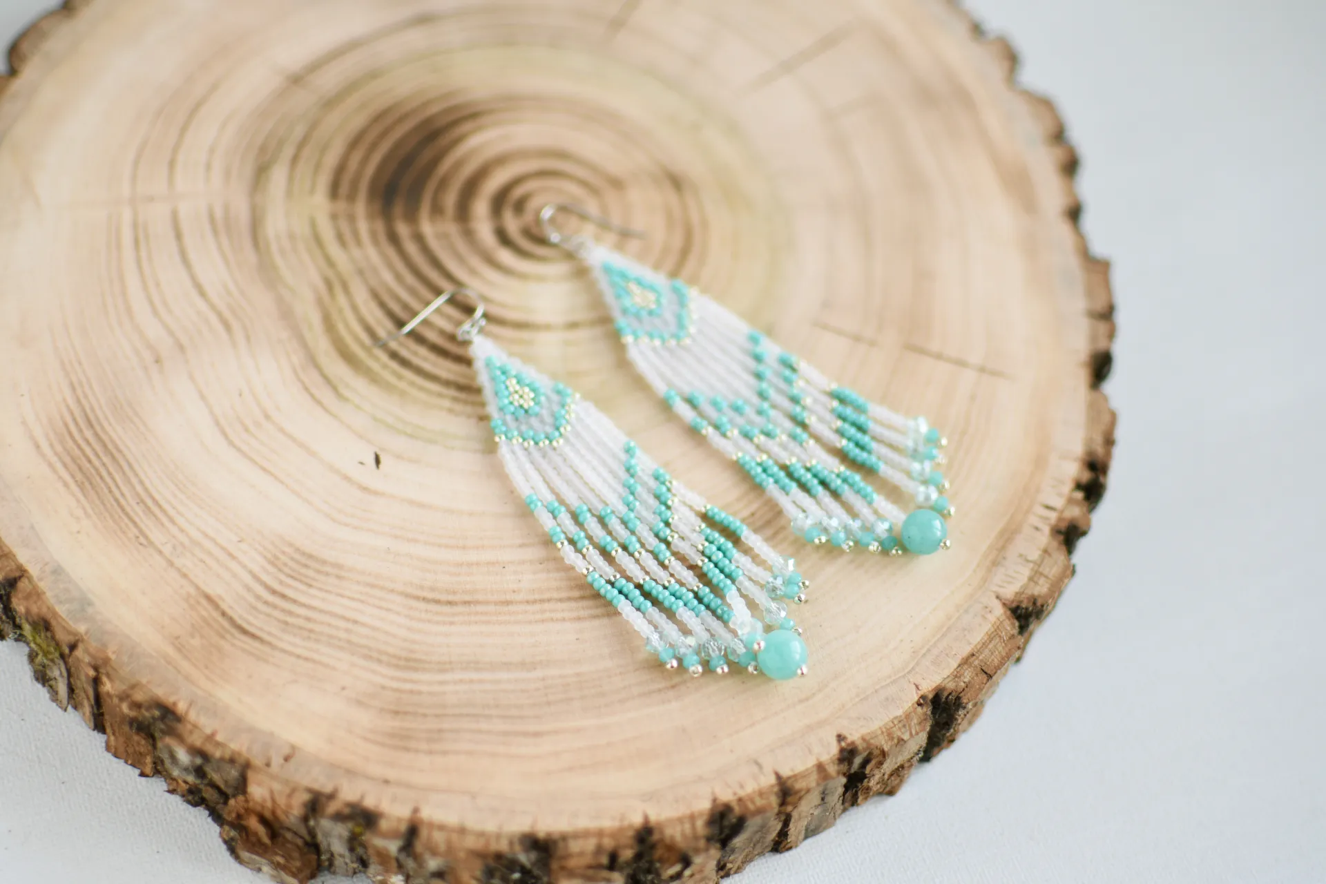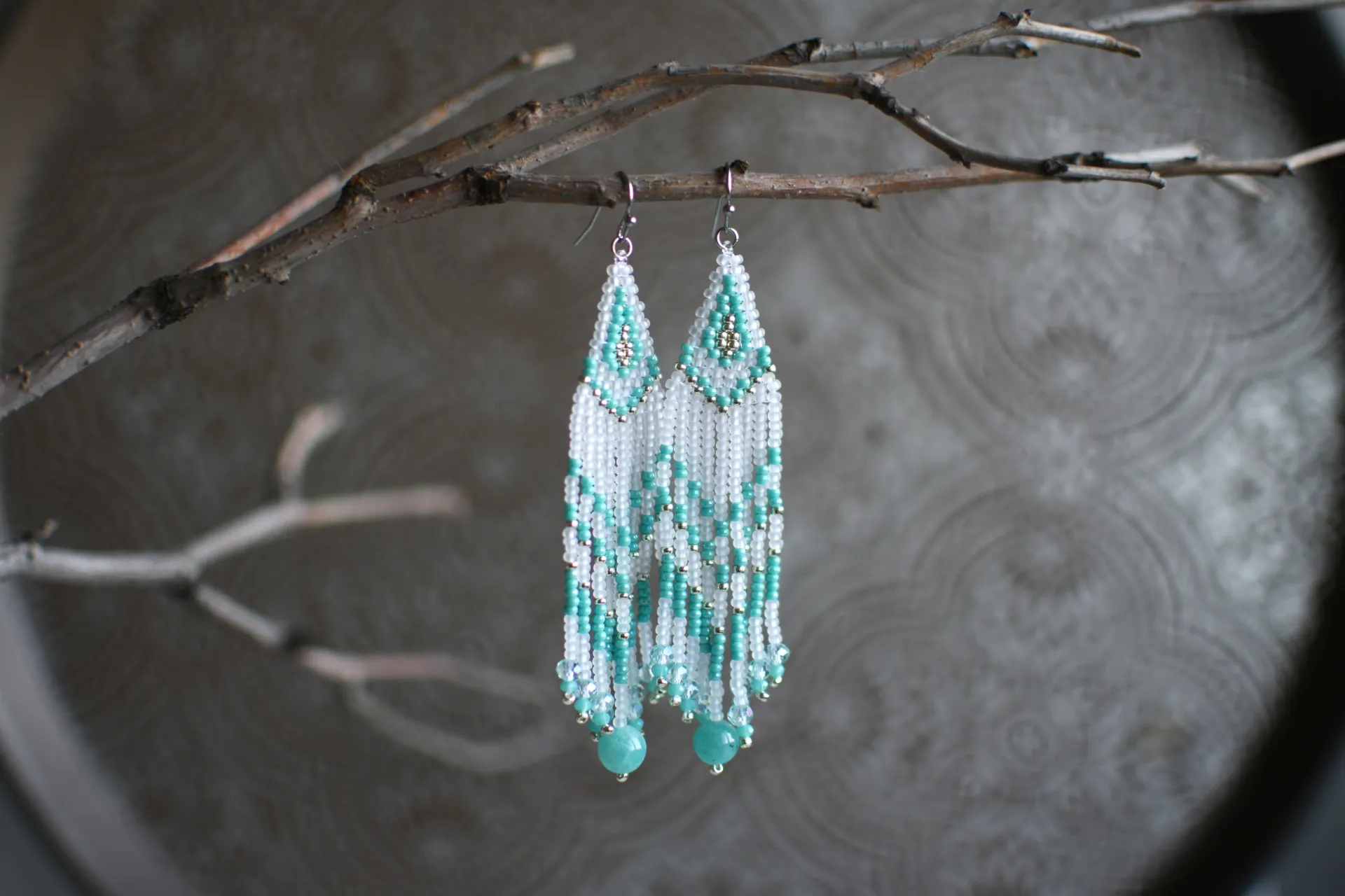 Яркие серьги из полупрозрачного матового и бирюзового бисера. Бахрома дополнена стеклянными бусинами и бусиной яркого амазонита.