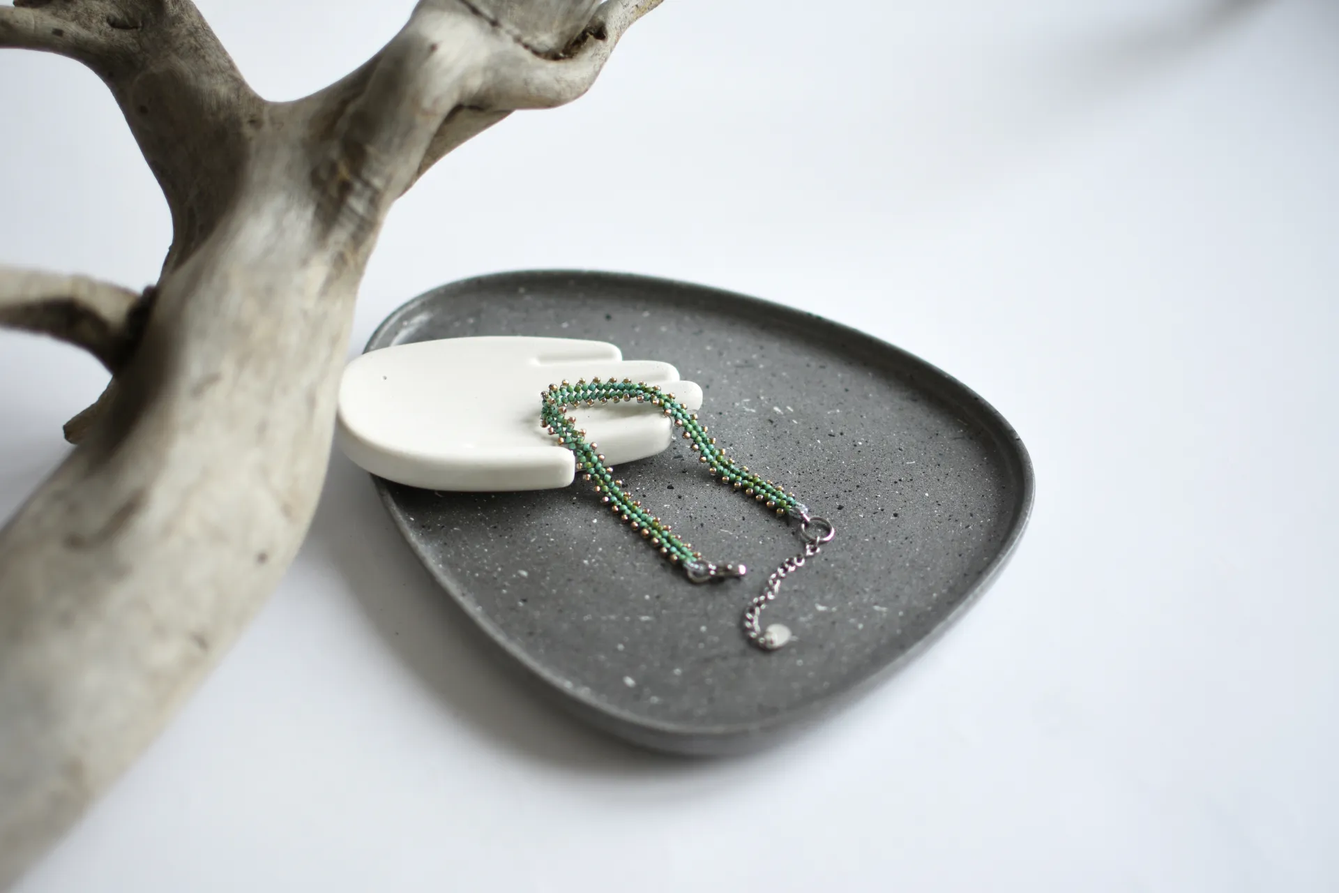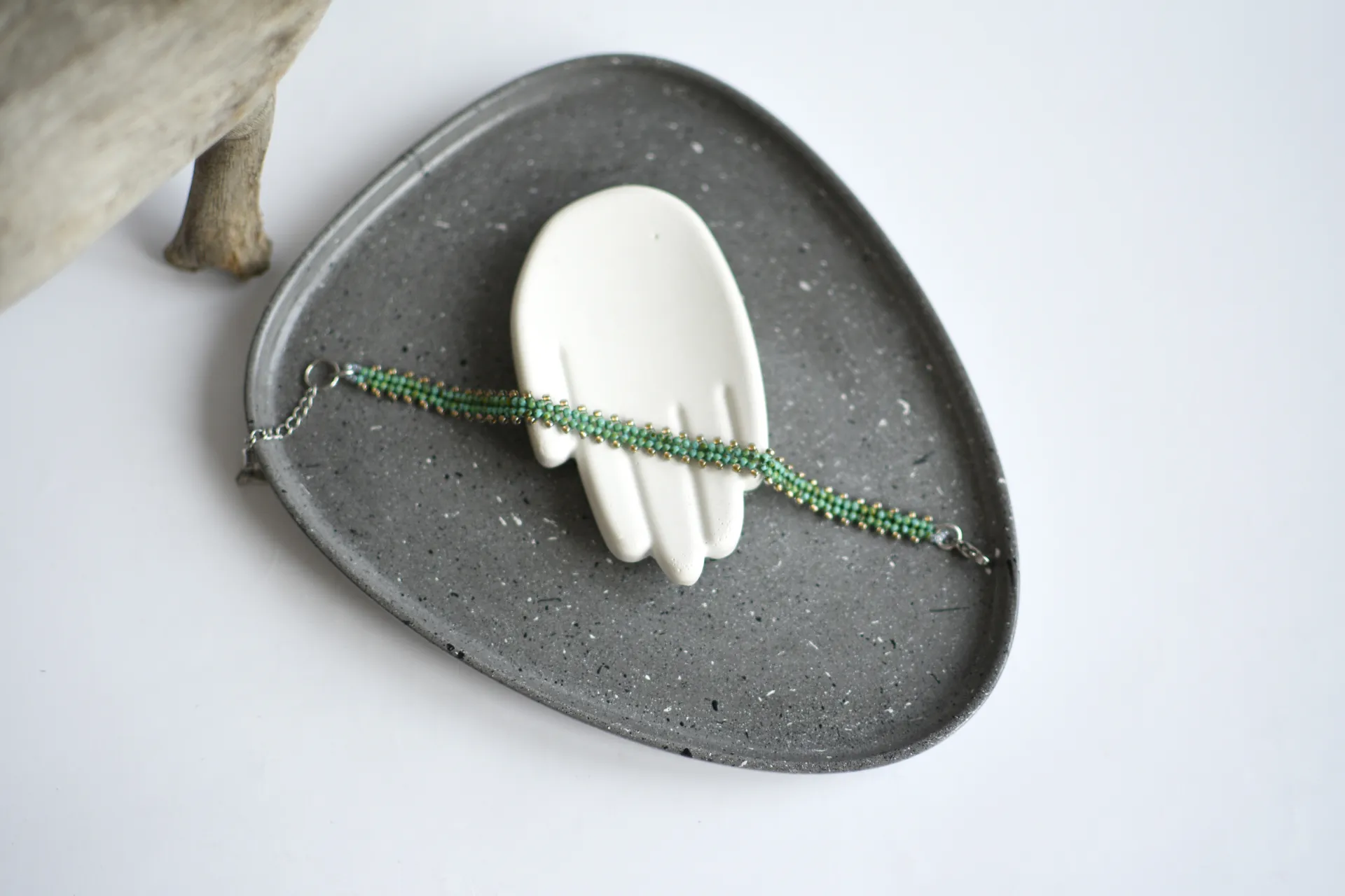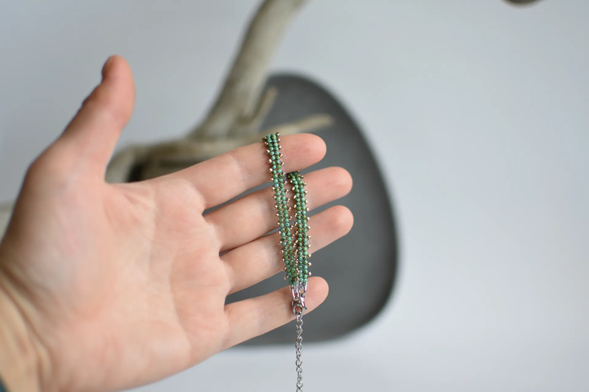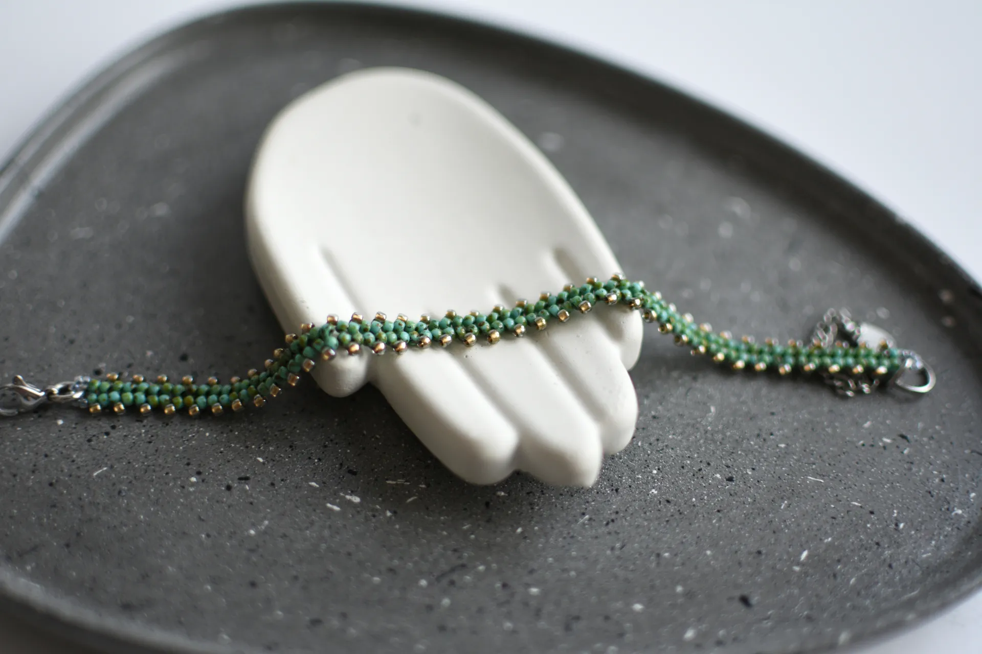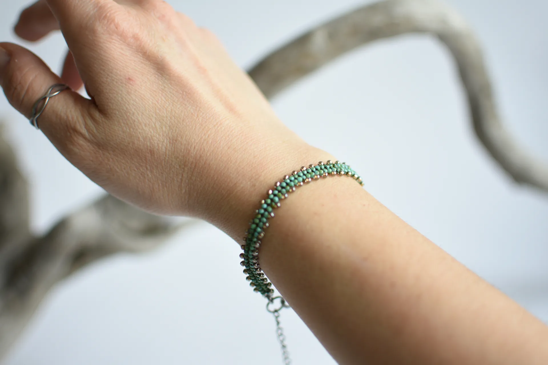 Тонкий браслет с бисером бирюзового цвета под камень.