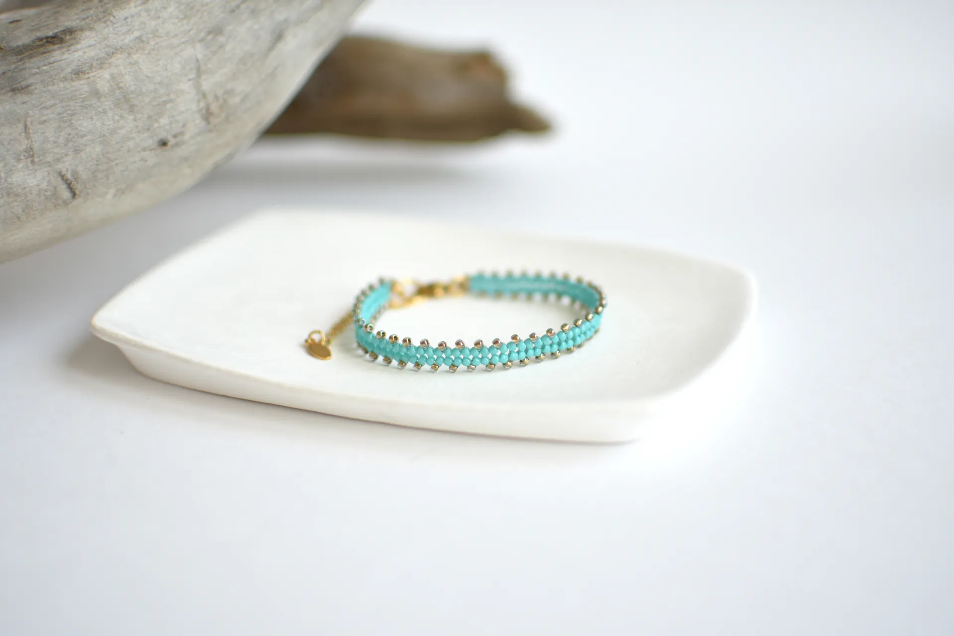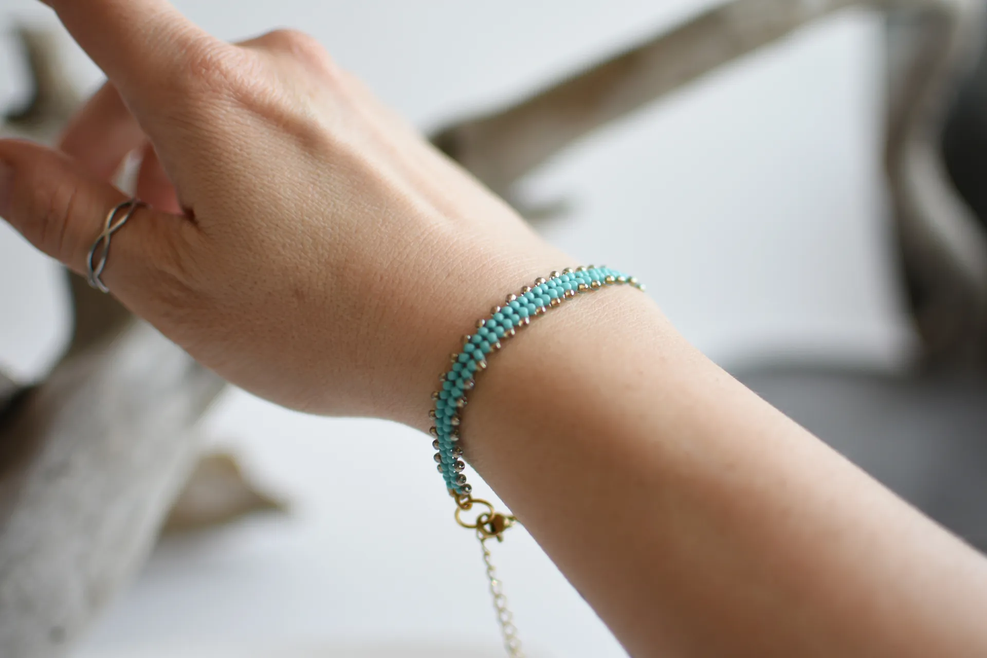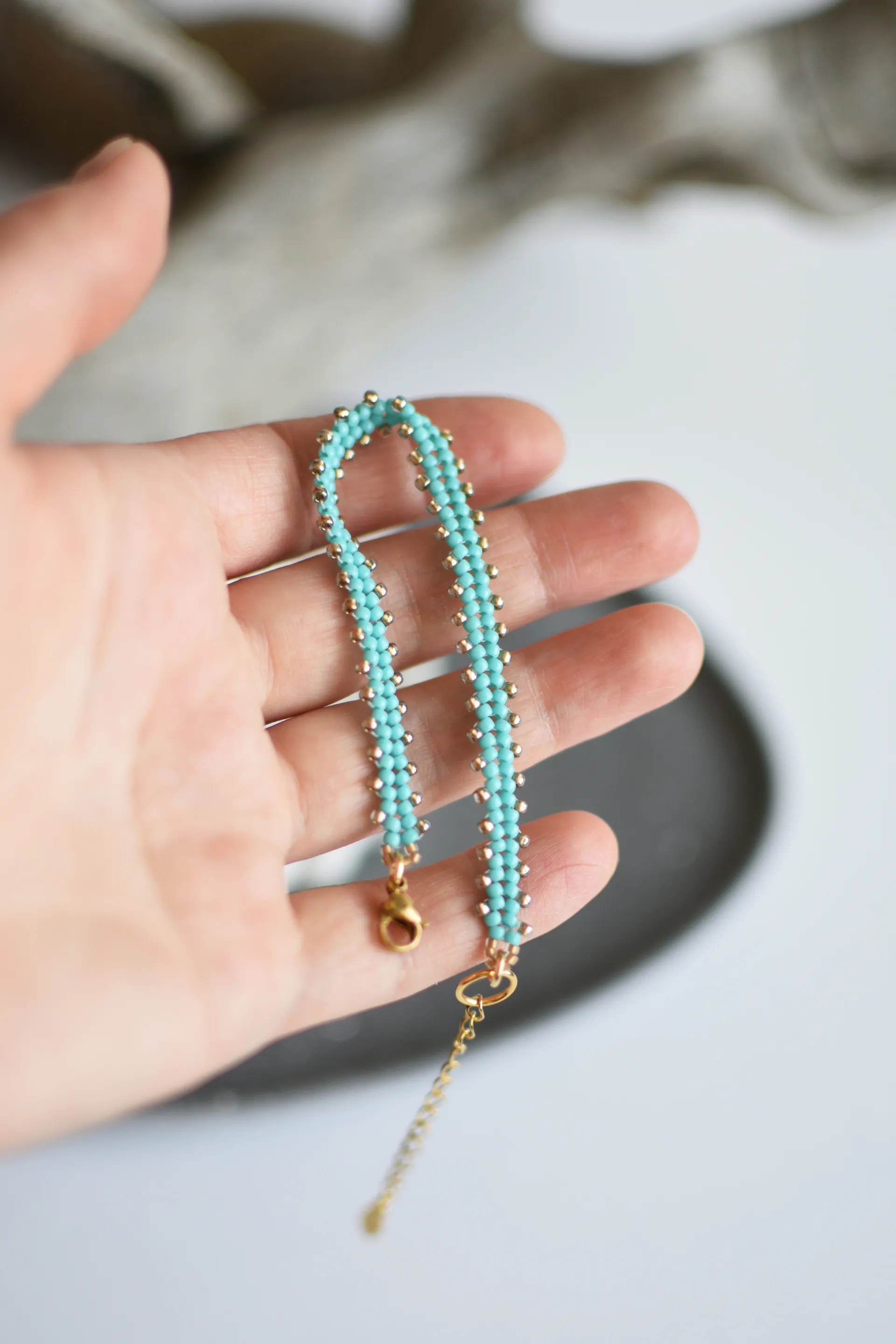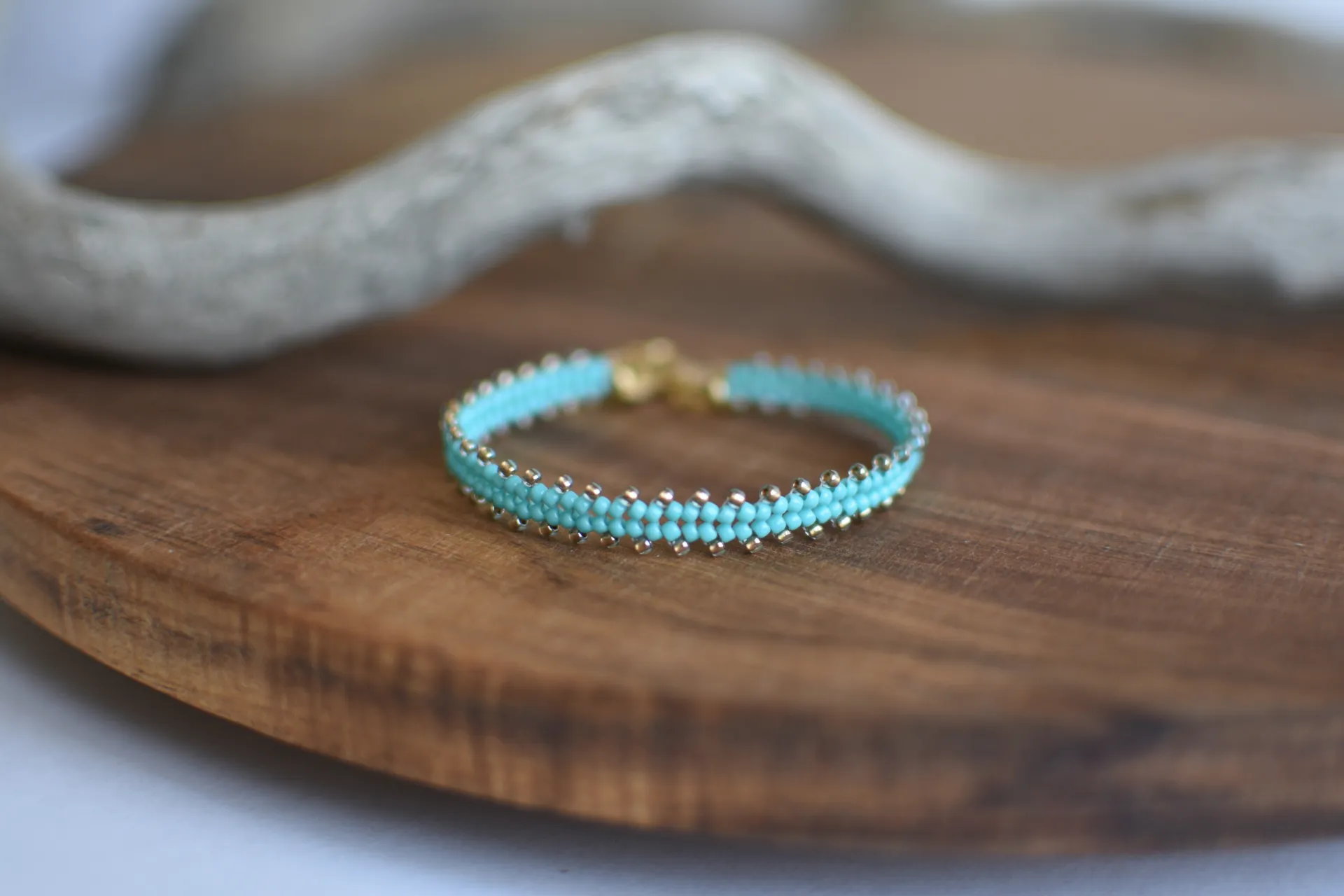 Тонкий браслет из бисера цвета светло-голубой бирюзы и песочного сверкающего бисера.