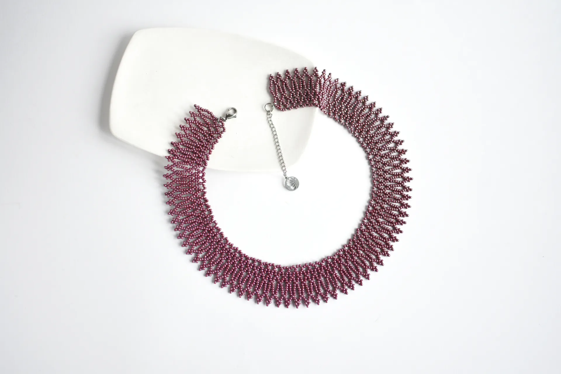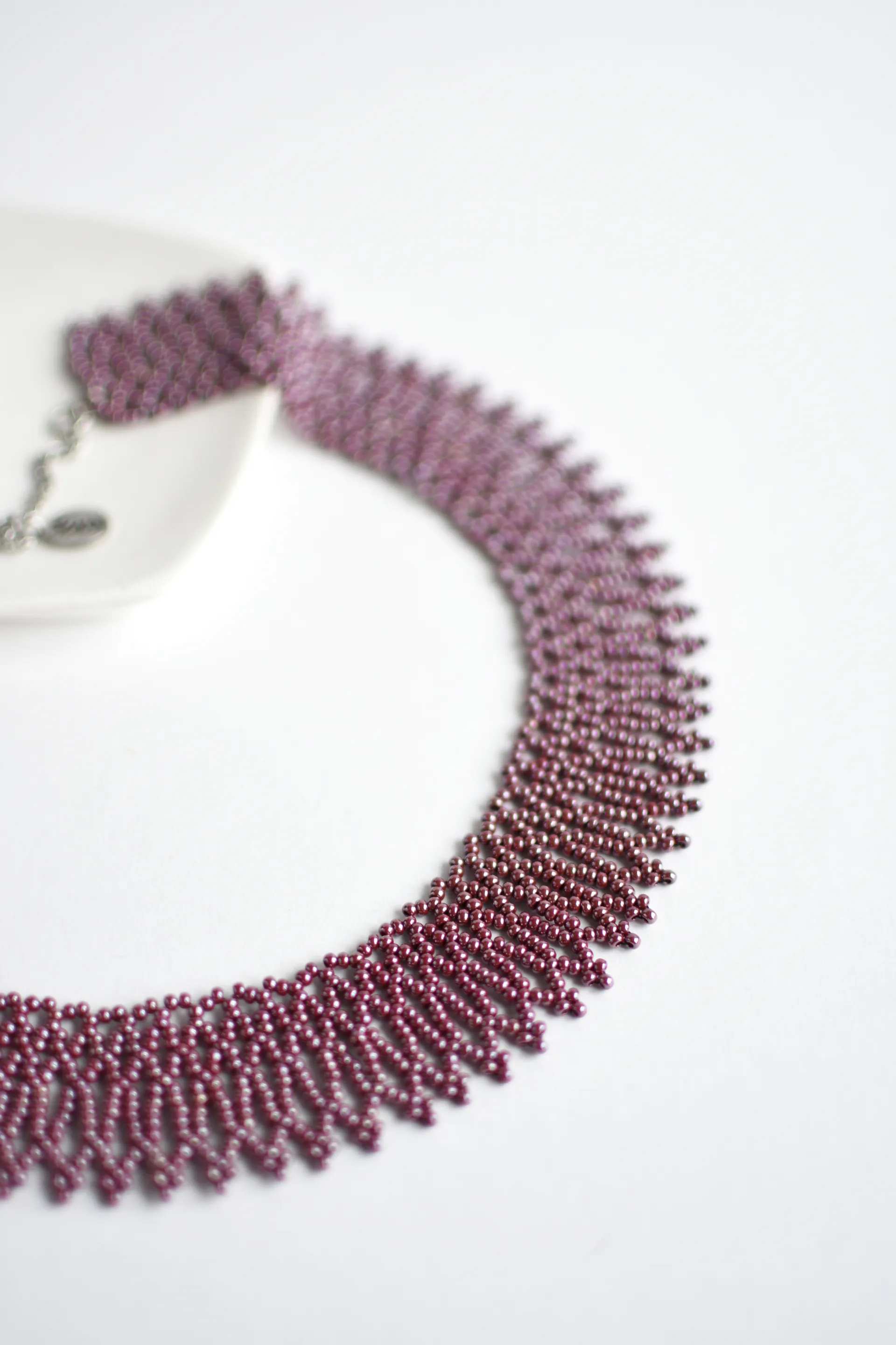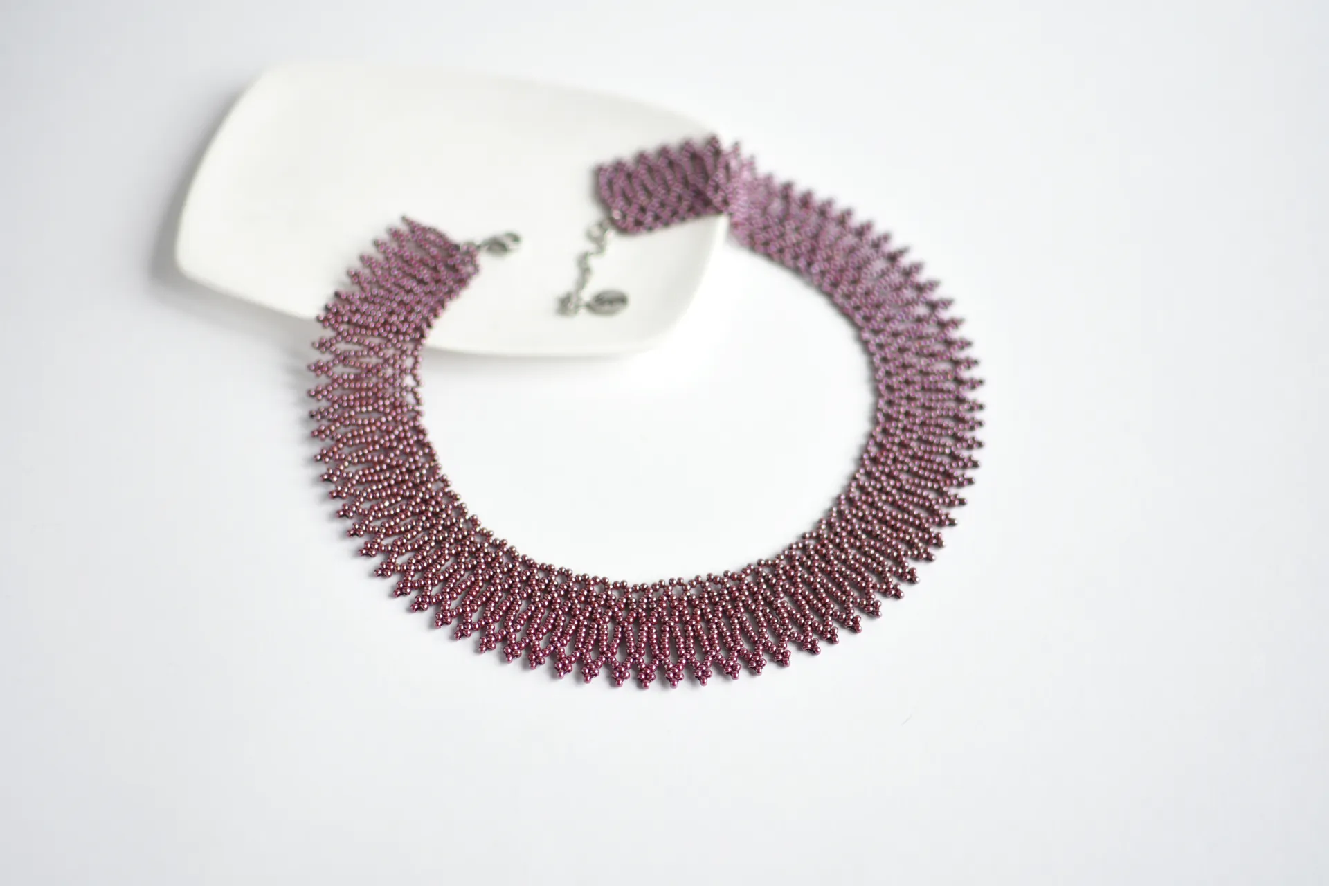Ажурное ожерелье из бисера винного оттенка с глянцевым покрытием.