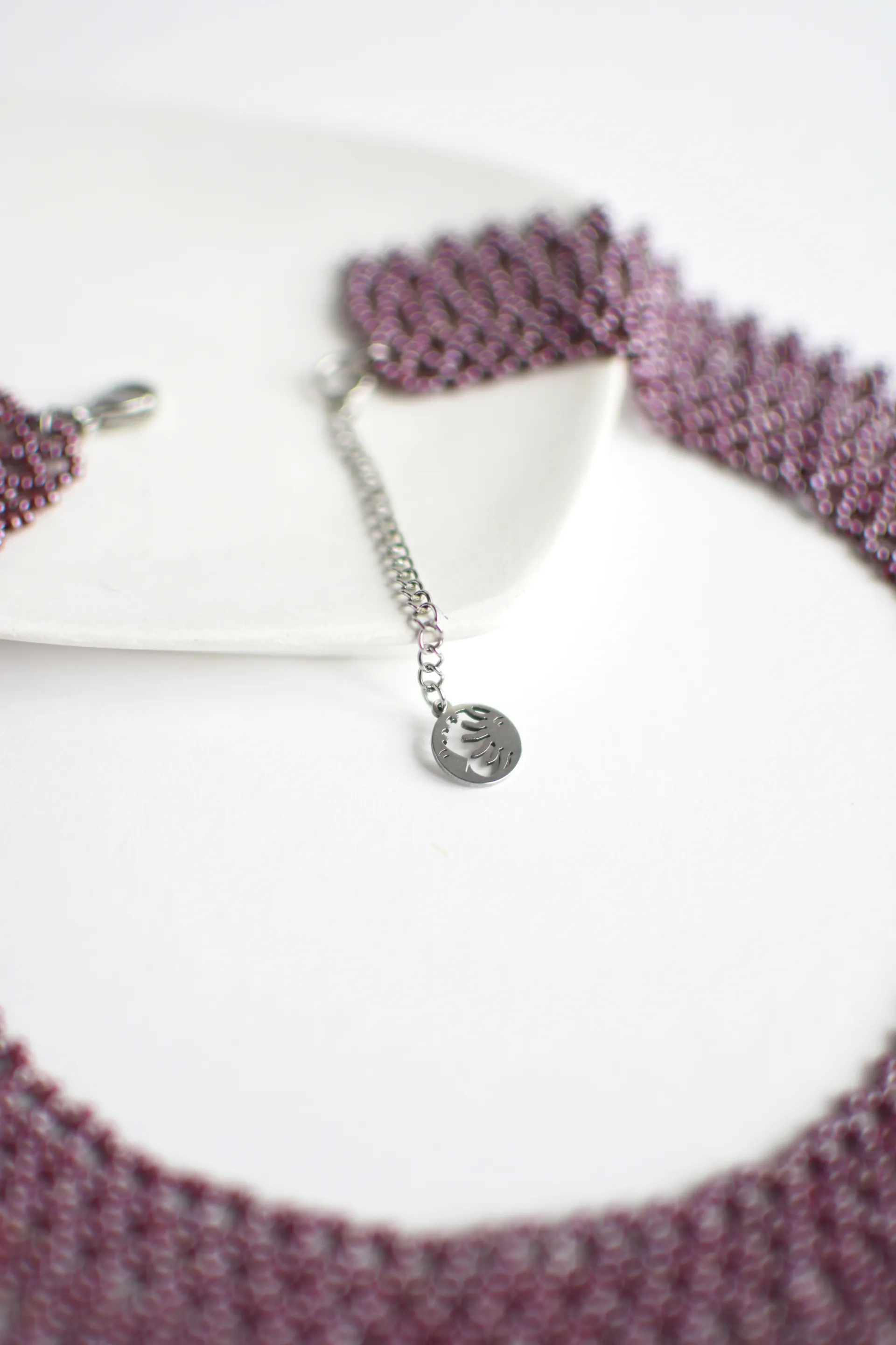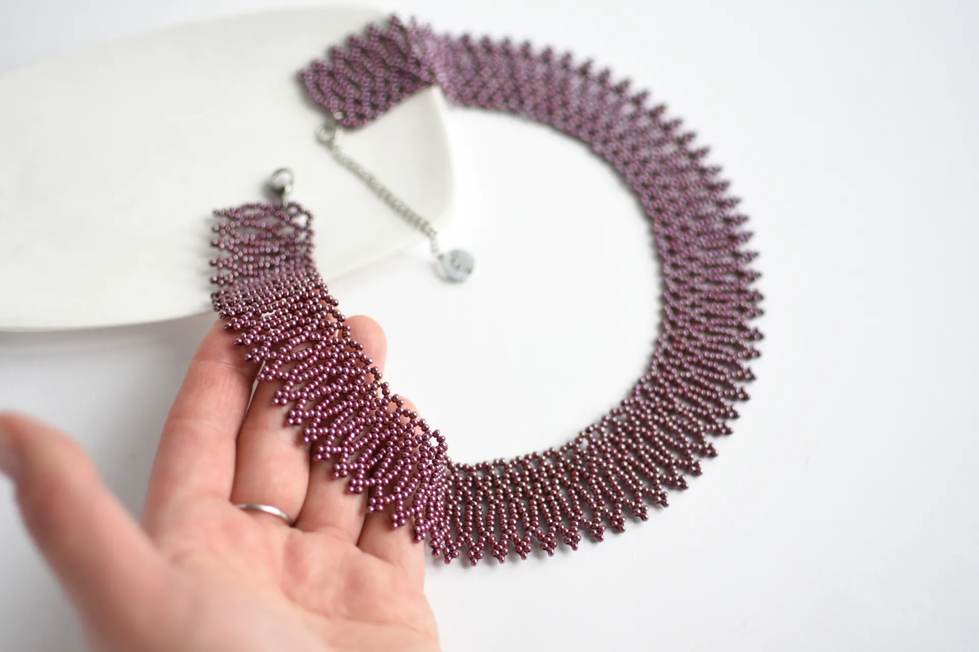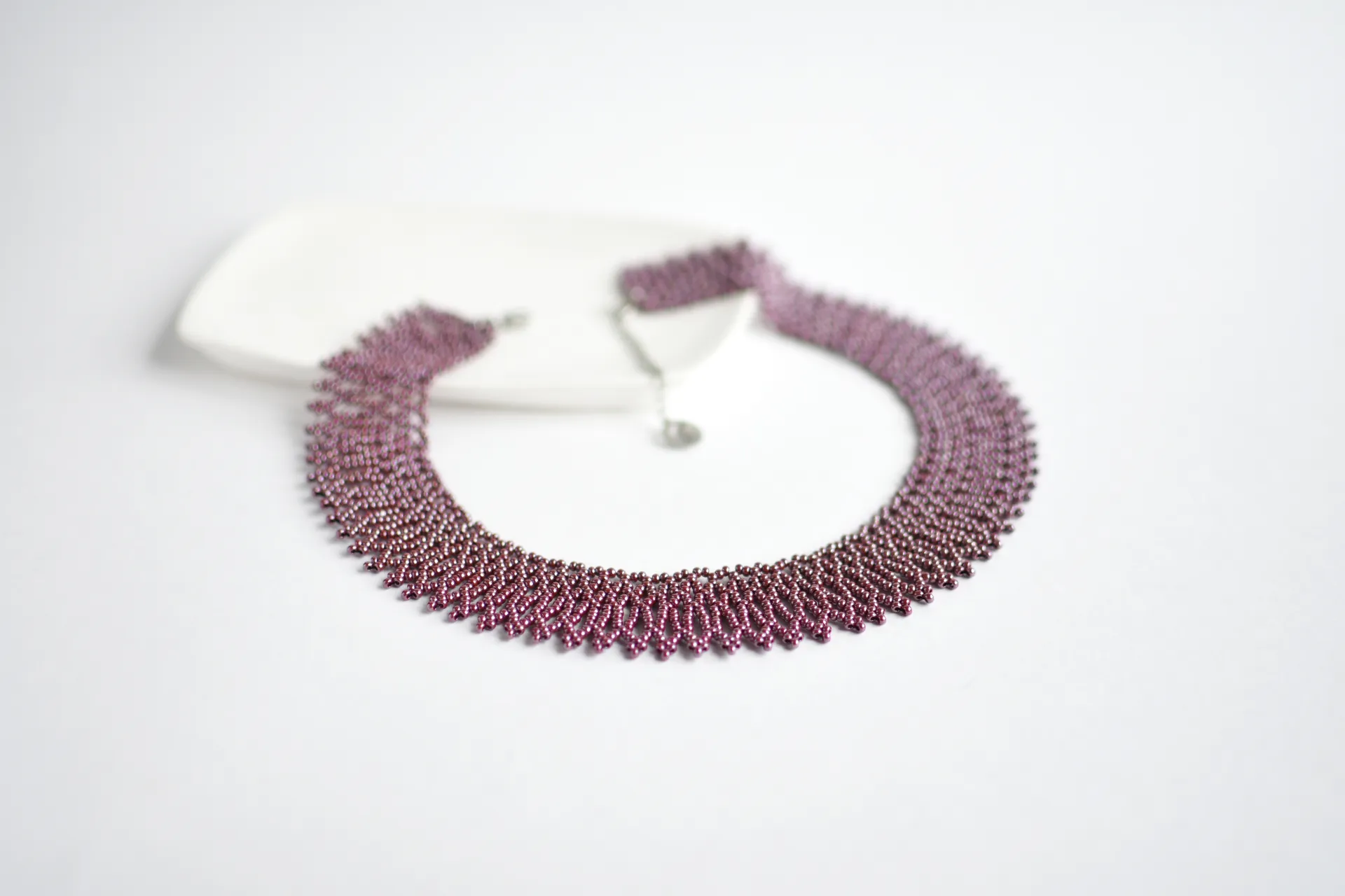 Ажурное ожерелье из бисера винного оттенка с глянцевым покрытием.