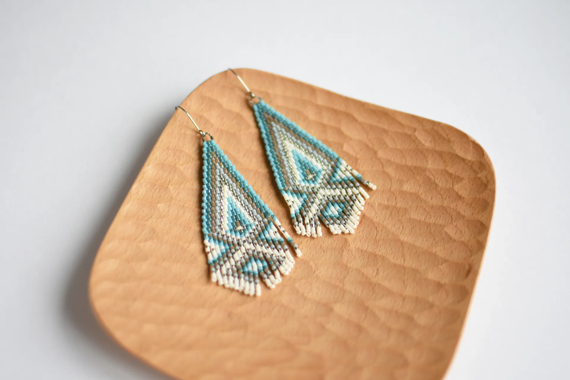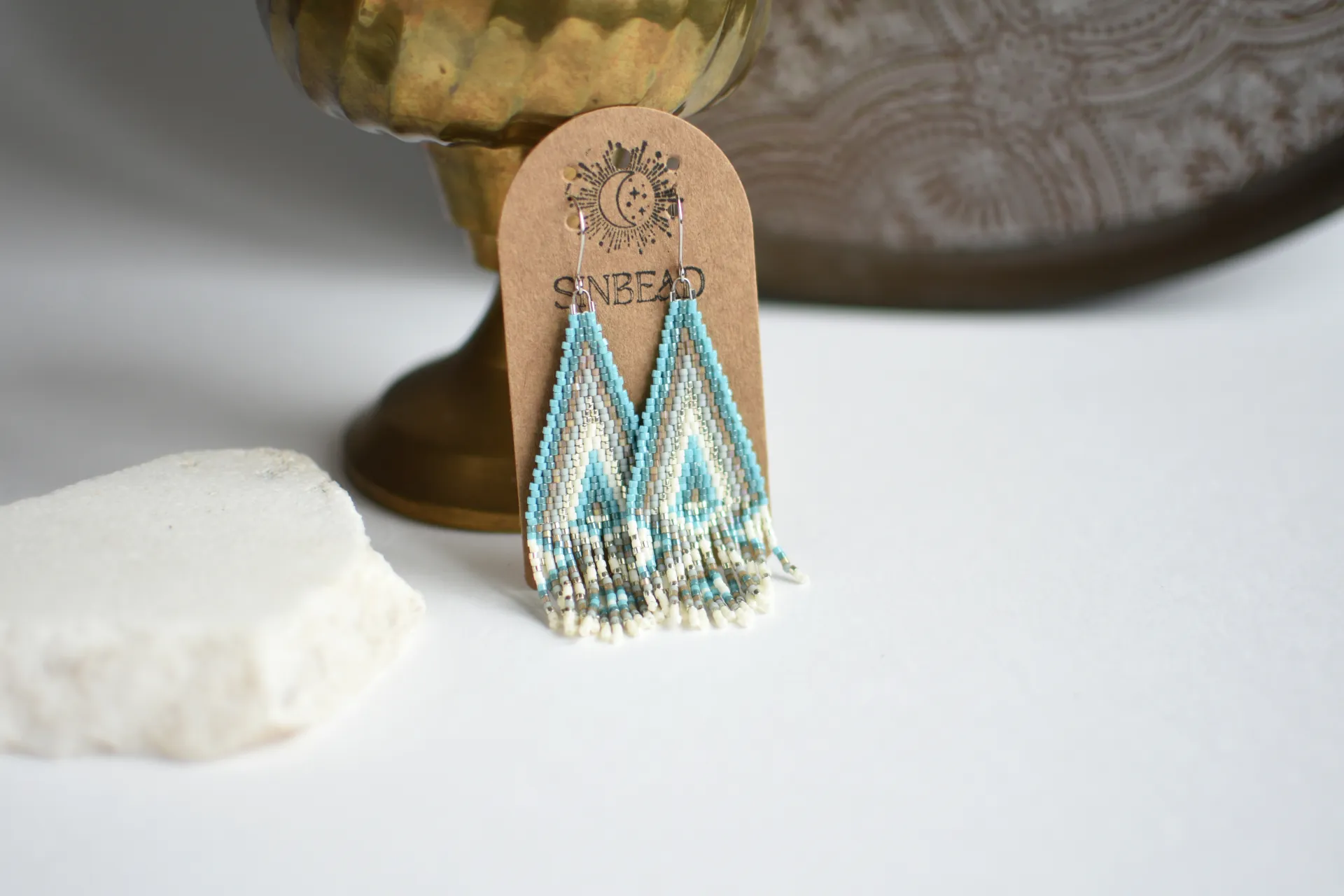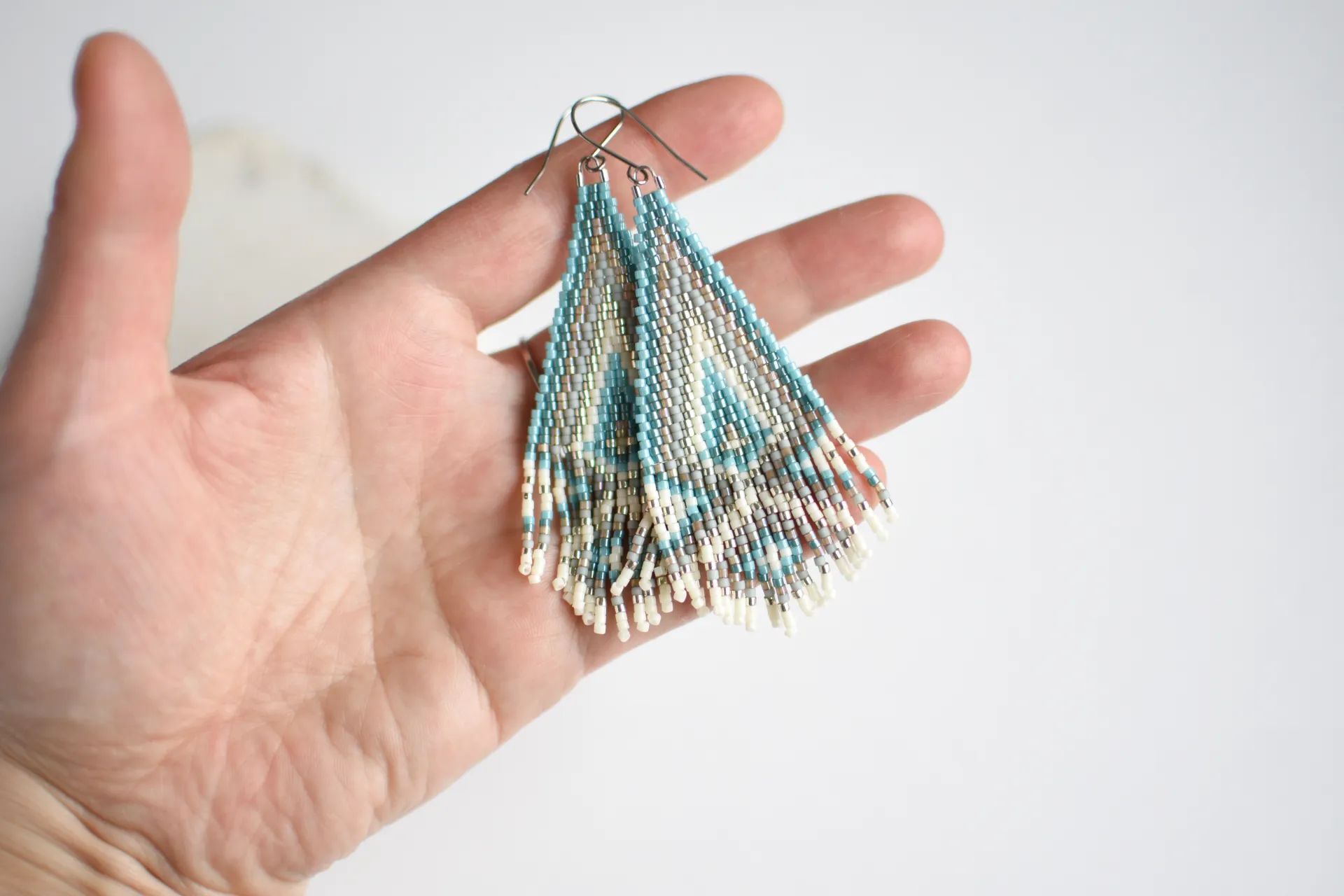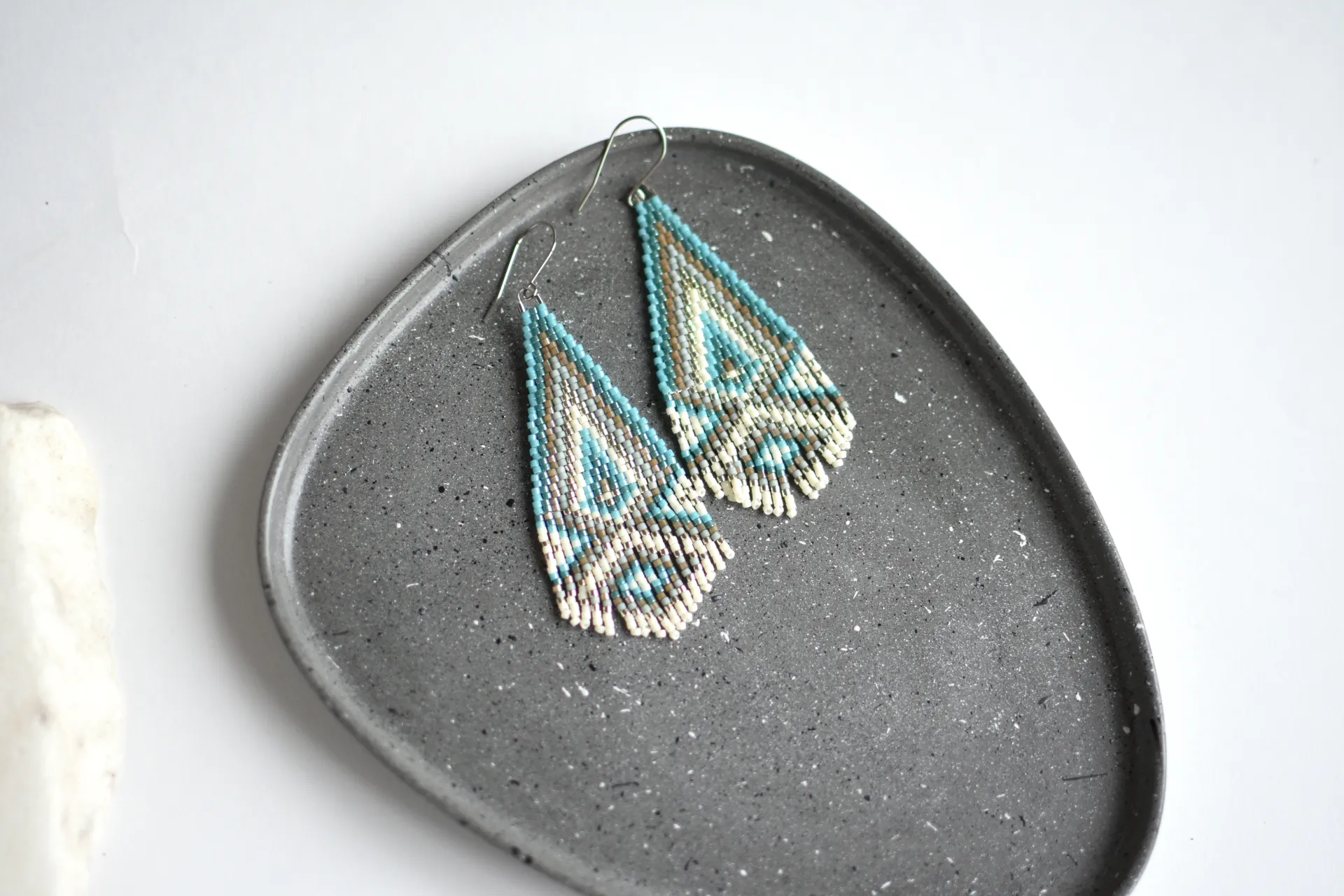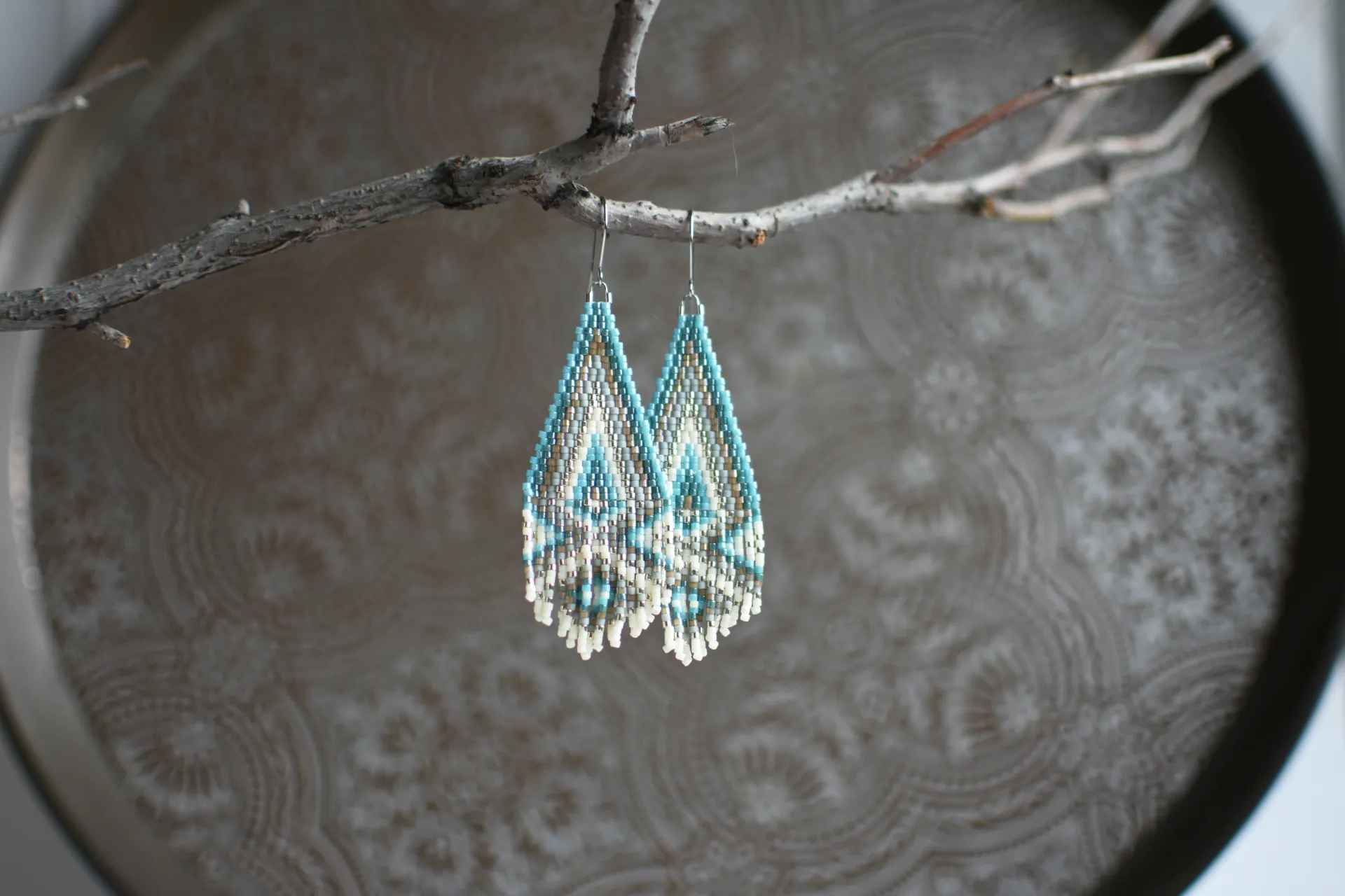 Лёгкие серьги с нежной бахромой в оттенках небесной бирюзы и молочного белого.