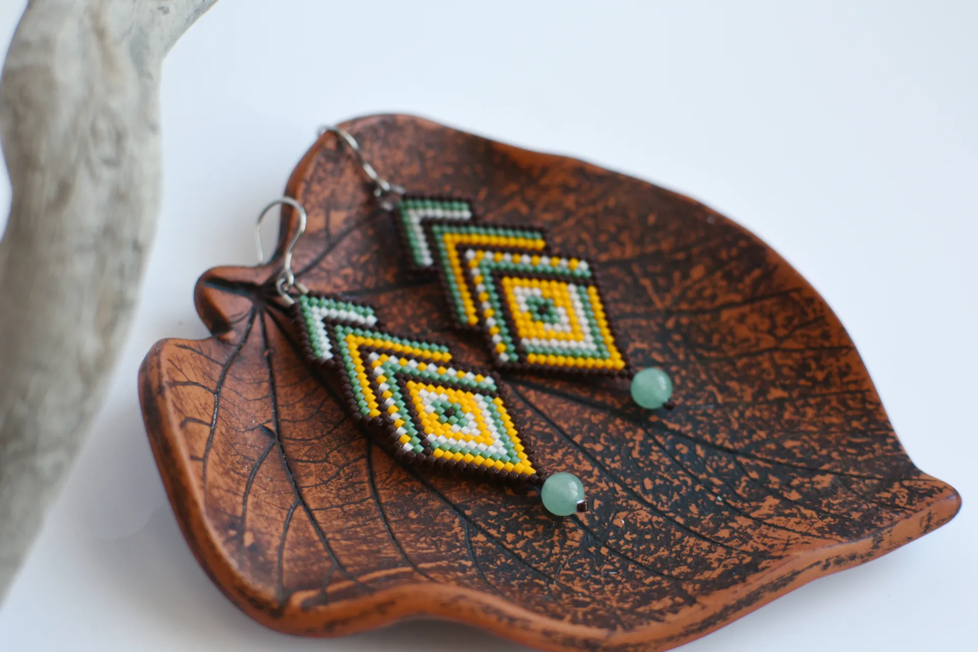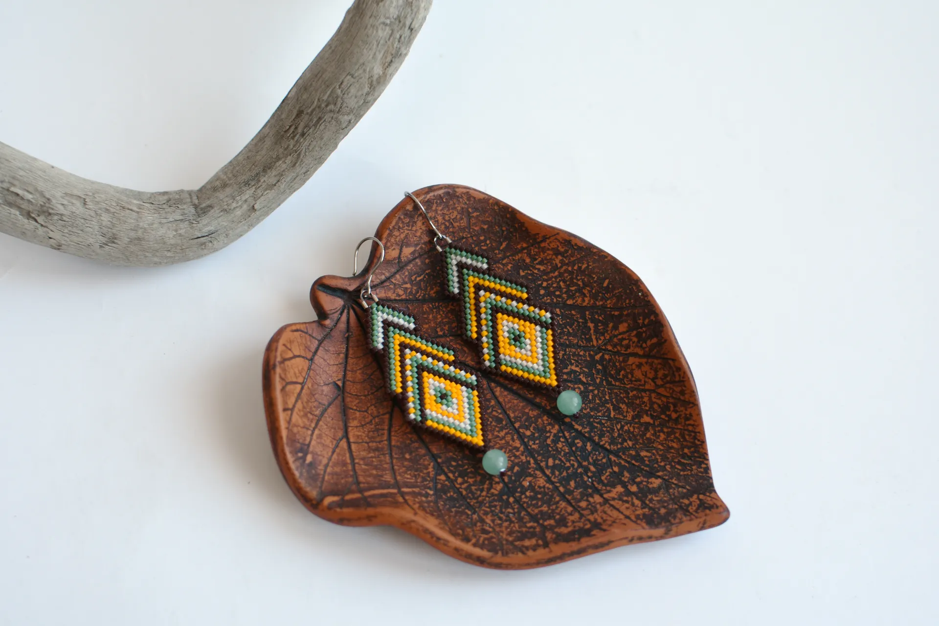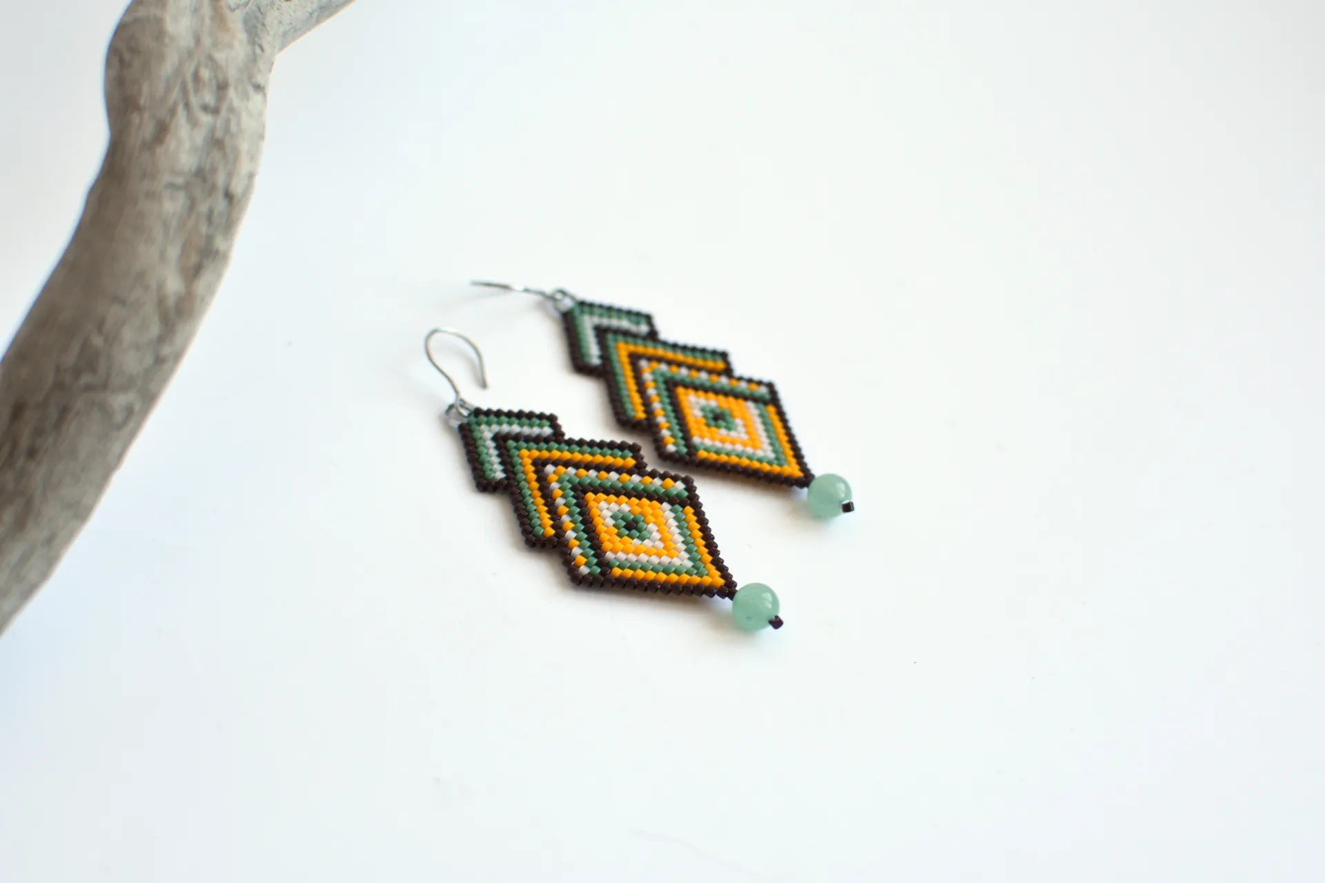 Серьги в бохо стиле в природных цветах с бусинкой зелёного авантюрина.