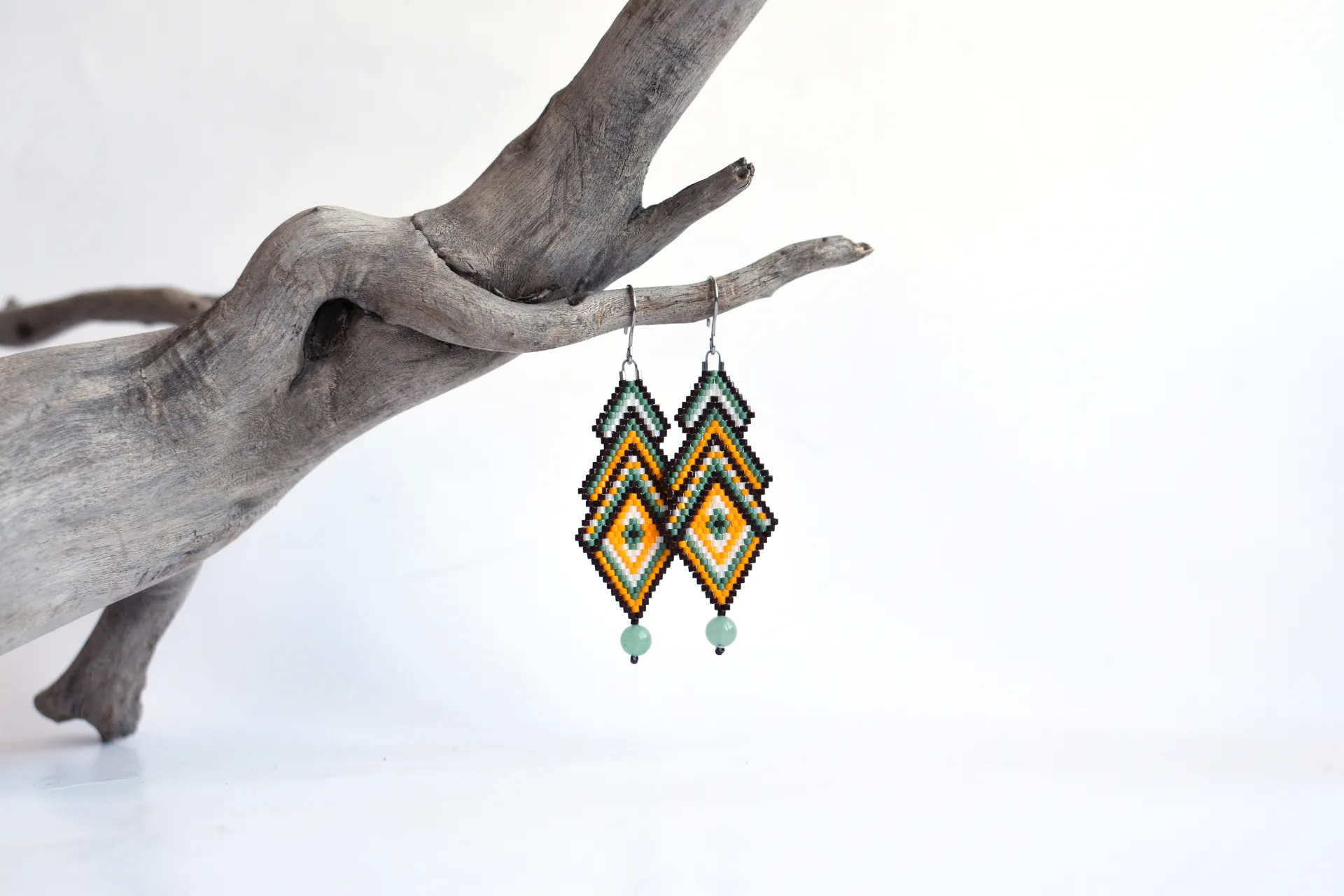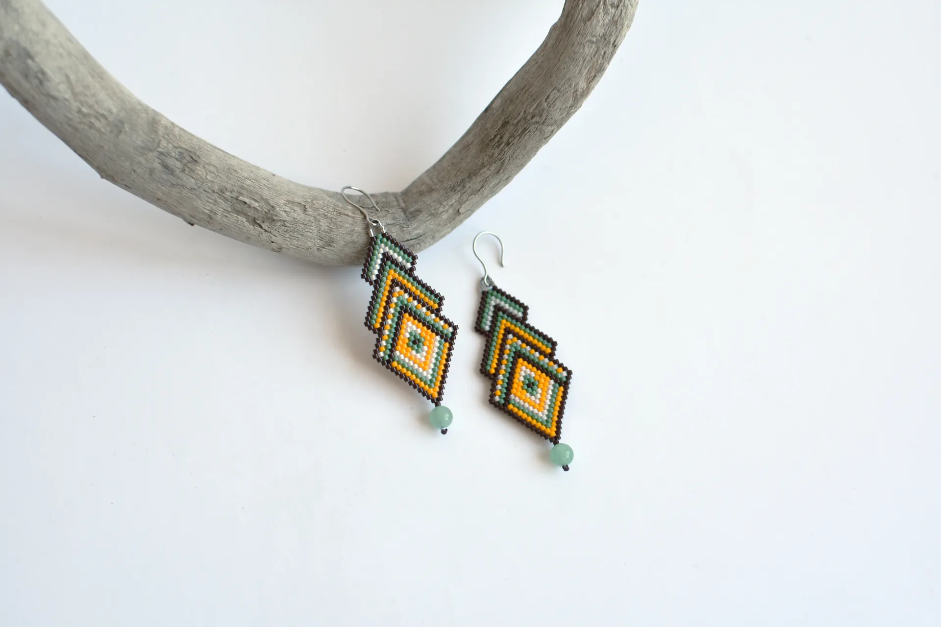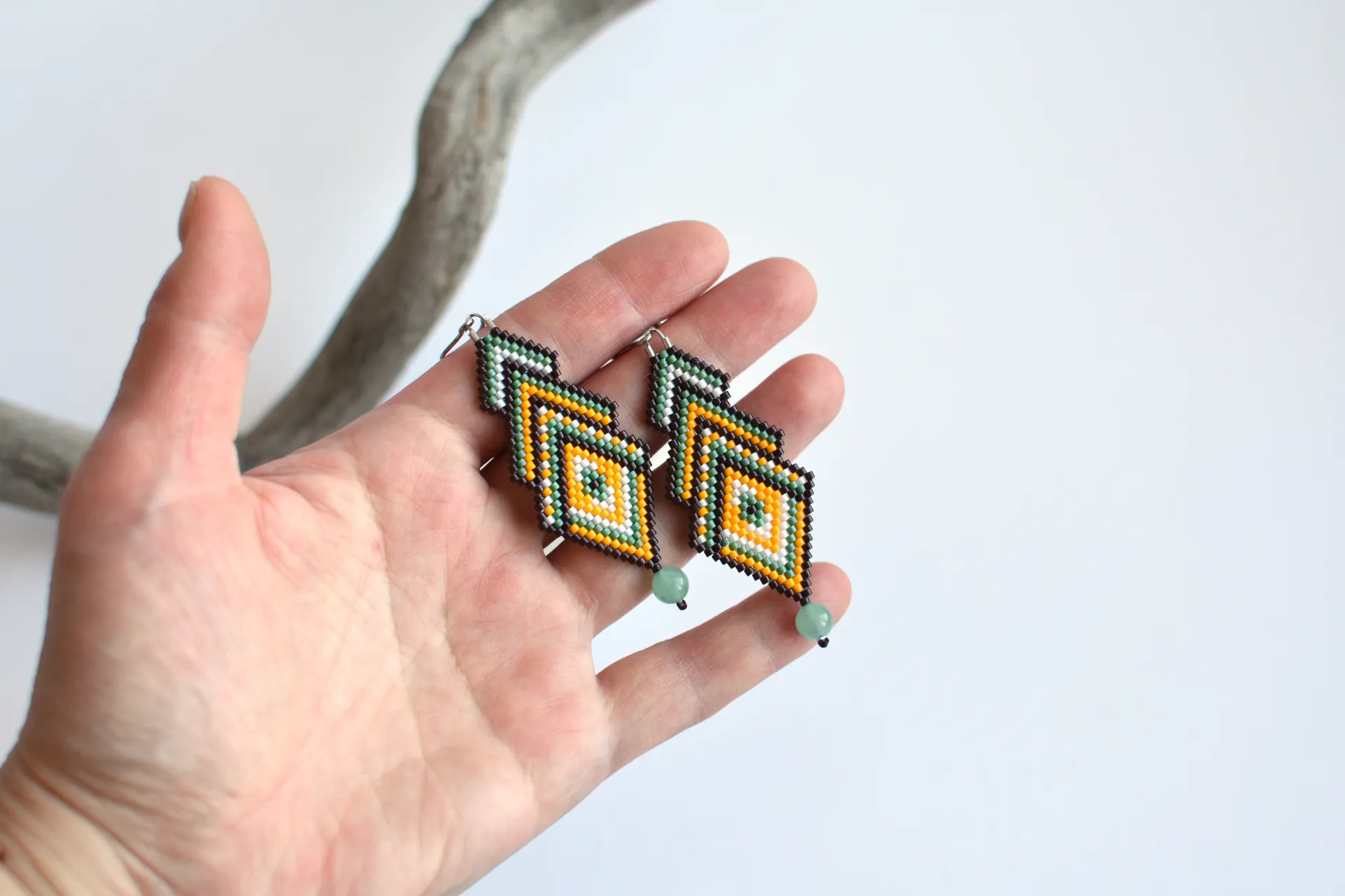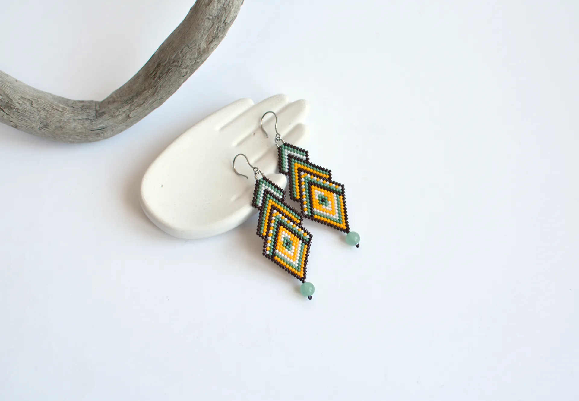 Серьги в бохо стиле в природных цветах с бусинкой зелёного авантюрина.