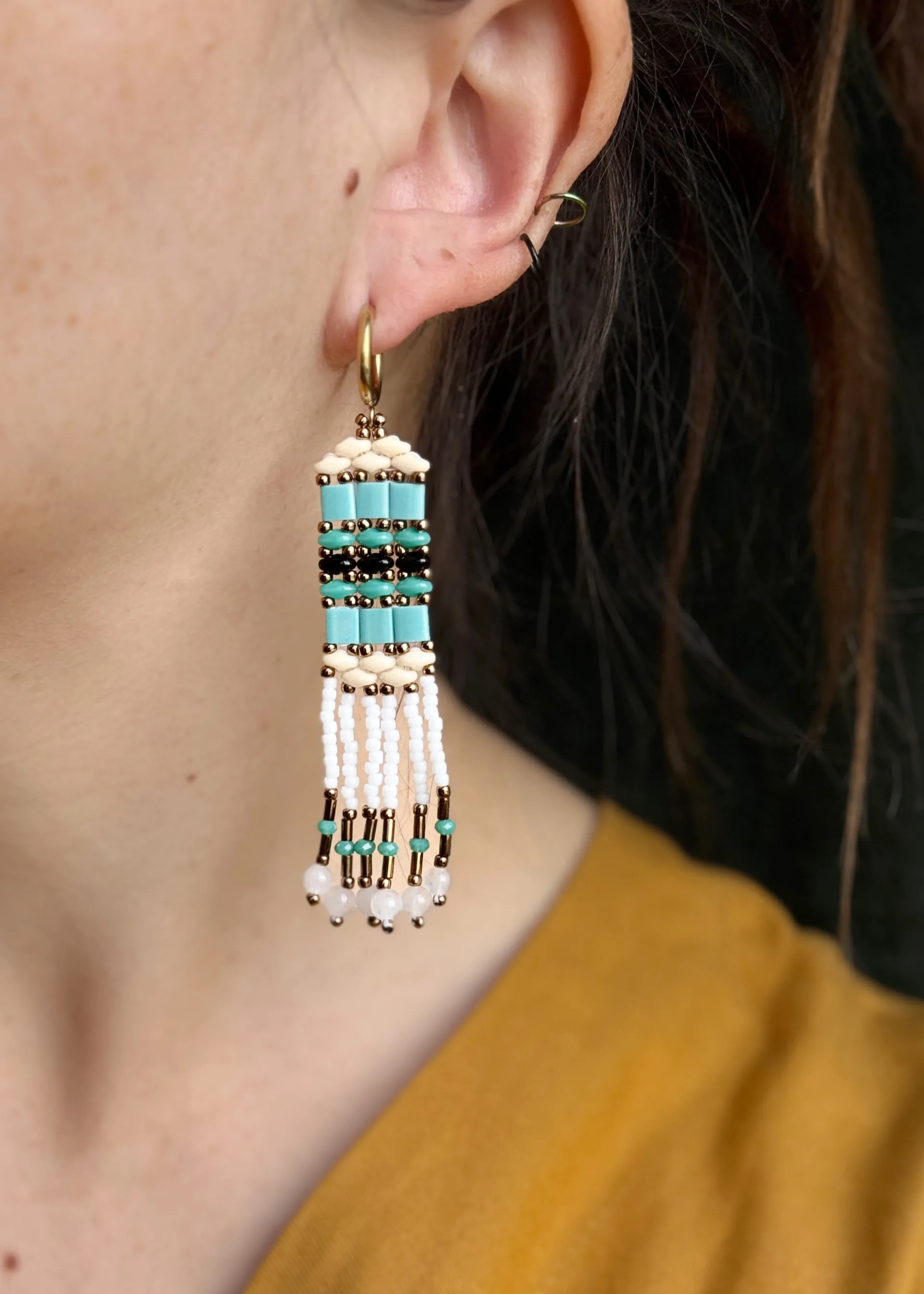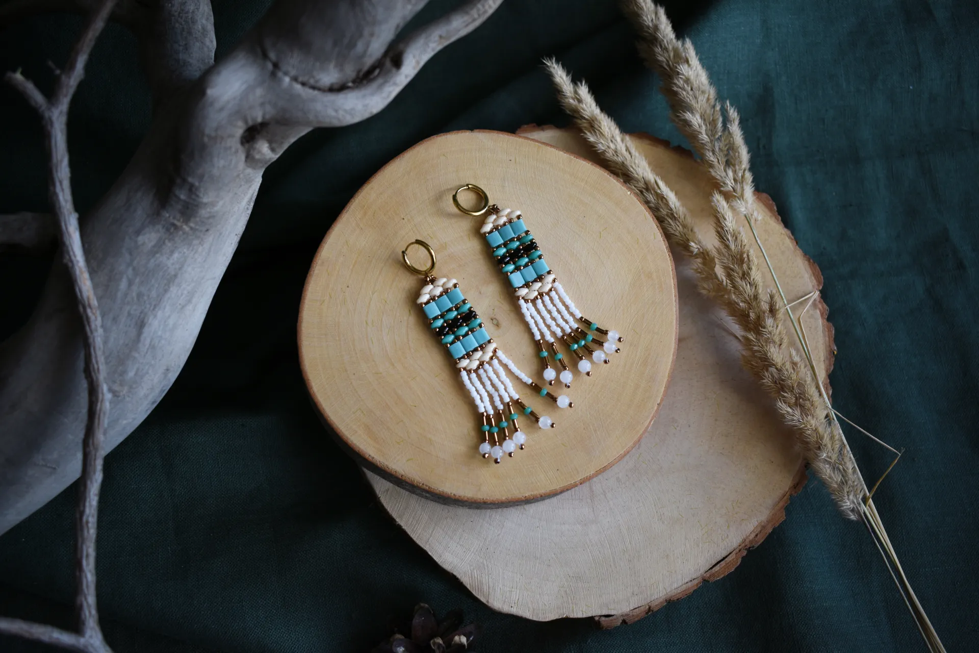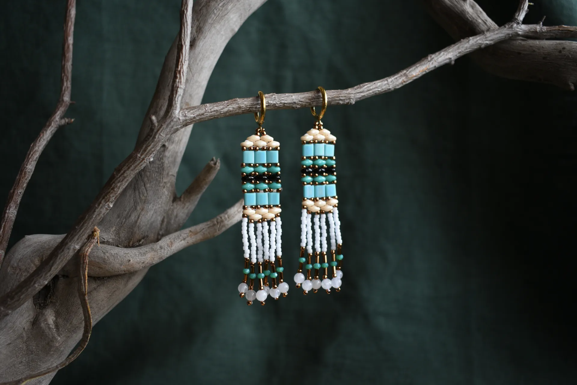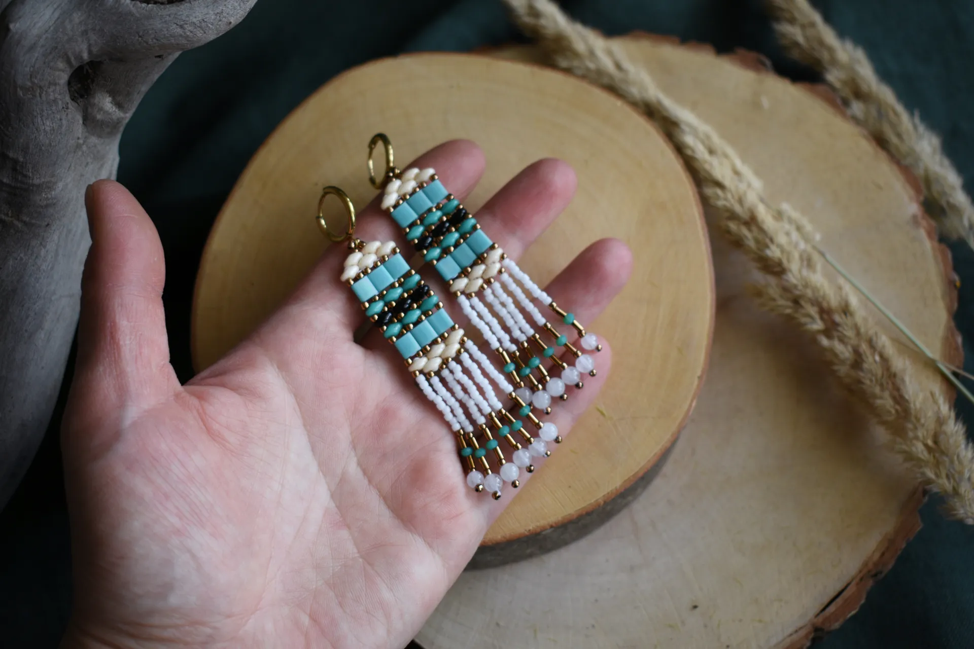 Необычные серьги из разных форм бисера в бохо-стиле с бусинами белого кварца.
