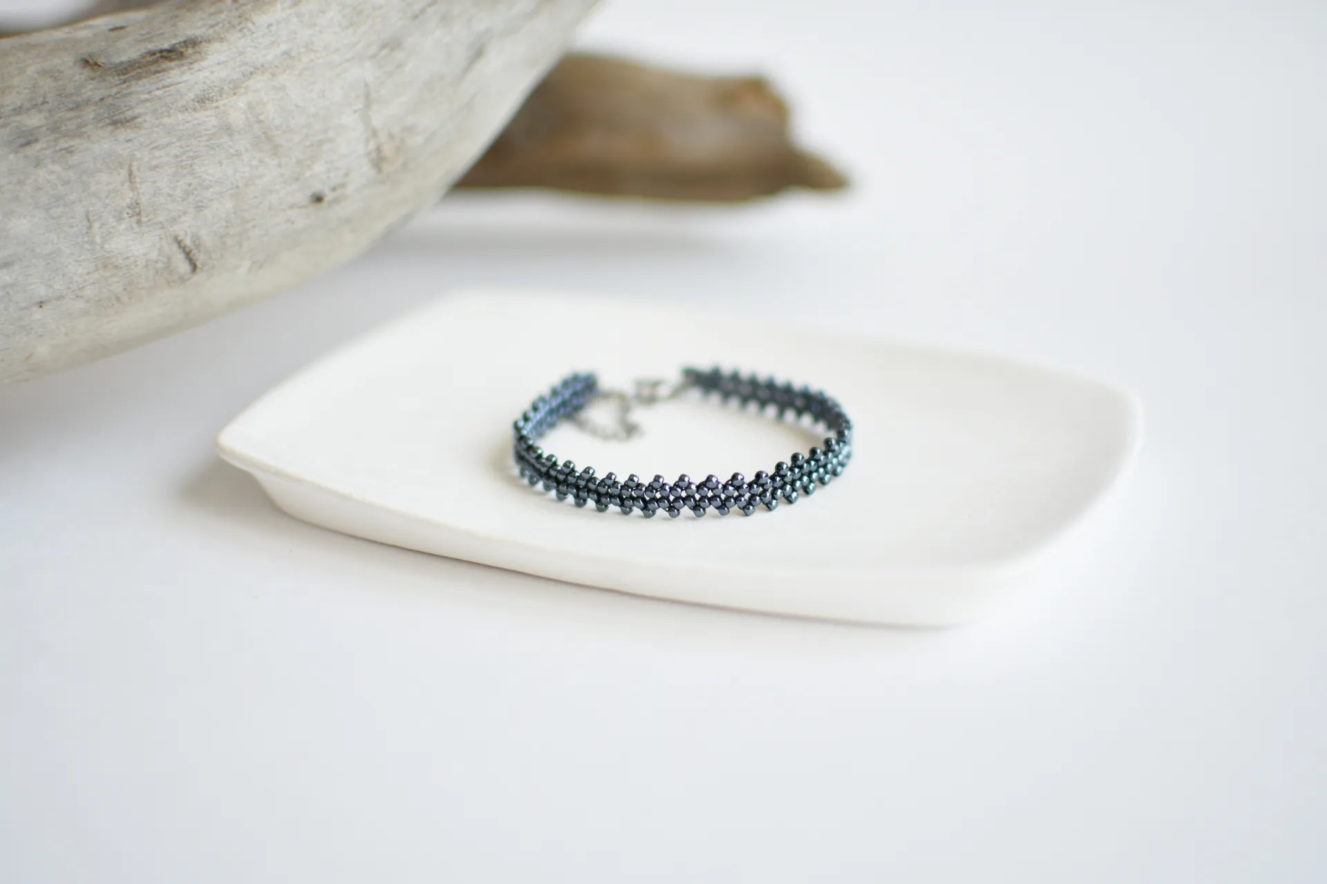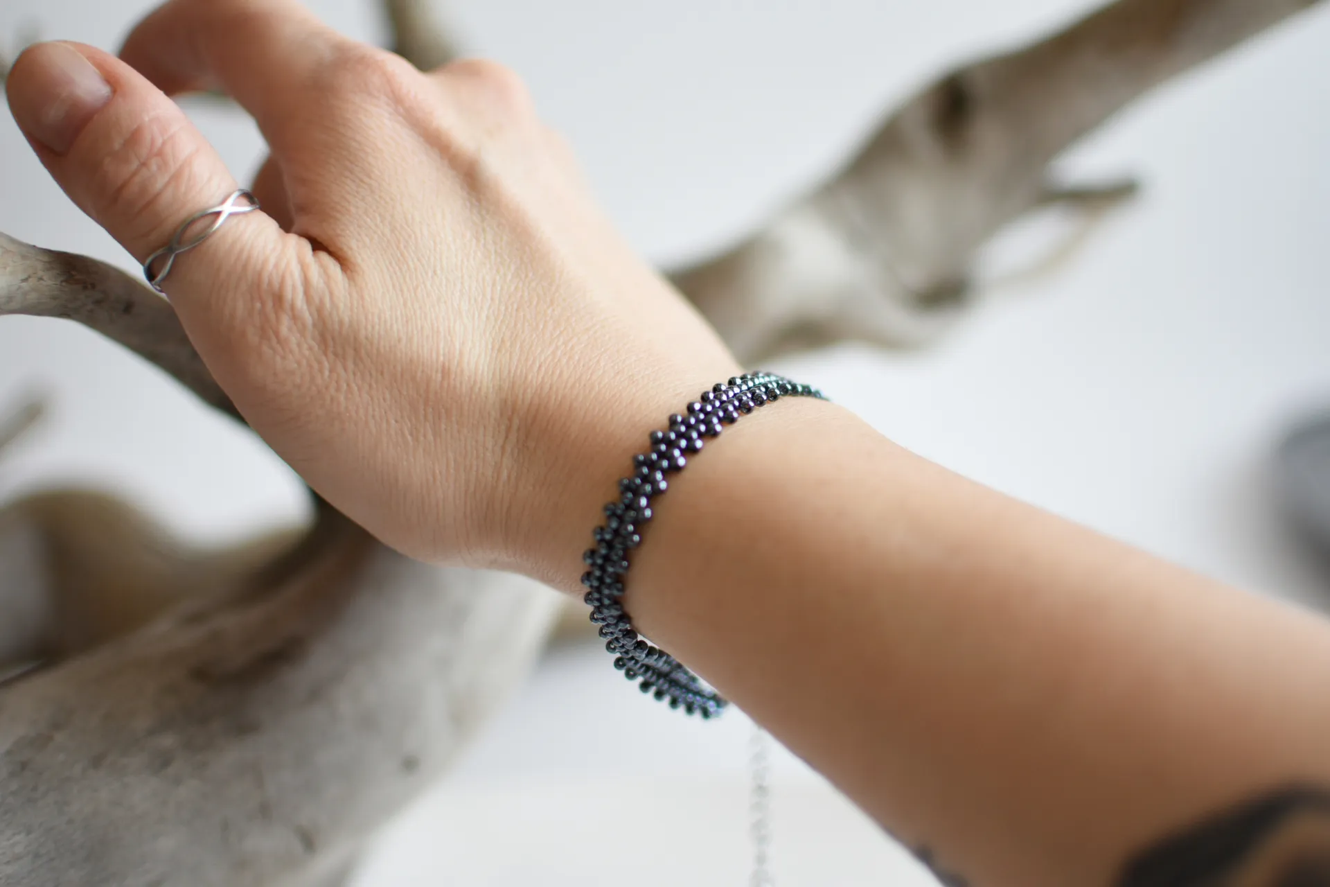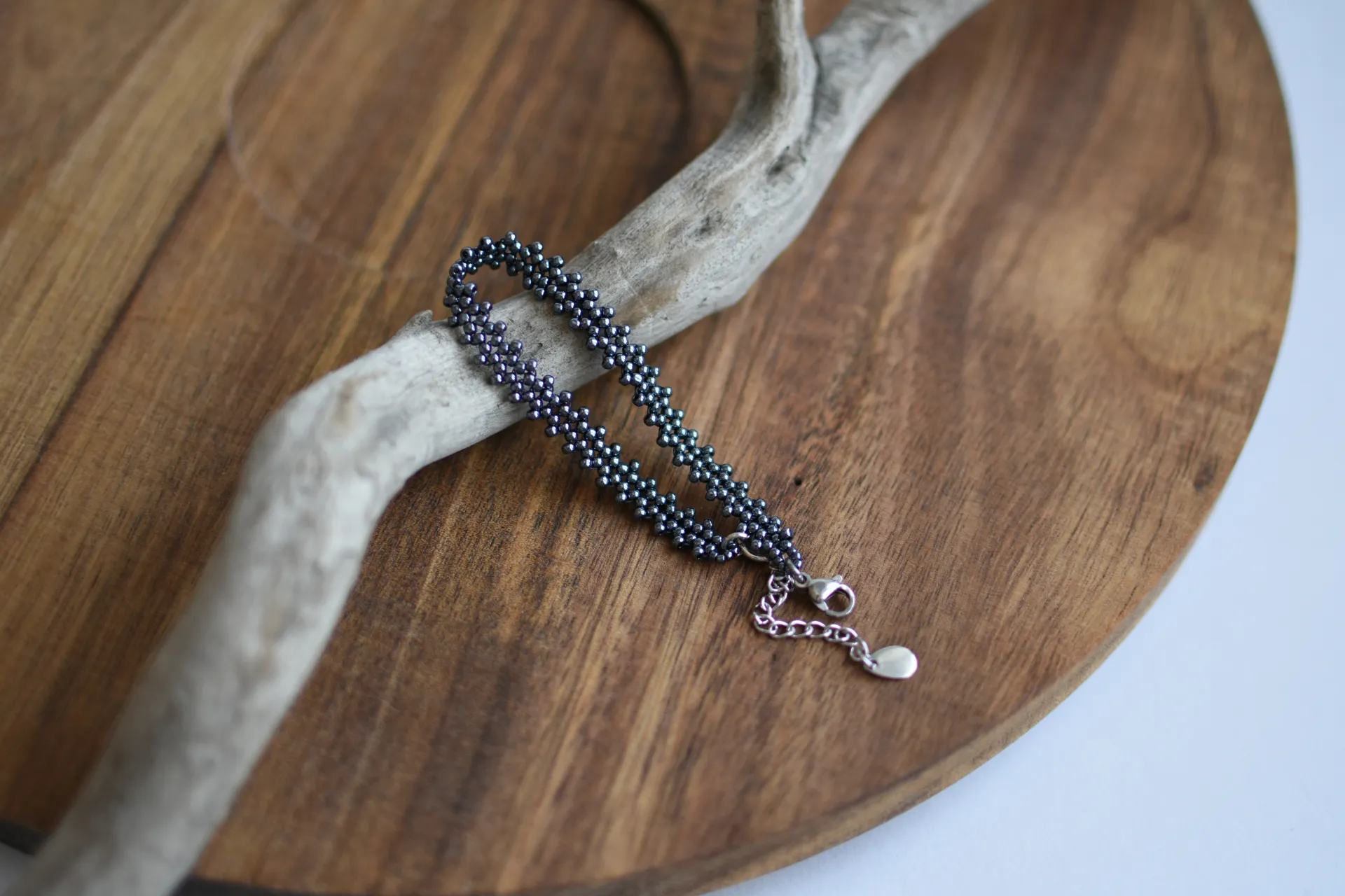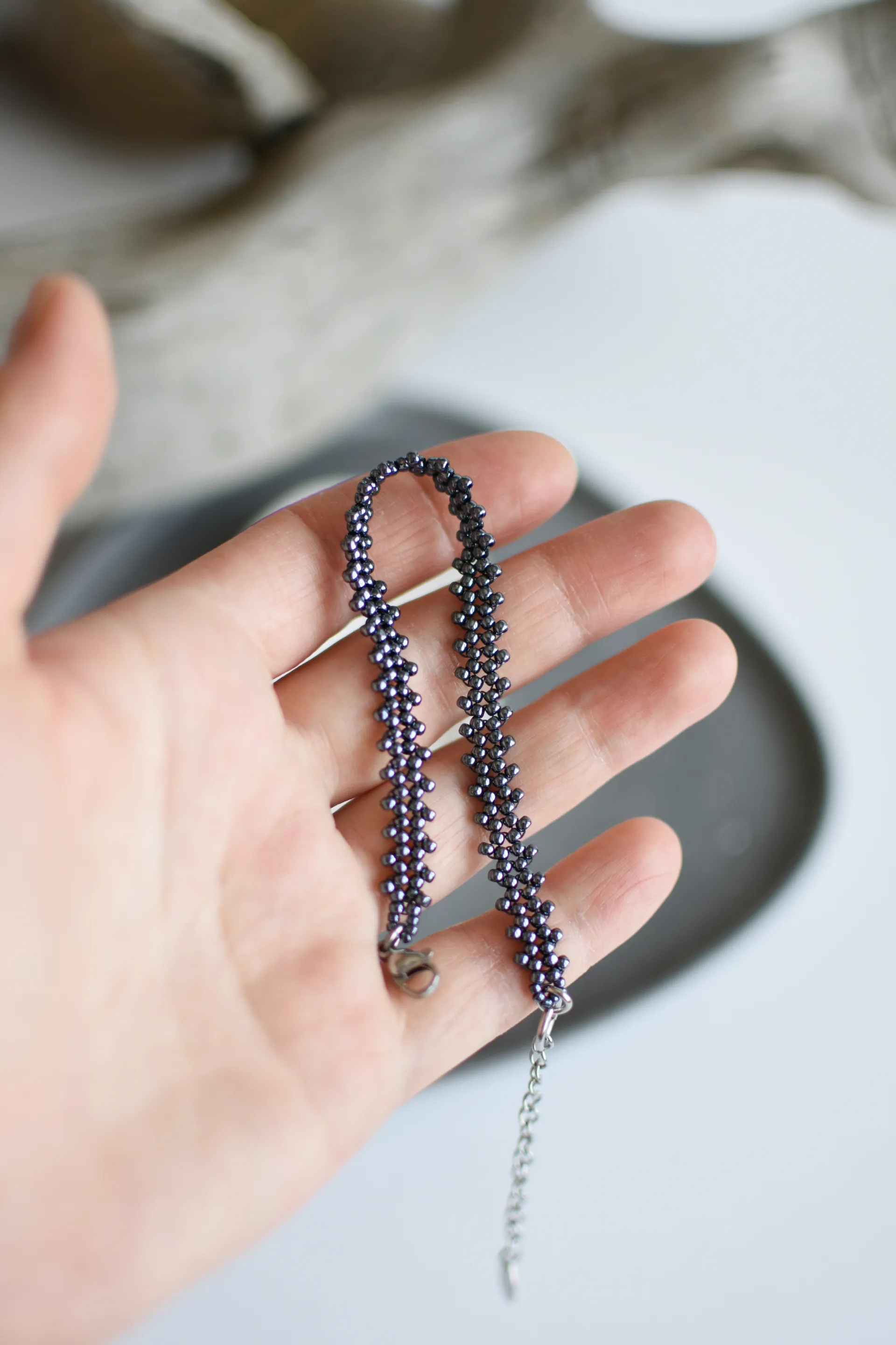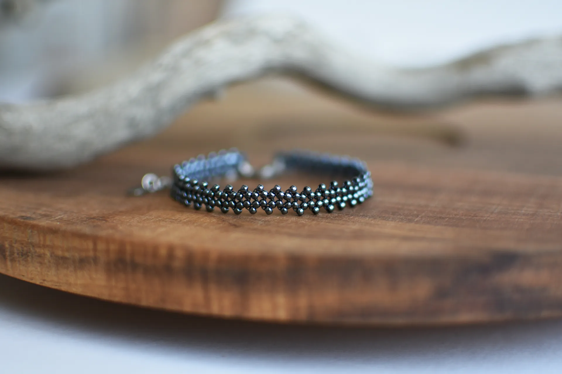 Тонкий браслет из бисера красного и гематитового цветов.