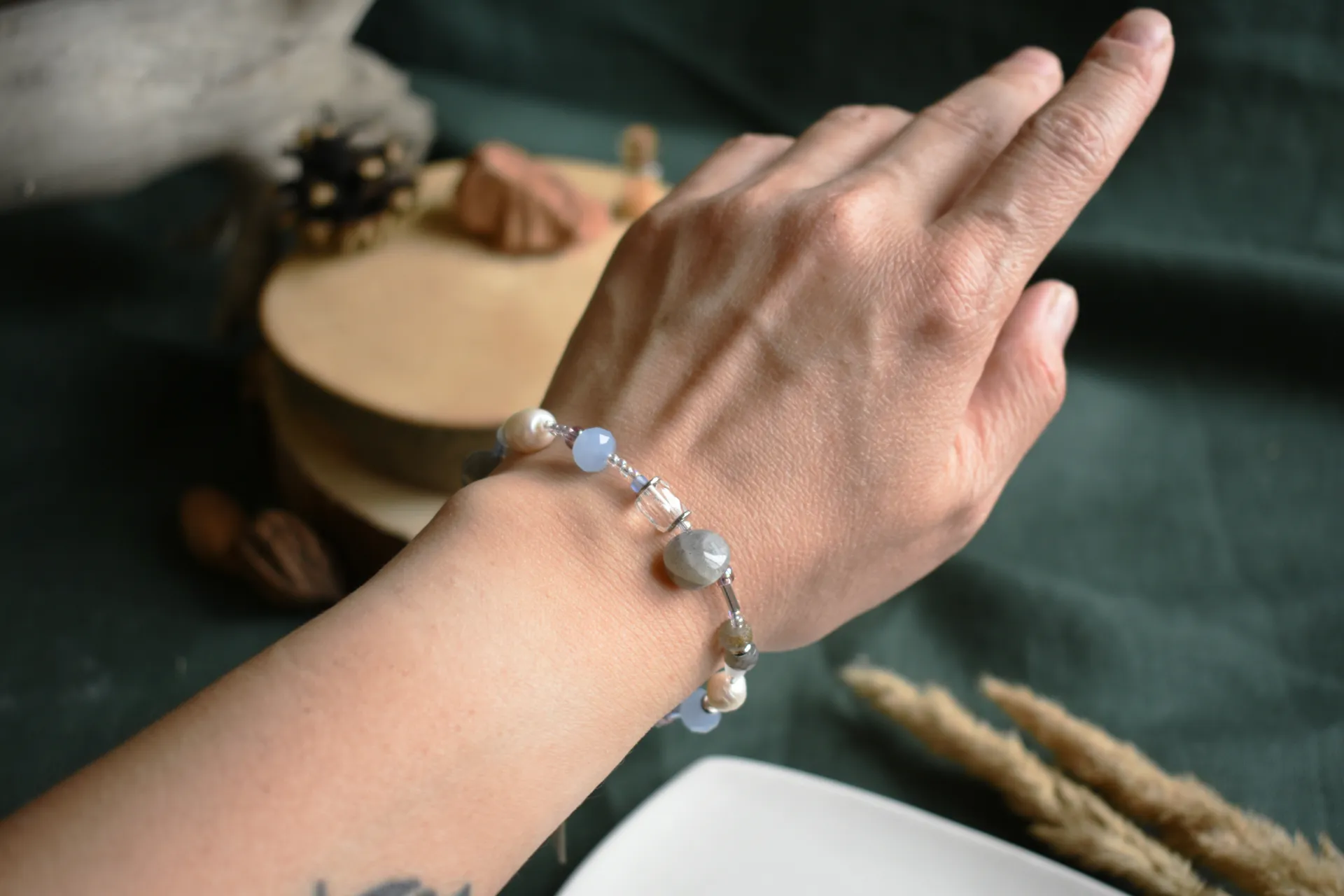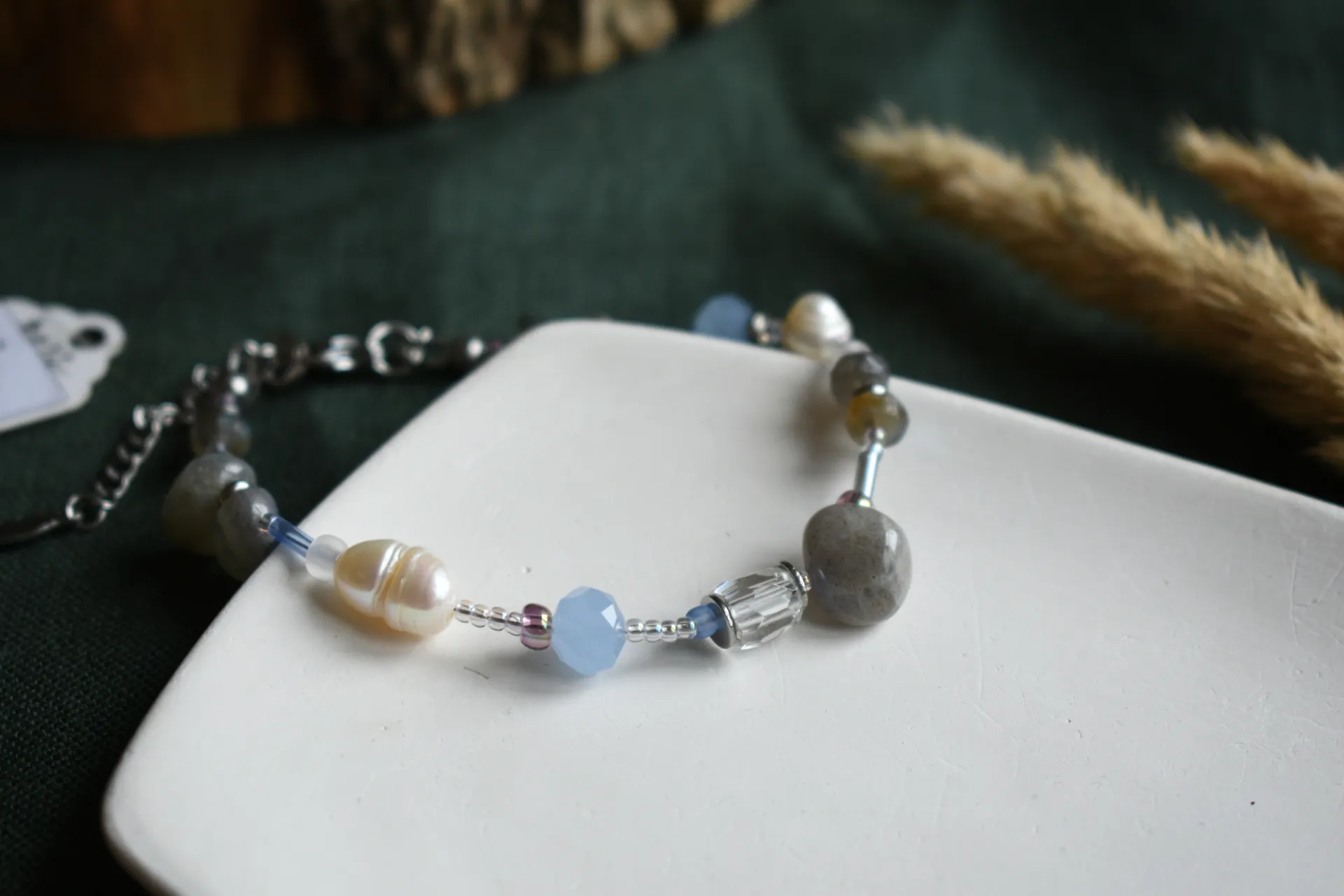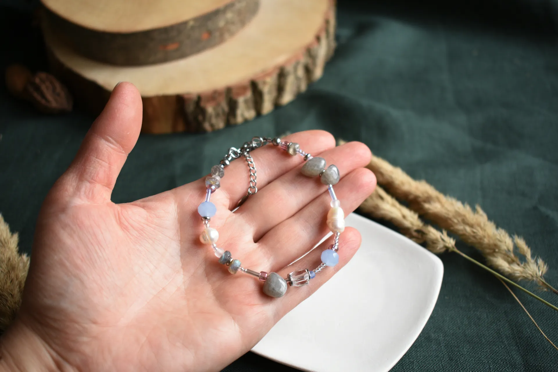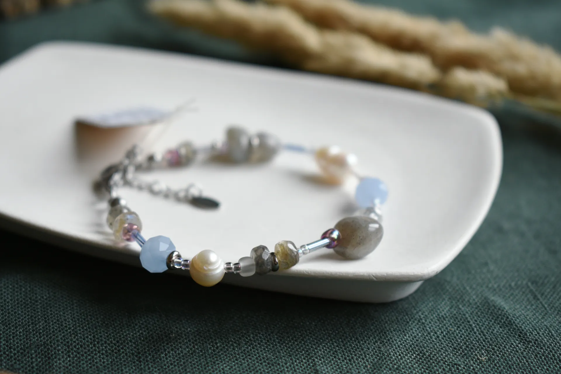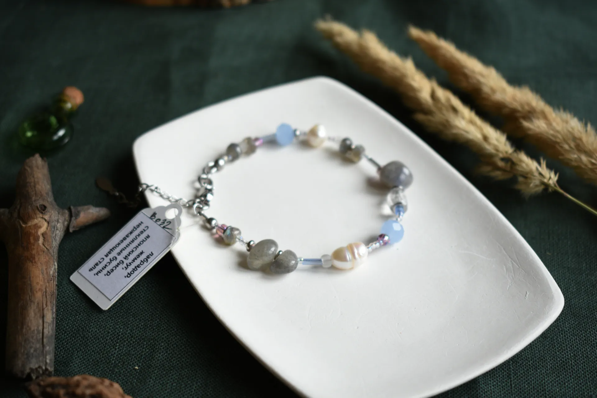 Нежный браслет с разными бусинами лабрадора и культвированного жемчуга. Подойдет на запястье обхватом от 17см.