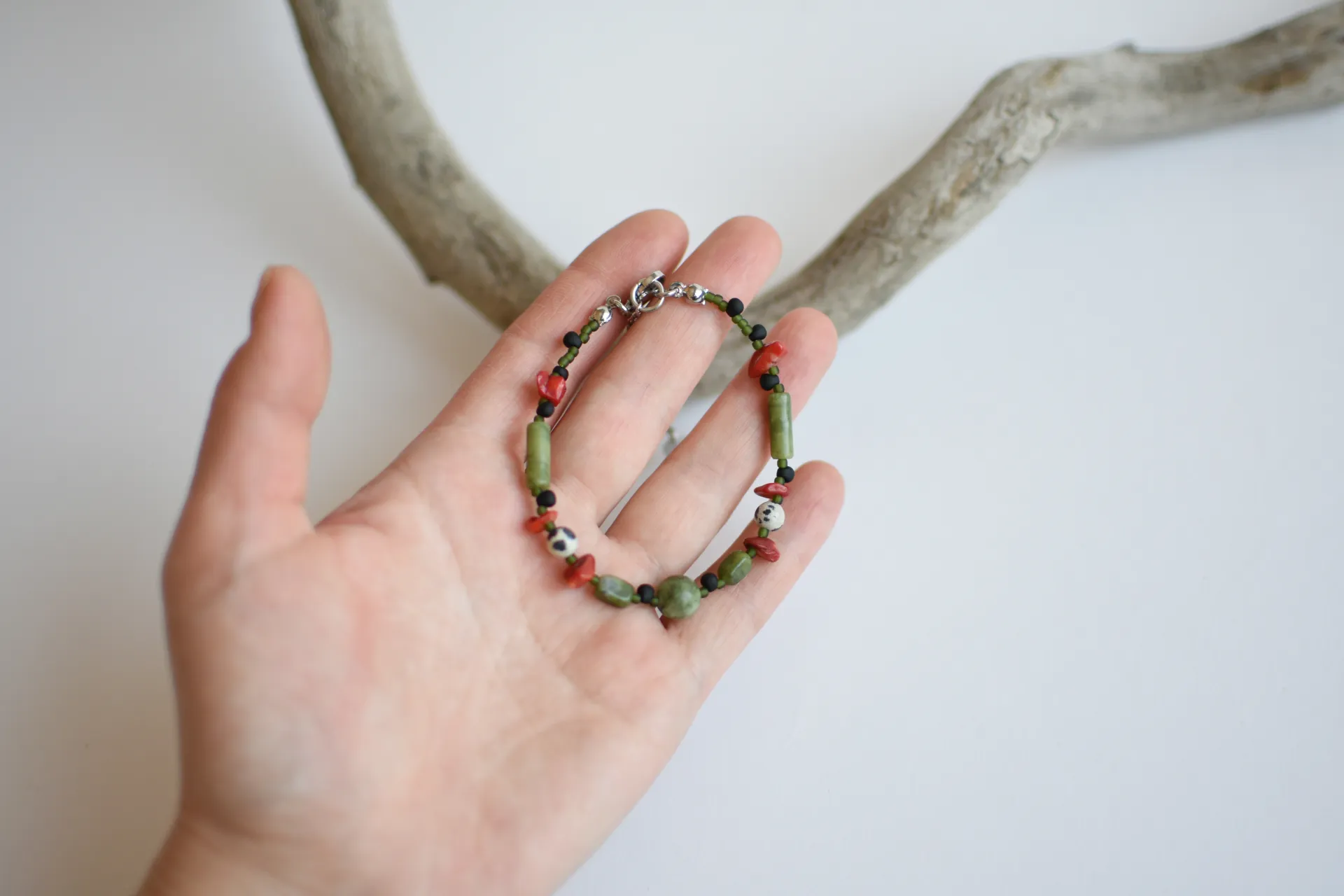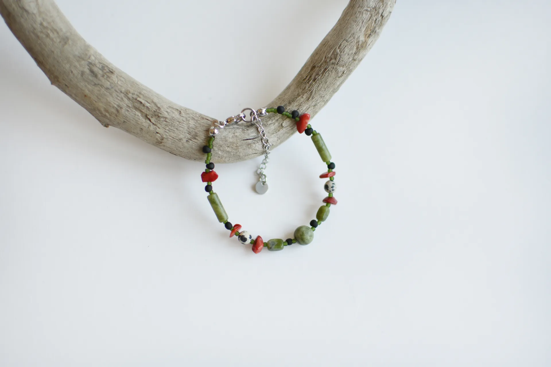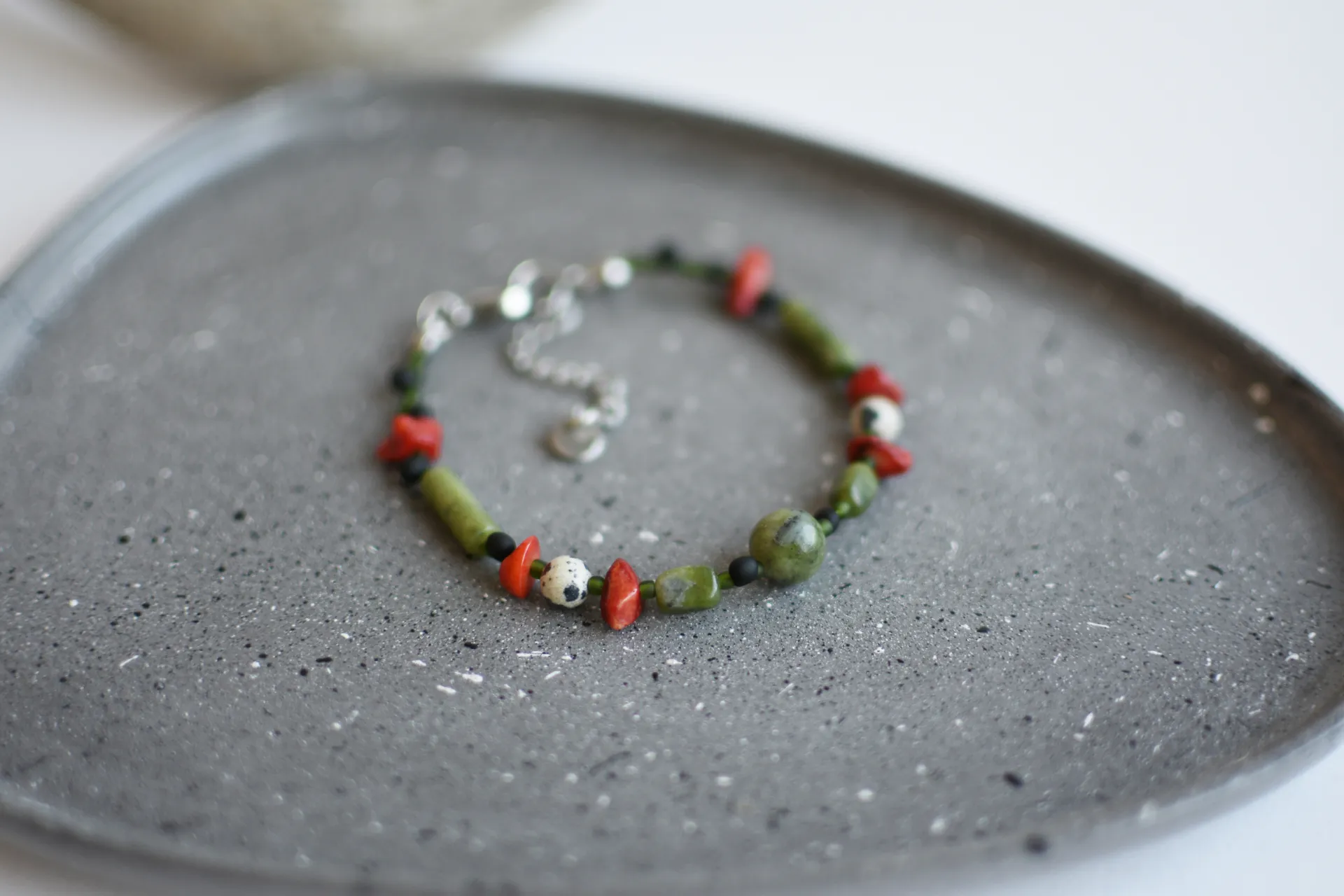 Браслет из серпентина с яркими вкраплениями коралла и далматиновой яшмы (порфир).