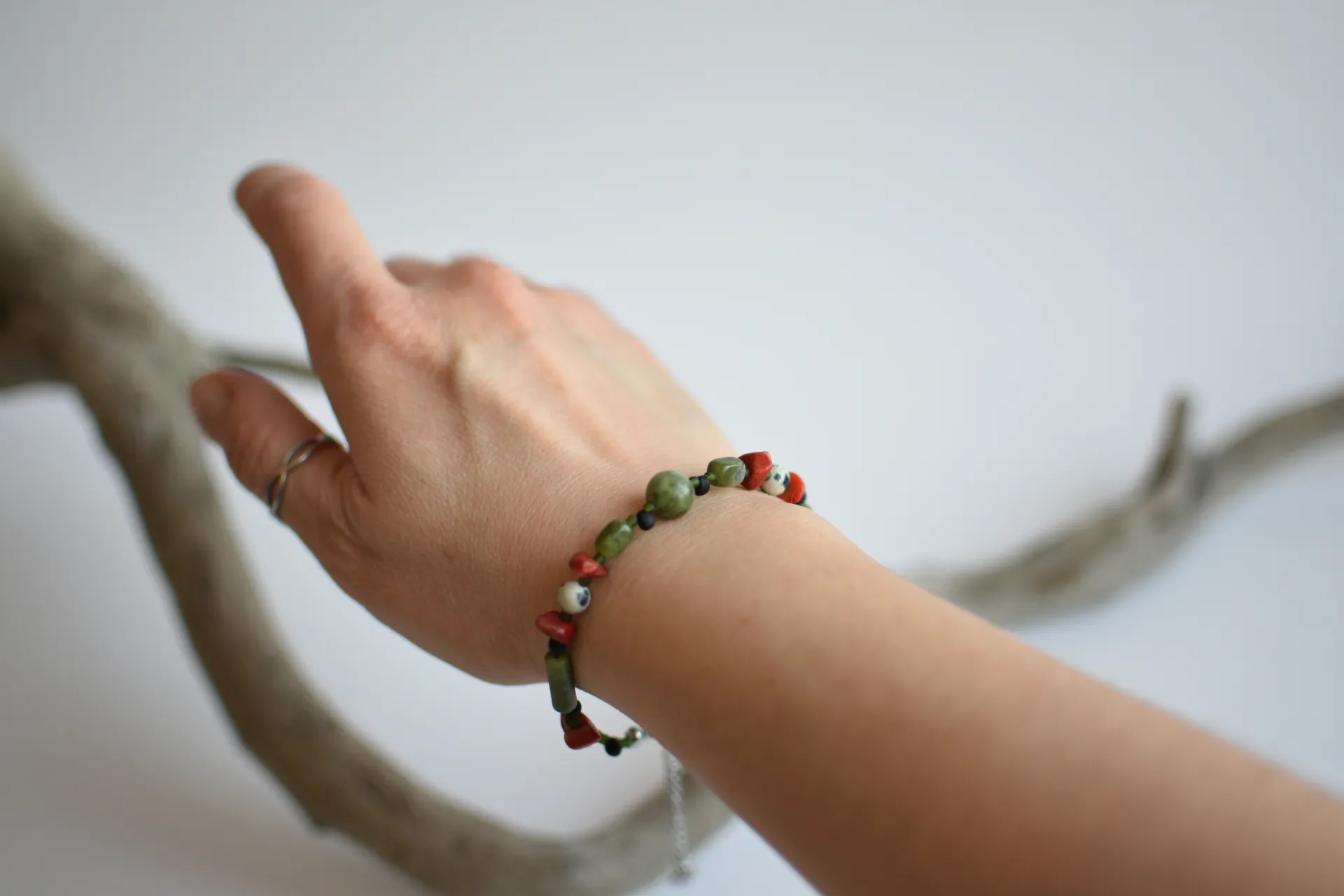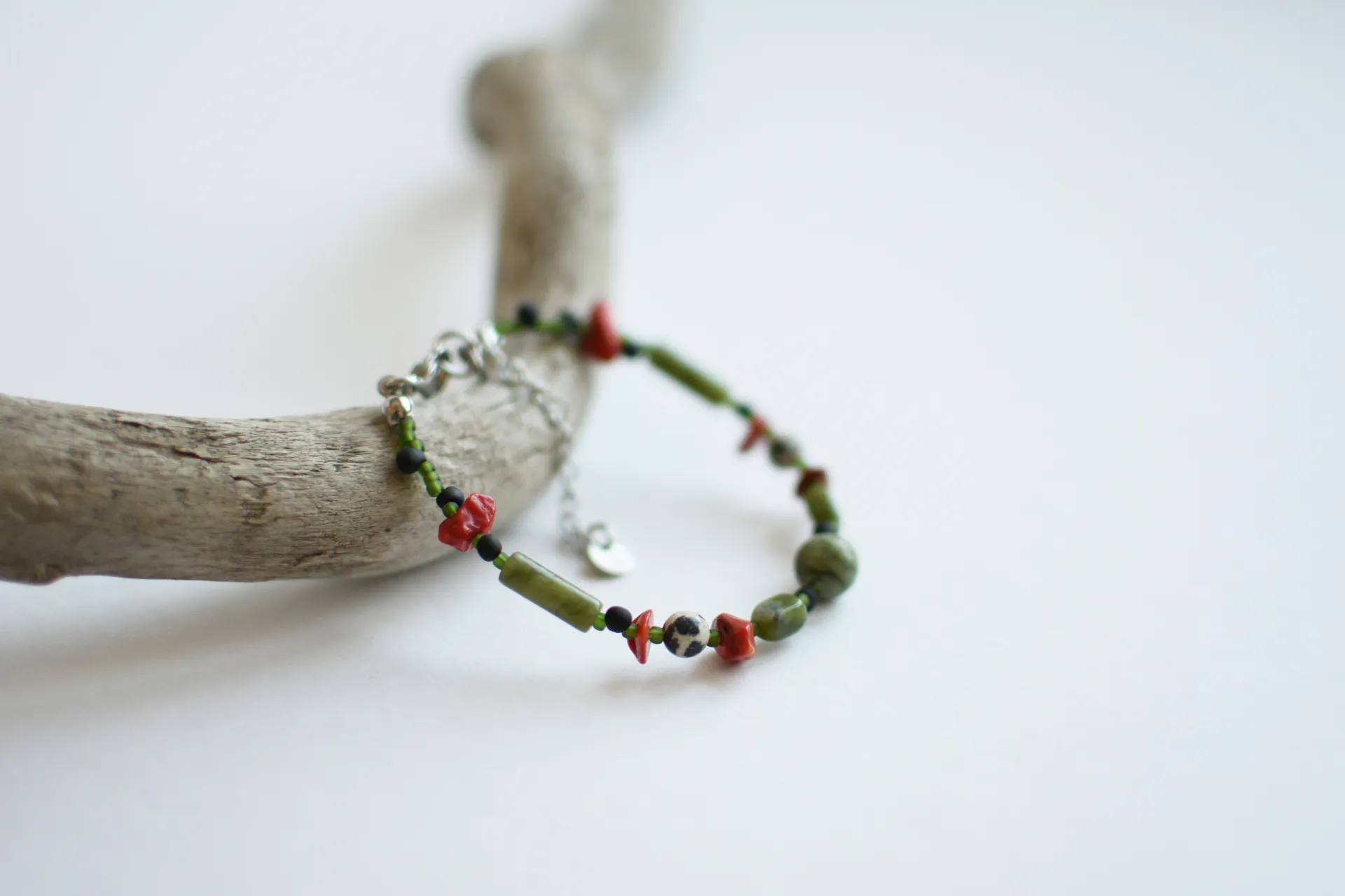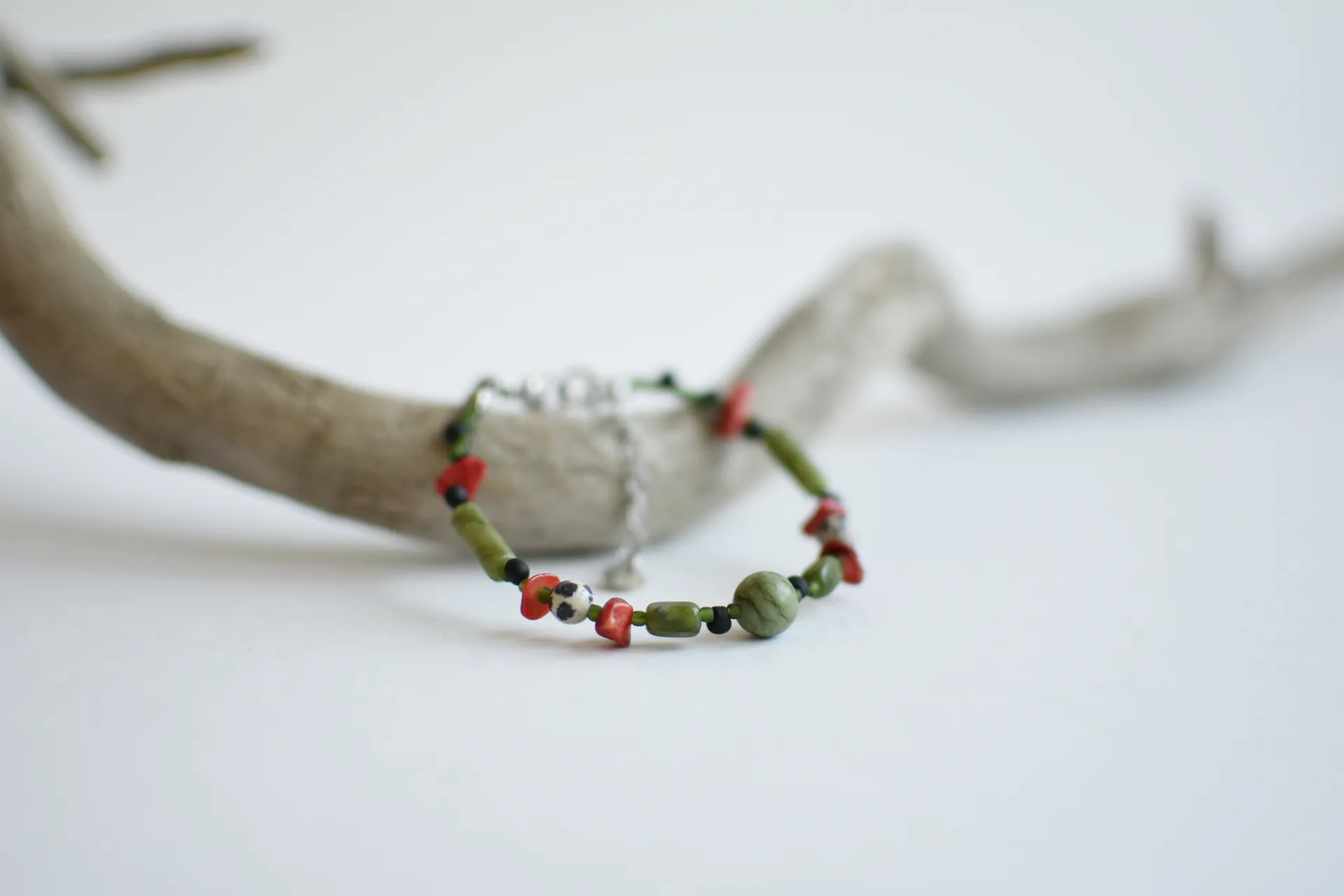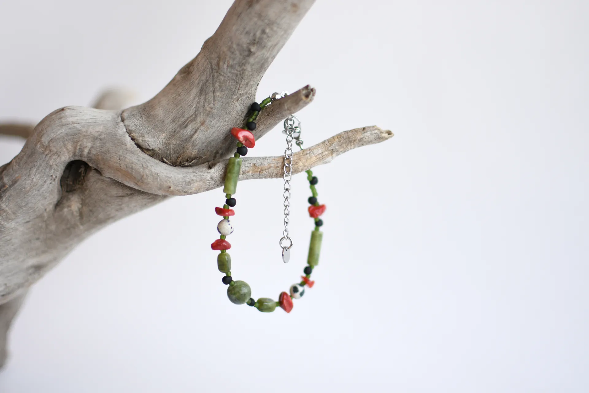 Браслет из серпентина с яркими вкраплениями коралла и далматиновой яшмы (порфир).