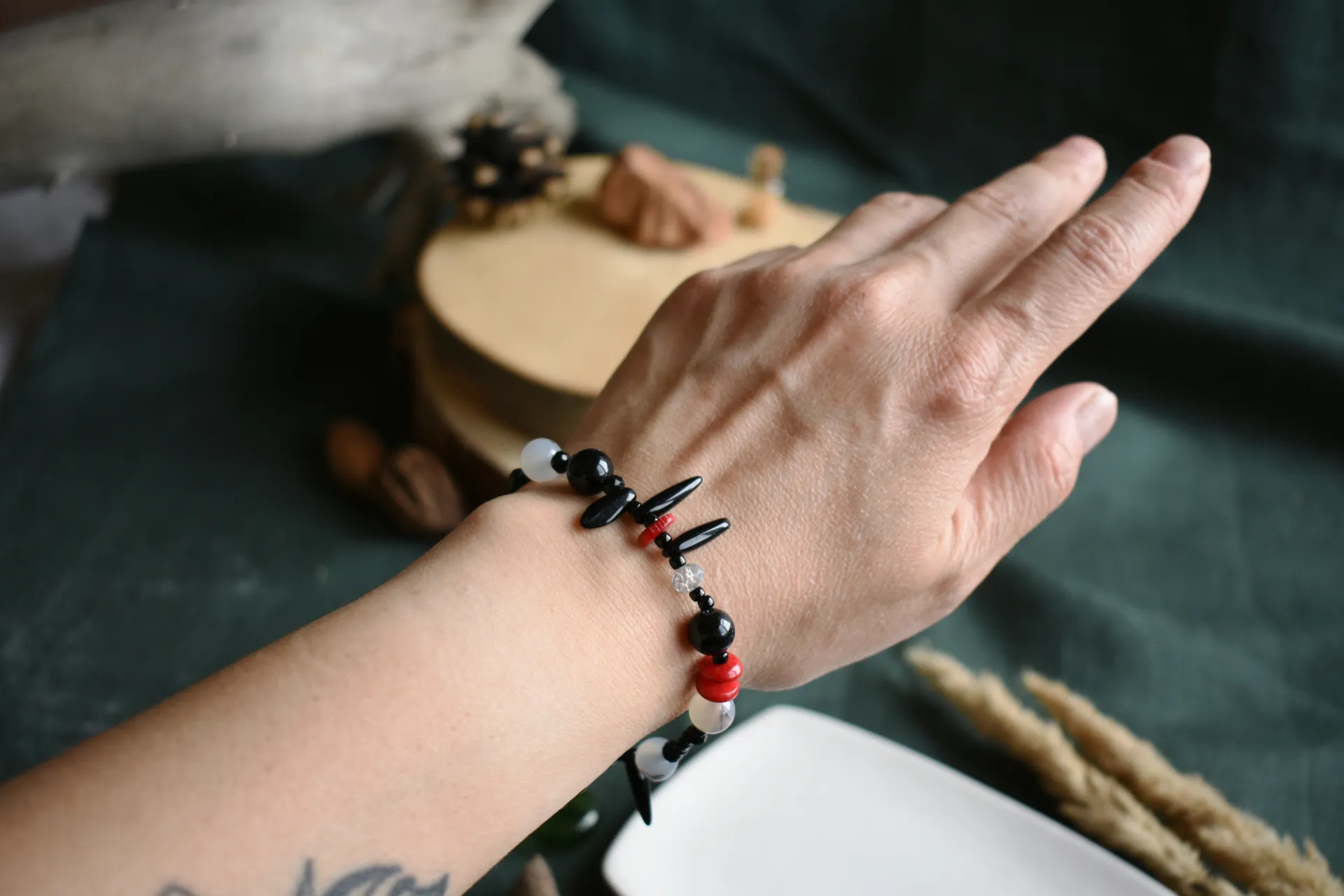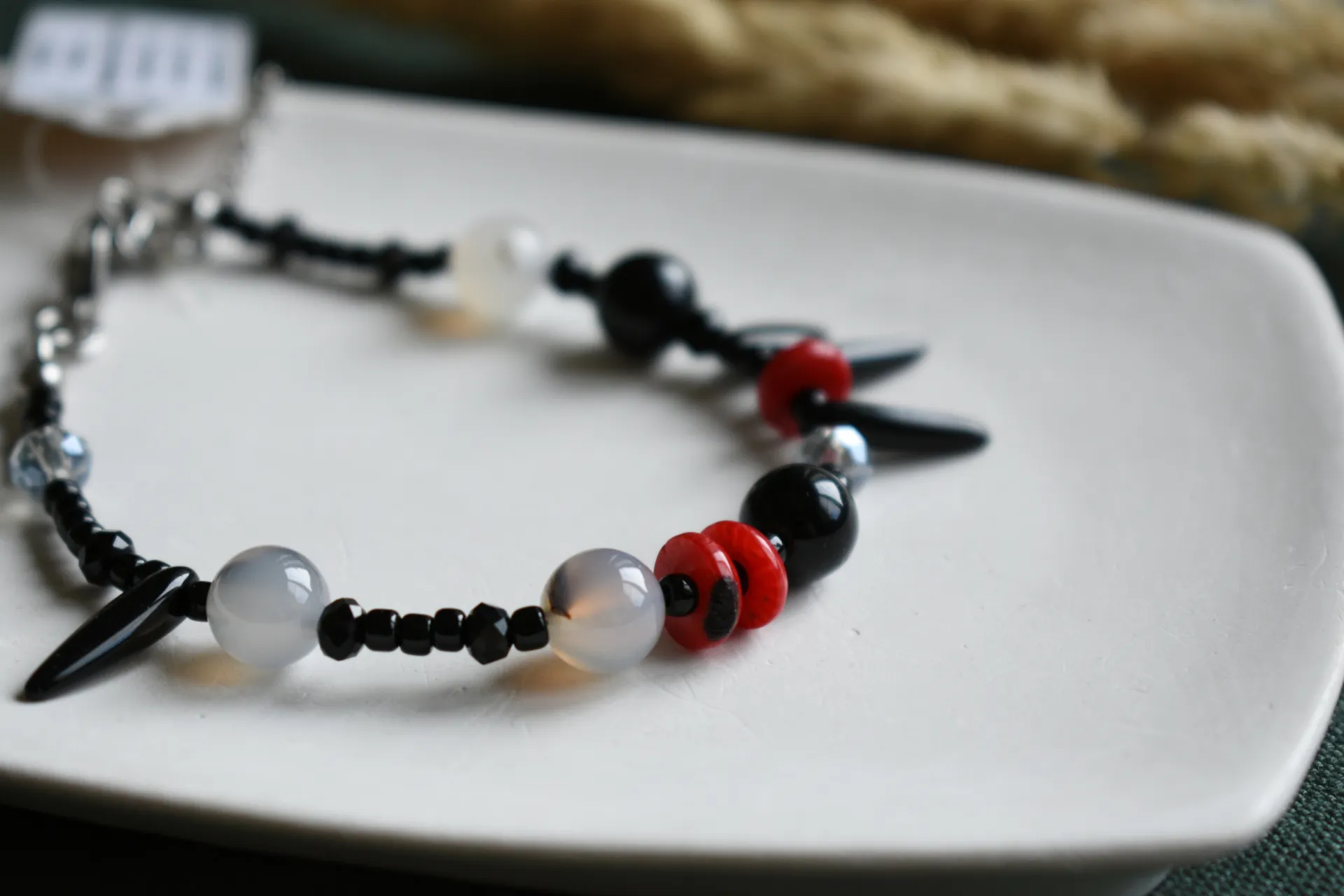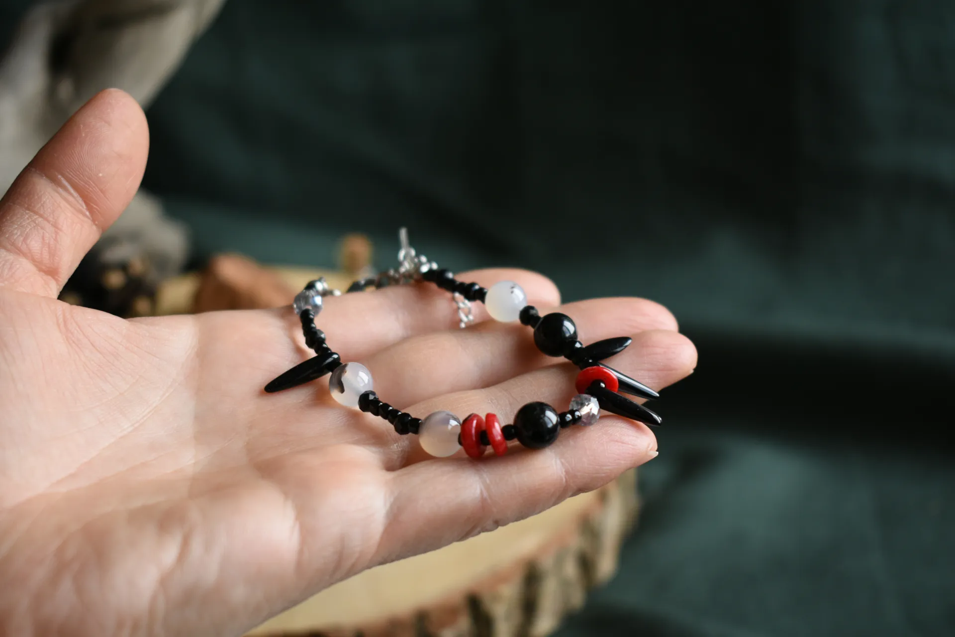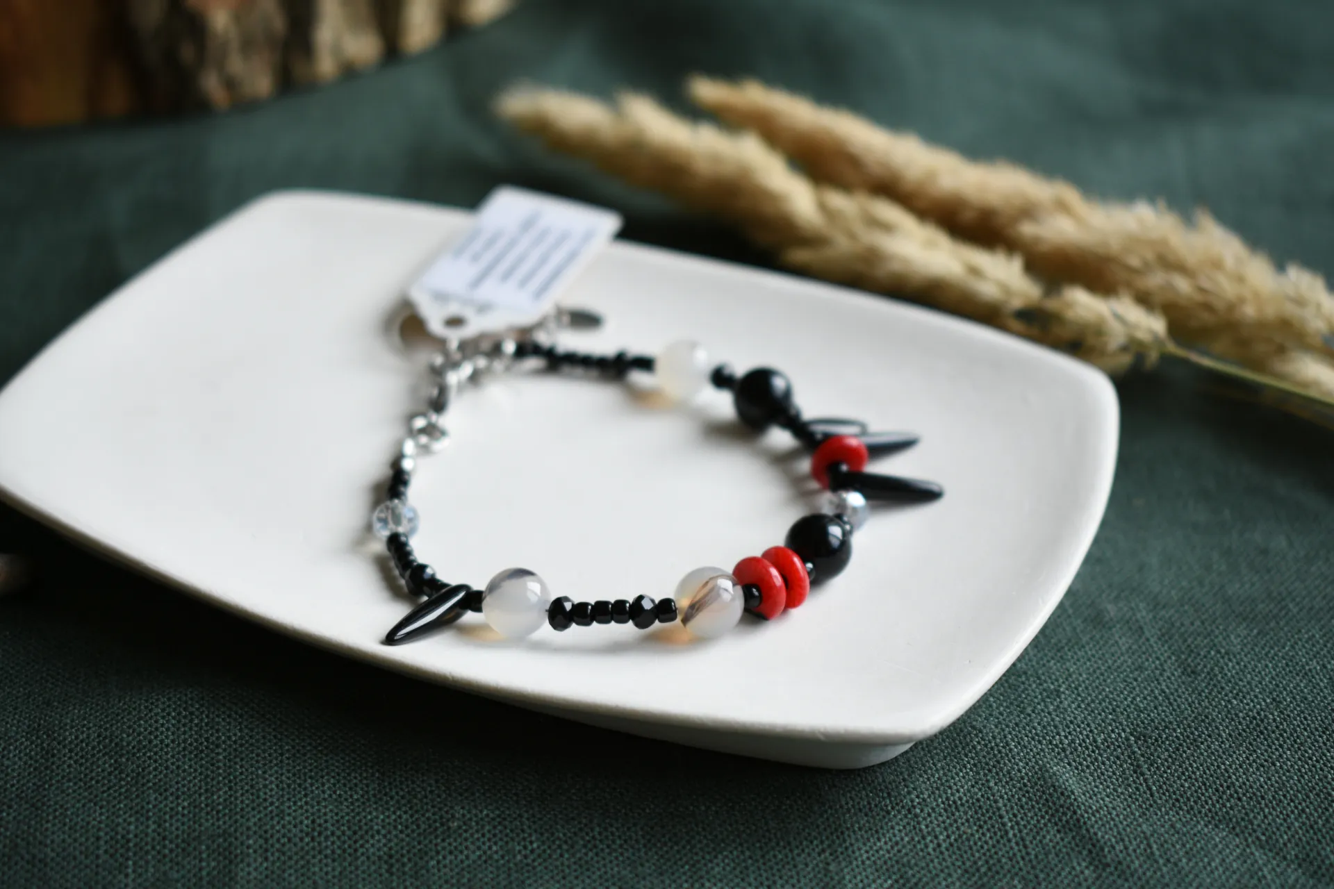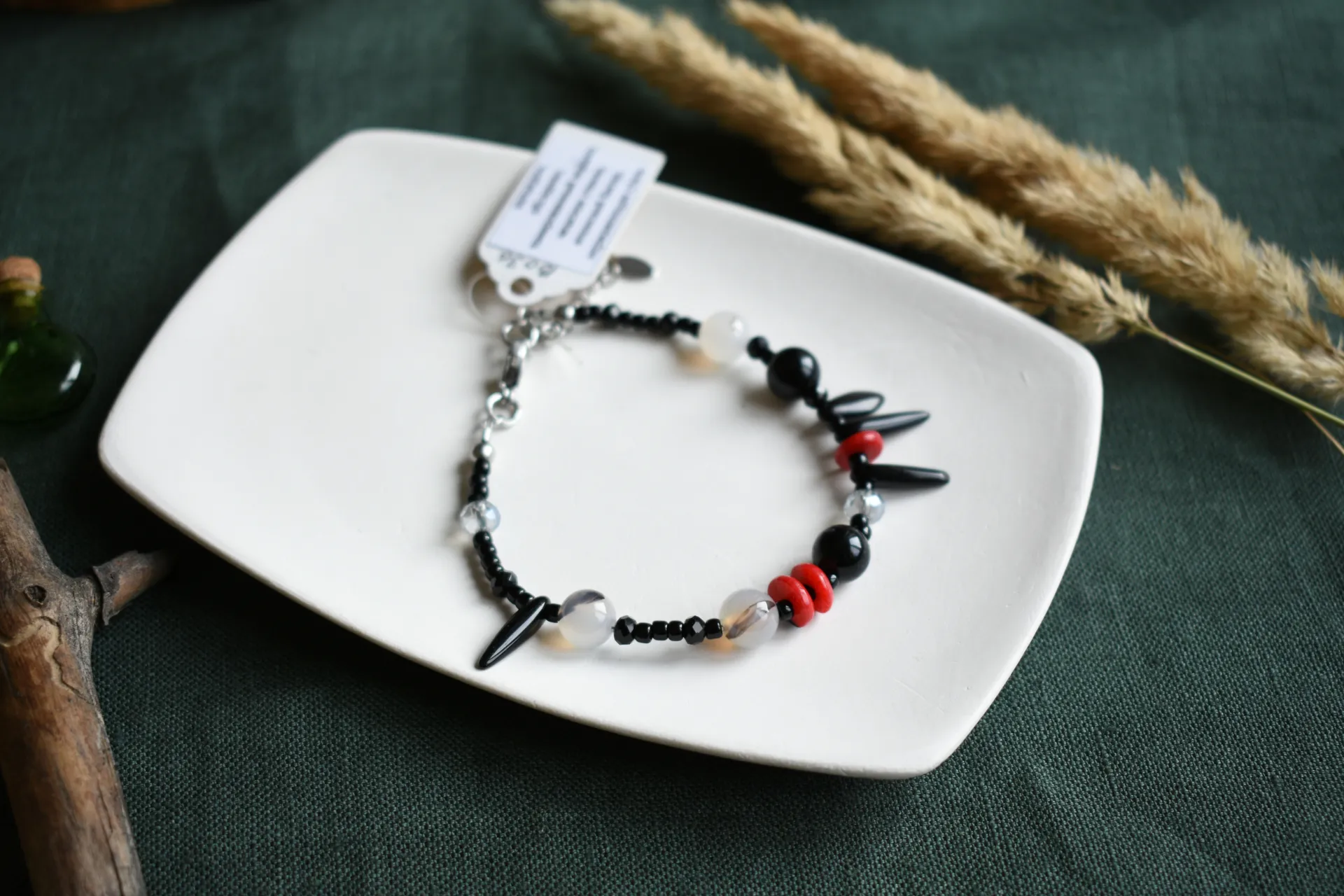 Дерзкий браслет с натуральными камнями и бусинами-шипами из чешского стекла. Подойдет для запястья от 17см.