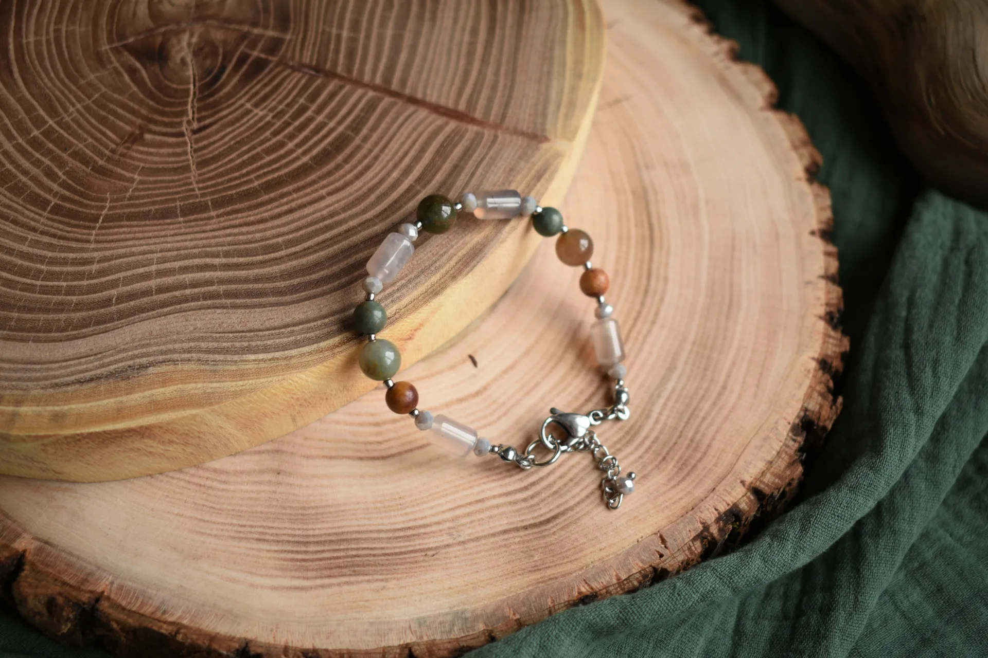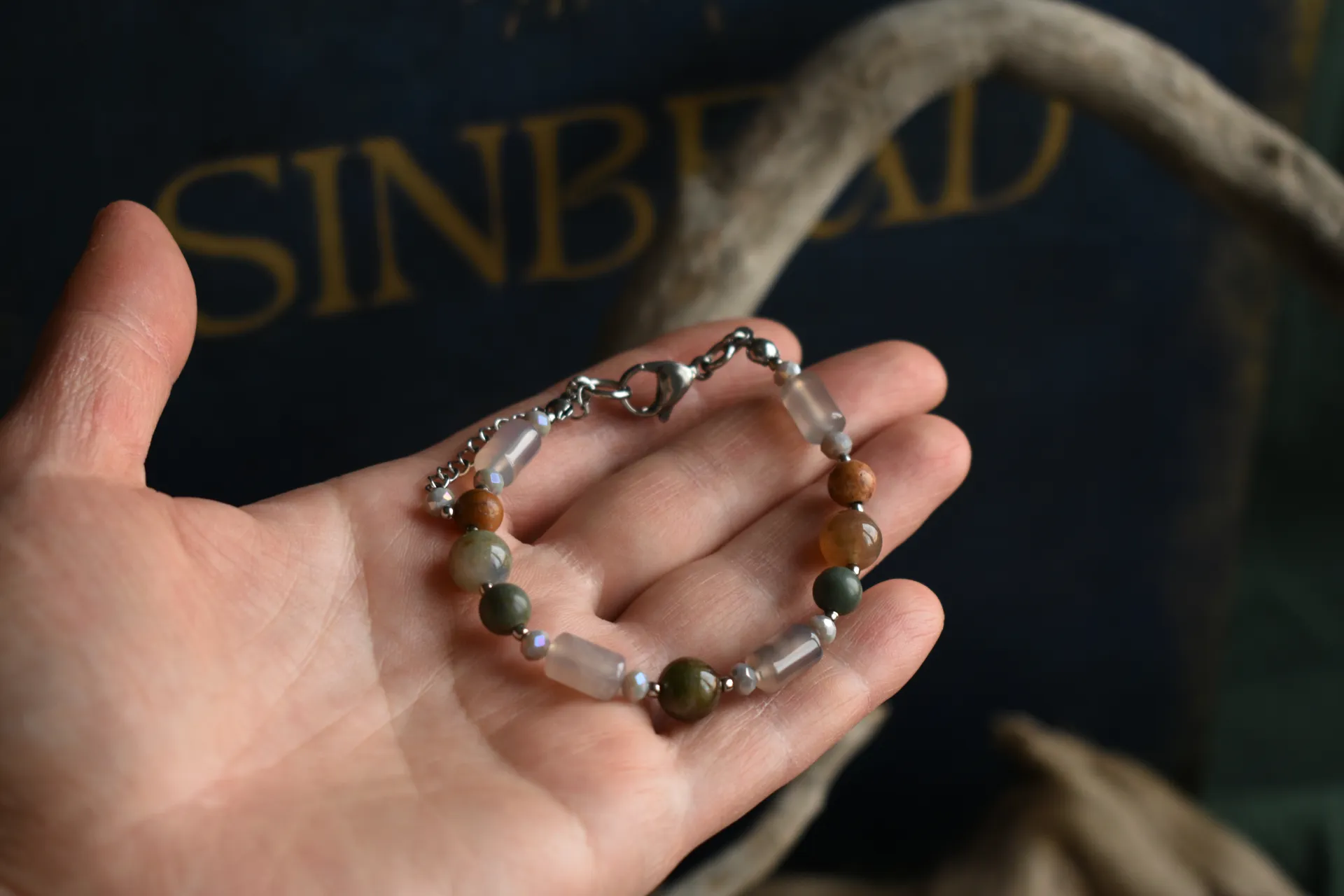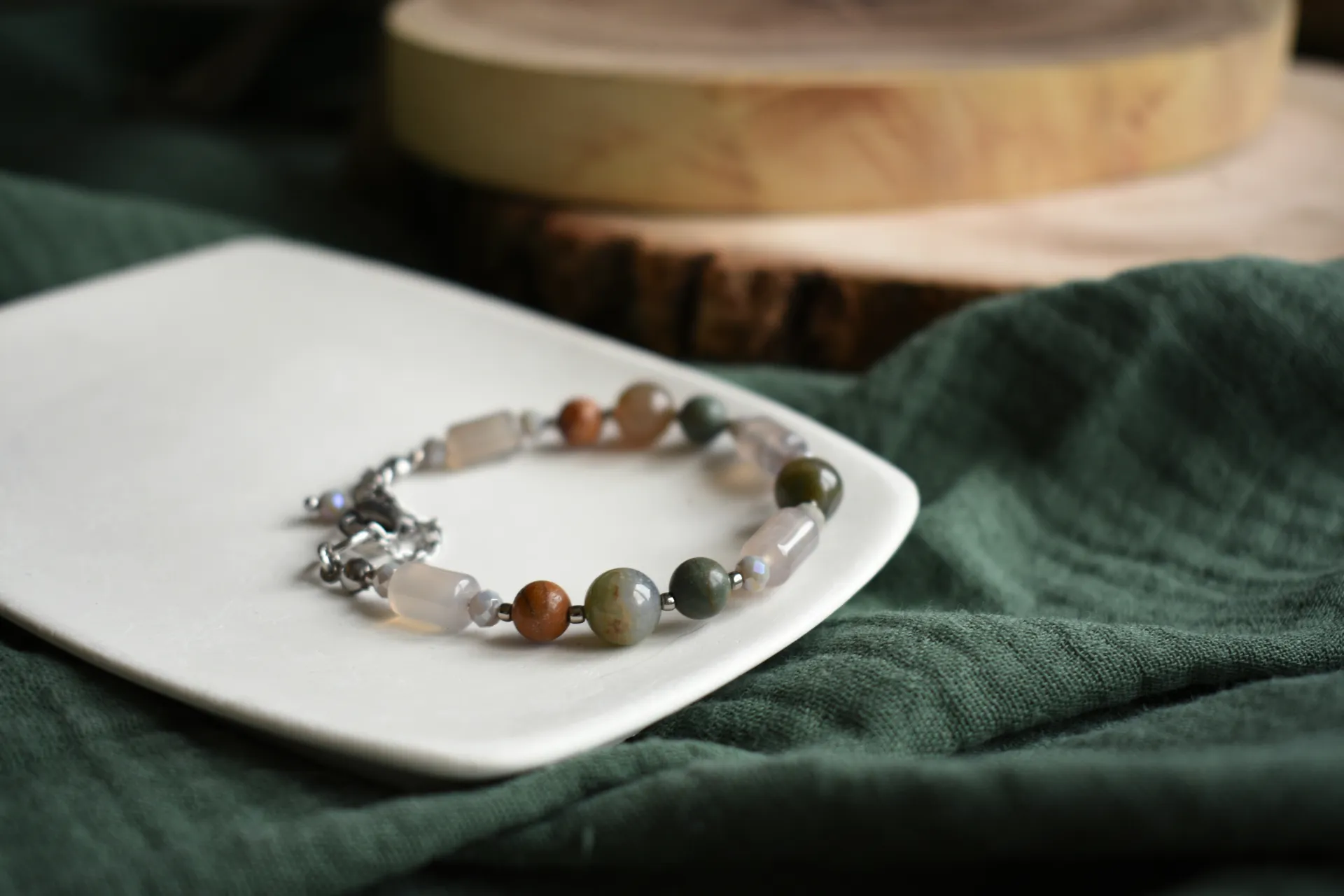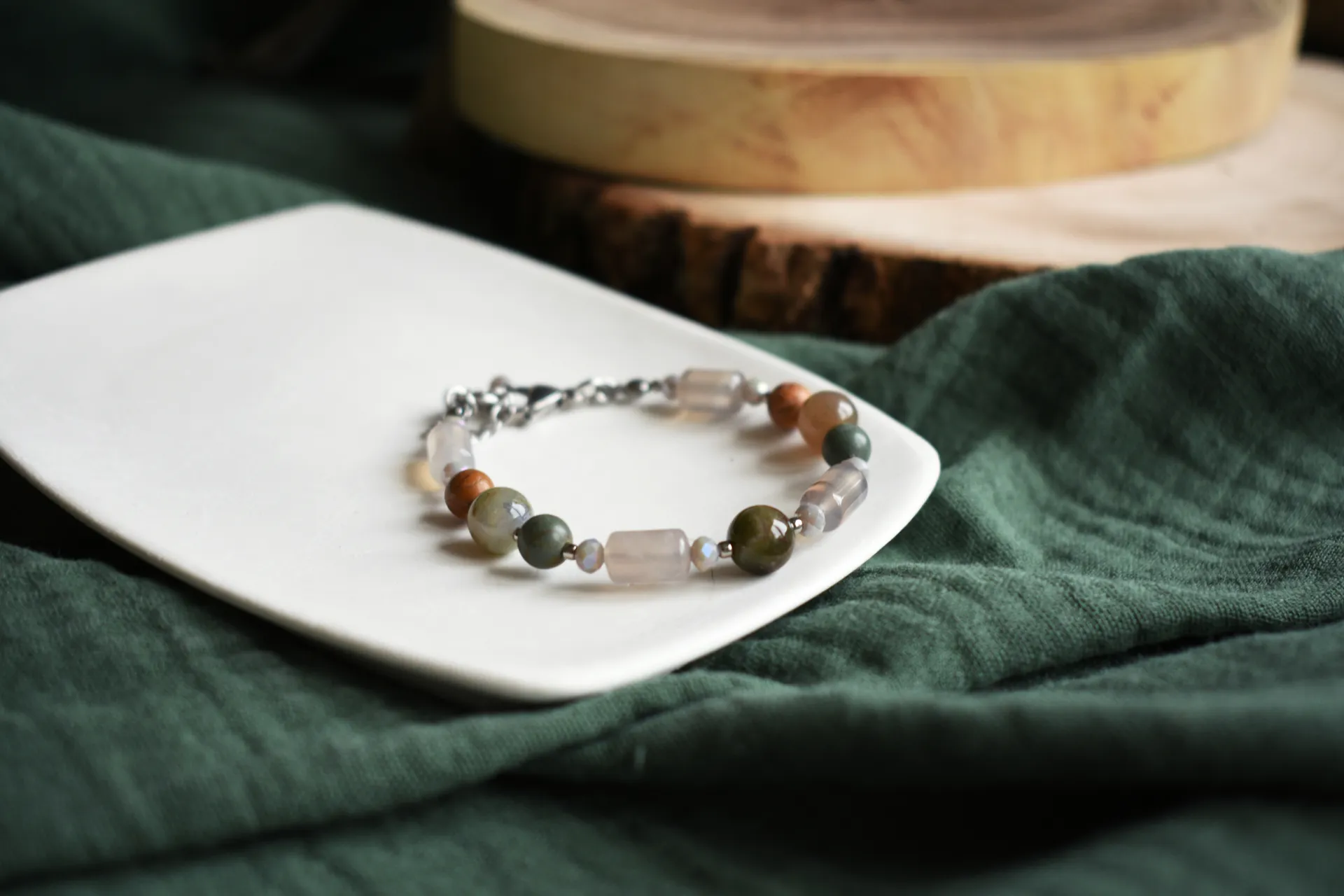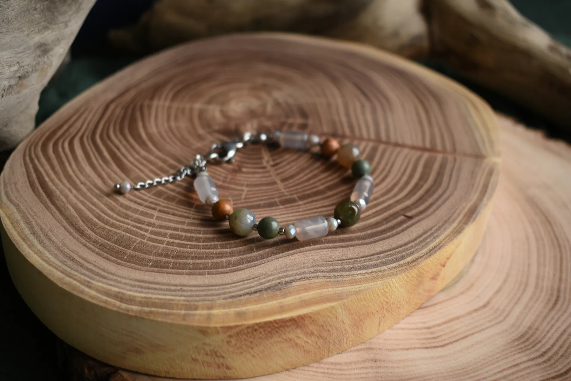 Браслет из натуральных камней в спокойных тонах. Подойдет на запястье обхватом от 15см.