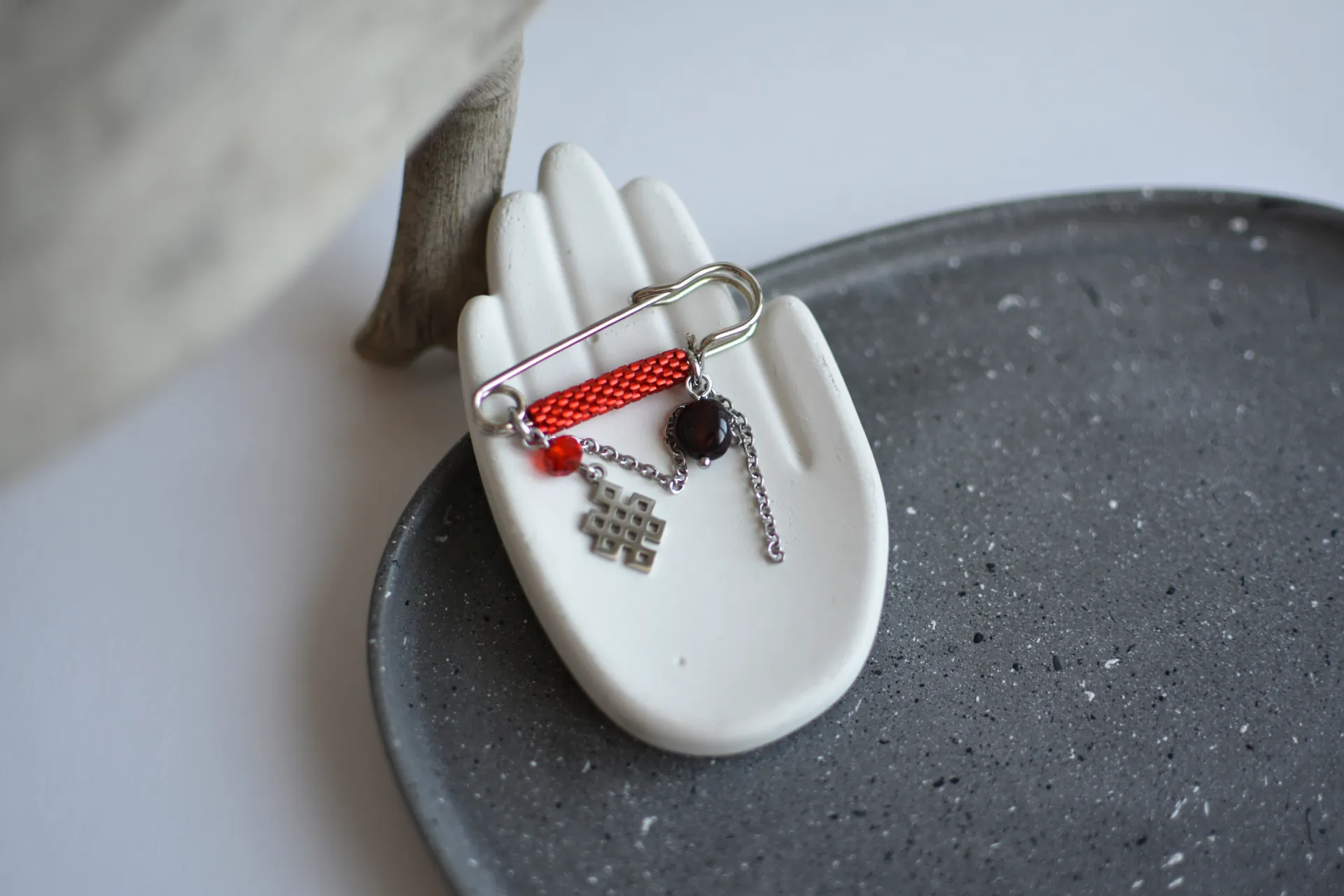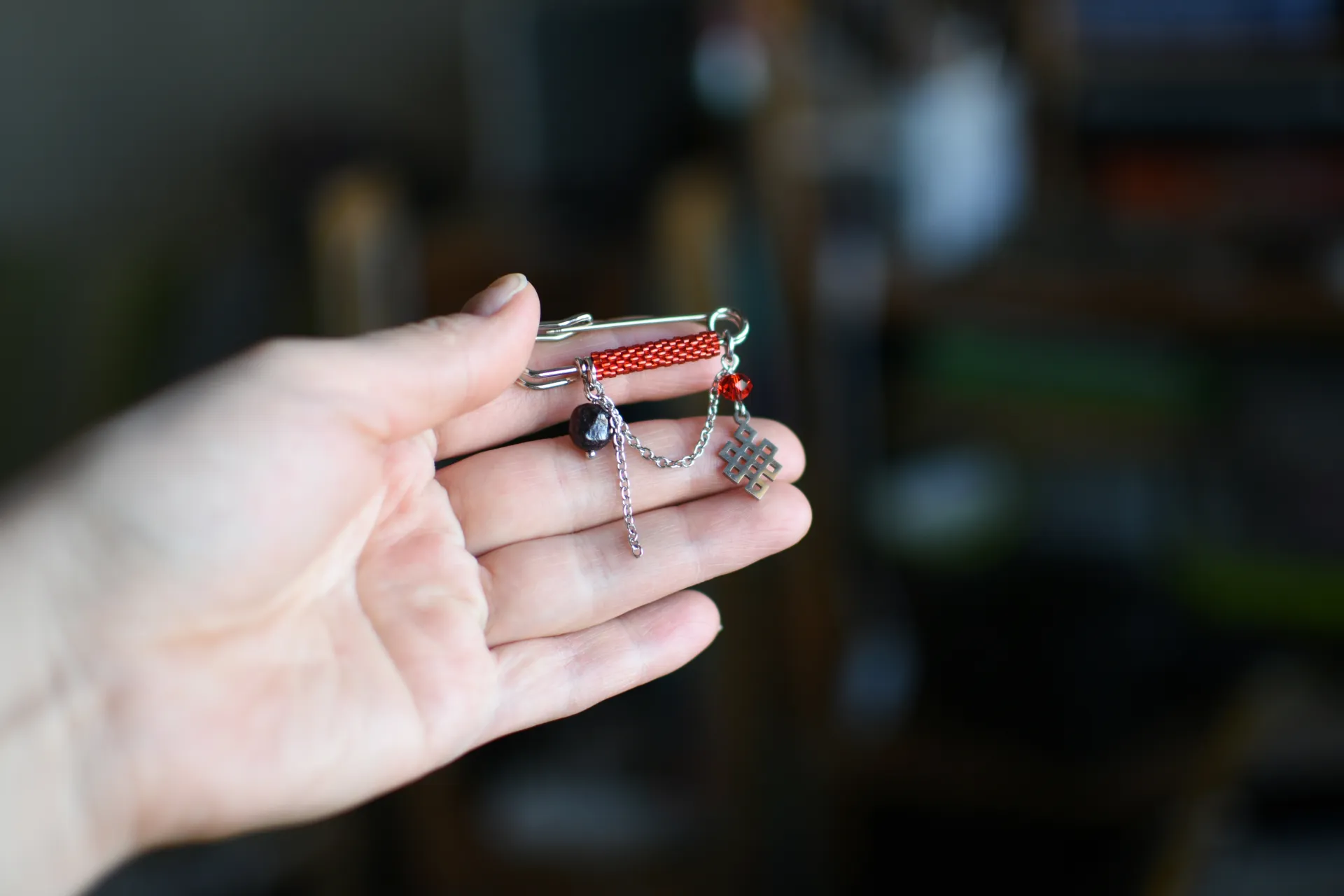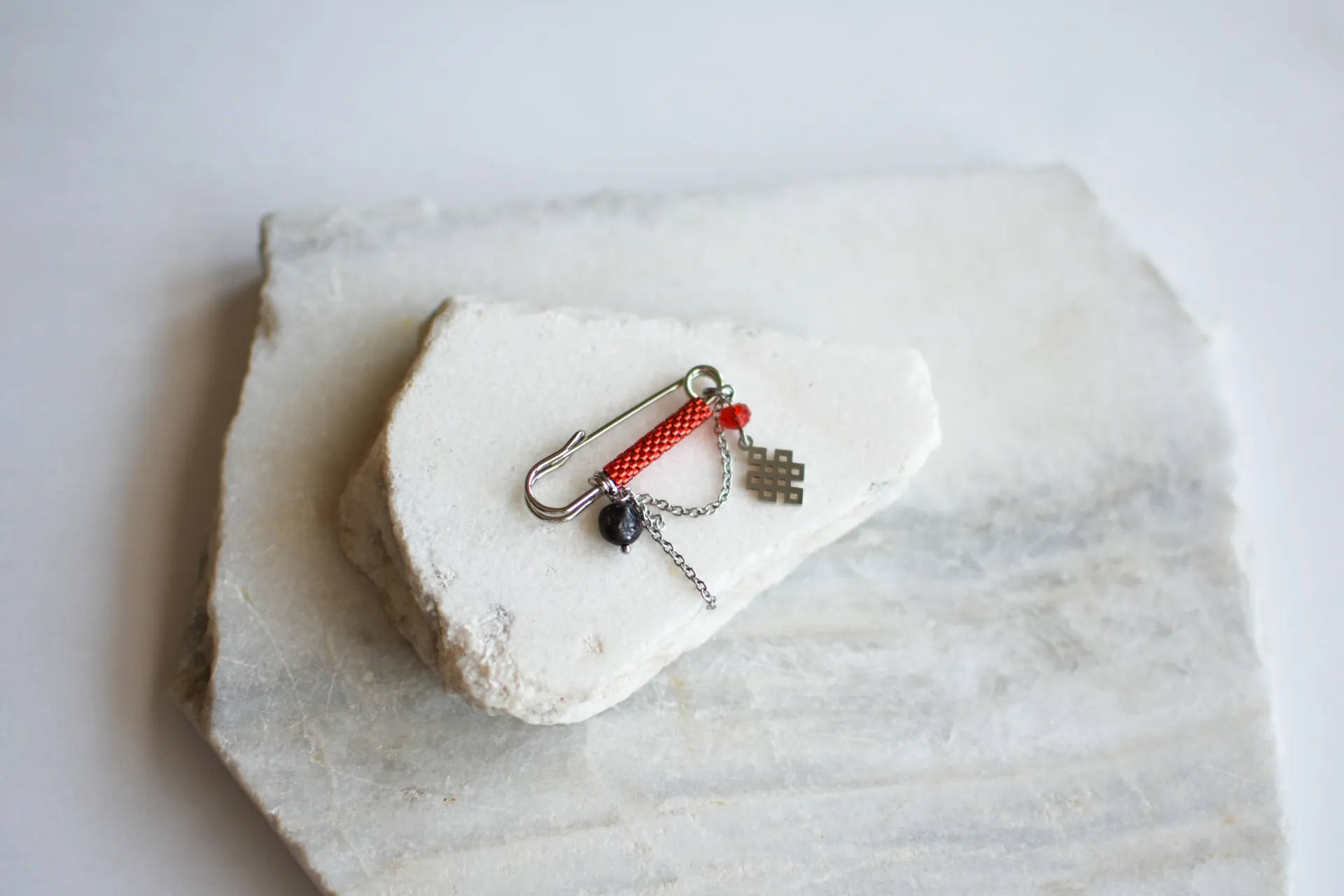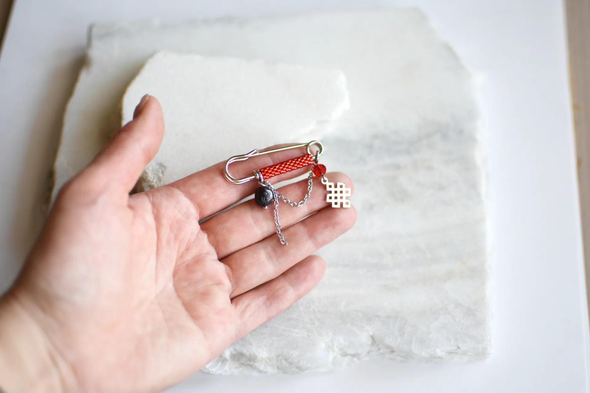 Брошь для вязанных вещей в виде булавки с бисером, элементом "улзы" ("бесконечный узел" счастья, долголетия), цепочками и натуральными камнями.