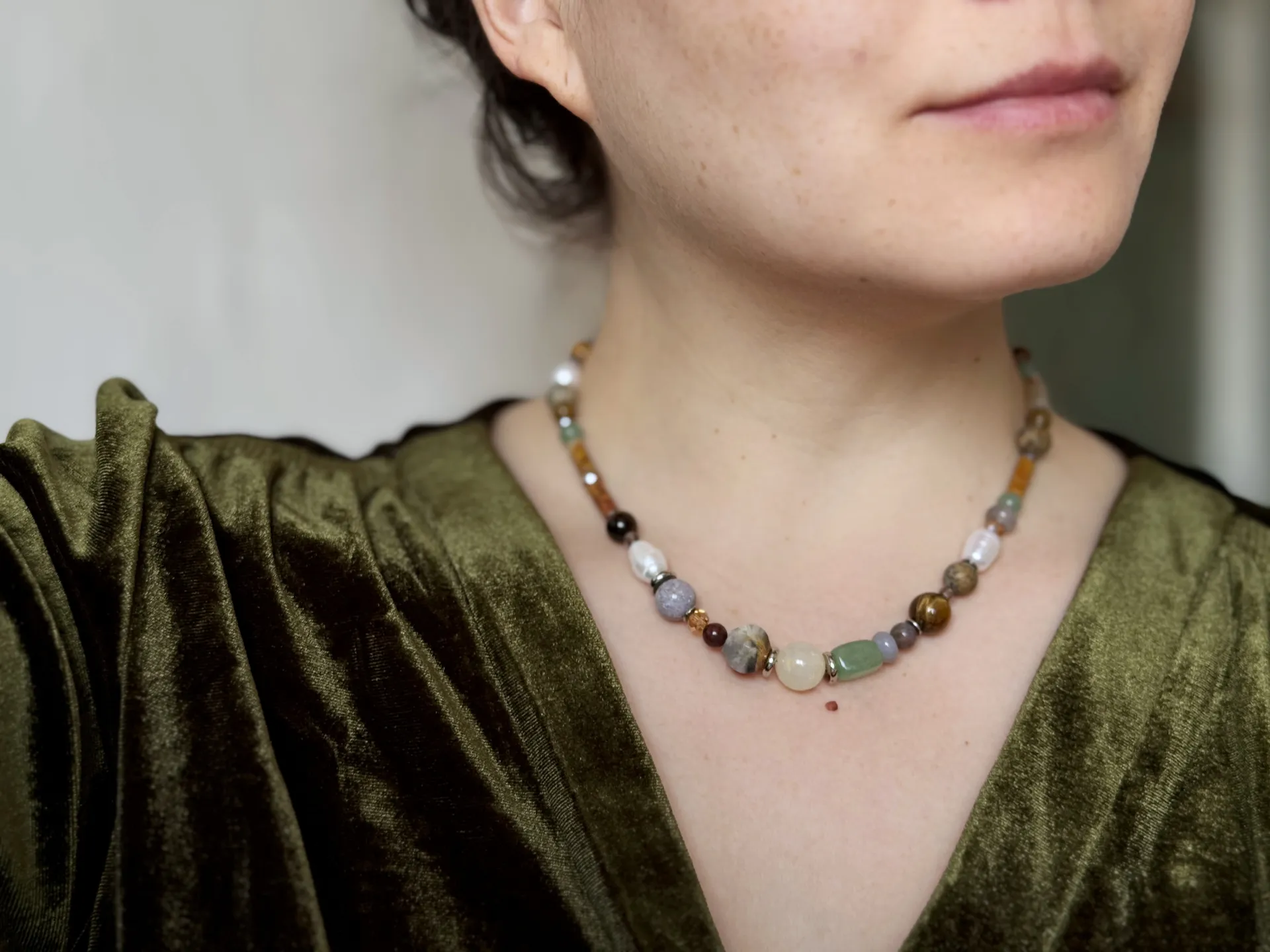 Короткие бусы с различными камнями и жемчугом.