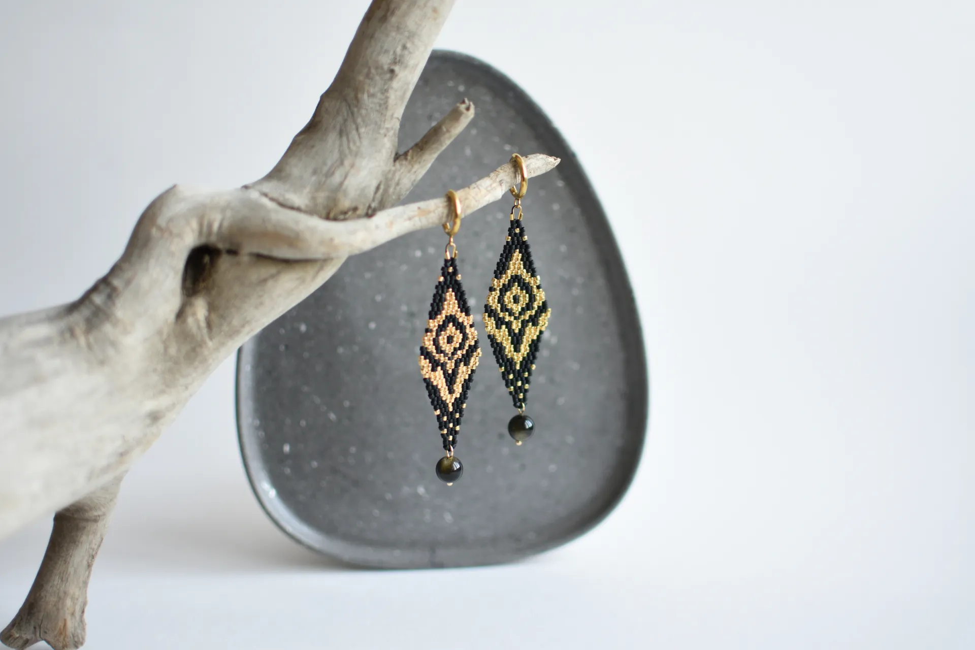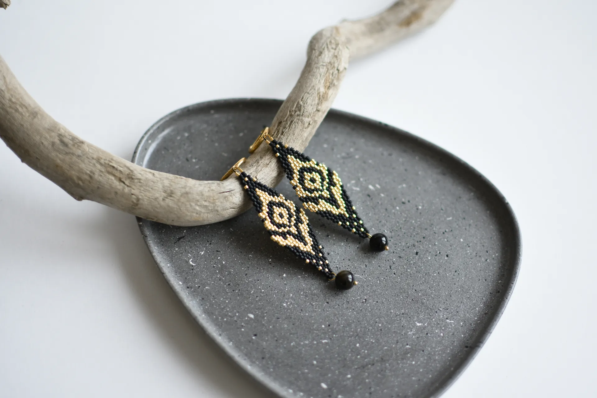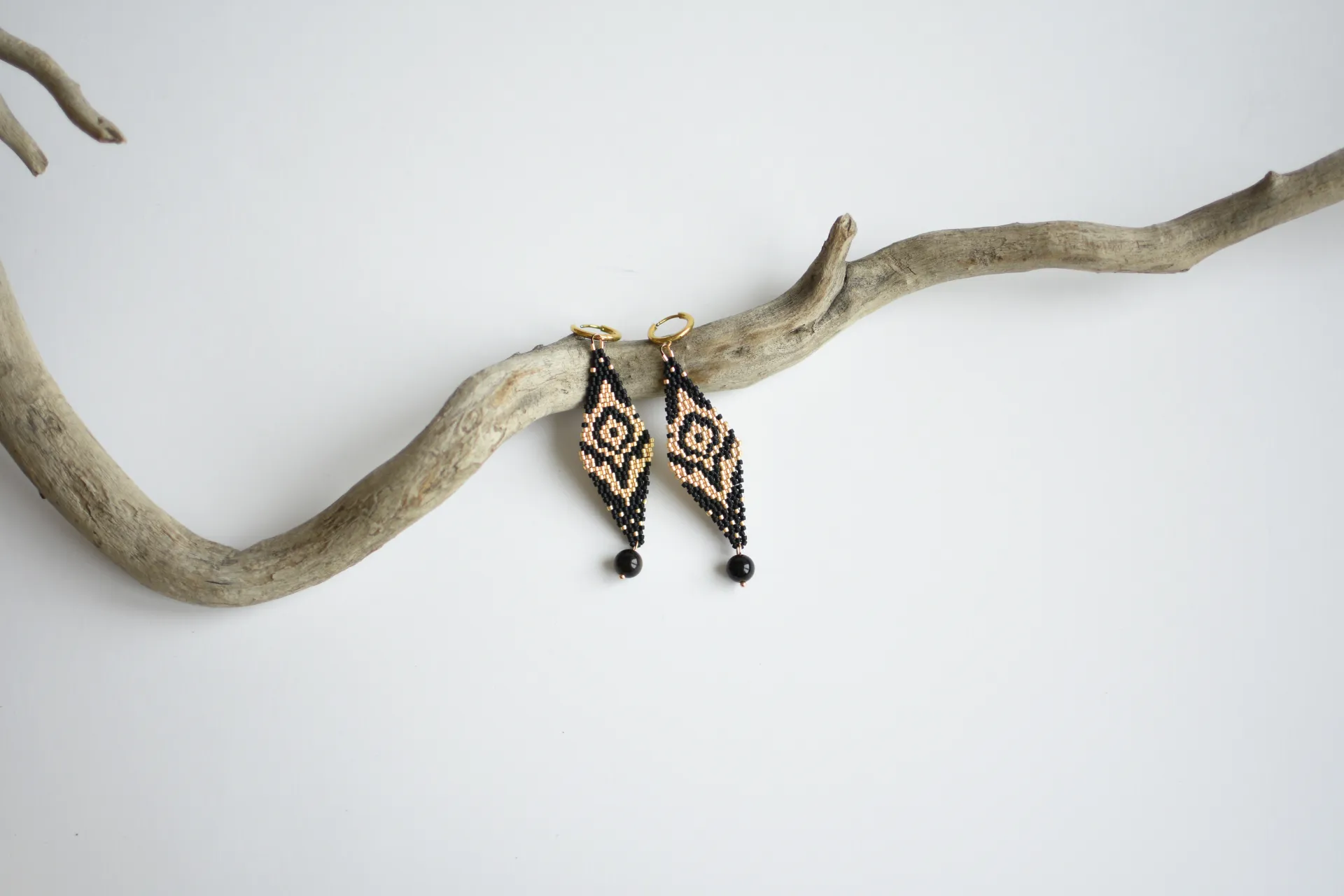 Элегантные длинные серьги с абстрактным рисунком цветка и бусиной обсидиана на швензах-колечках.