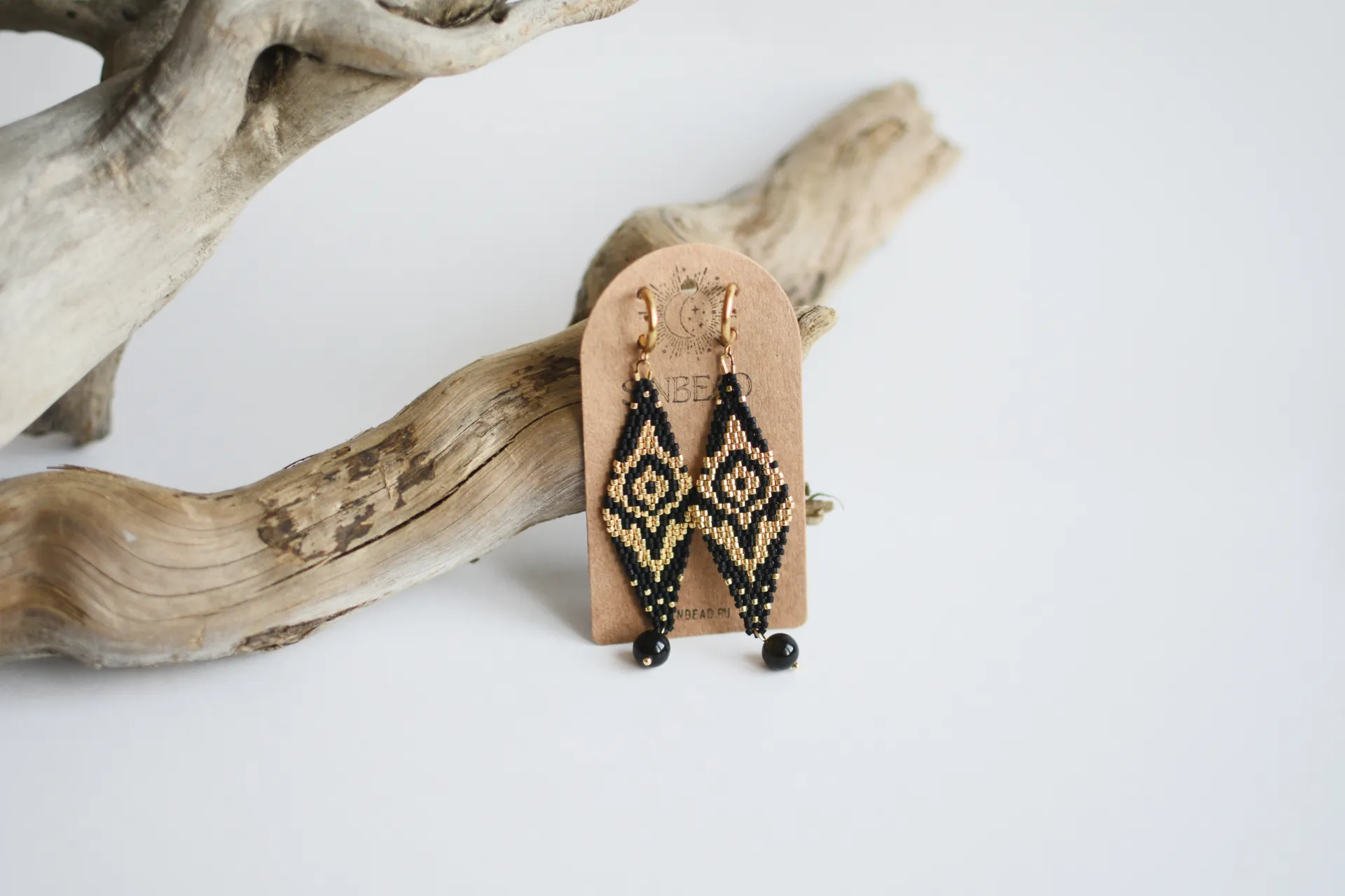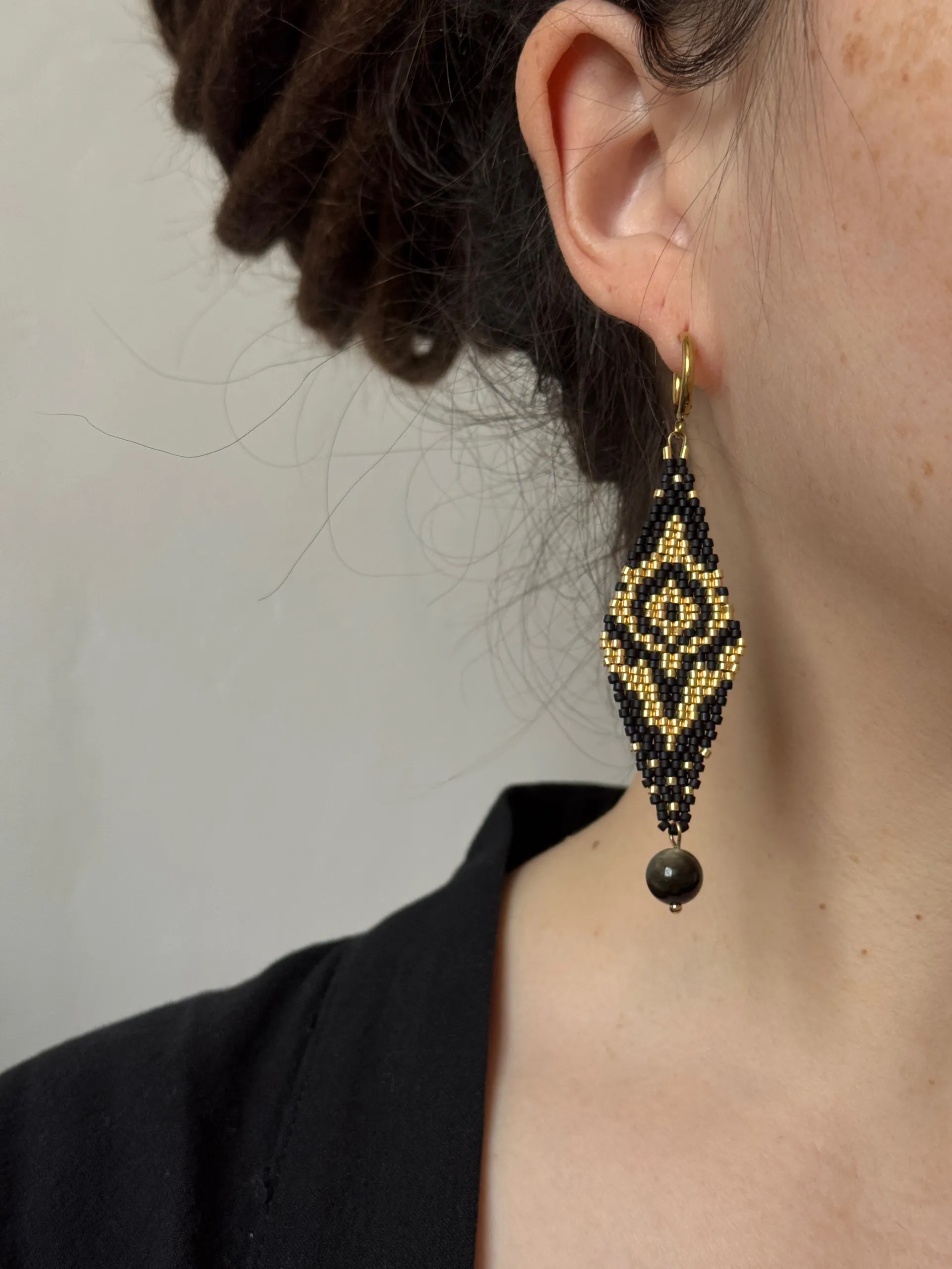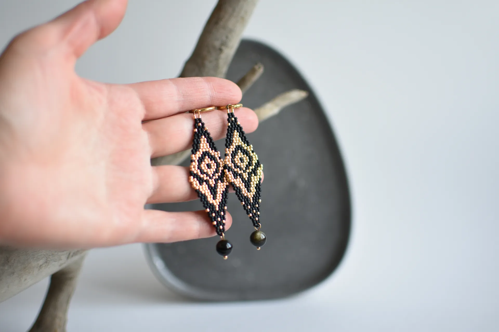 Элегантные длинные серьги с абстрактным рисунком цветка и бусиной обсидиана на швензах-колечках.