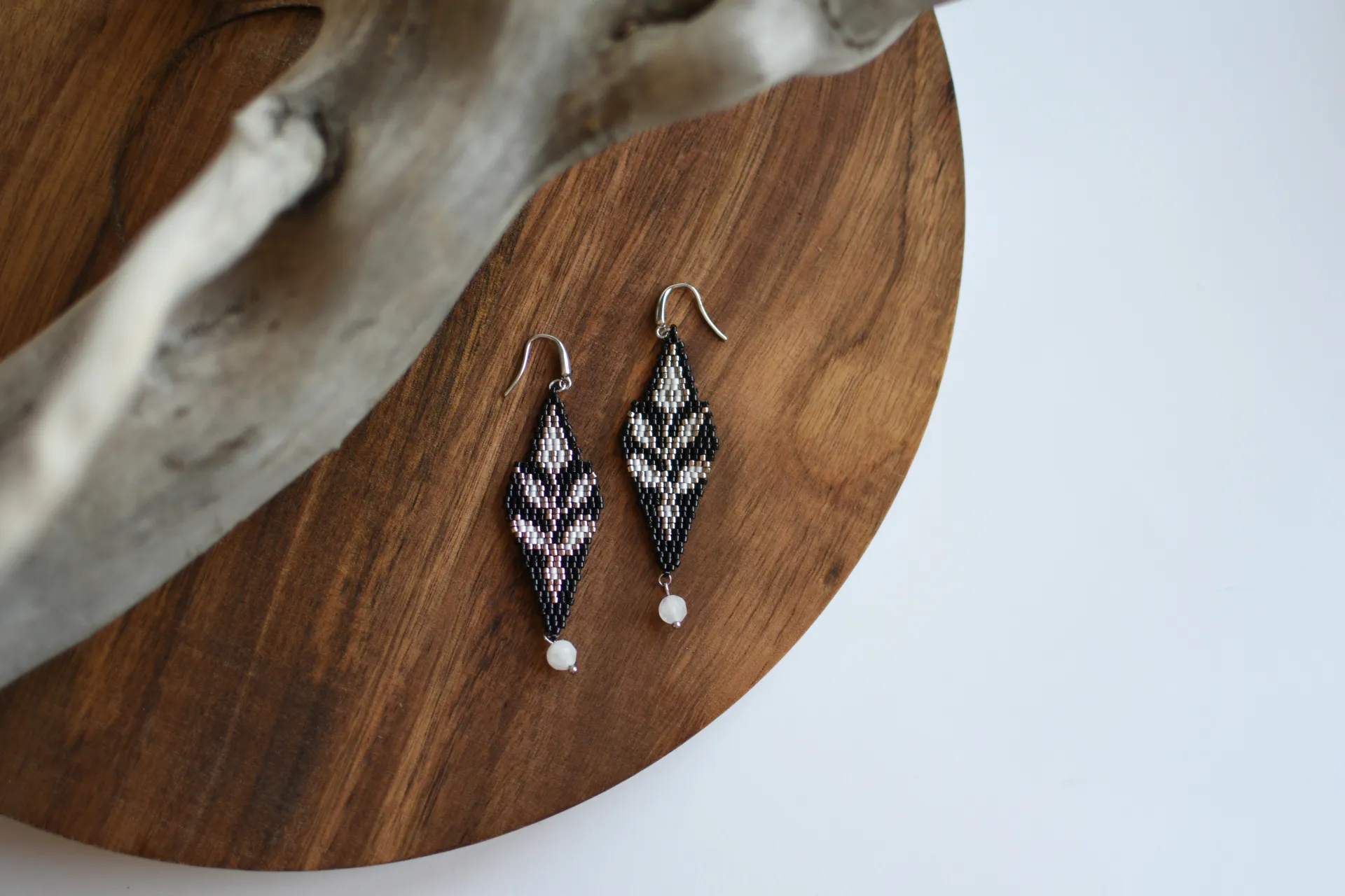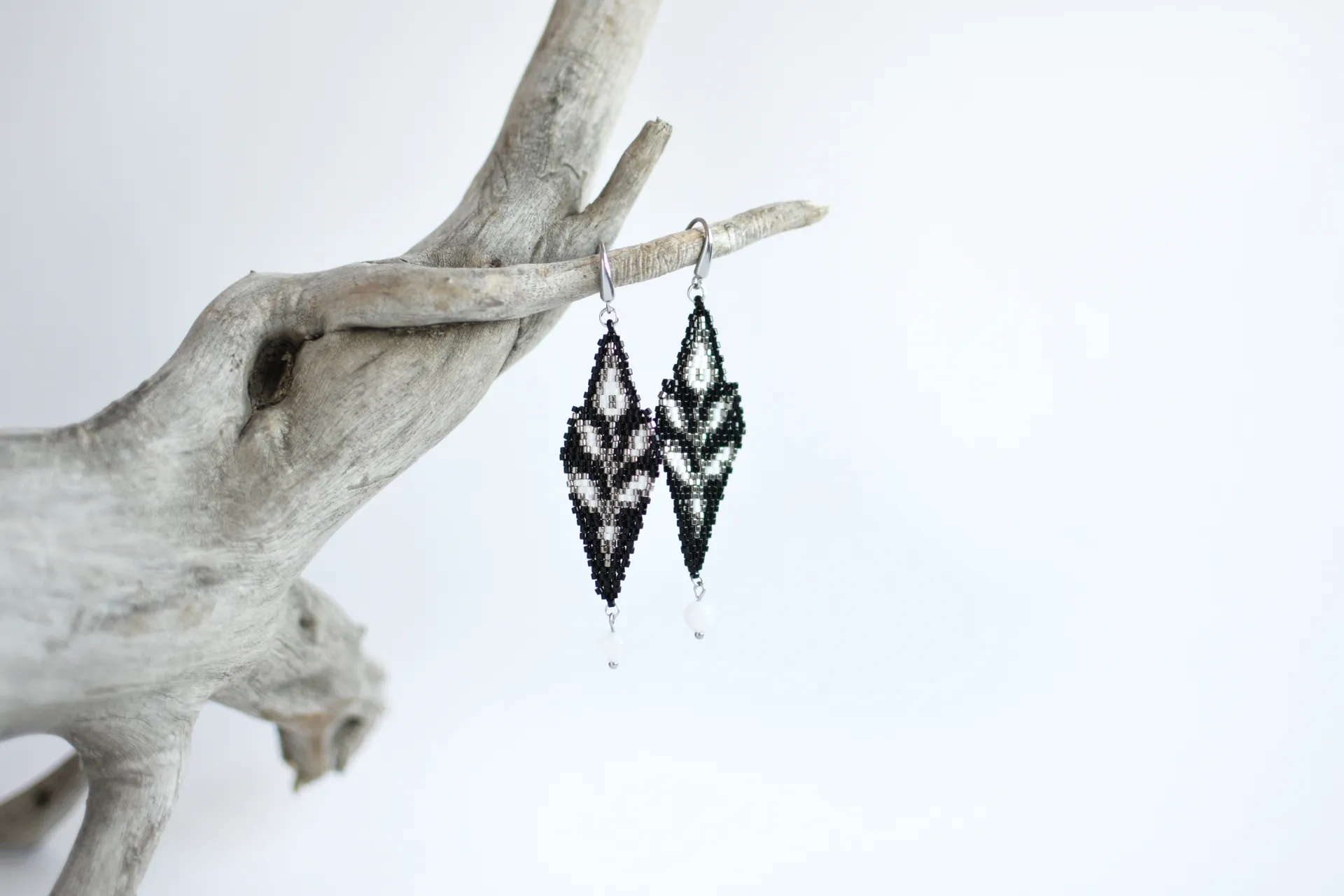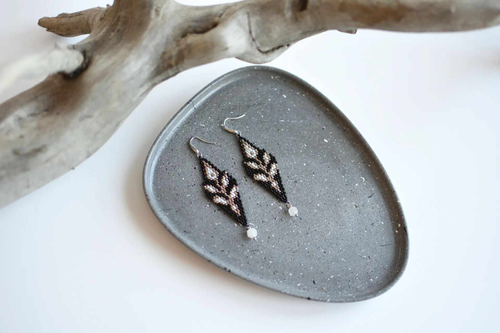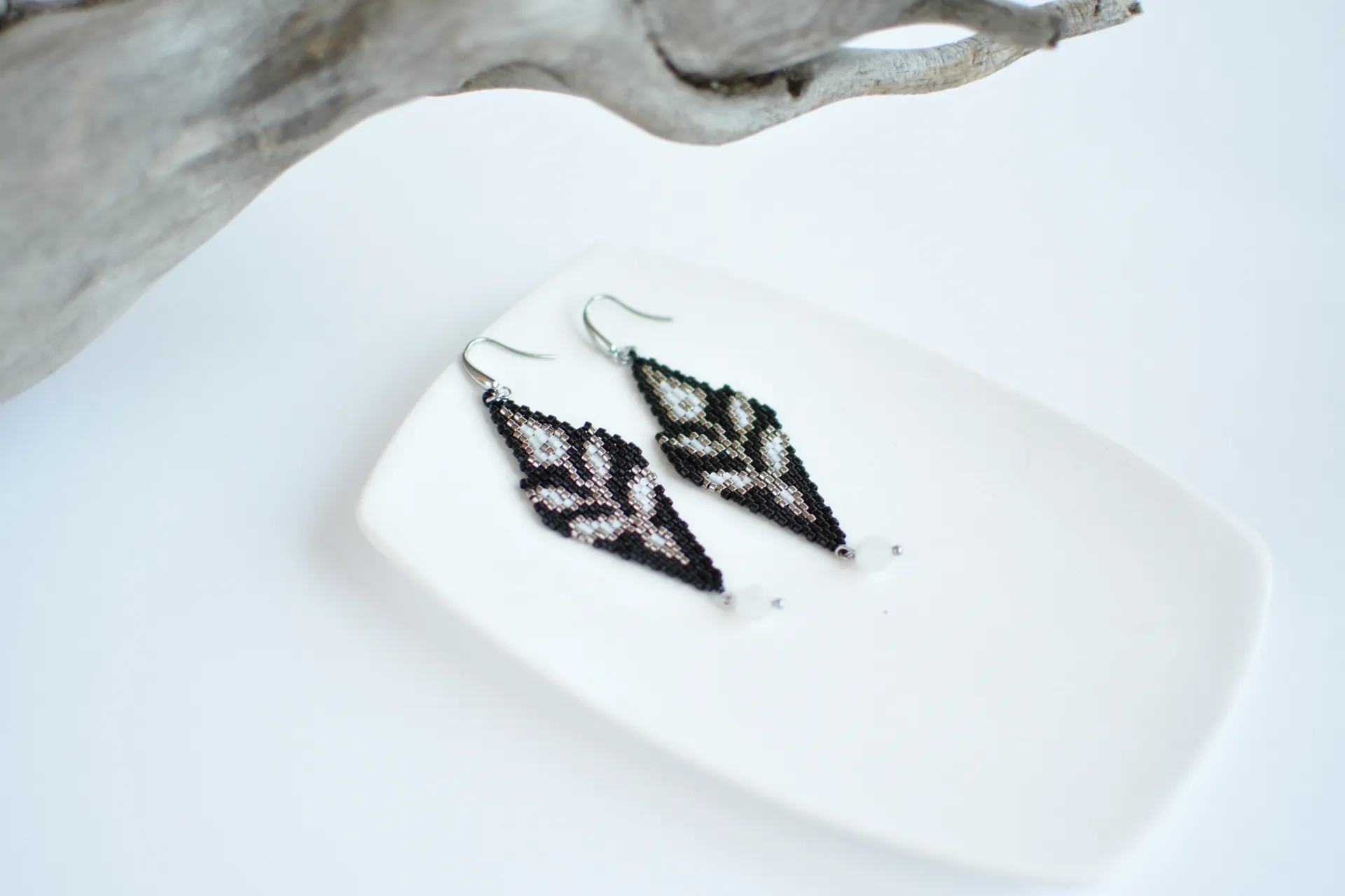 Серьги с серебристыми веточками и бусинками белого кварца.