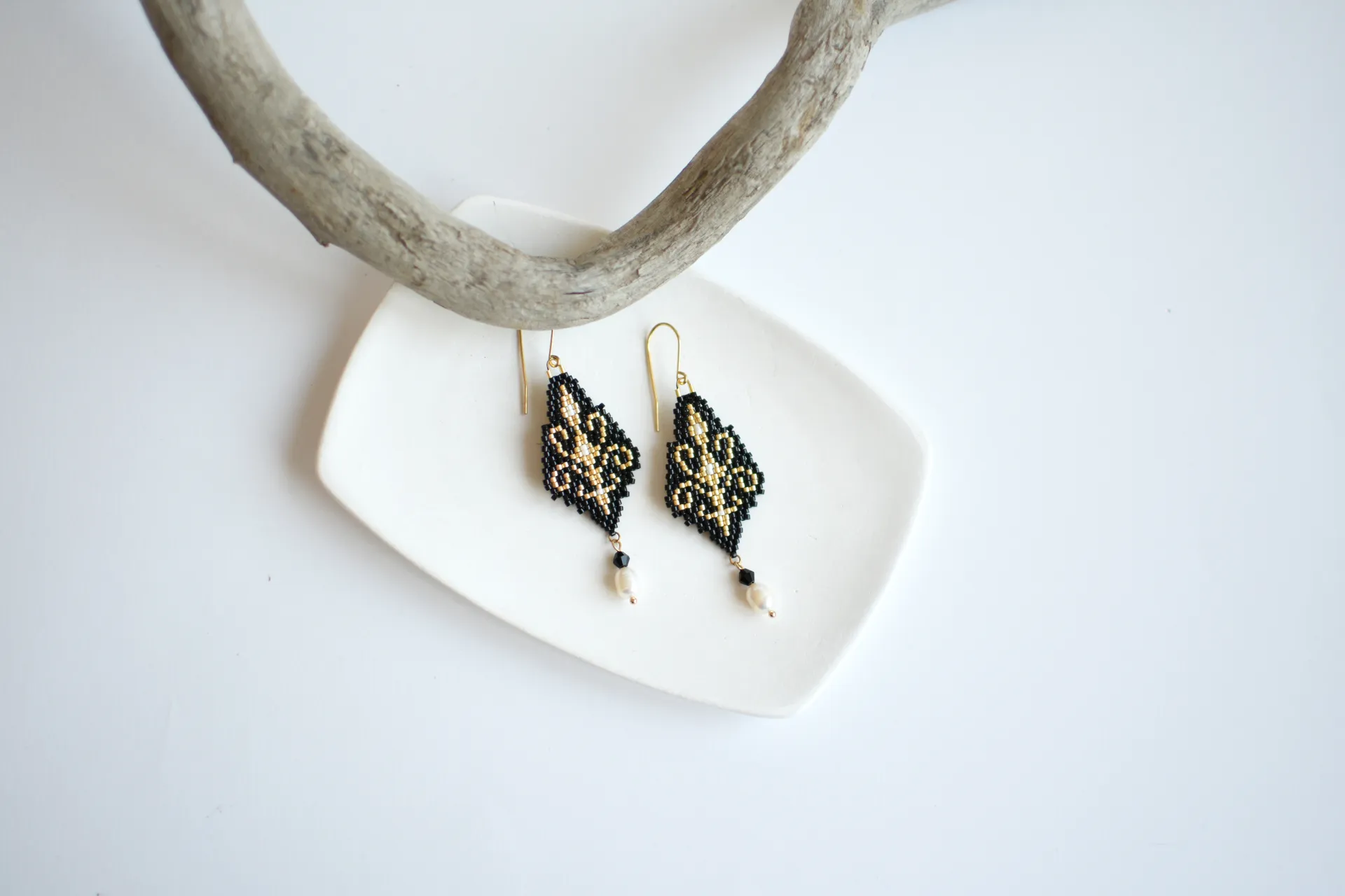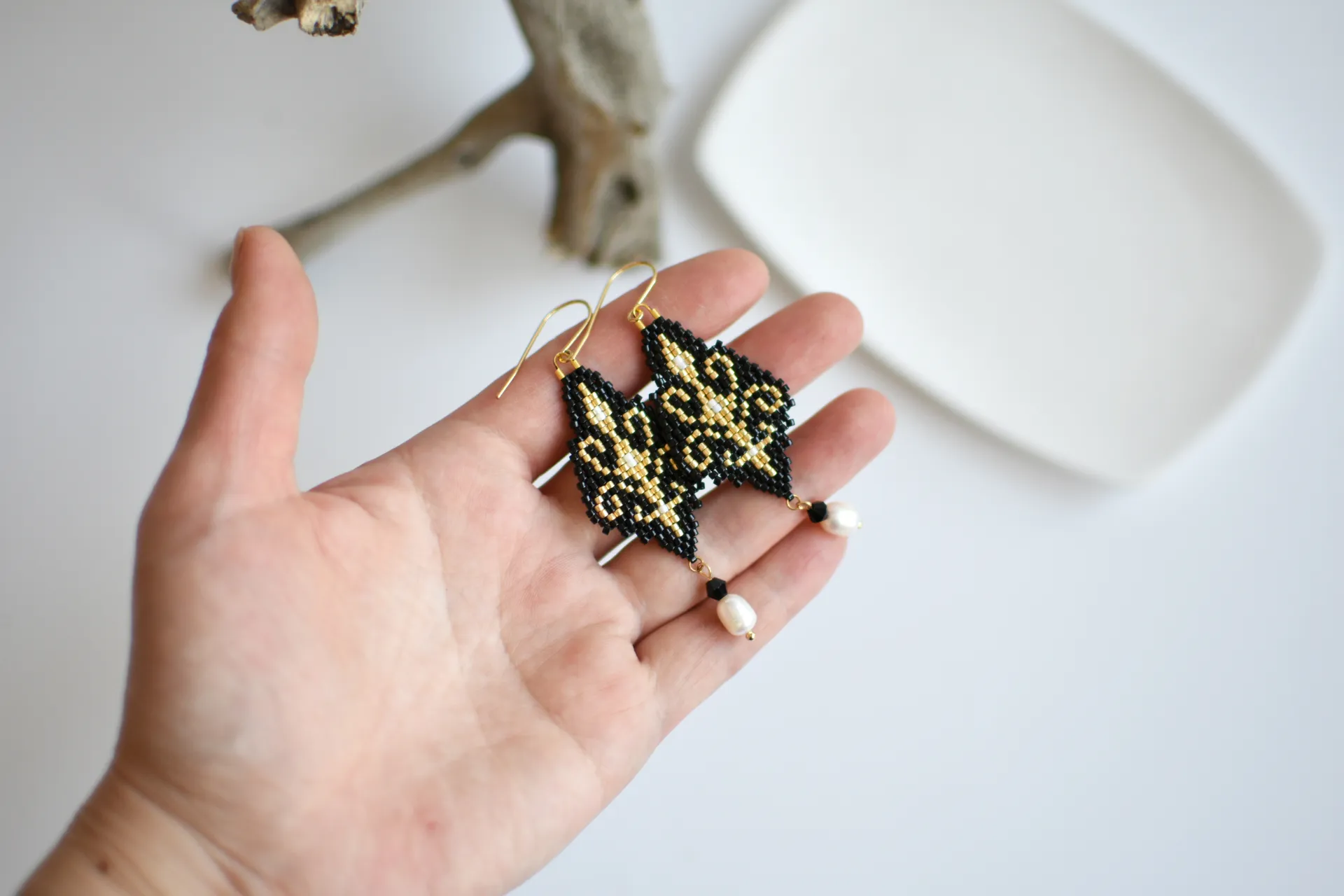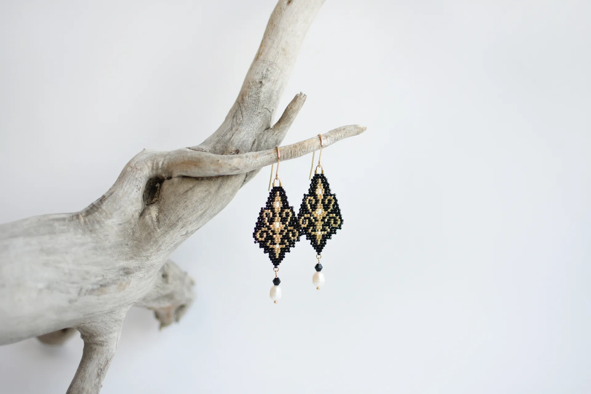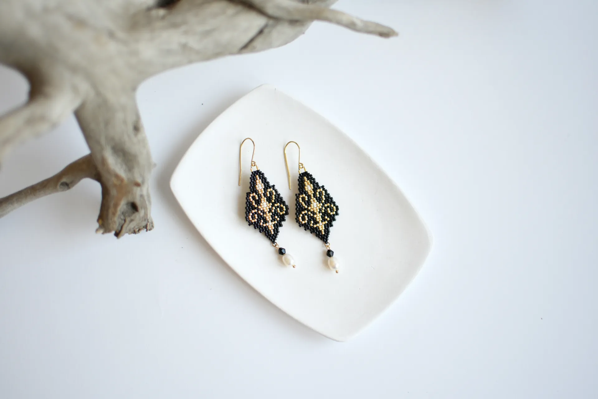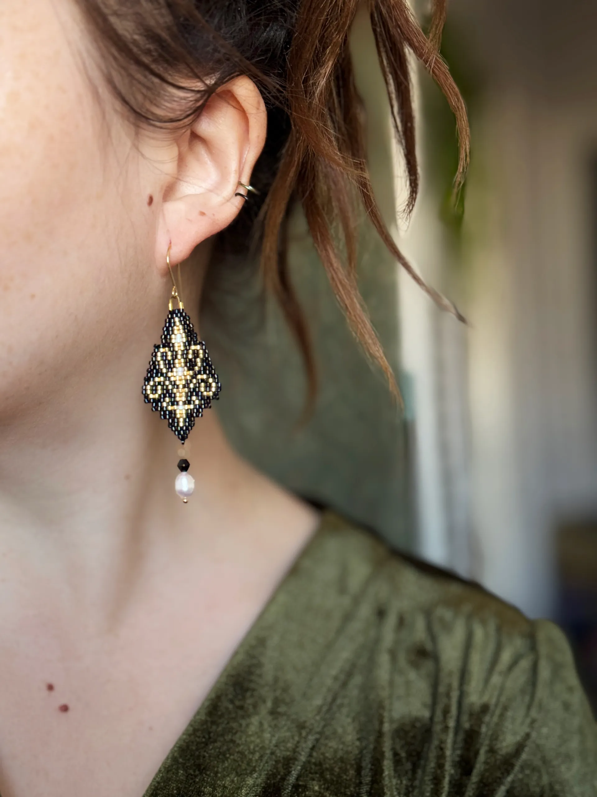 Утончённые серьги с восточным орнаментом из бисера малахитового цвета. Слетены по авторской схеме.