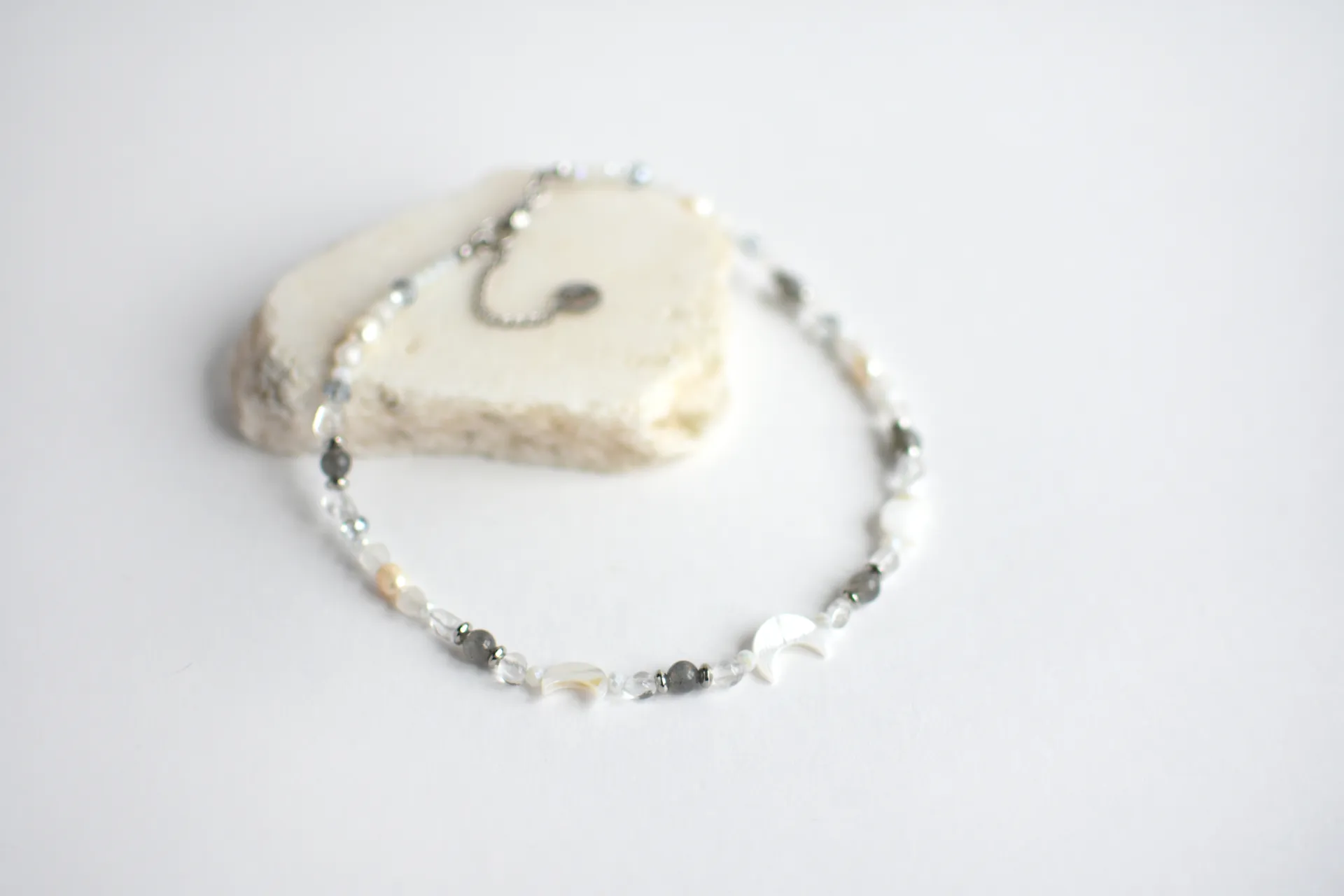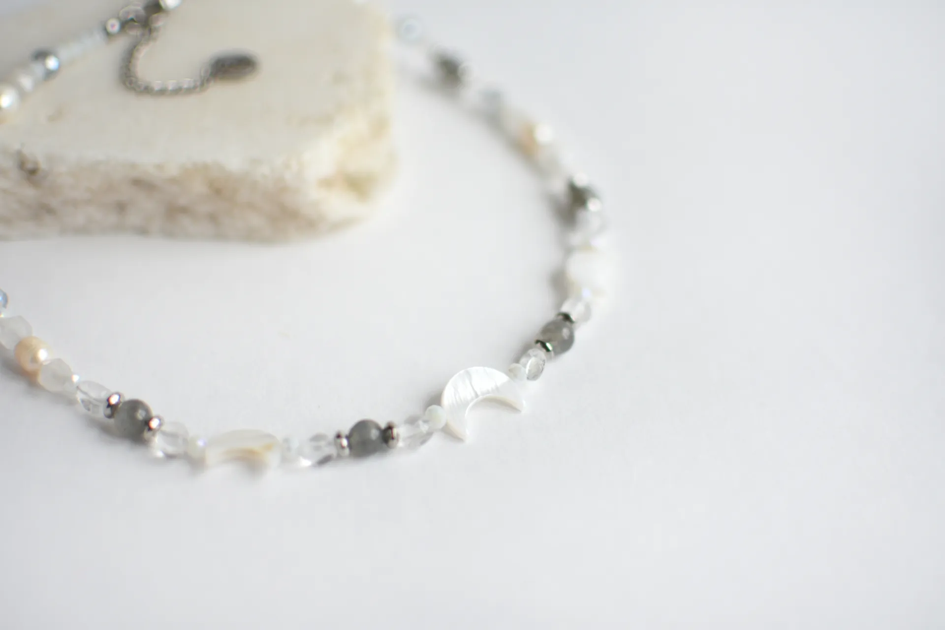 Короткие бусы с различными камнями и тремя перламутровыми месяцами.