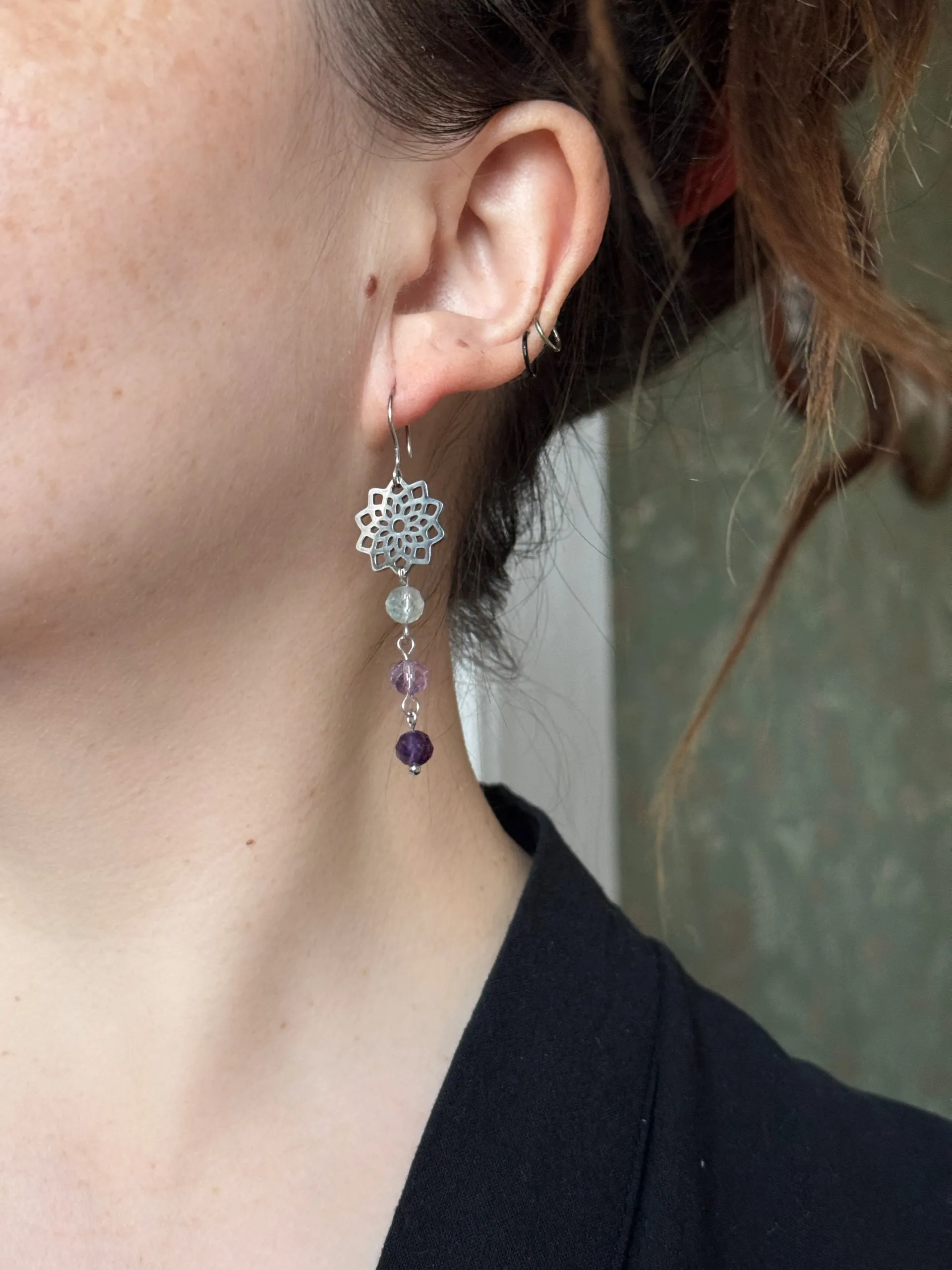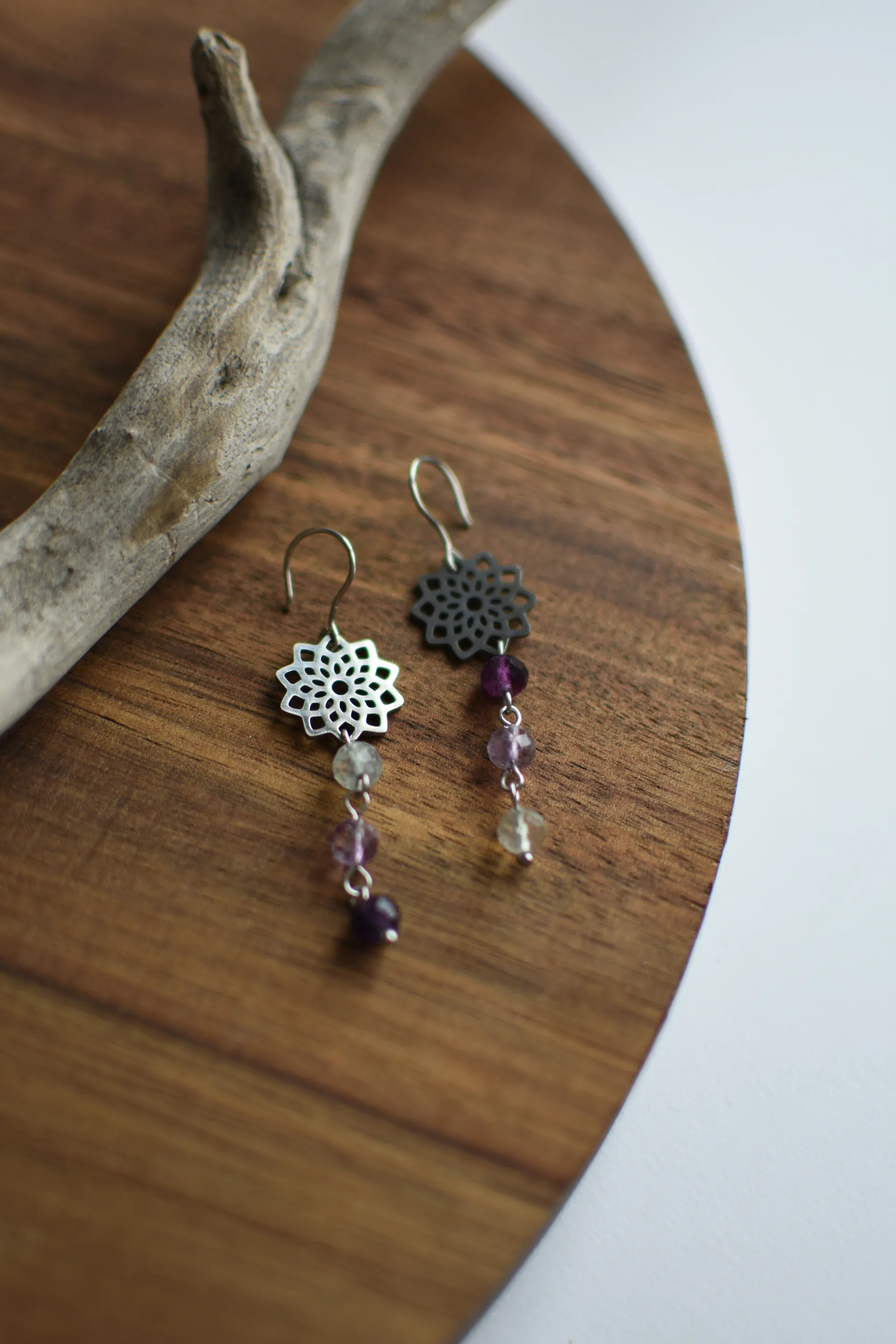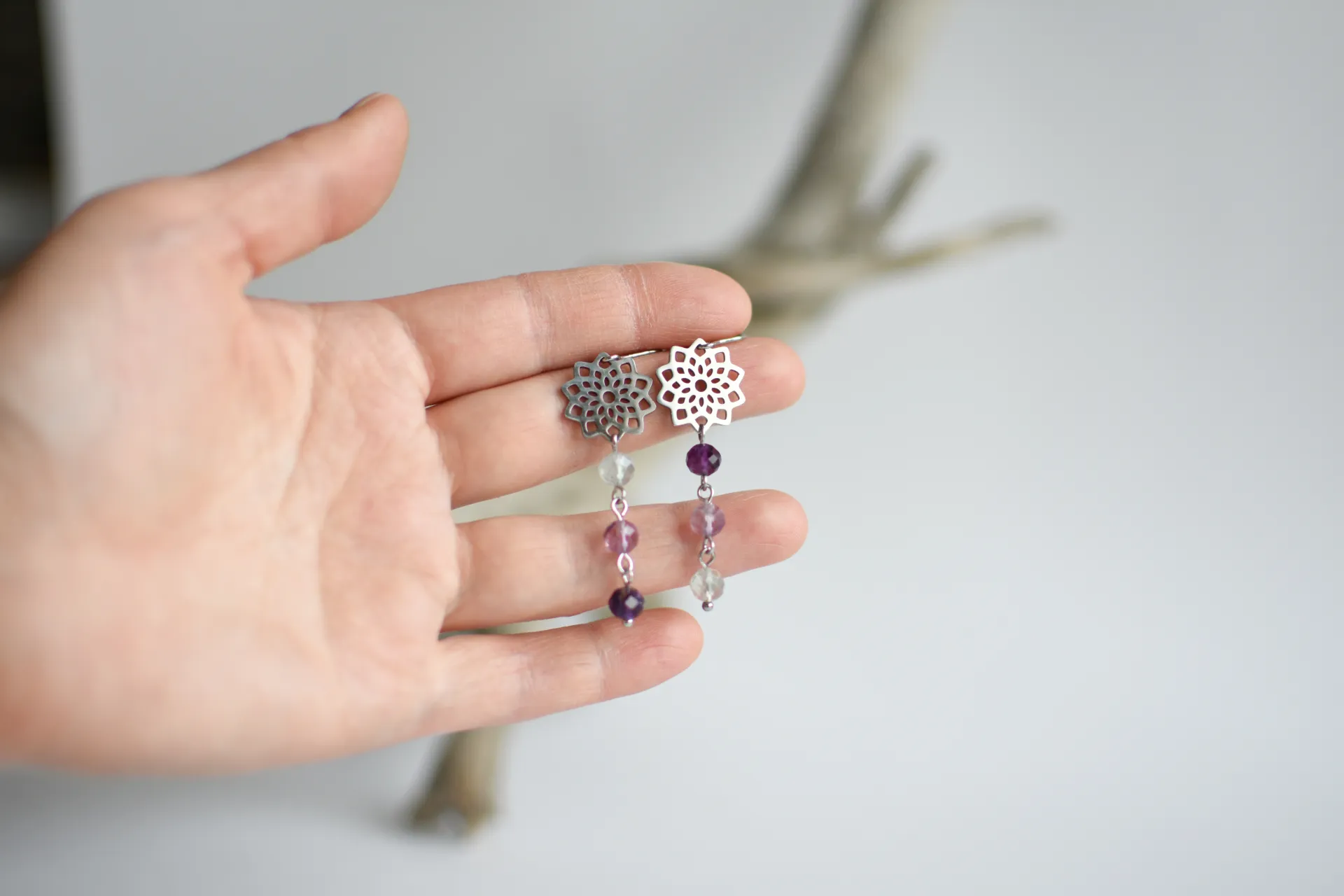 Асимметричные серьги с подвеской в форме цветка с натуральными разноцветными бусинами флюорита.