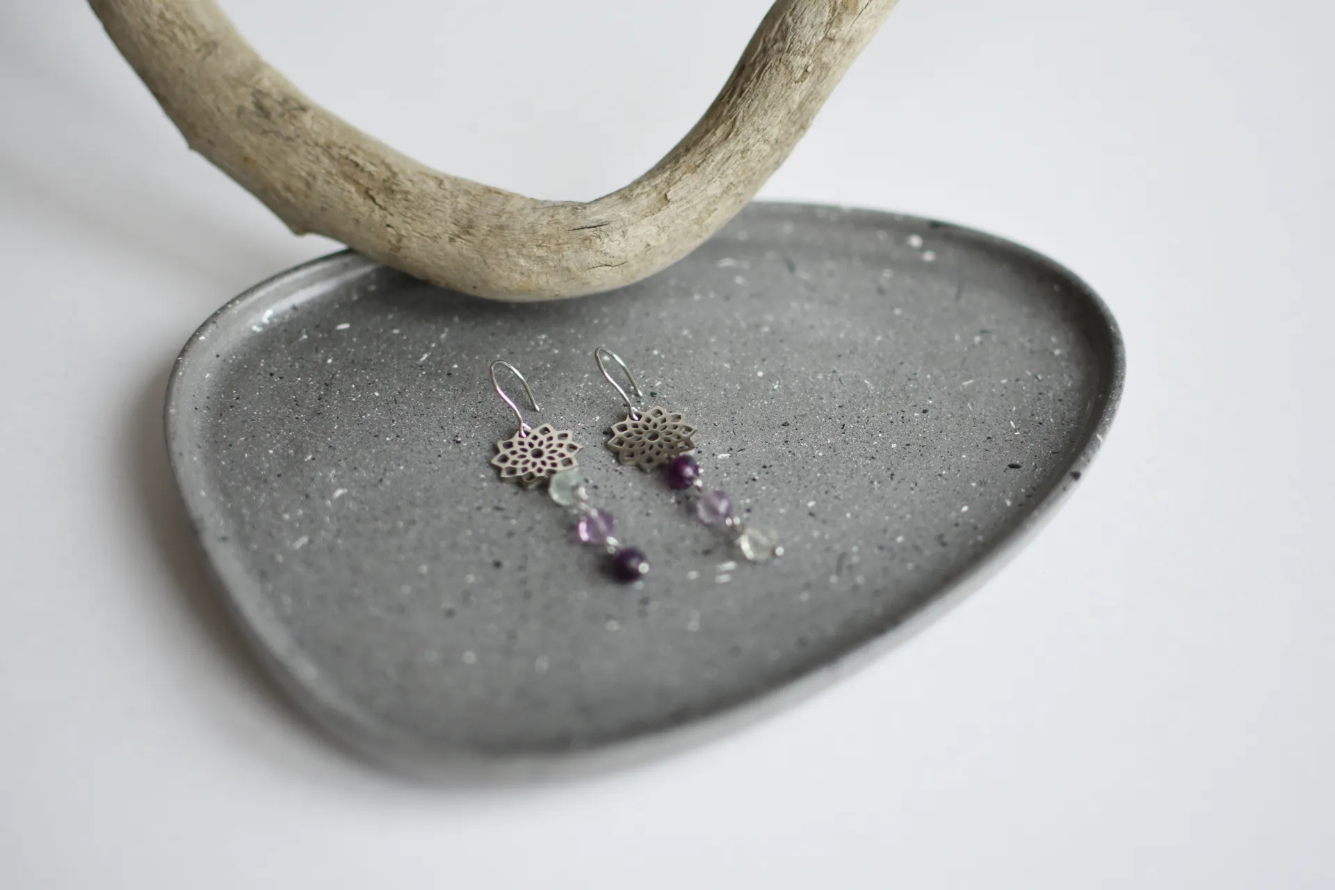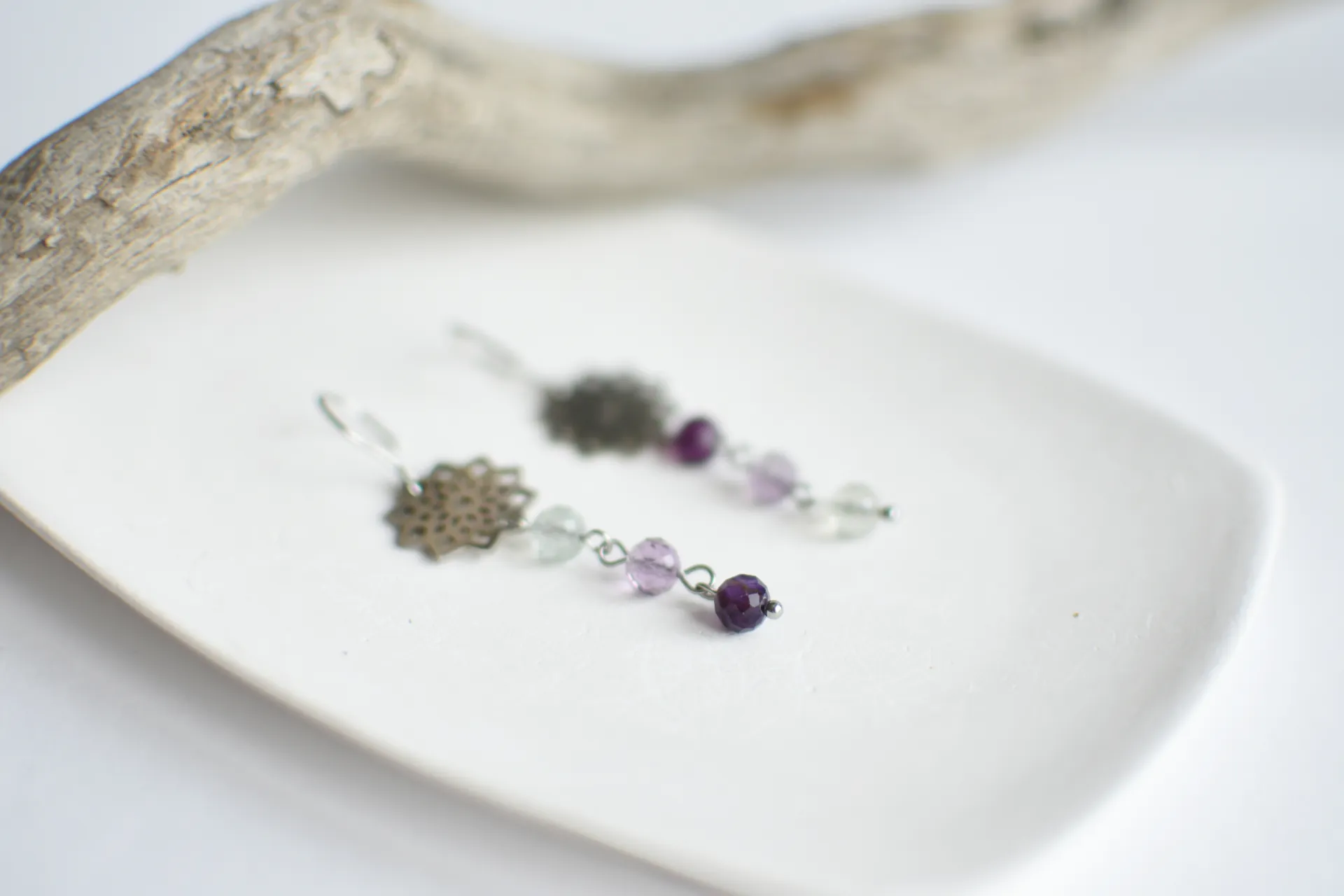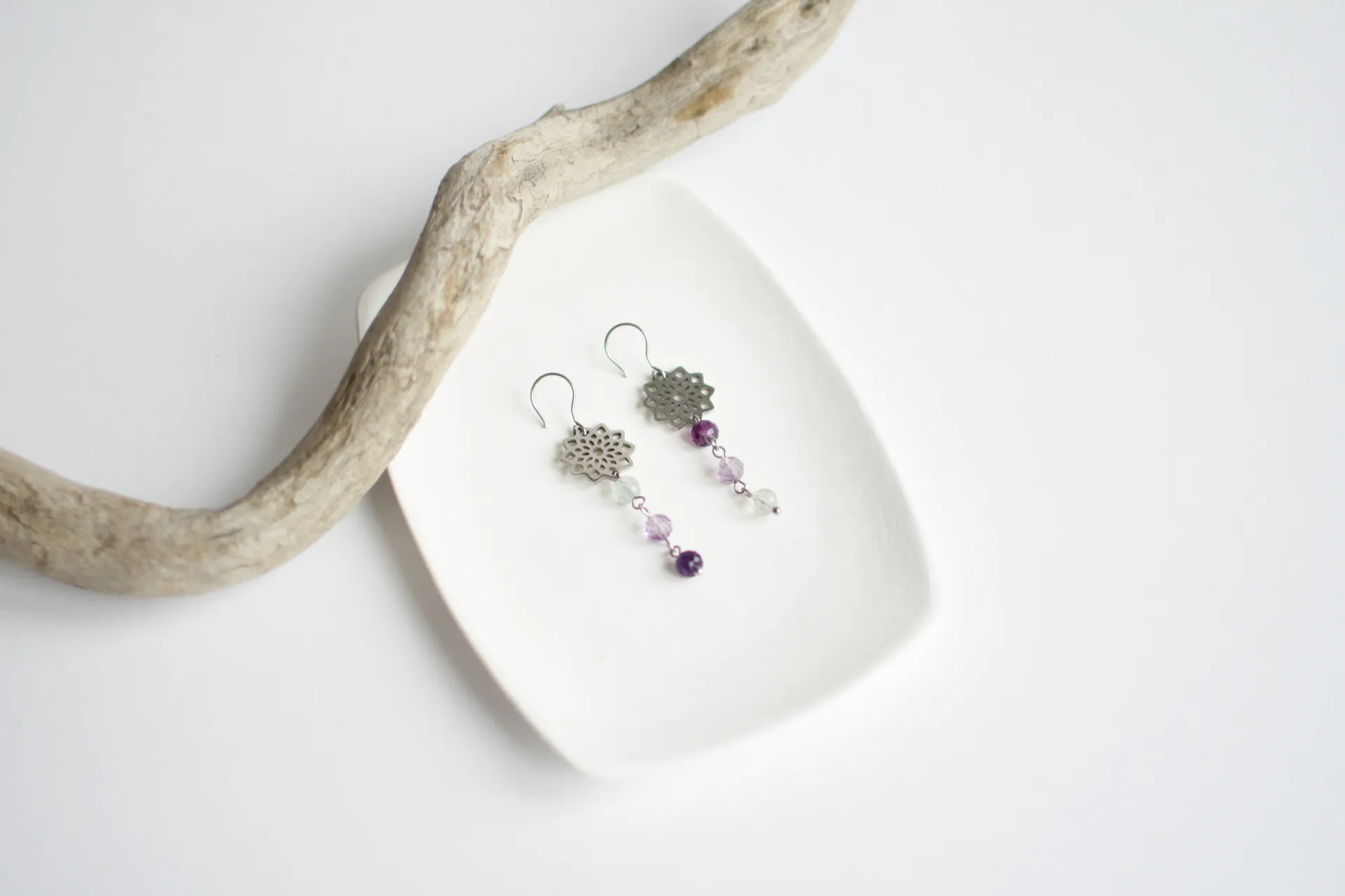 Асимметричные серьги с подвеской в форме цветка с натуральными разноцветными бусинами флюорита.