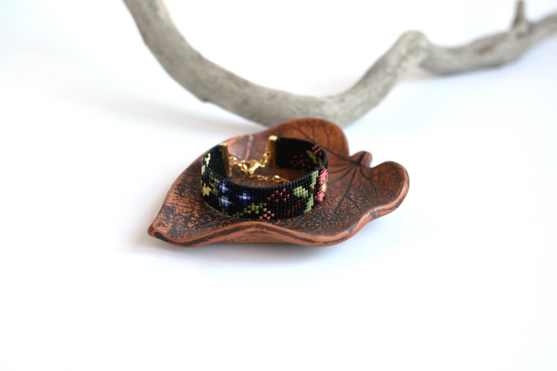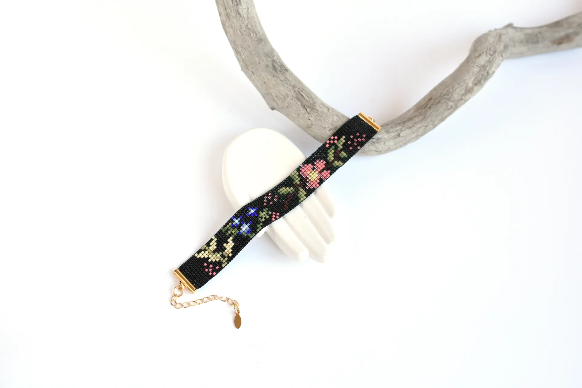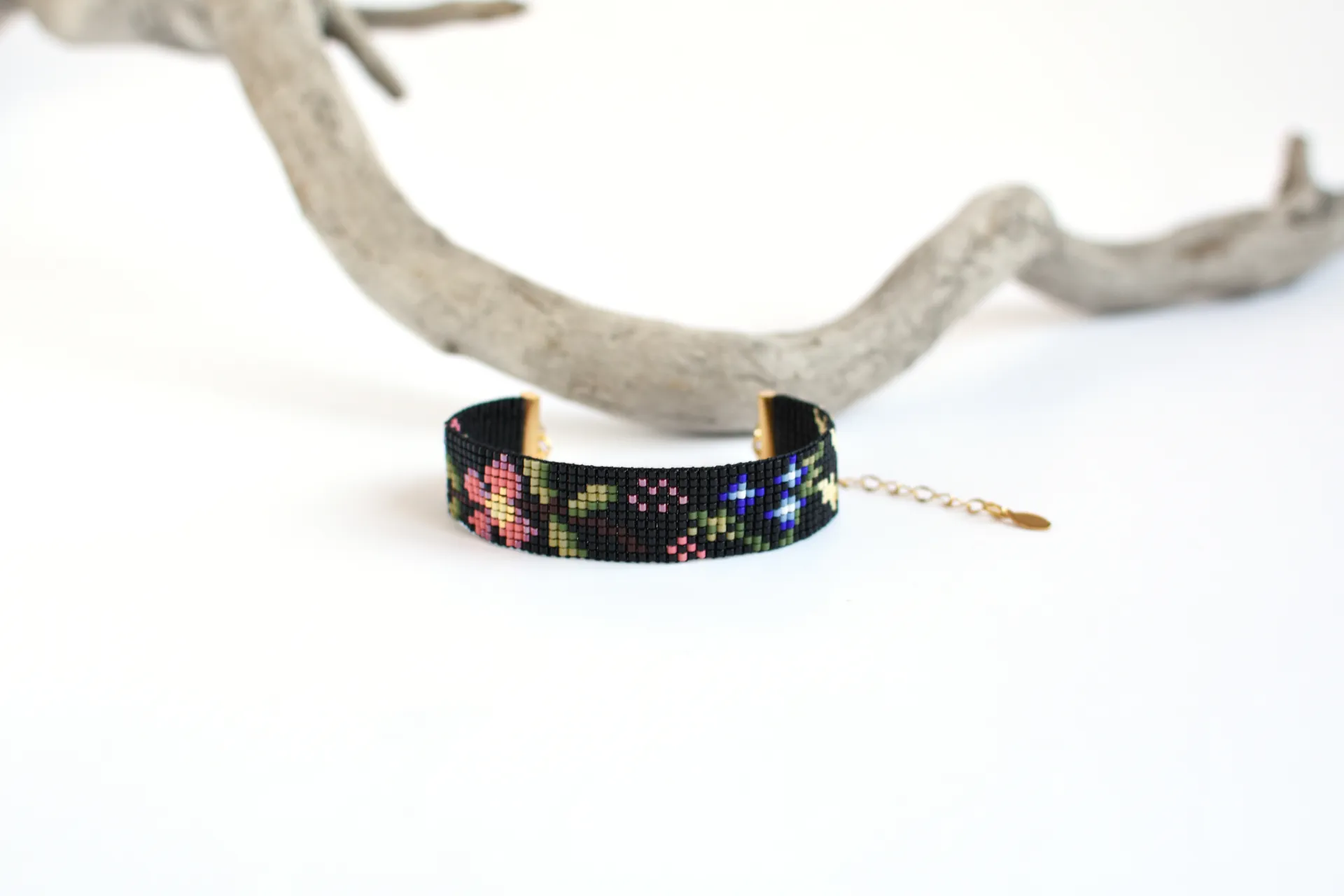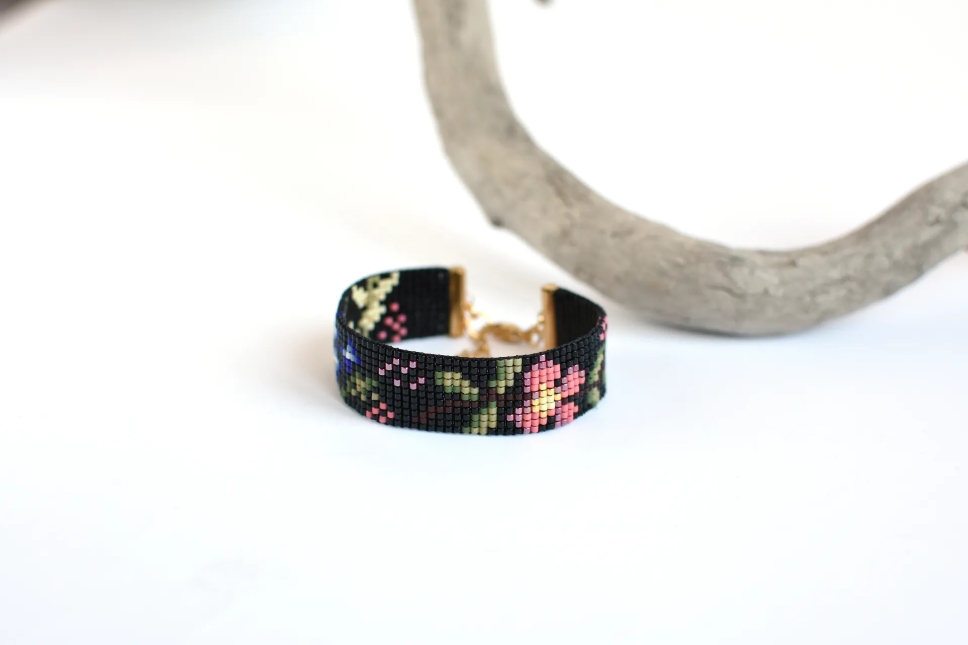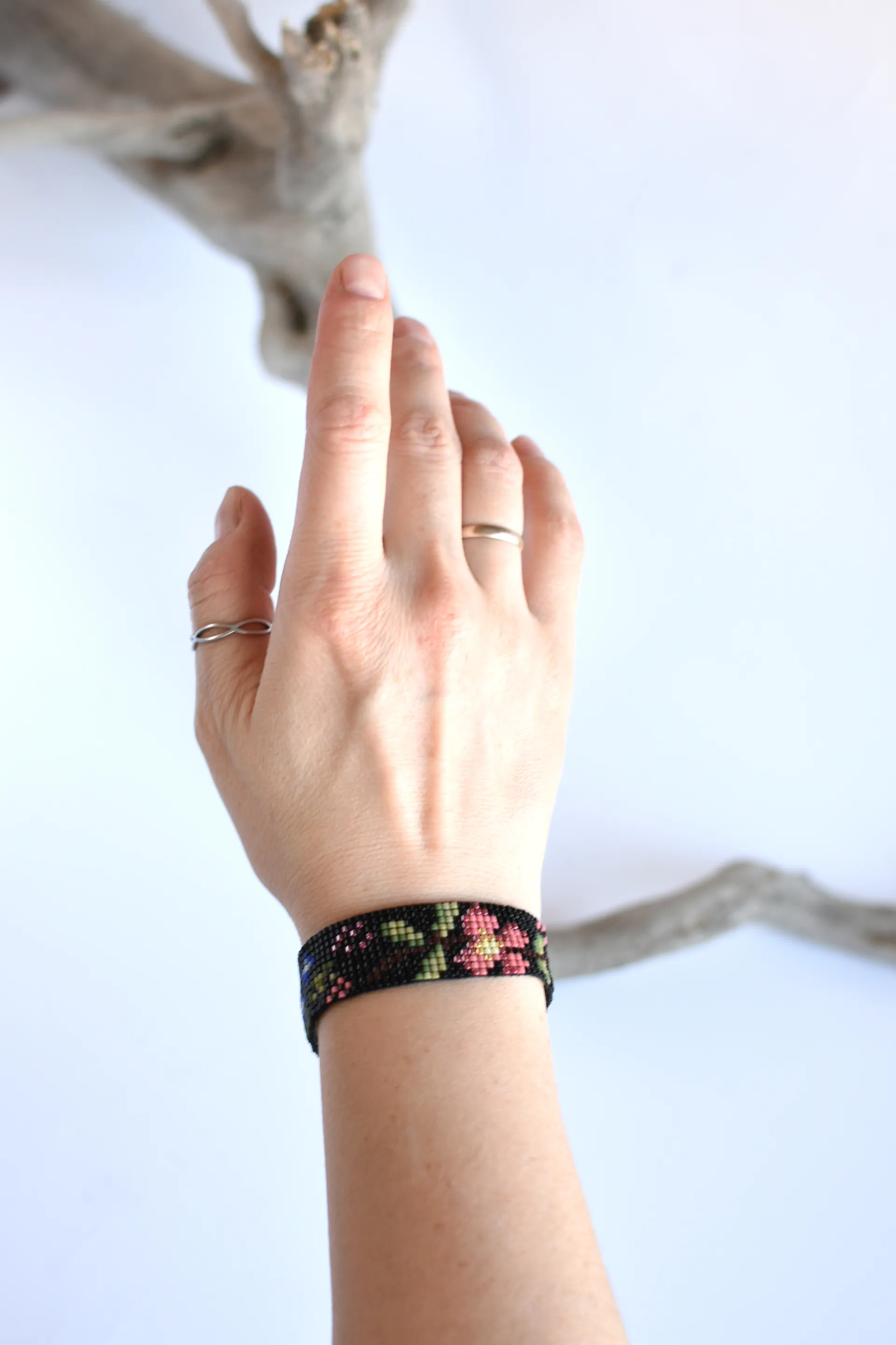 Браслет из качественного японского бисера с цветочным узором на чёрном фоне, словно тихий сад в сумерках - изящный и живой.