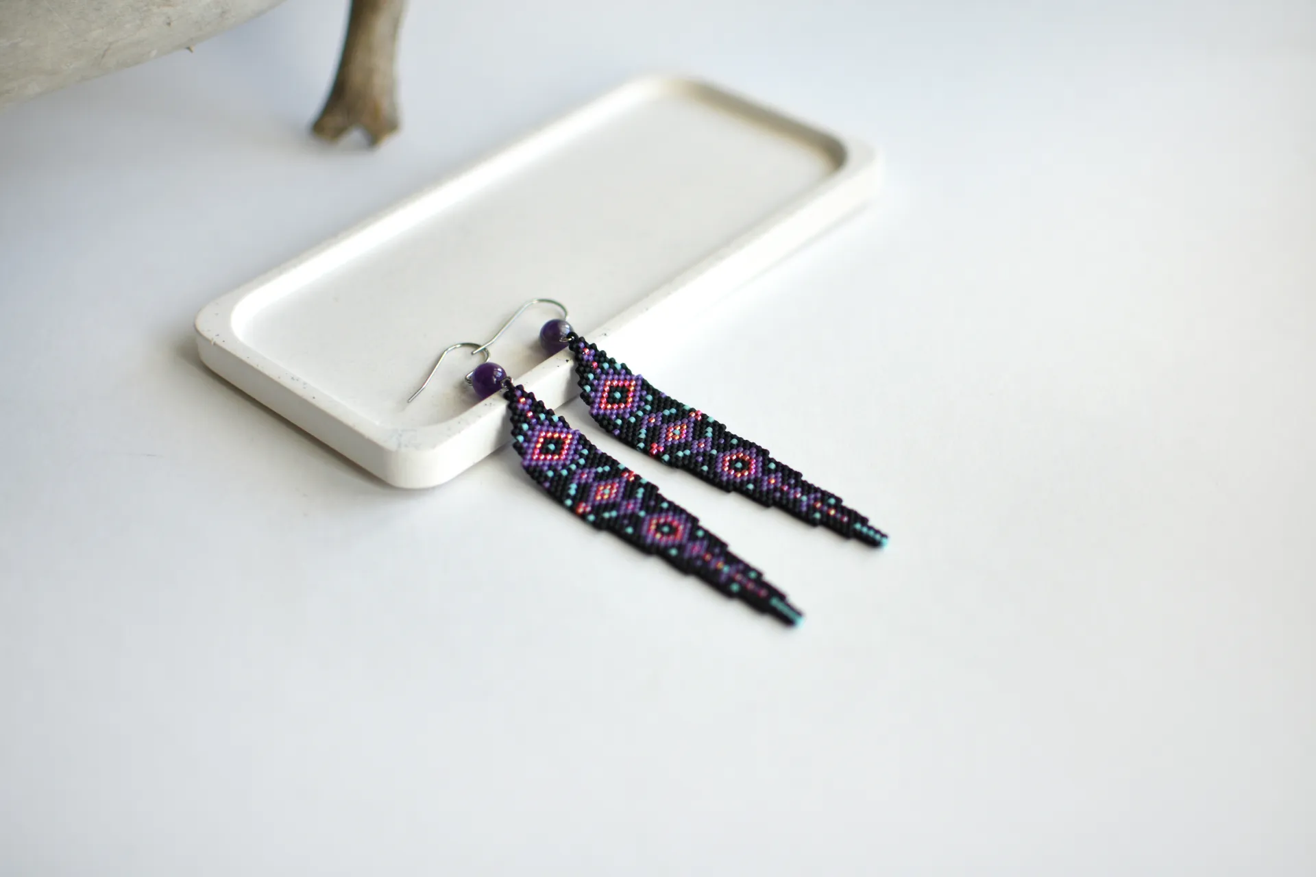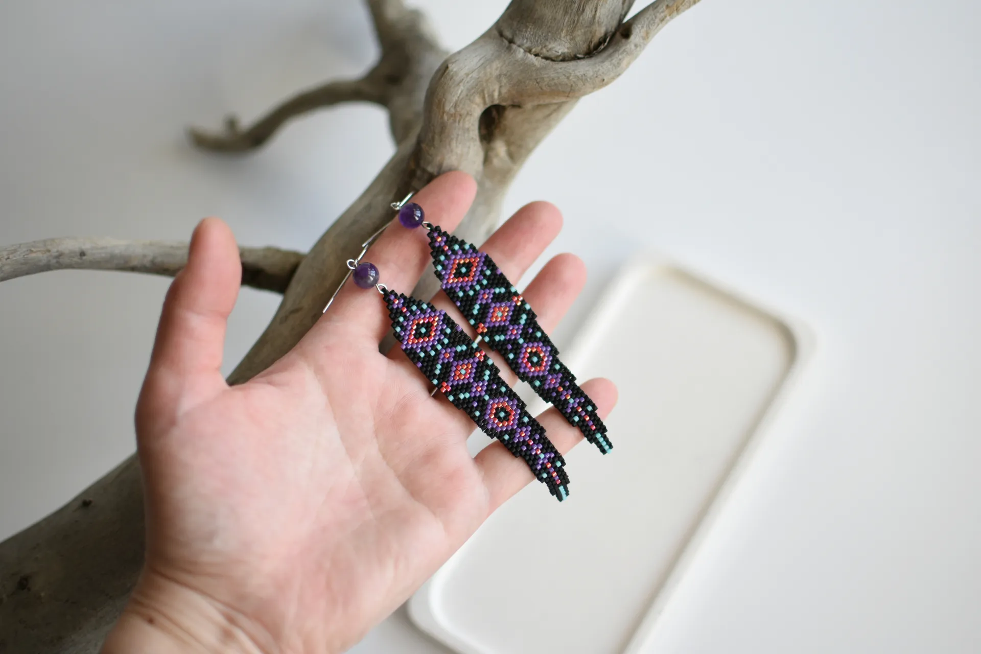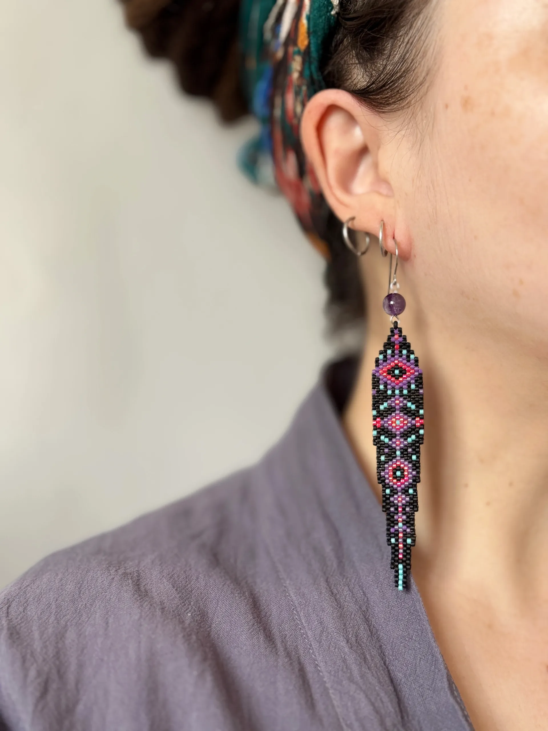 Эффектные и практически невесомые бохо-серьги по авторской схеме с бусинами аметиста.