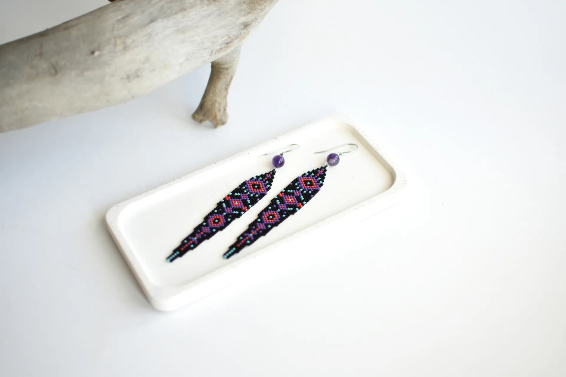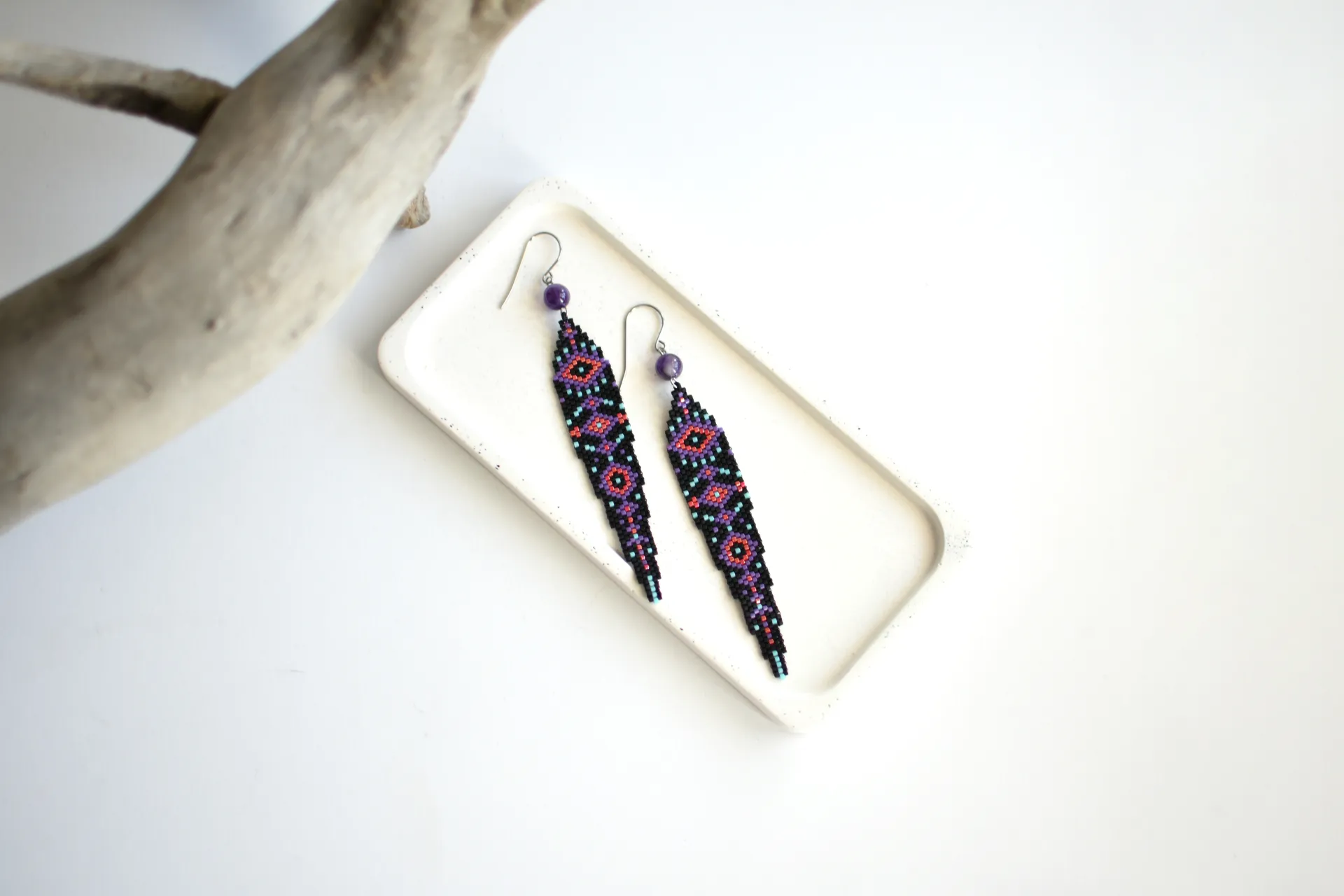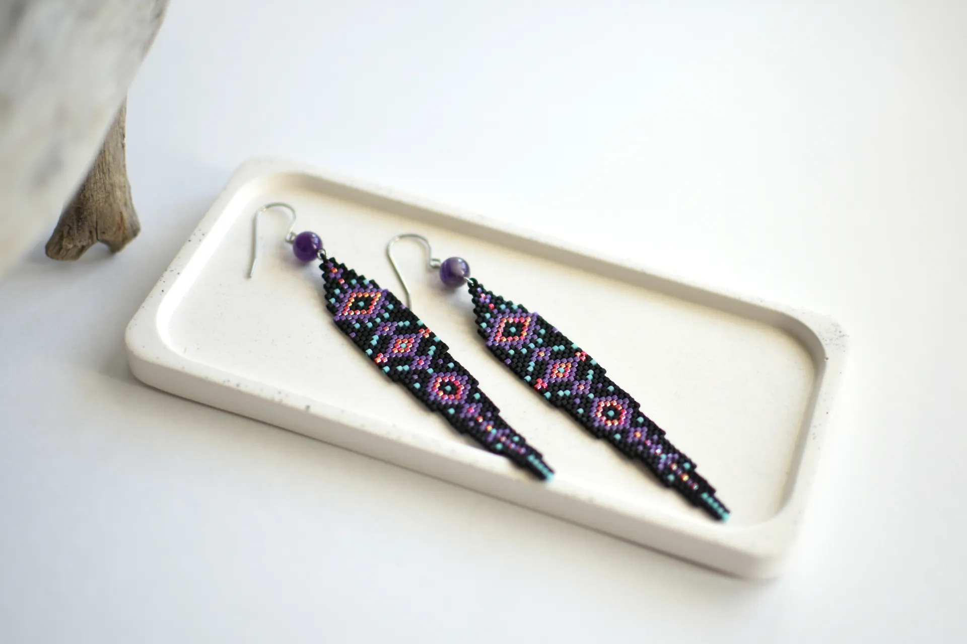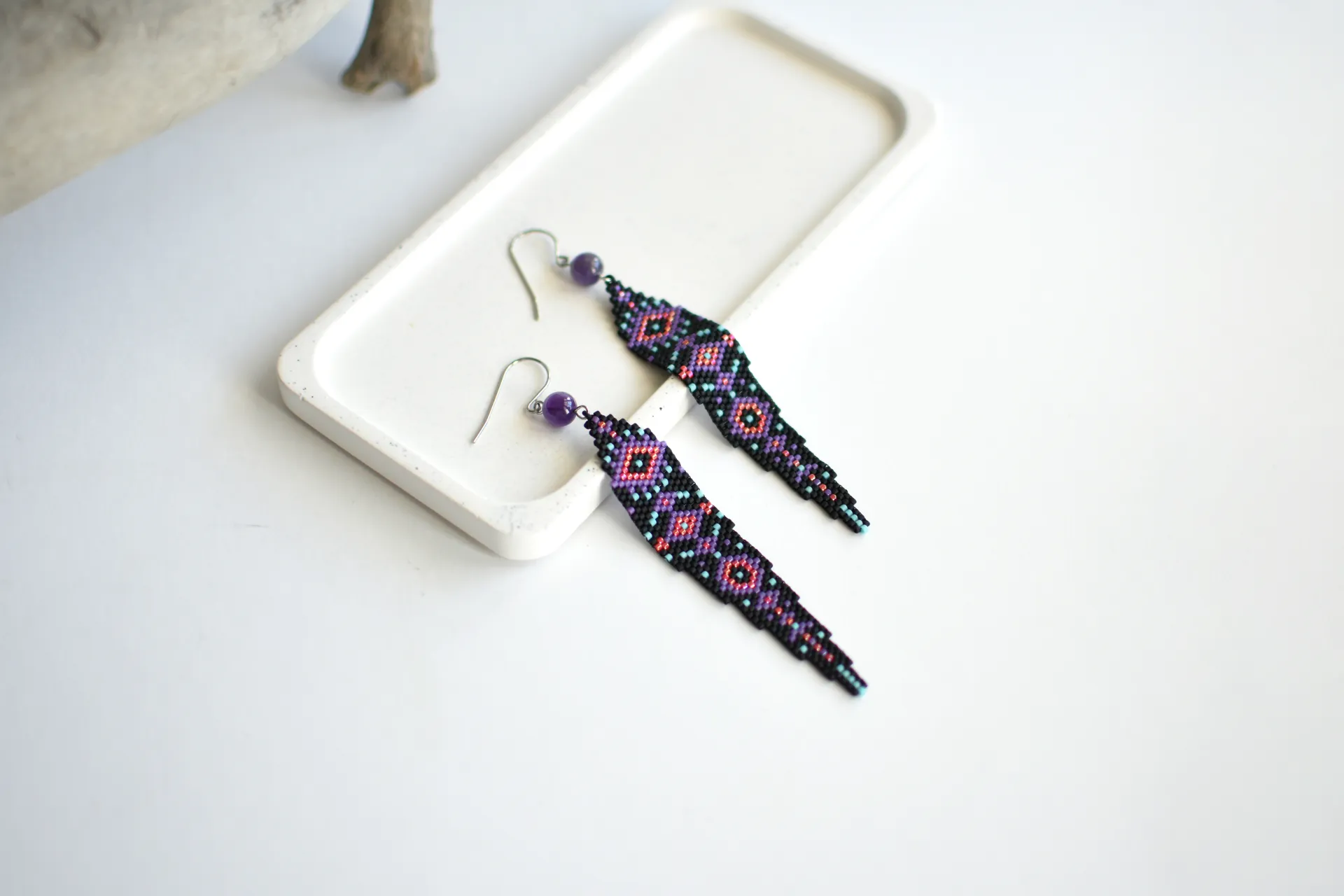 Эффектные и практически невесомые бохо-серьги по авторской схеме с бусинами аметиста.