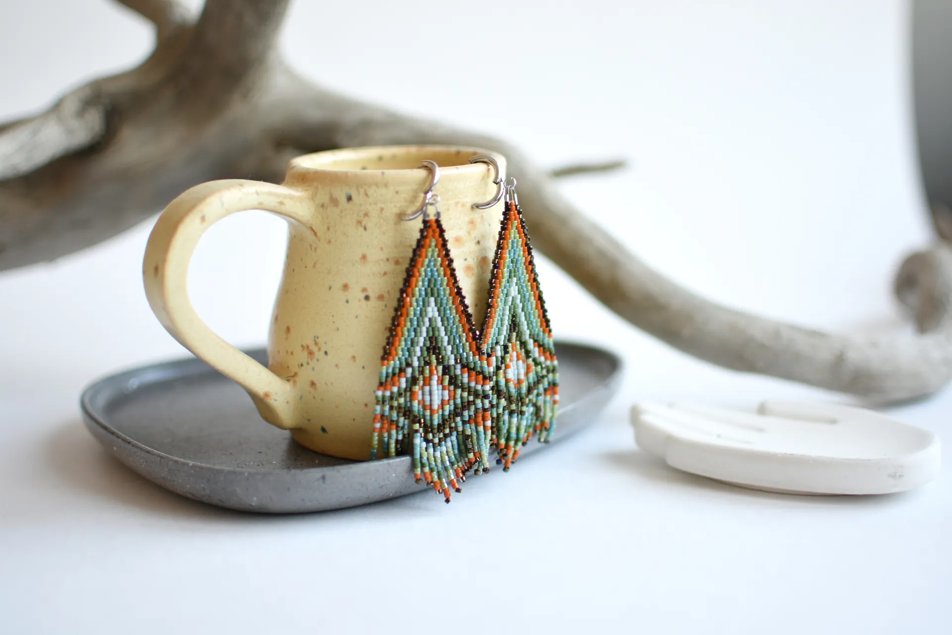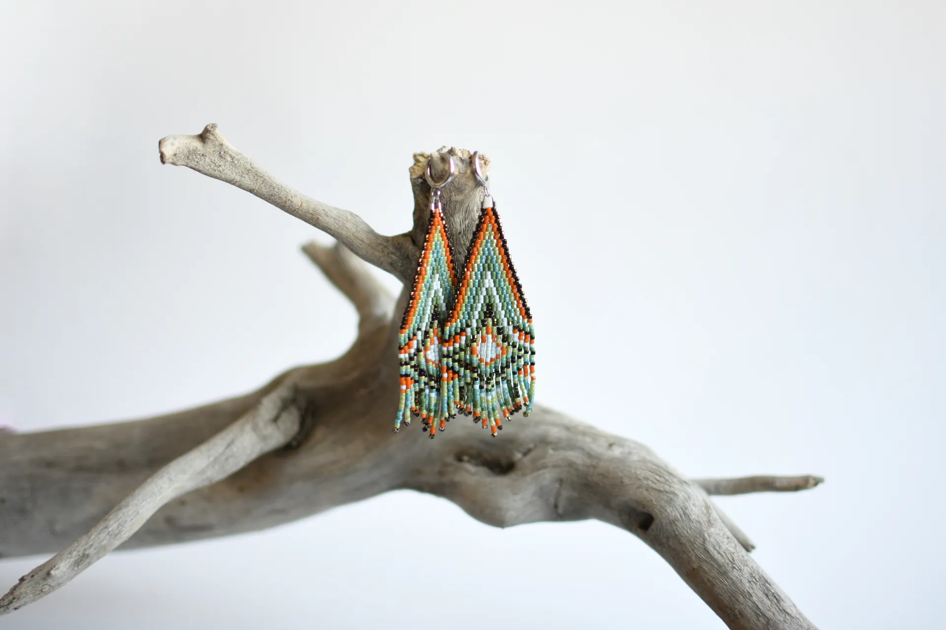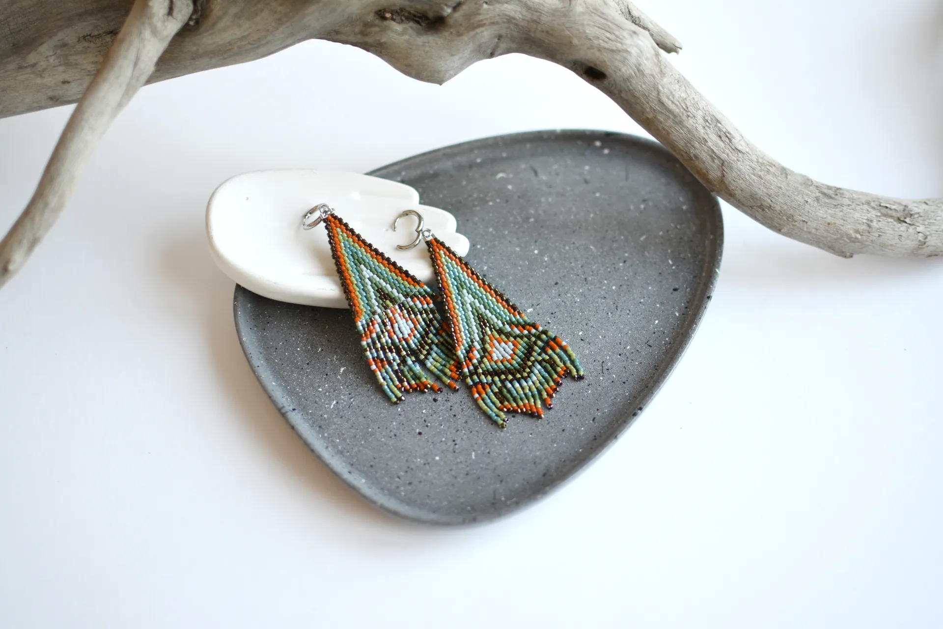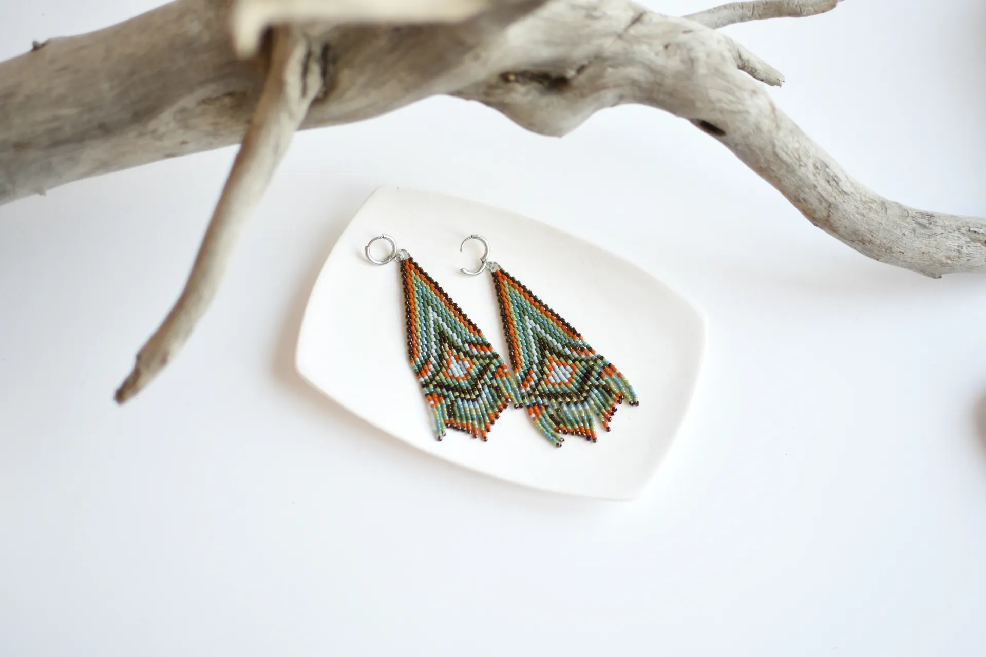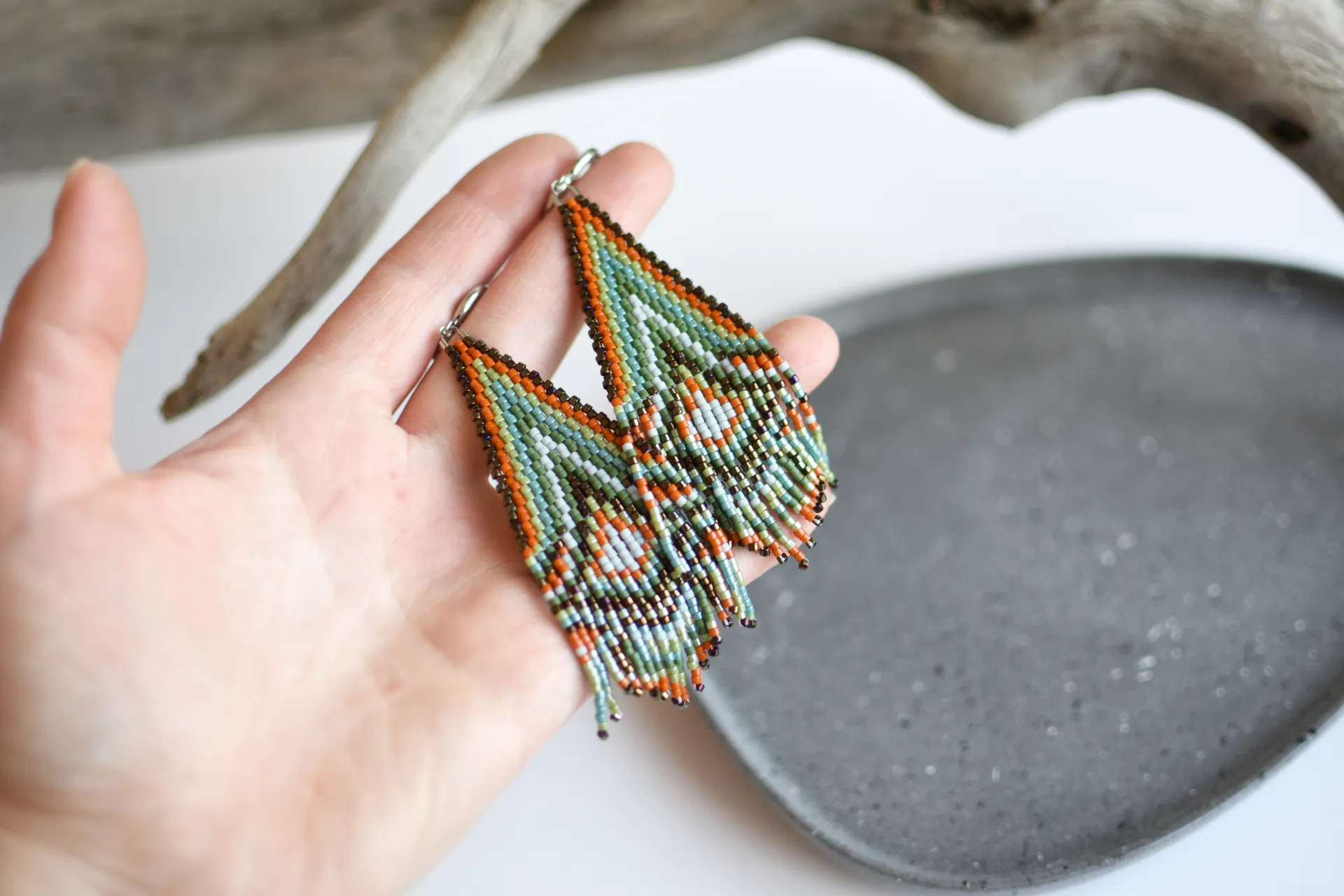 Крупные, но очень легкие серьги в природных оттенках, сплетённые по авторской схеме.