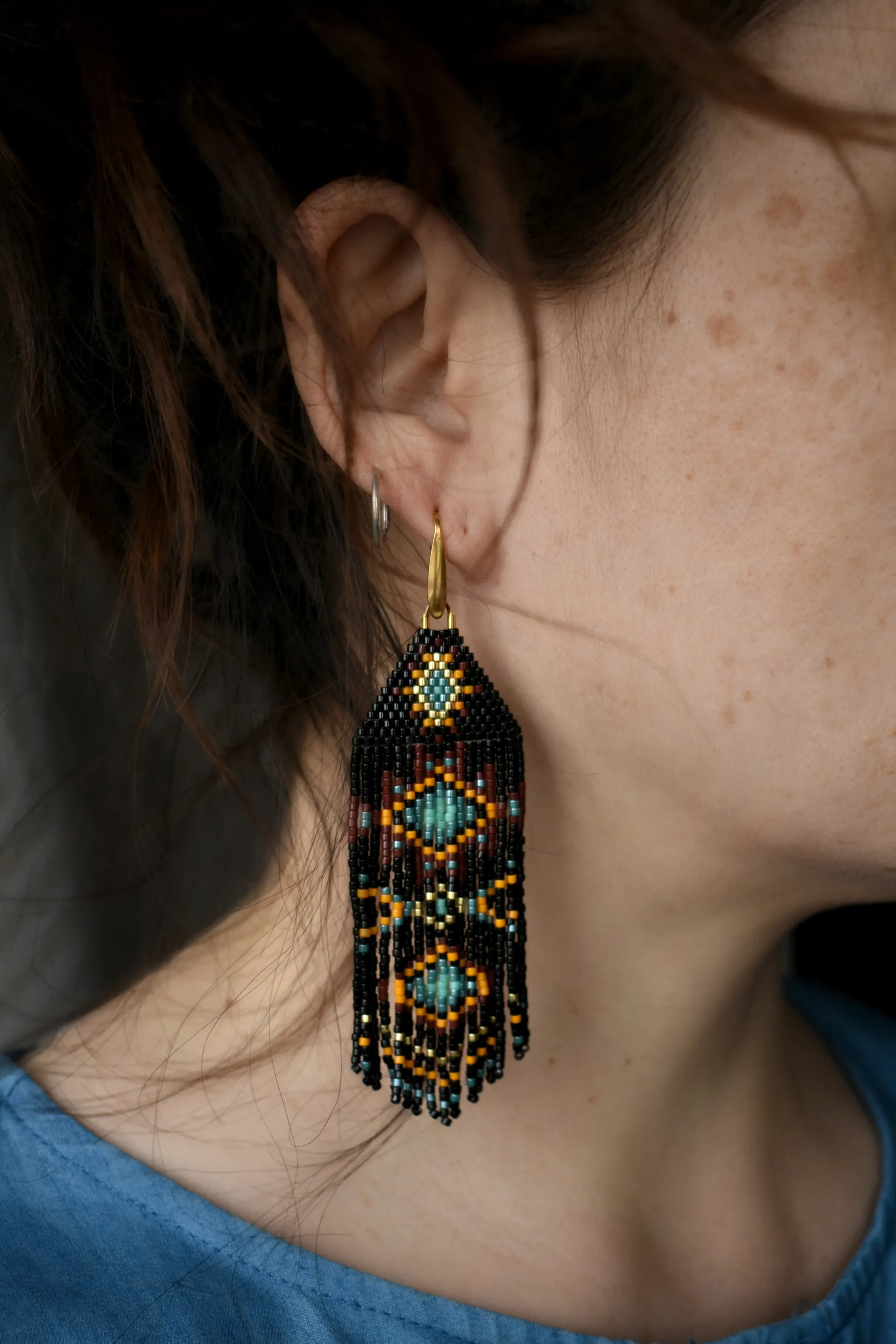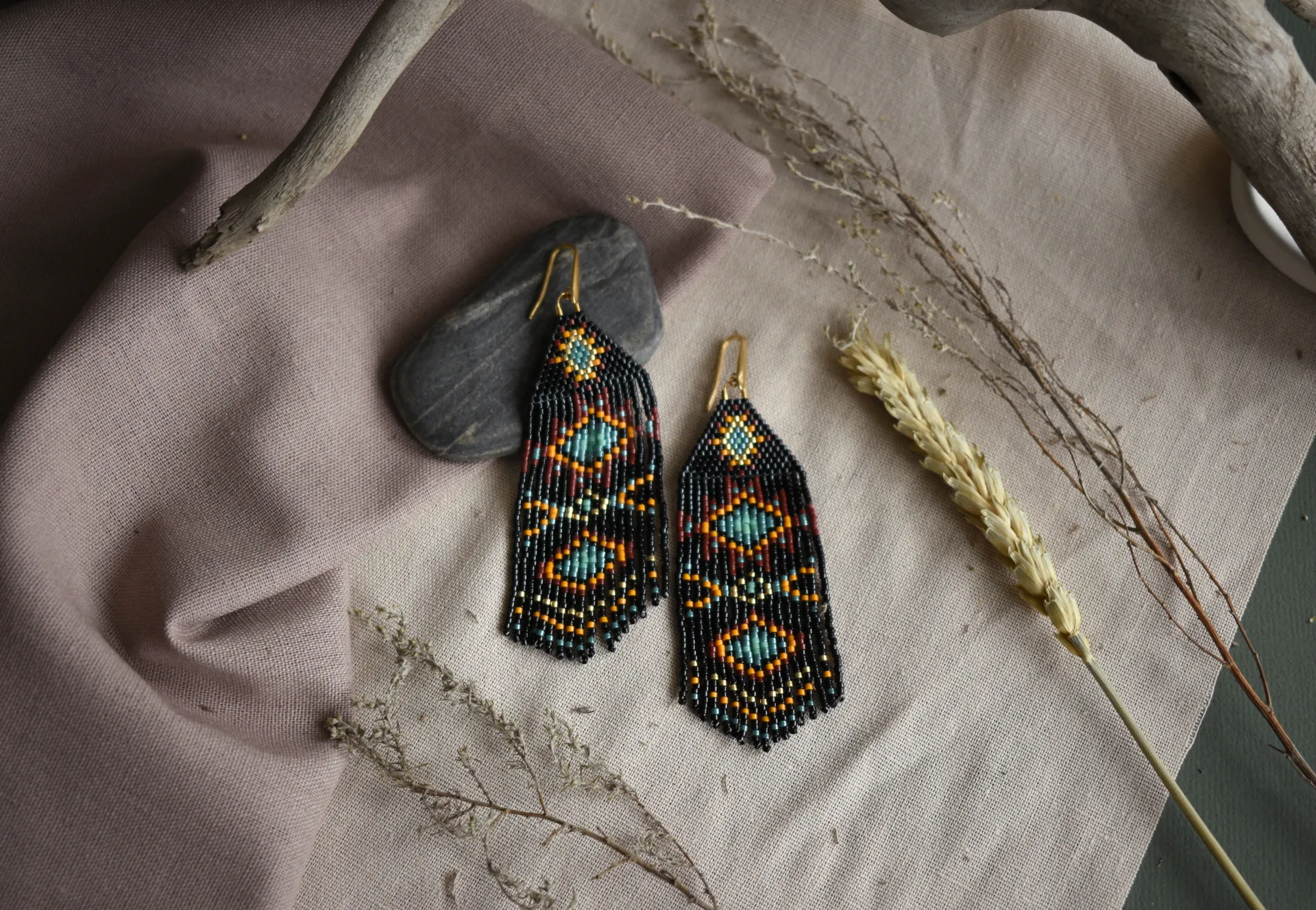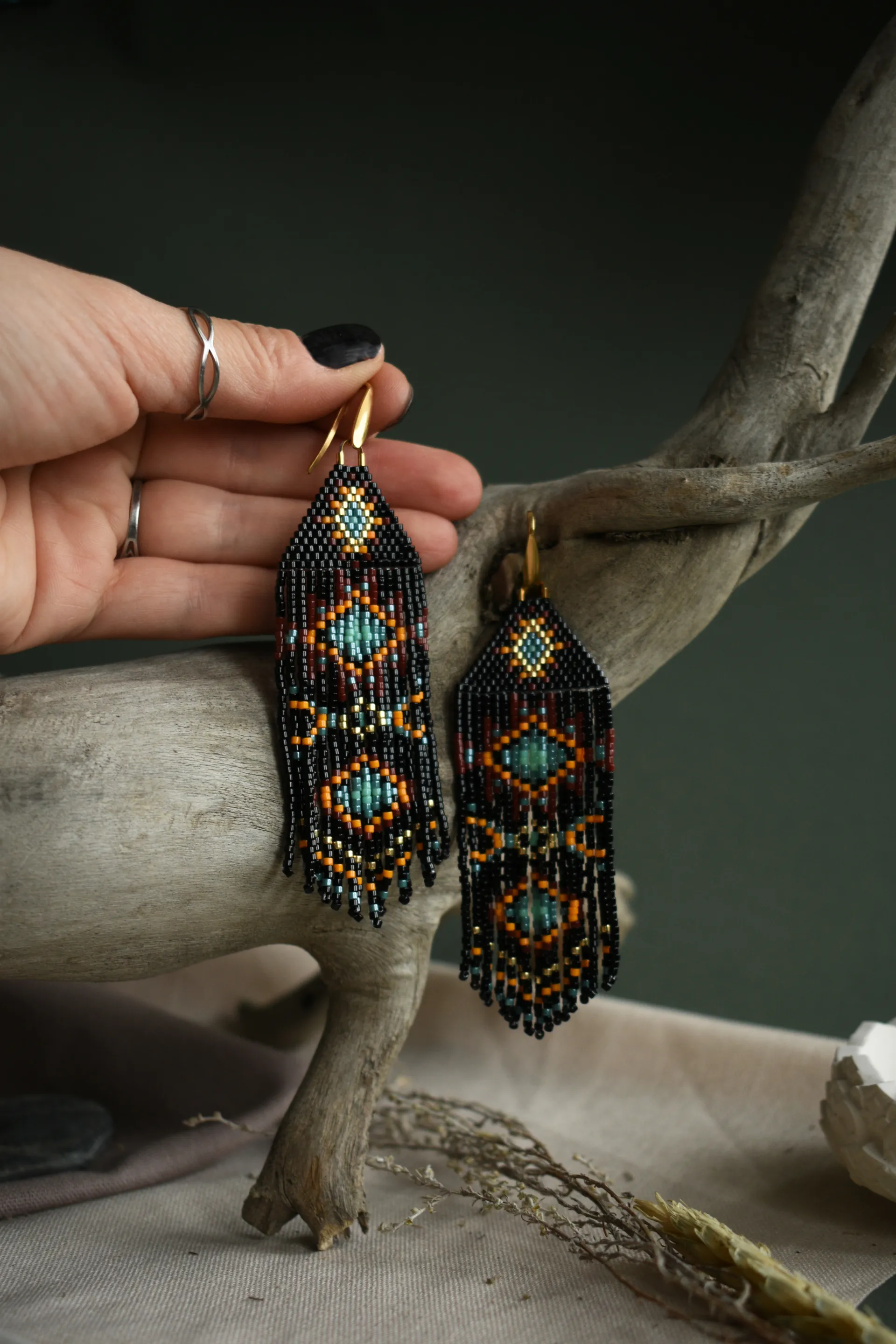 Длинные чёрные серьги из бисера с геометрическим узором в этническом стиле - лёгкие, эффектные и идеально дополняющие свободный самобытный образ.