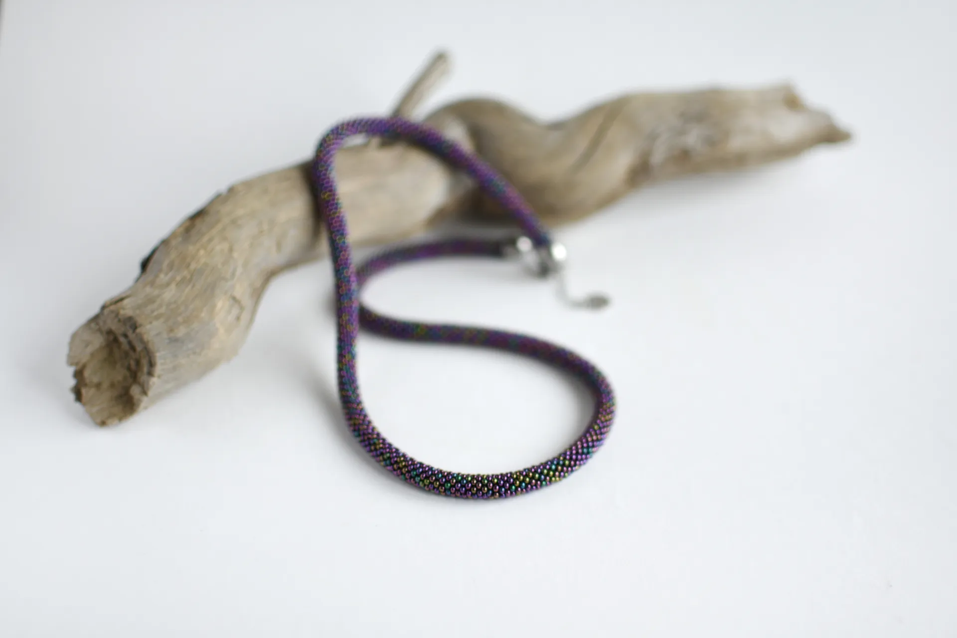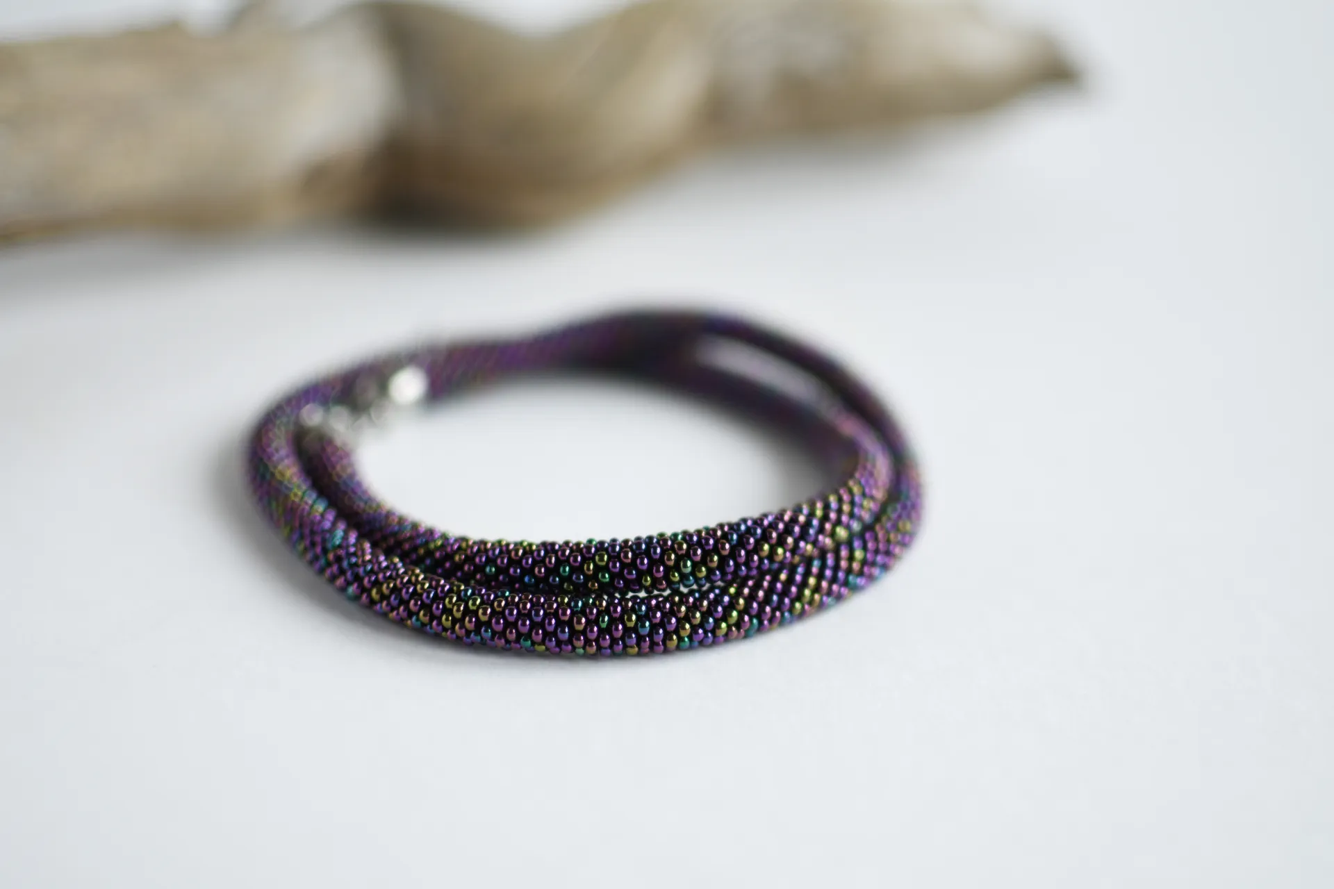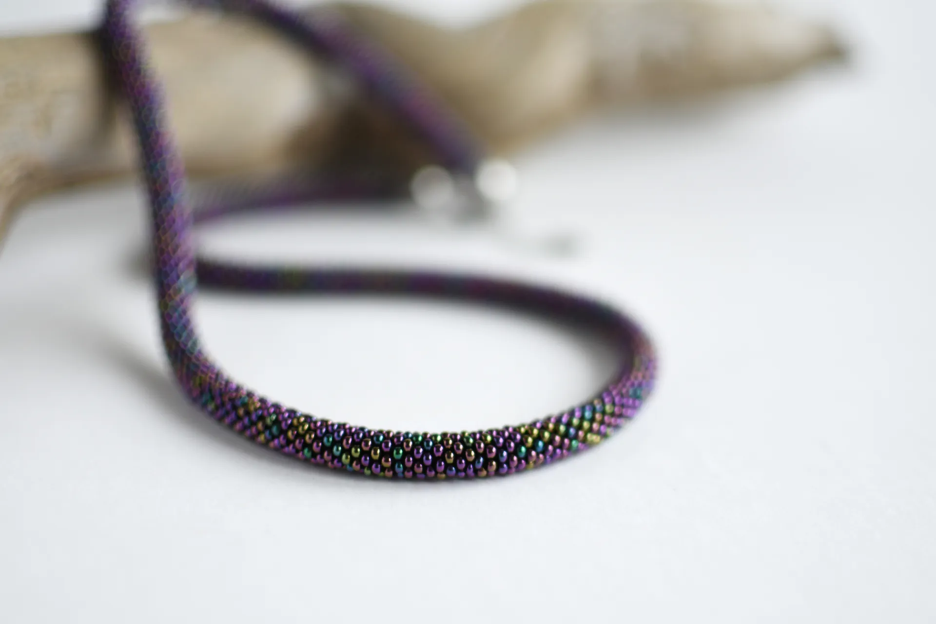 Удлинённая модель тонкого жгута из переливающегося фиолетового бисера.