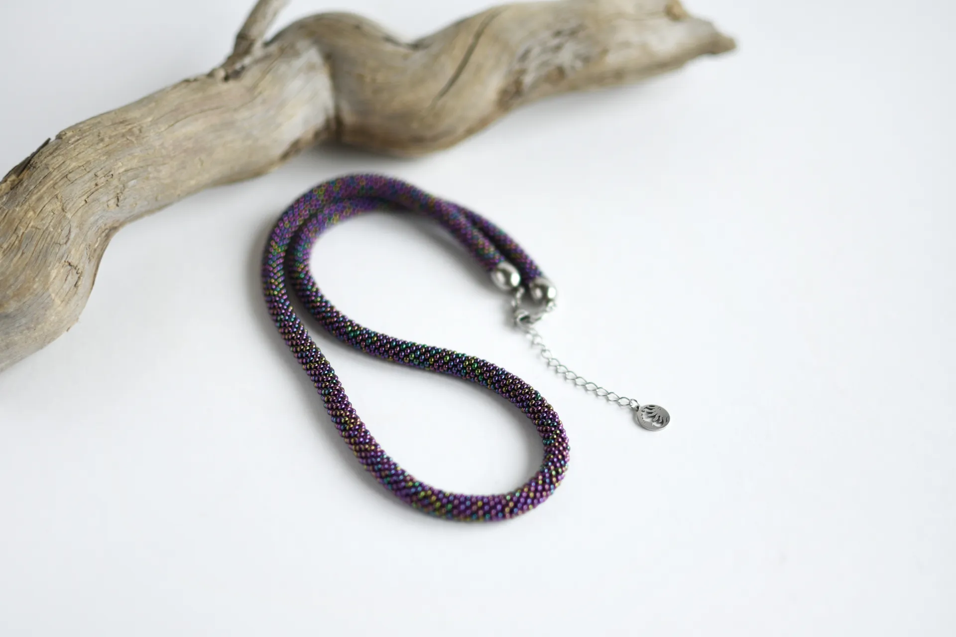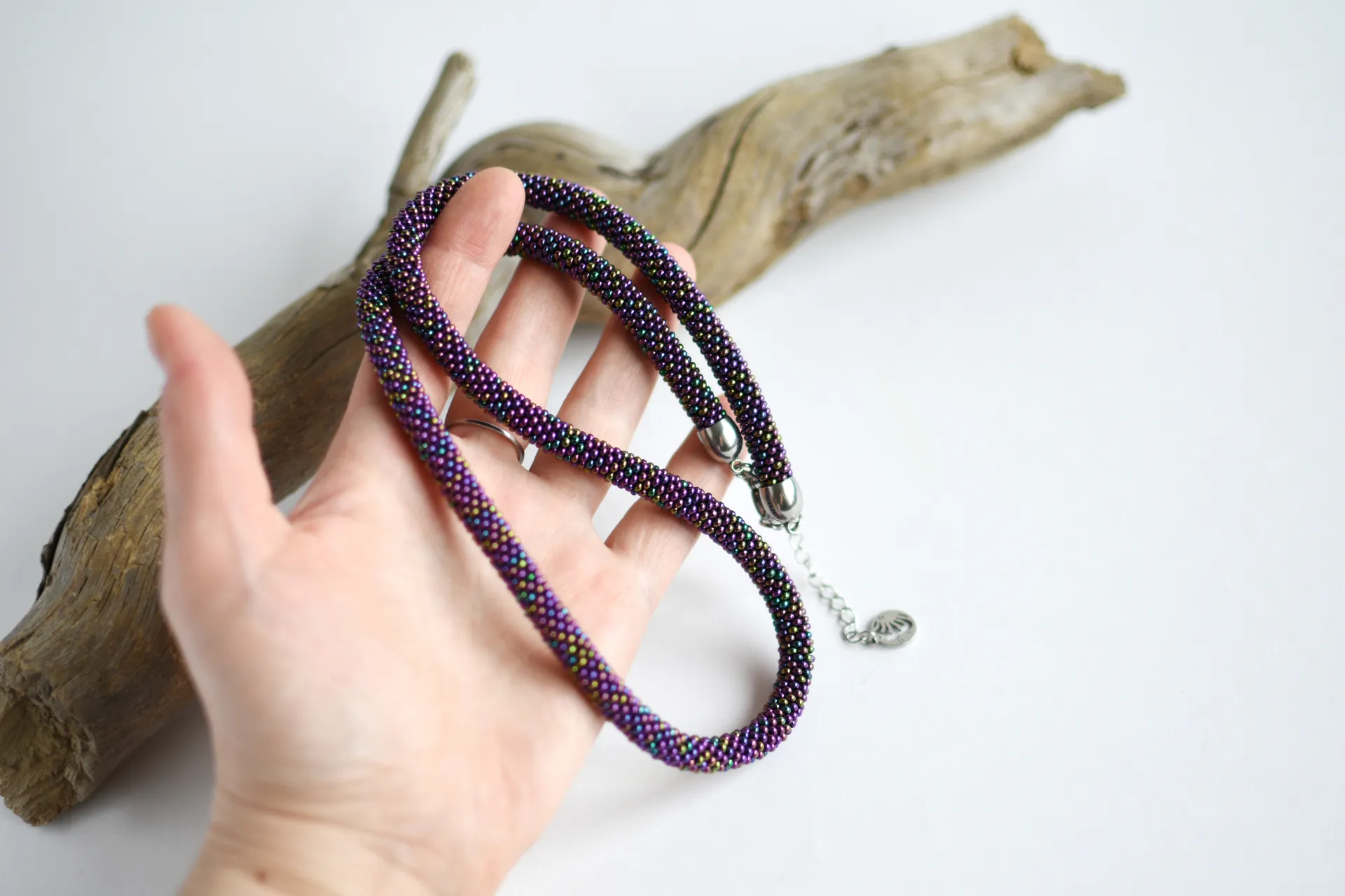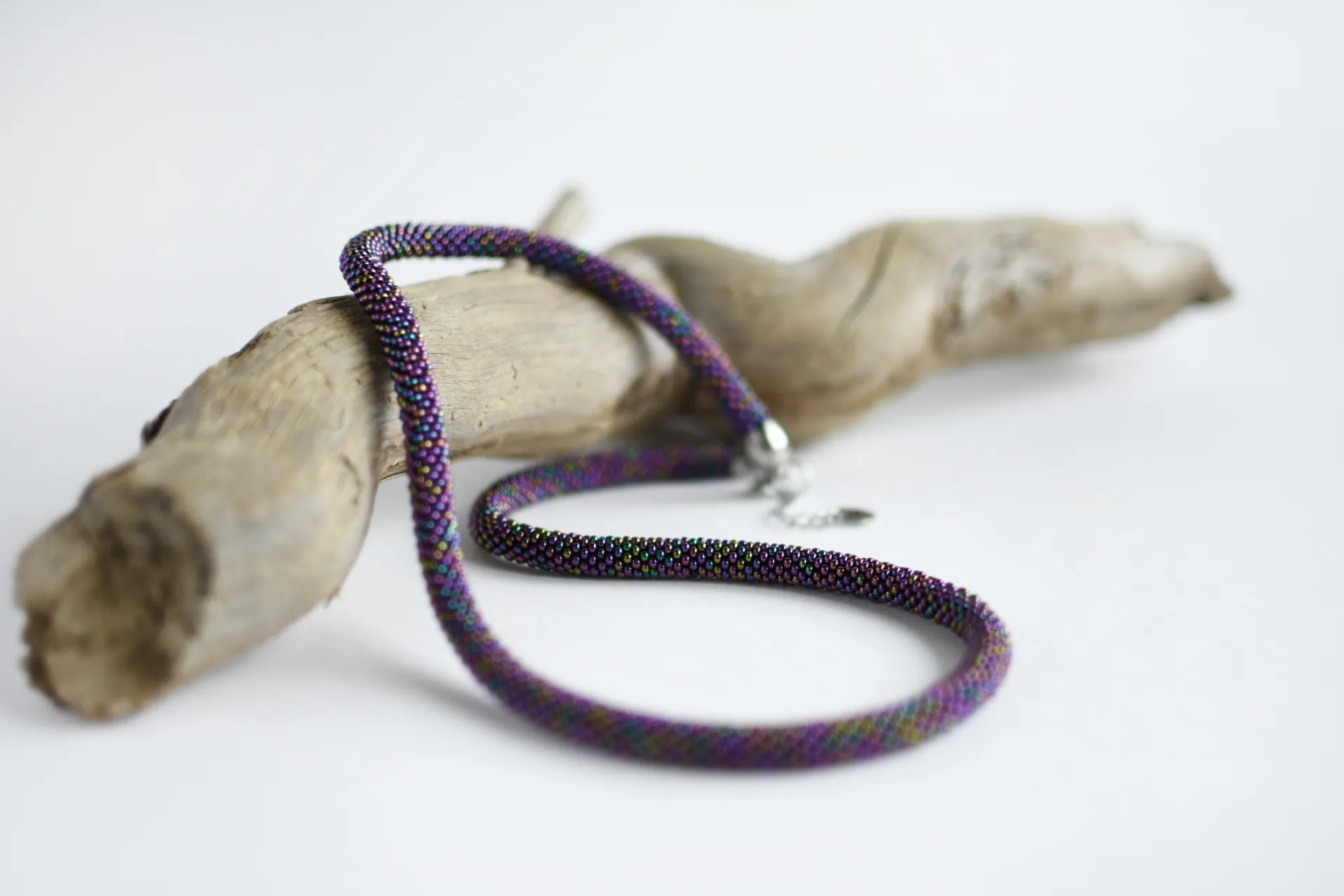 Удлинённая модель тонкого жгута из переливающегося фиолетового бисера.