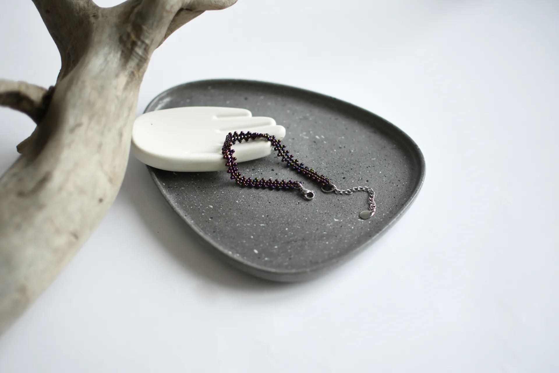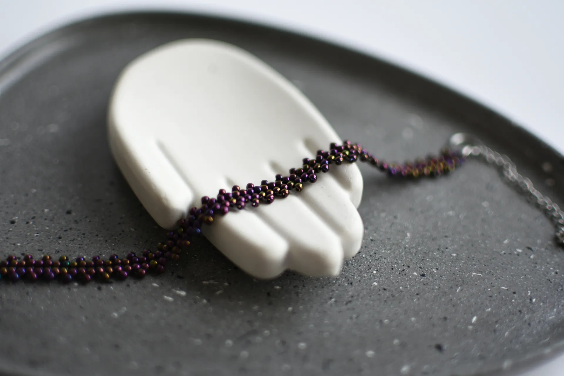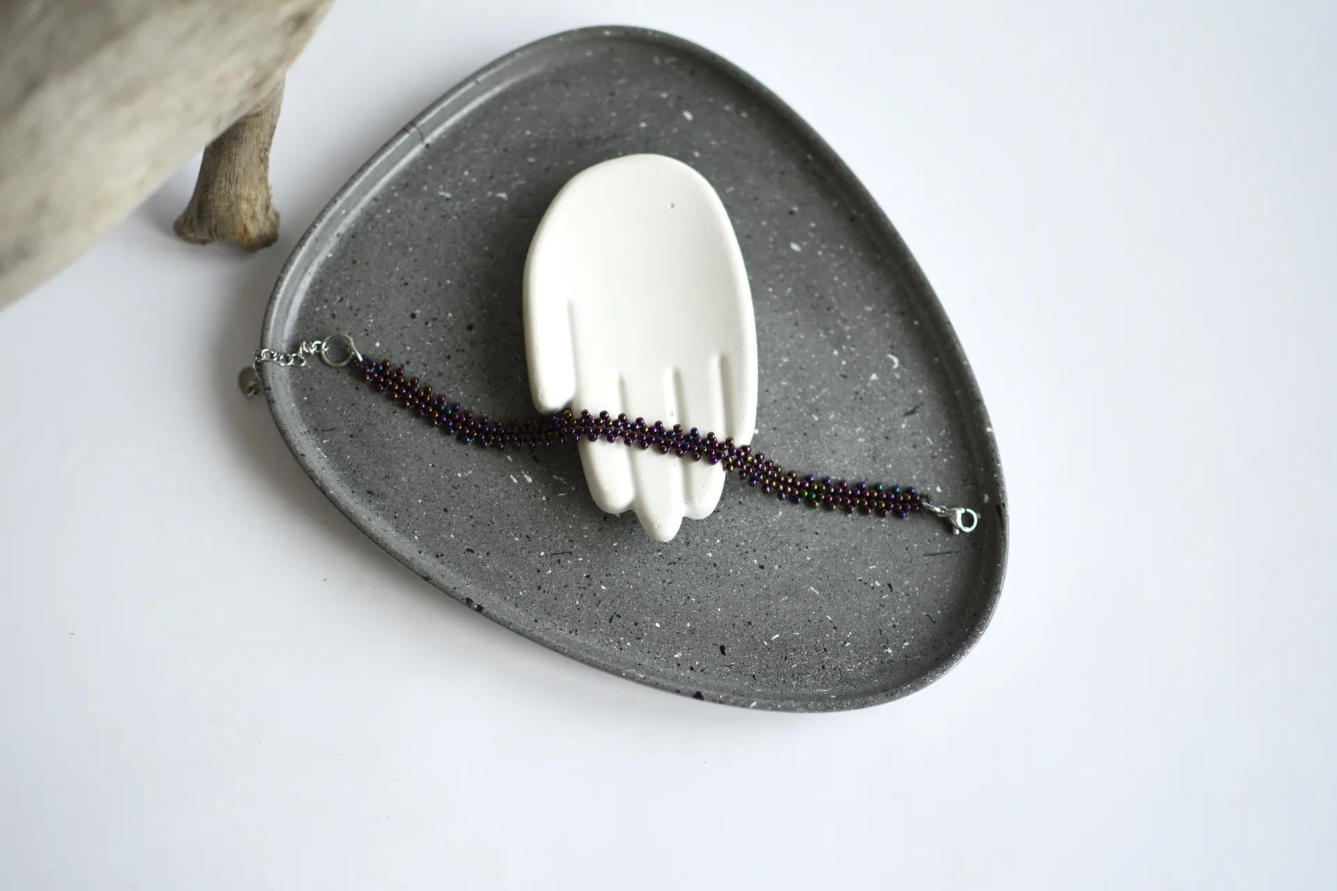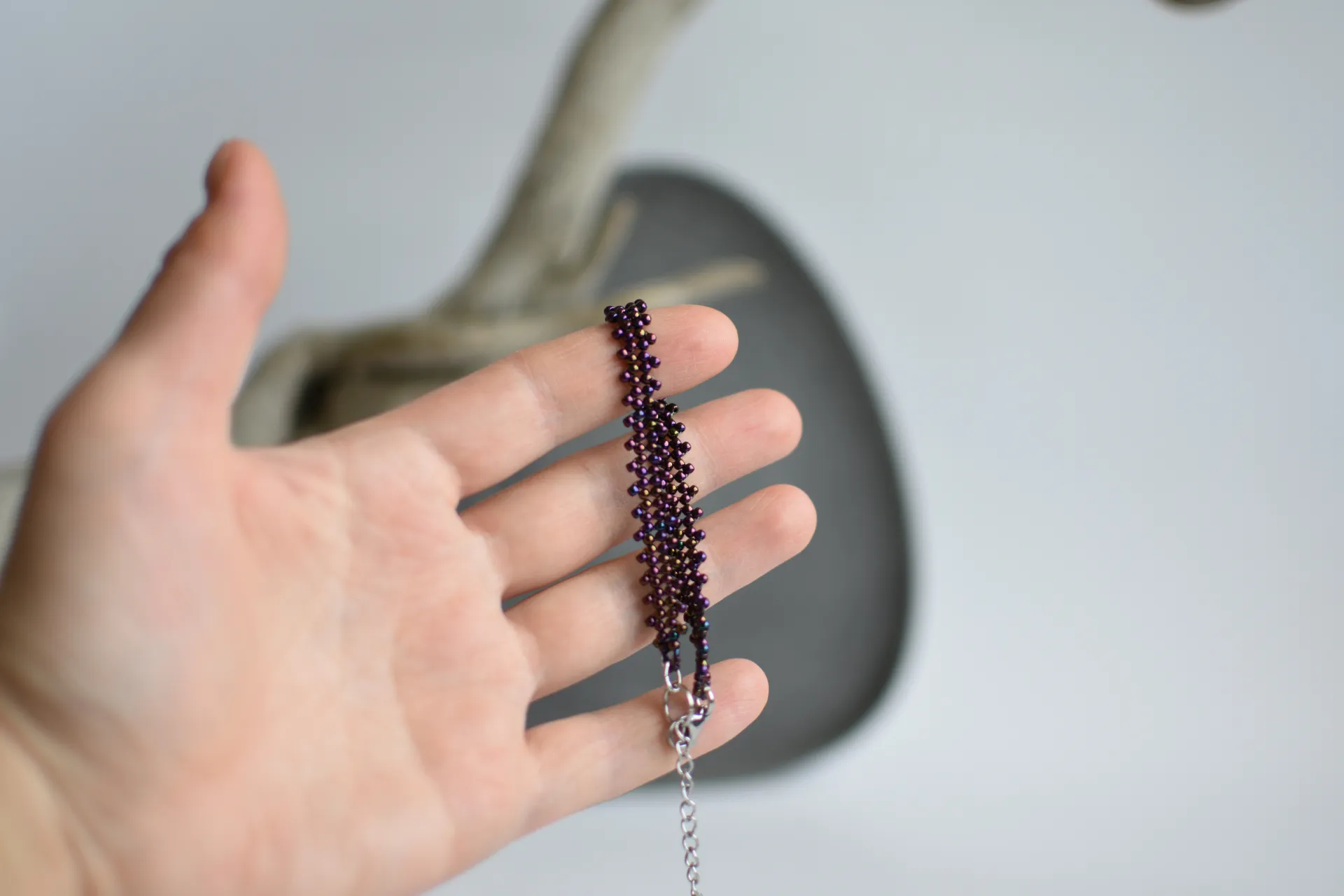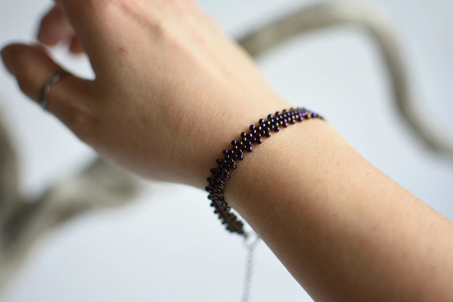 Тонкий плетёный браслет из фиолетового бисера с радужным отливом.