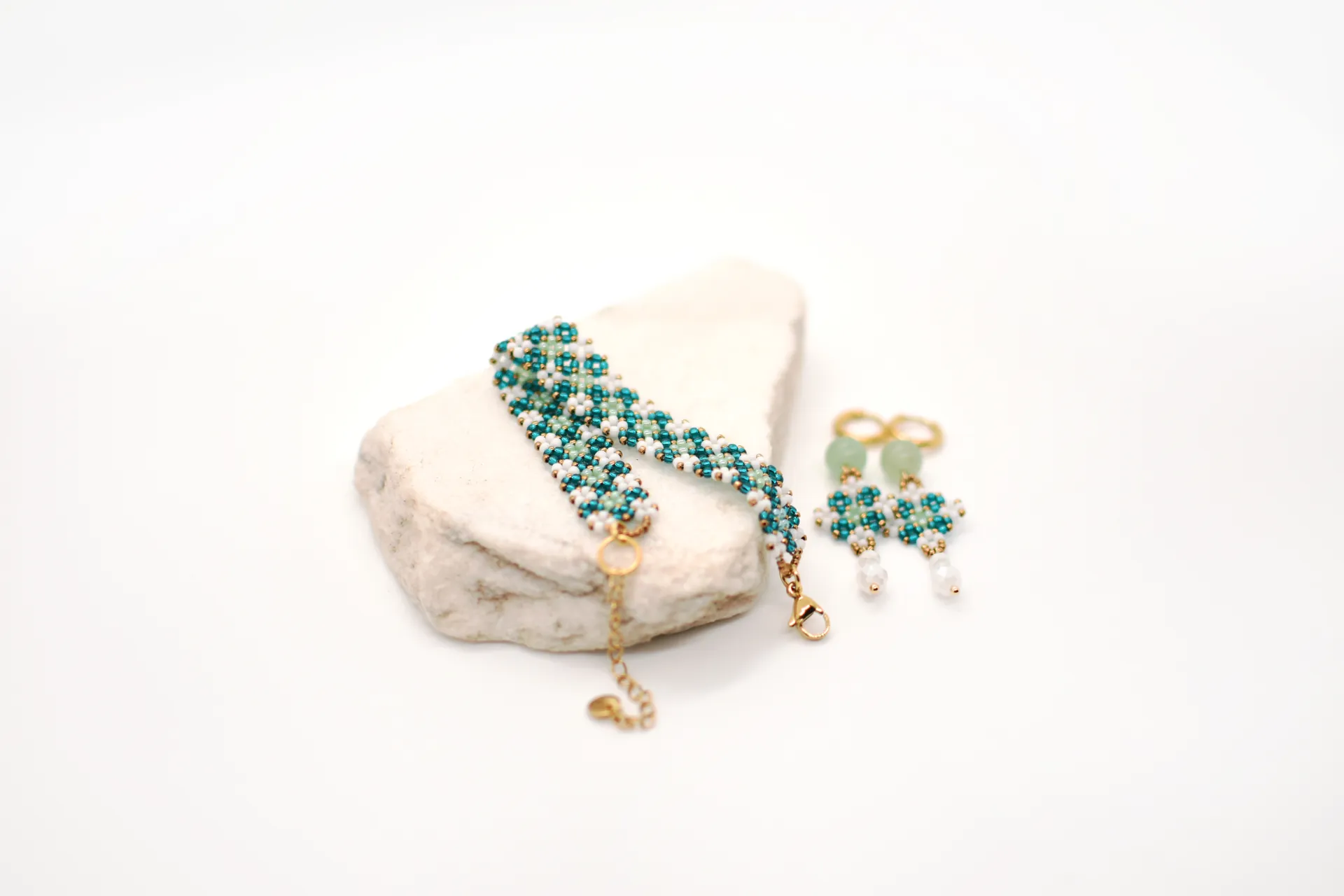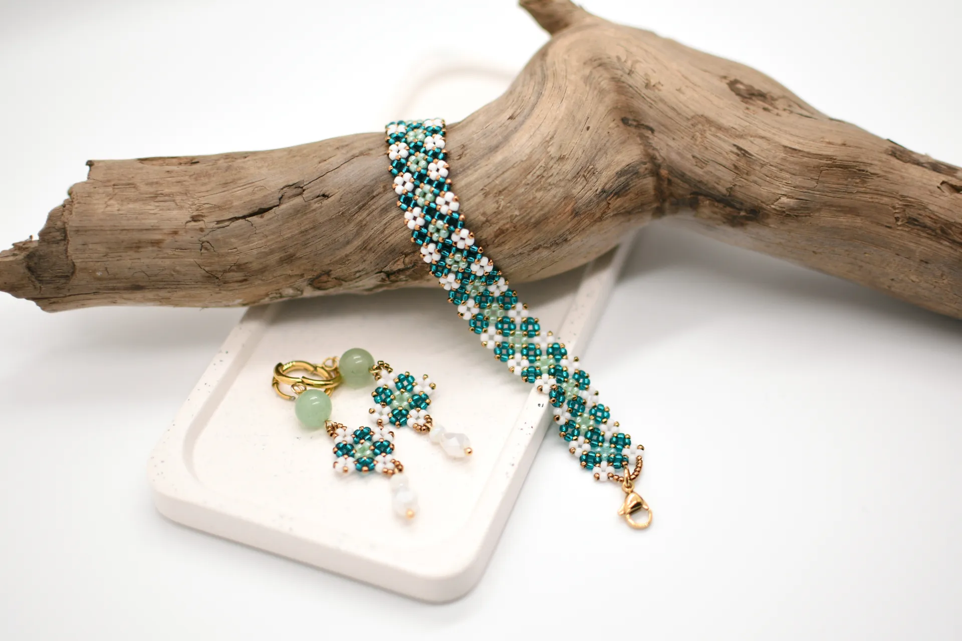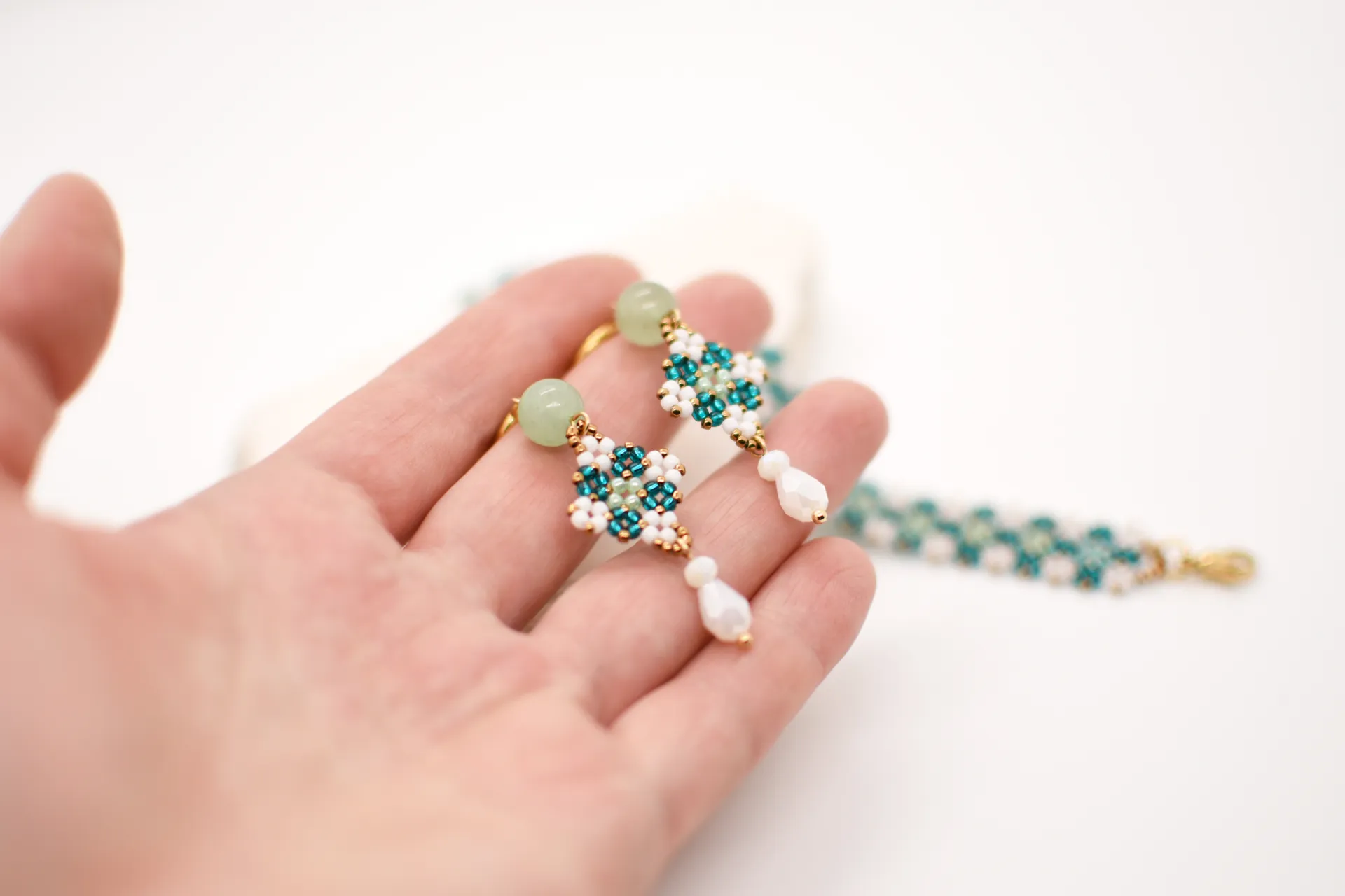 Лёгкий комплект из бисера в бирюзовых оттенках с бусинами зелёного авантюрина.
