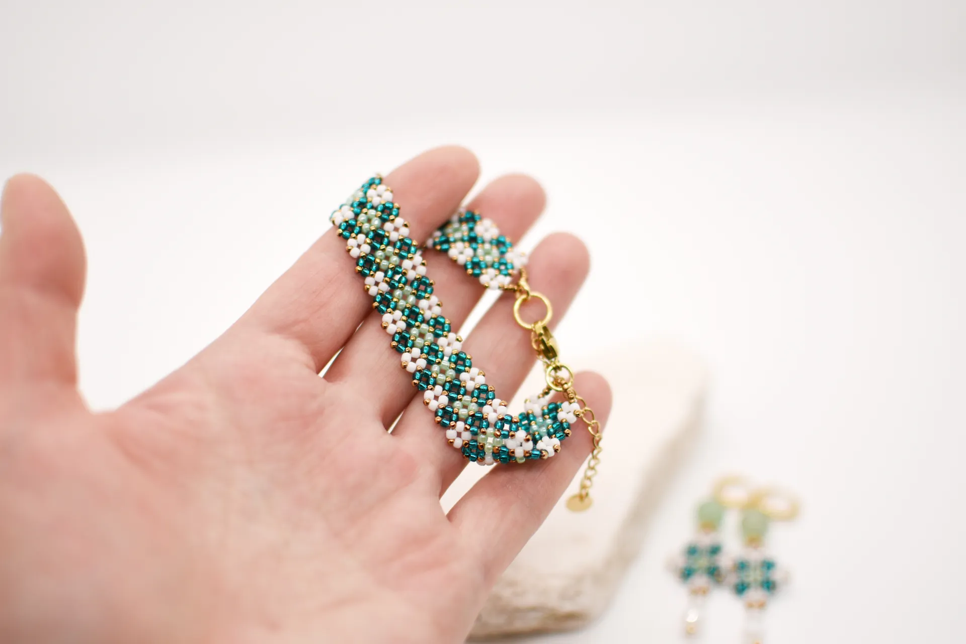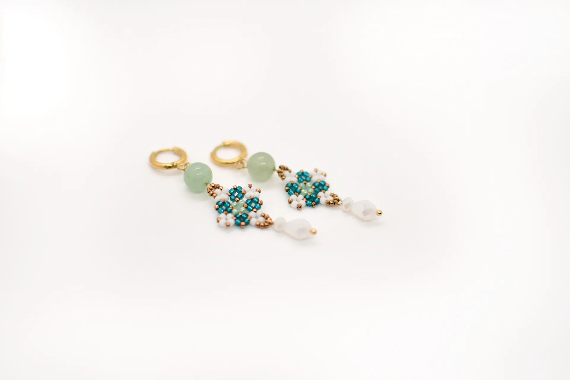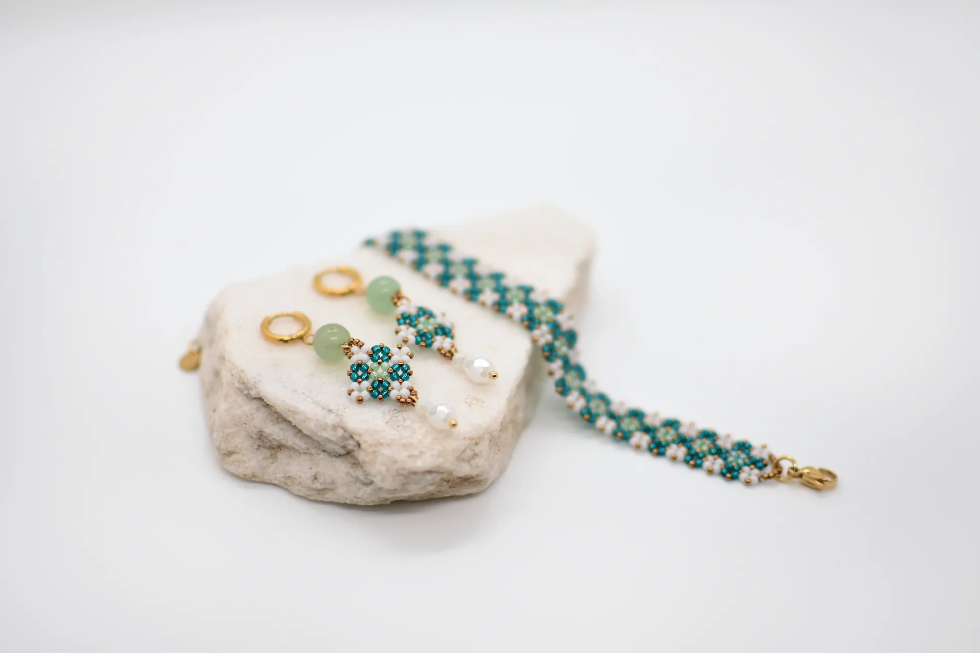 Лёгкий комплект из бисера в бирюзовых оттенках с бусинами зелёного авантюрина.