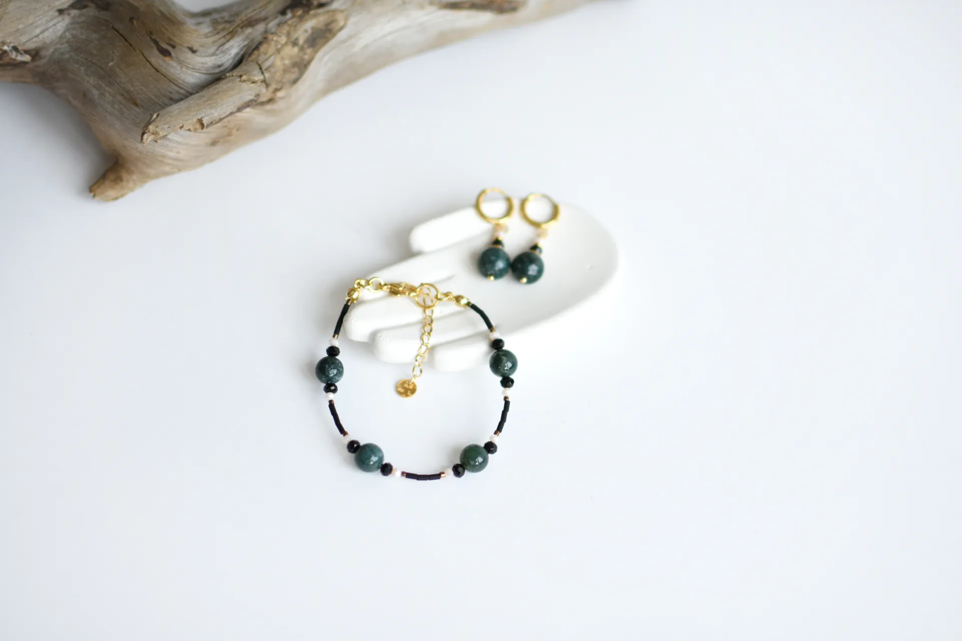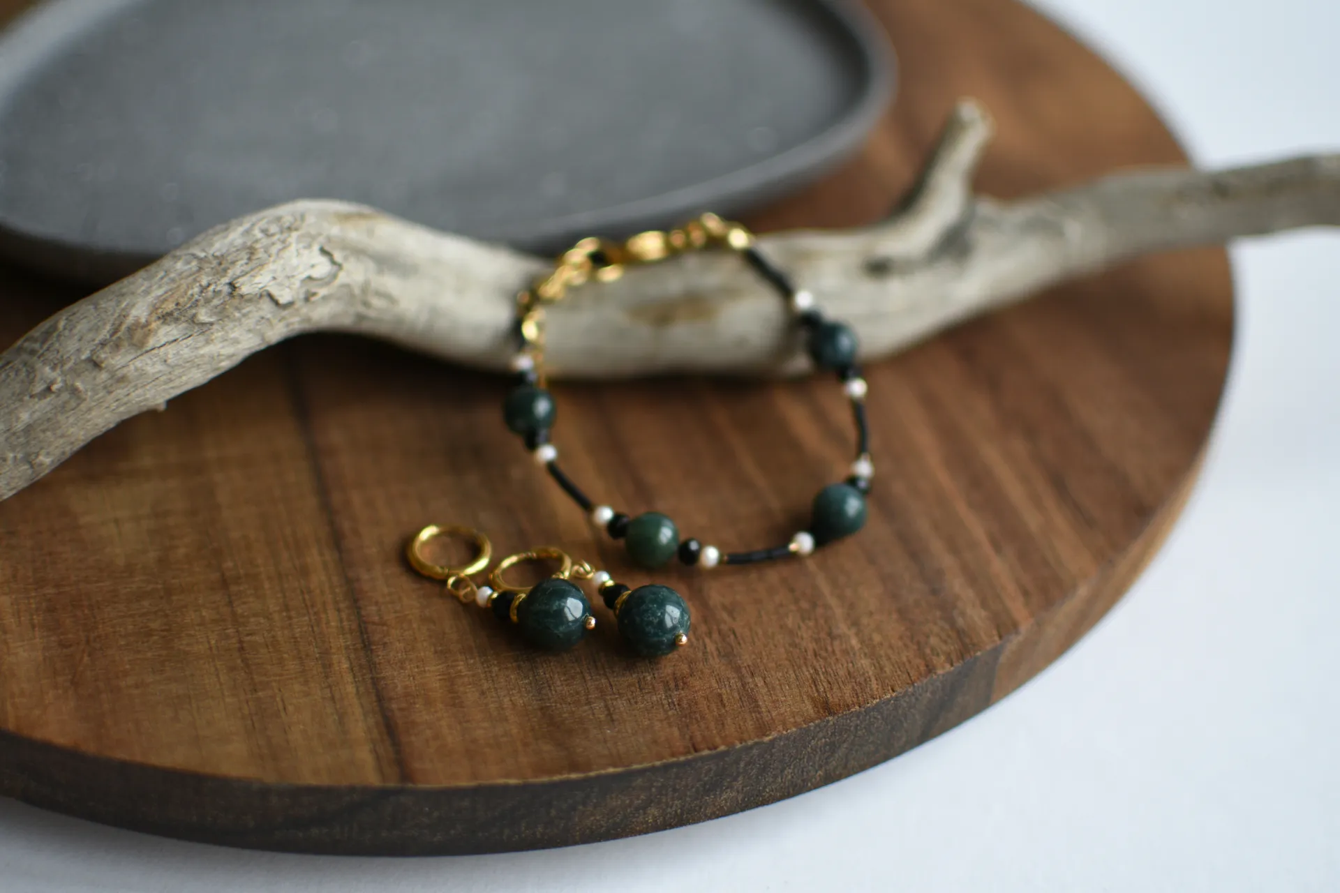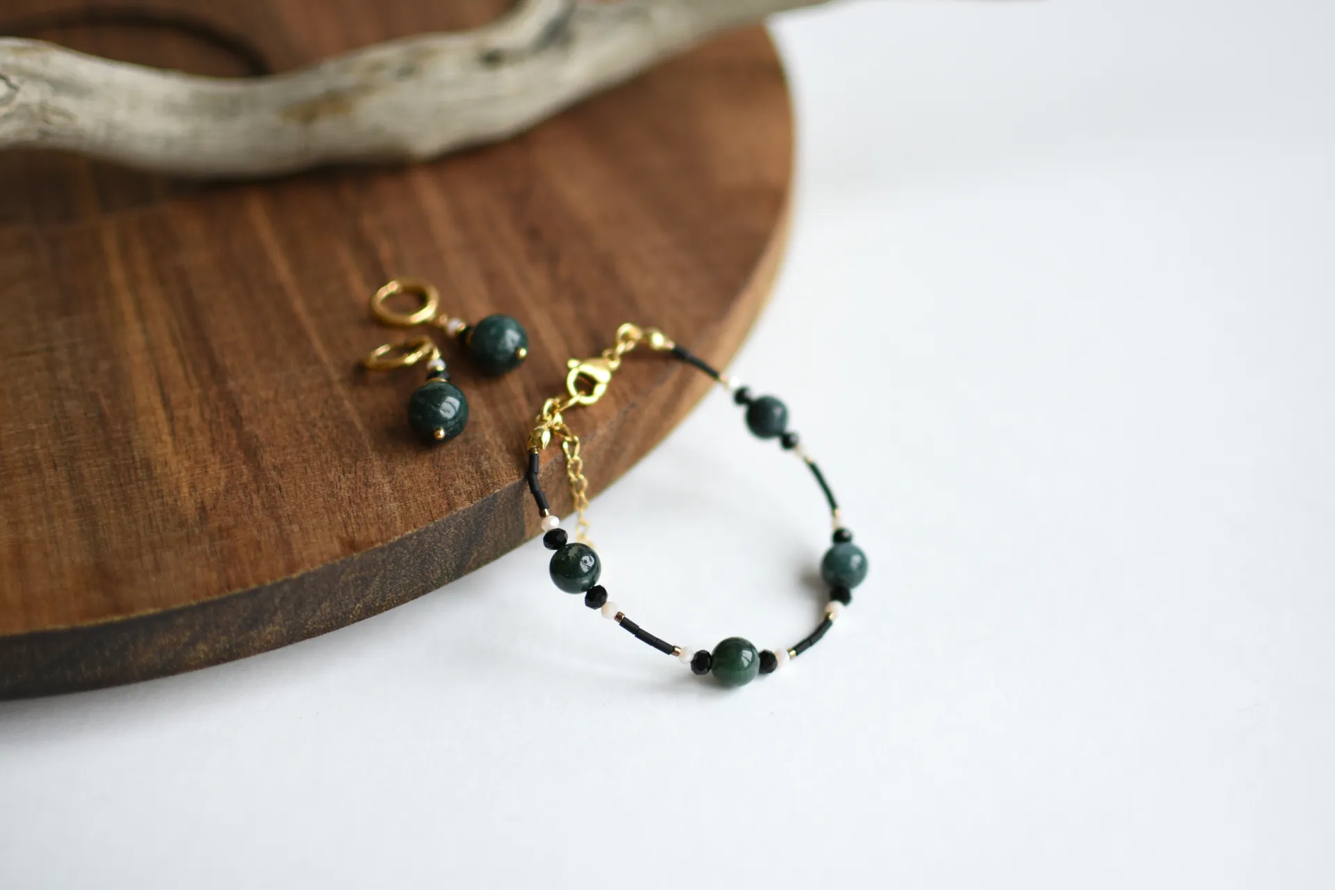 Универсальный комплект из небольших серёжек и браслета с бусинами халцедона.