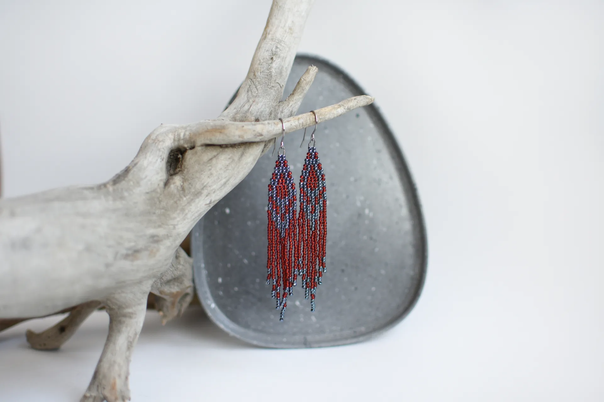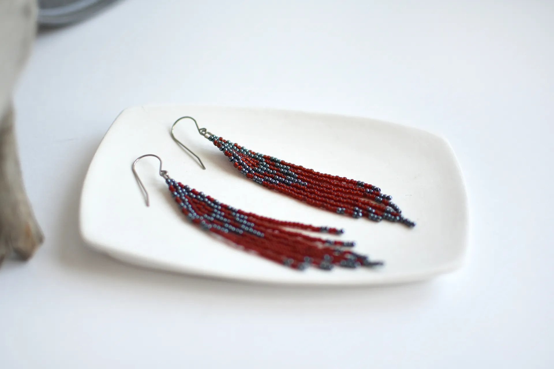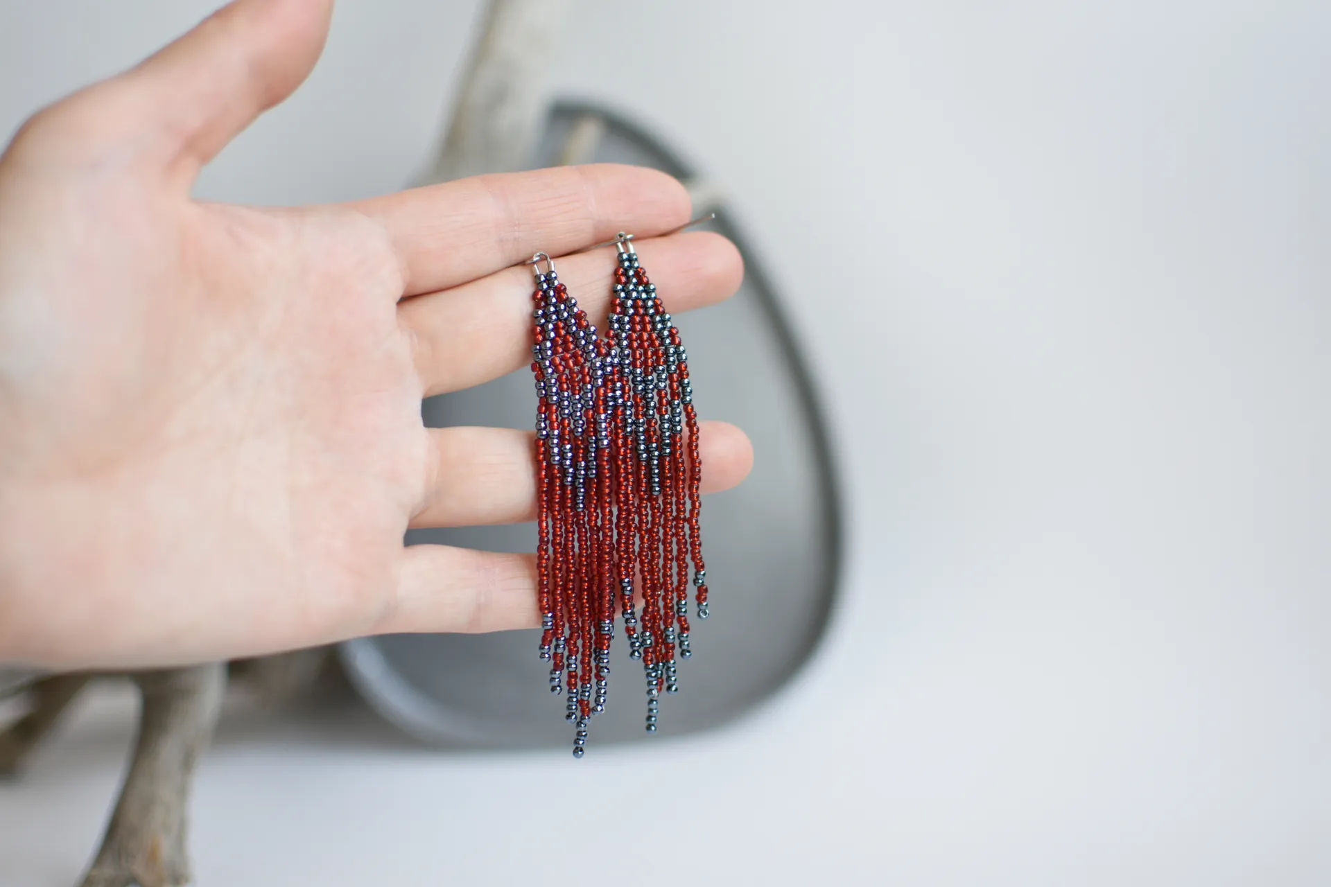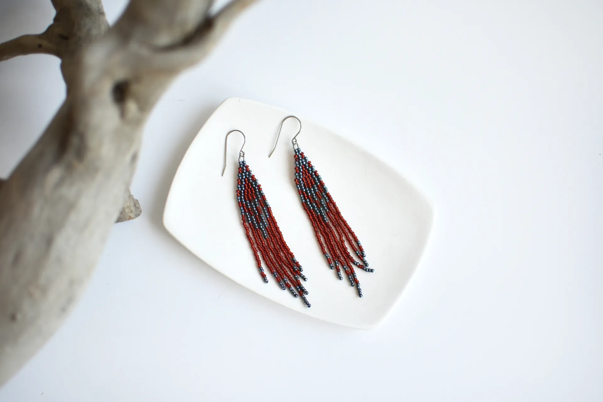 Серьги с бахромой из красного и гематитового бисера.