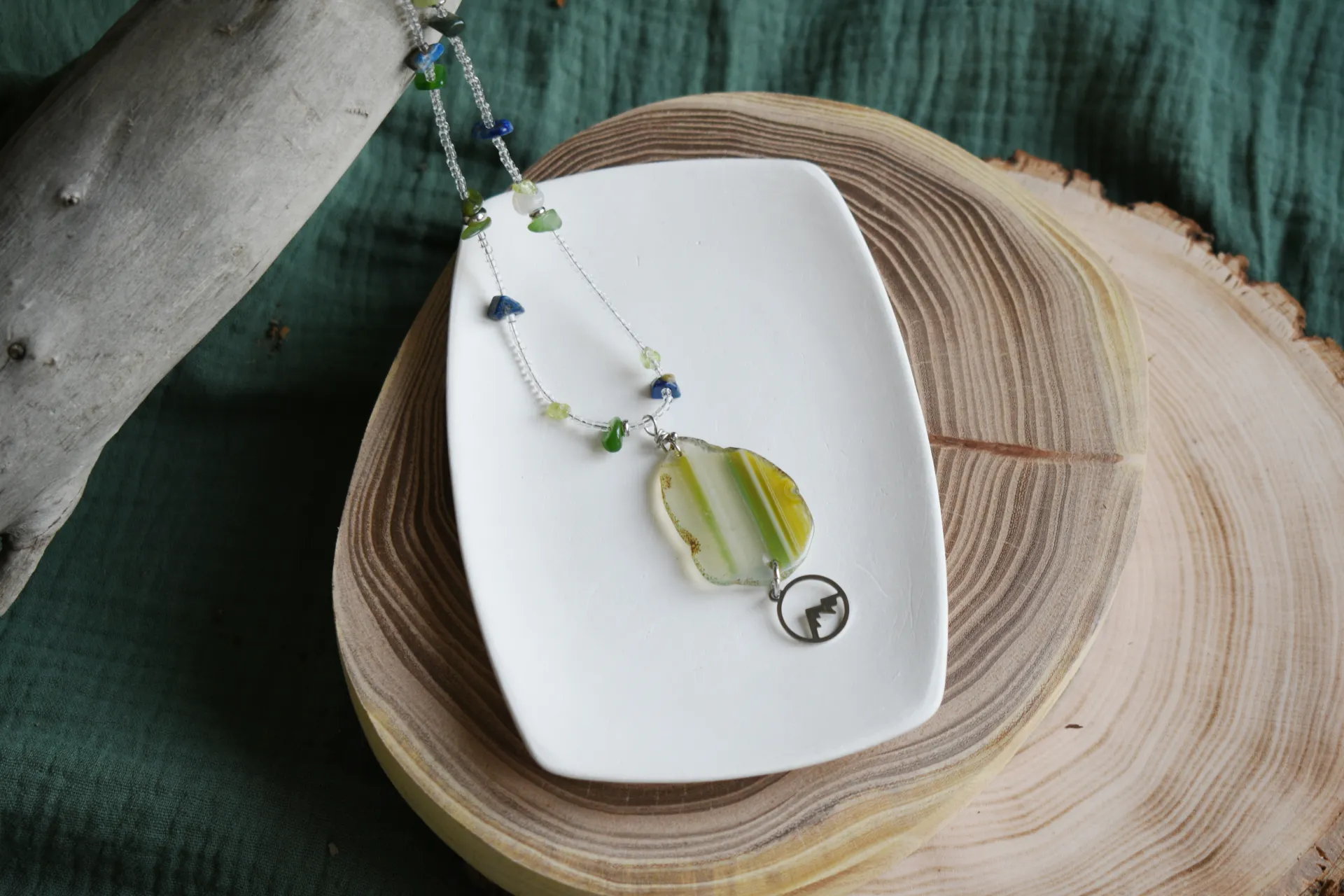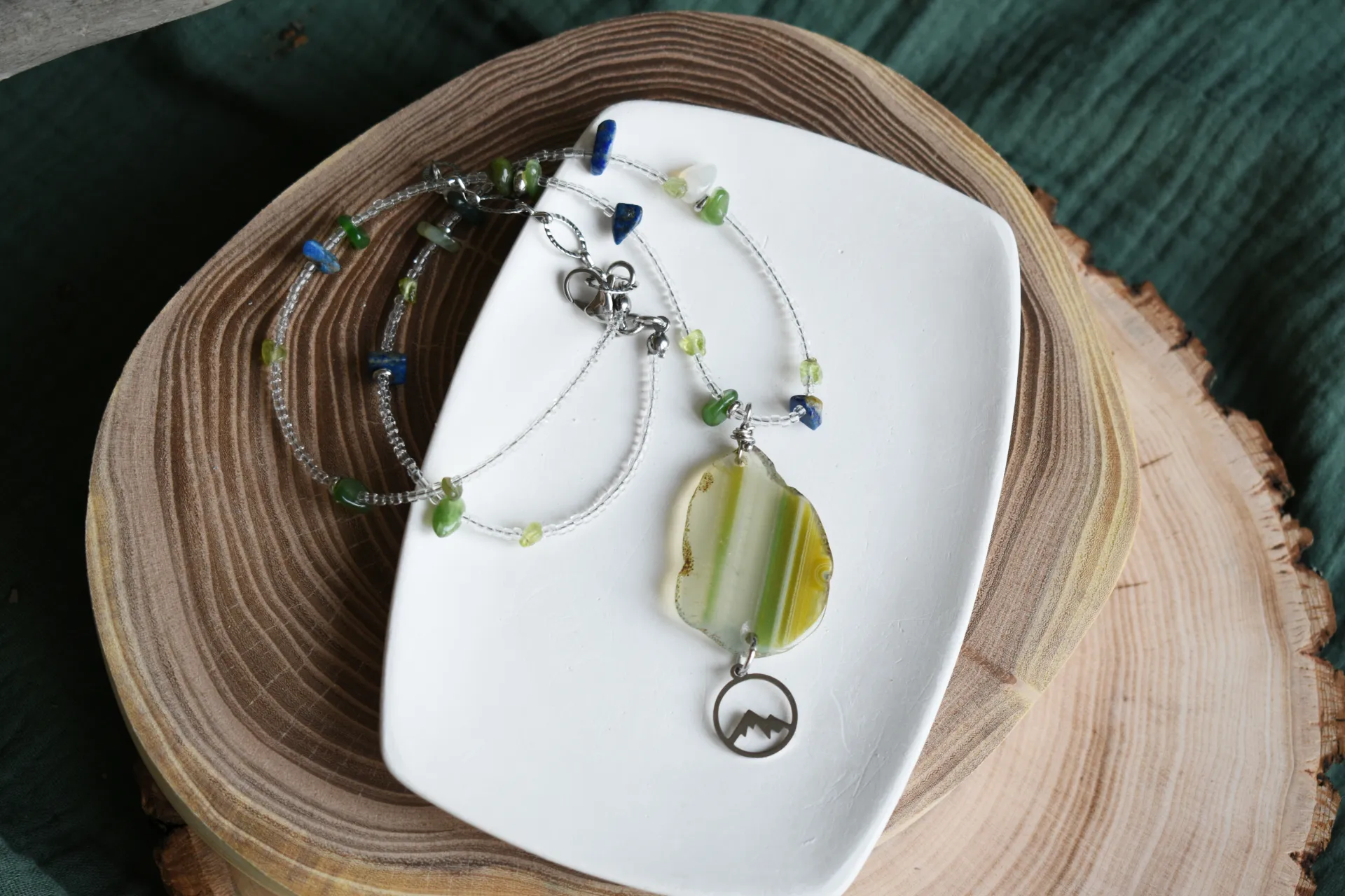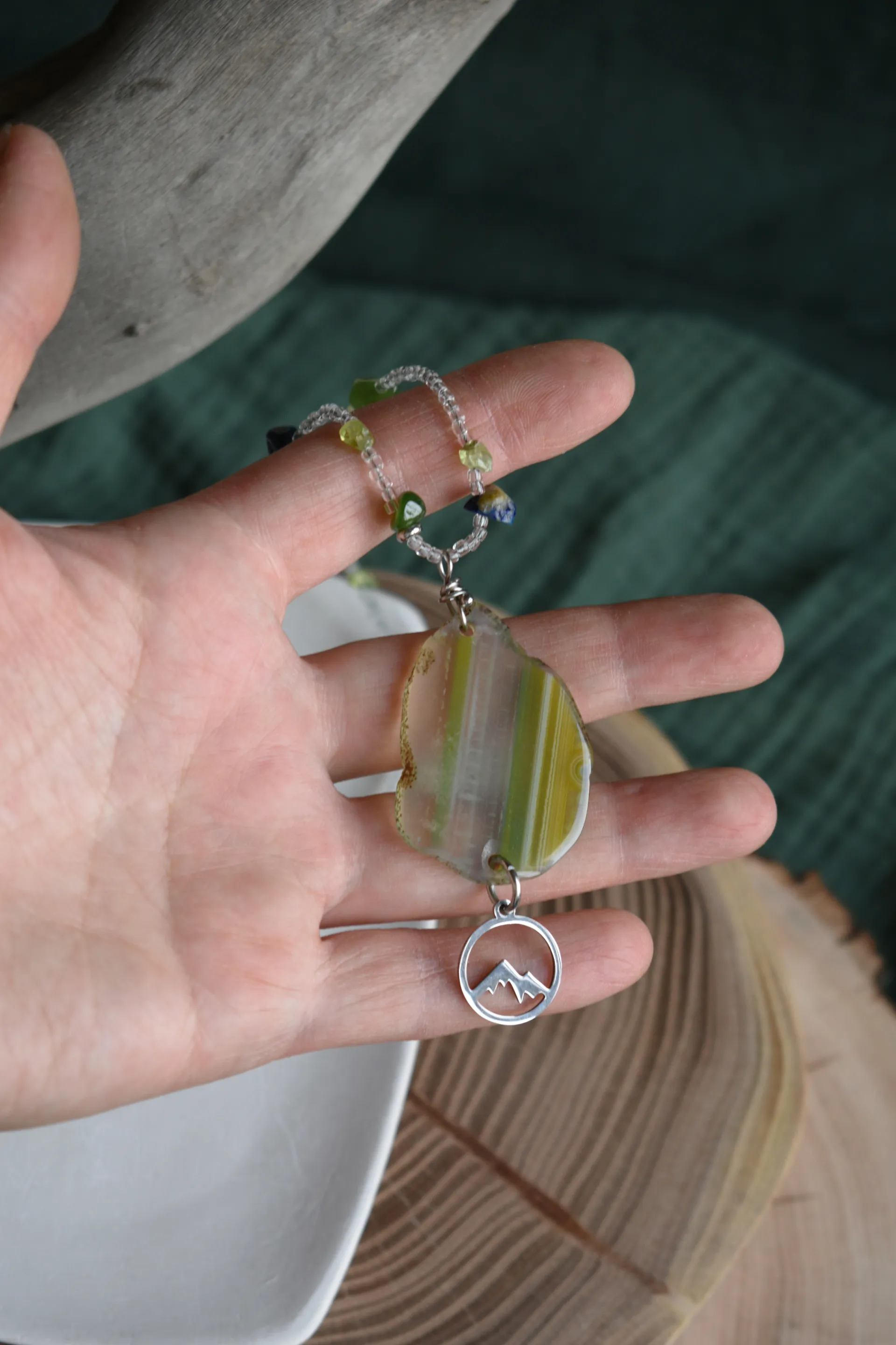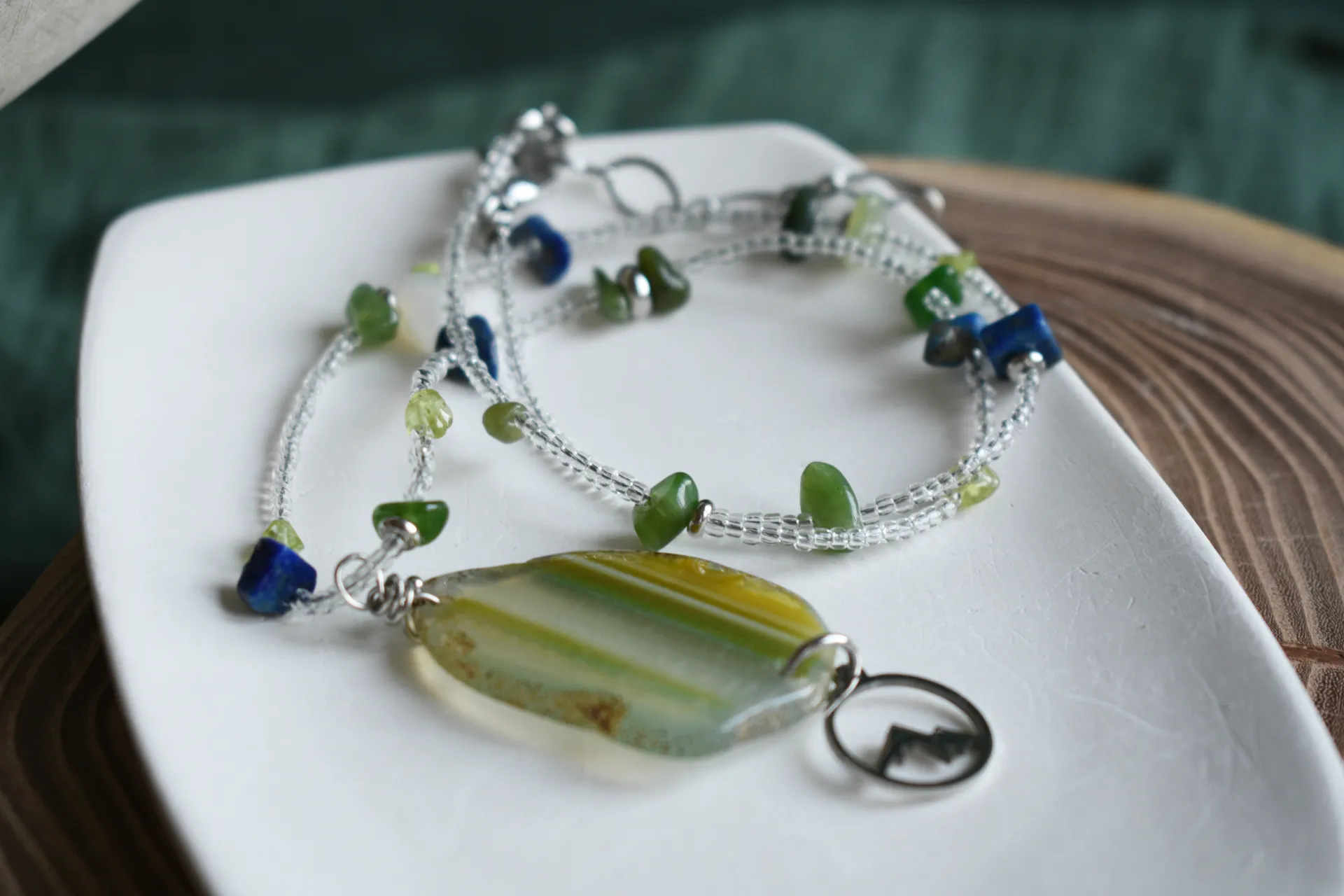 Кулон про горы с тонированным спилом агата на цепочке из бисера с натуральными камнями.