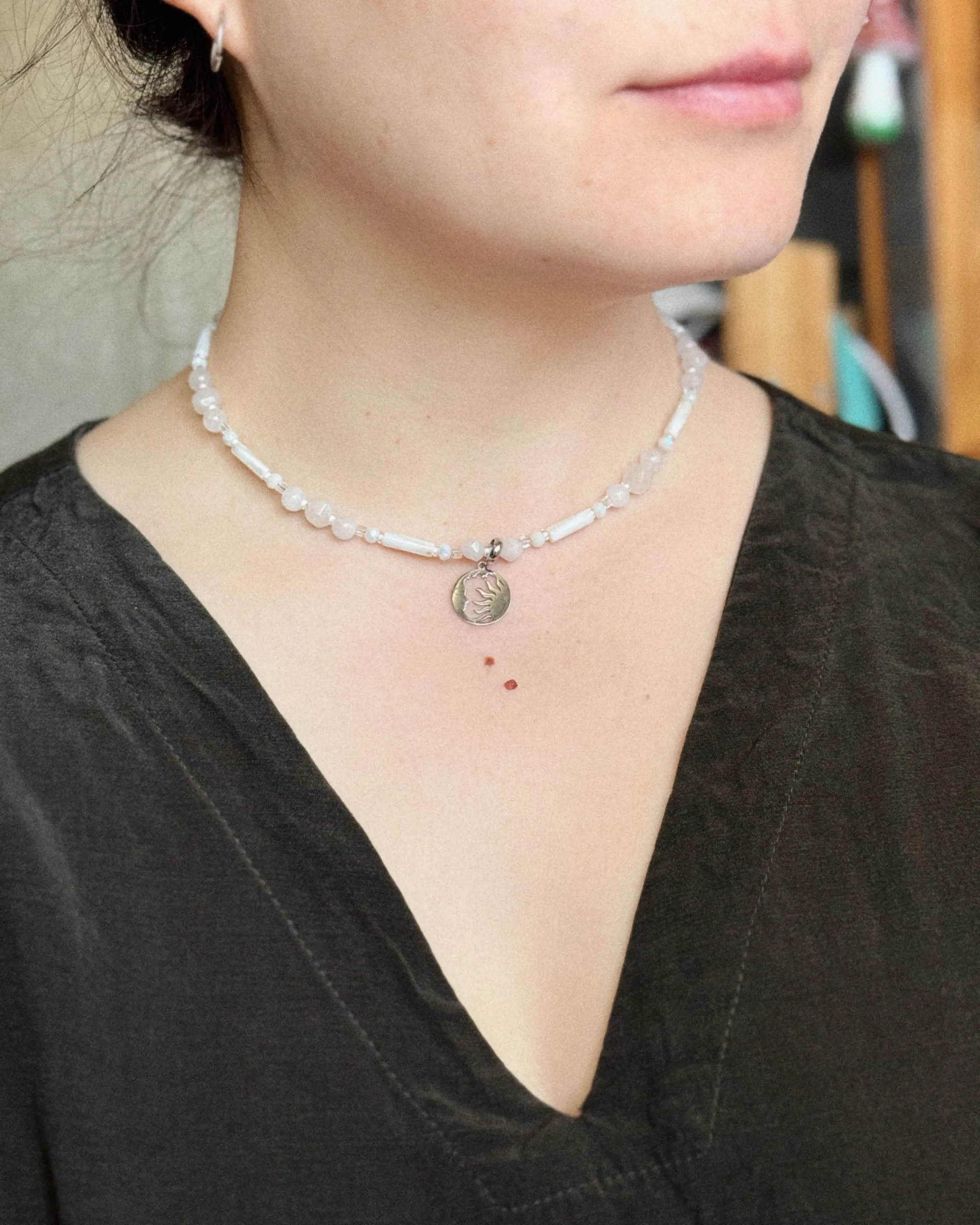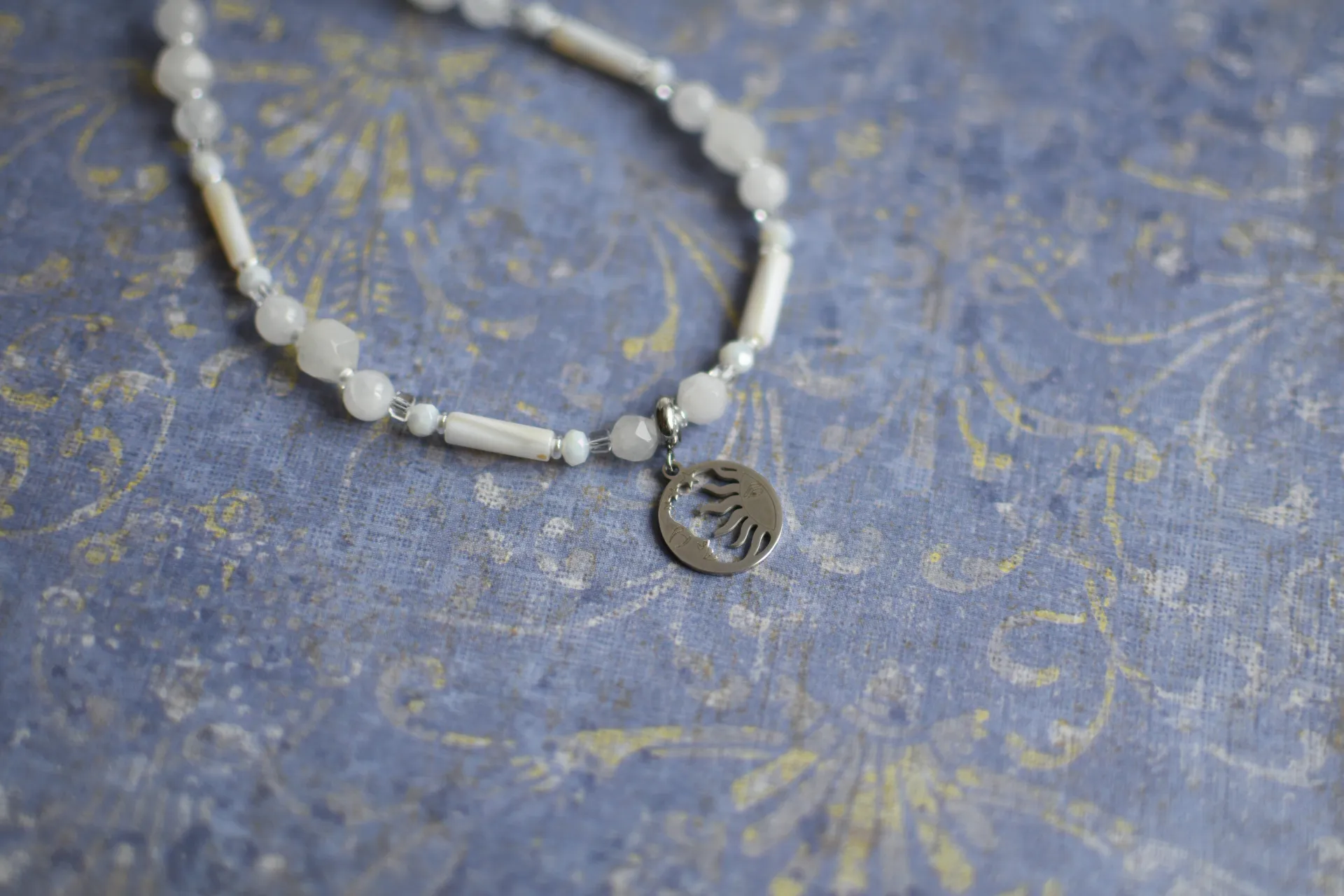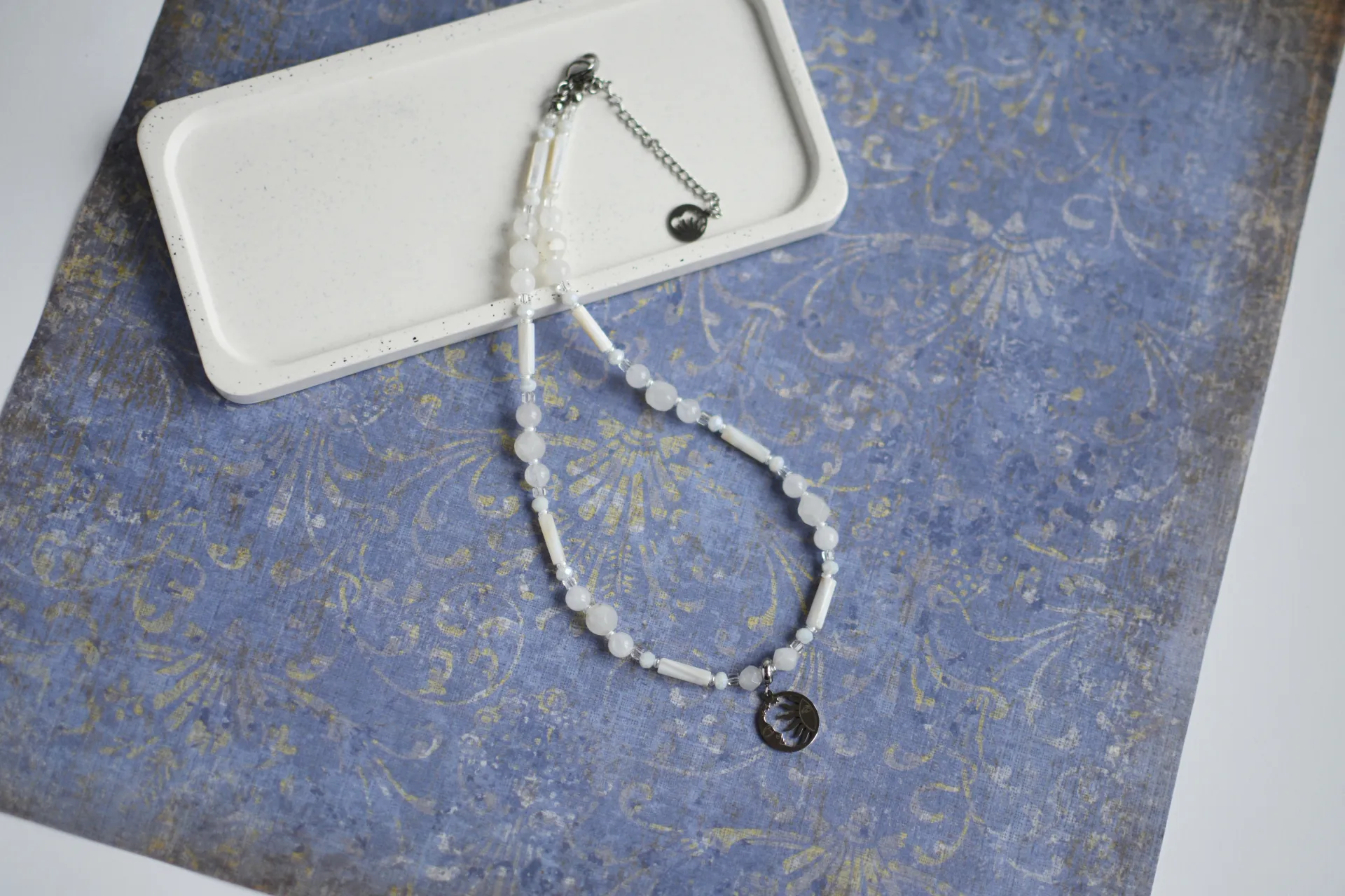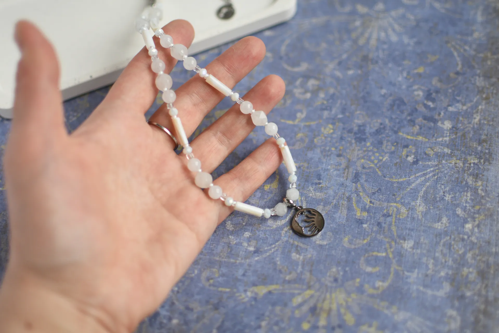 Нежный браслет с белоснежным кварцем и перламутром молочного цвета.