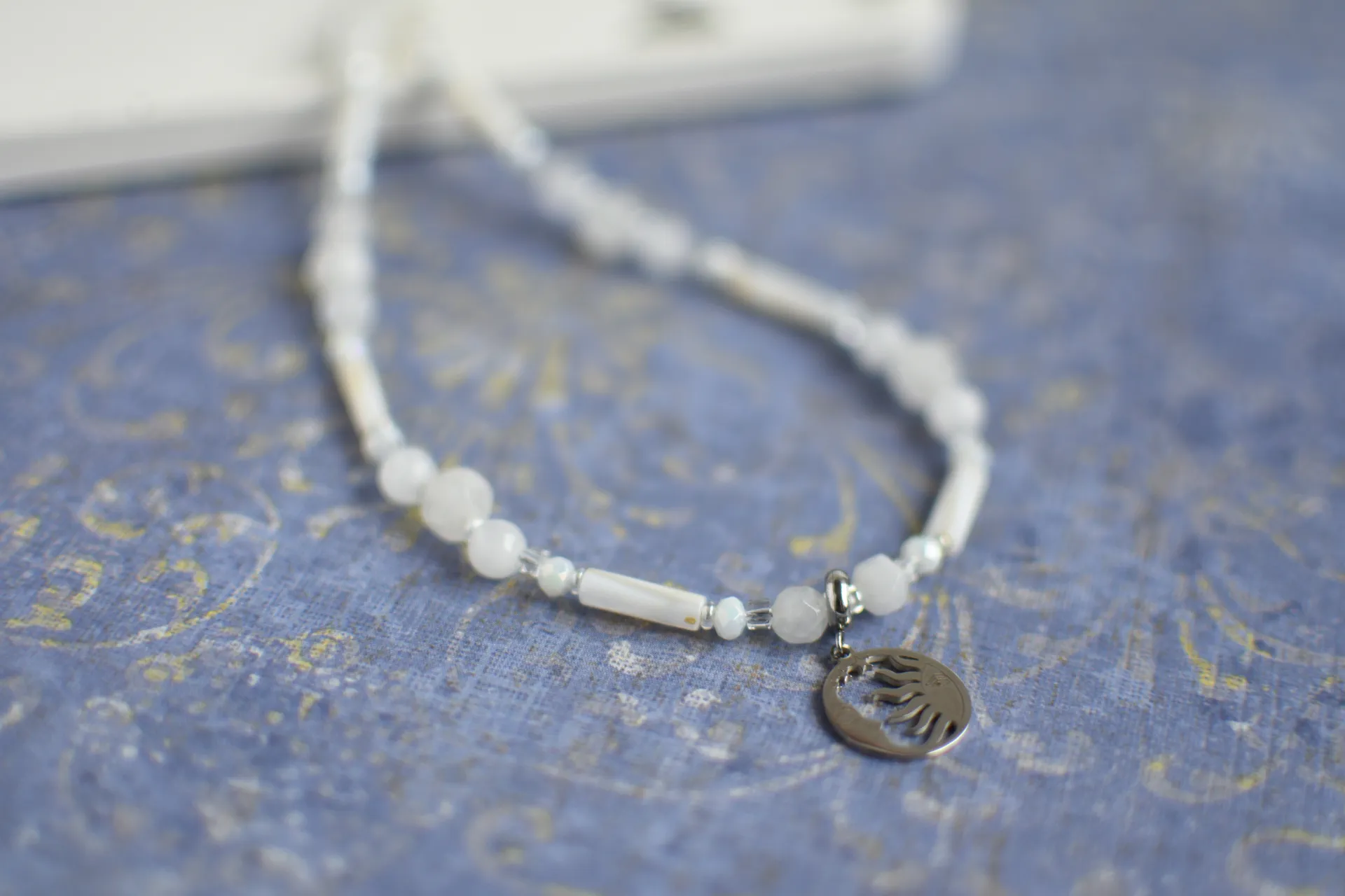 Подвеска с изображением солцна и месяца на короткой цепочке с натуральными камнями.