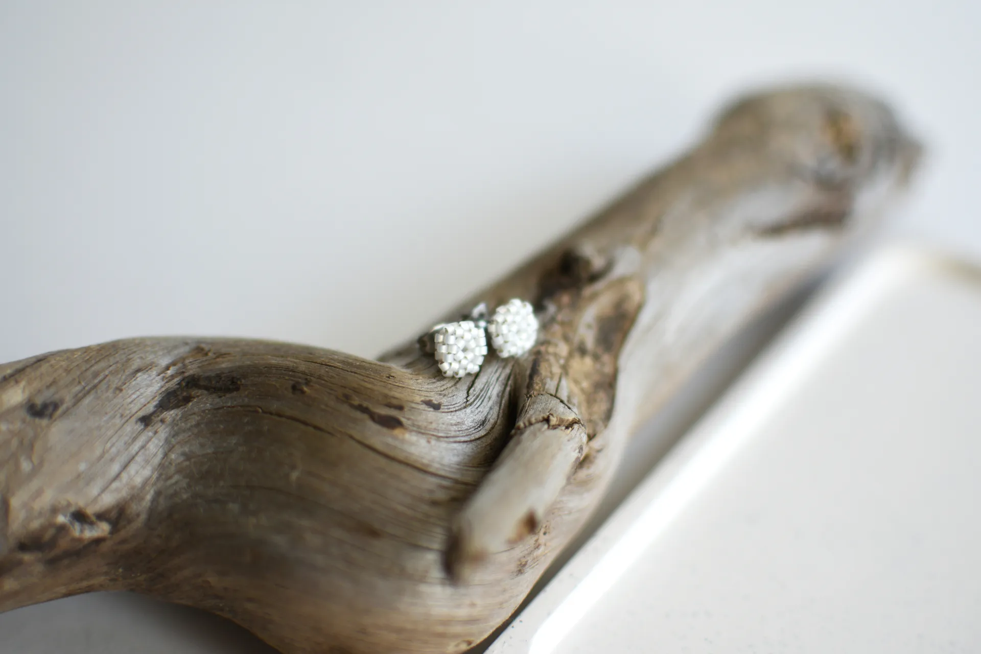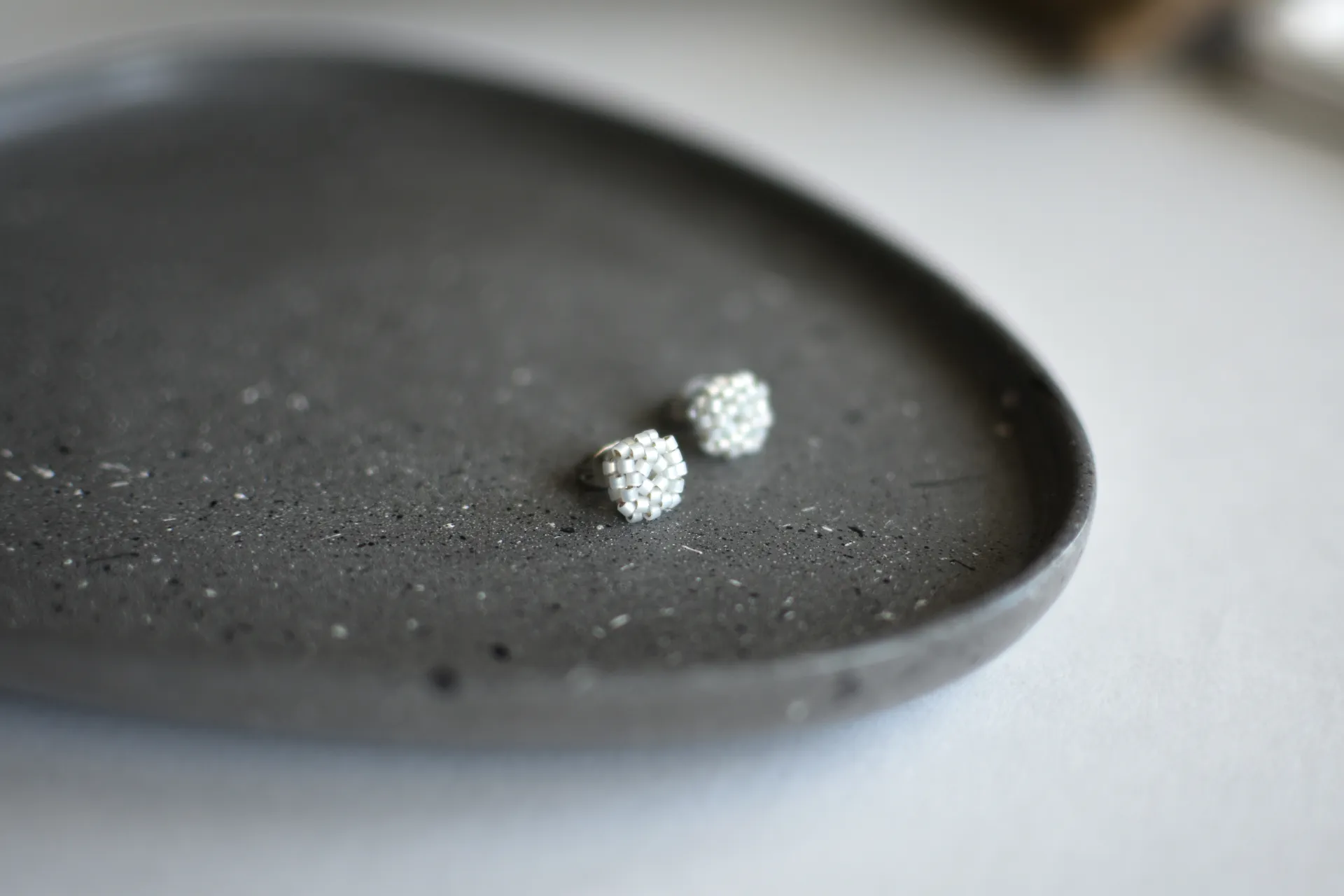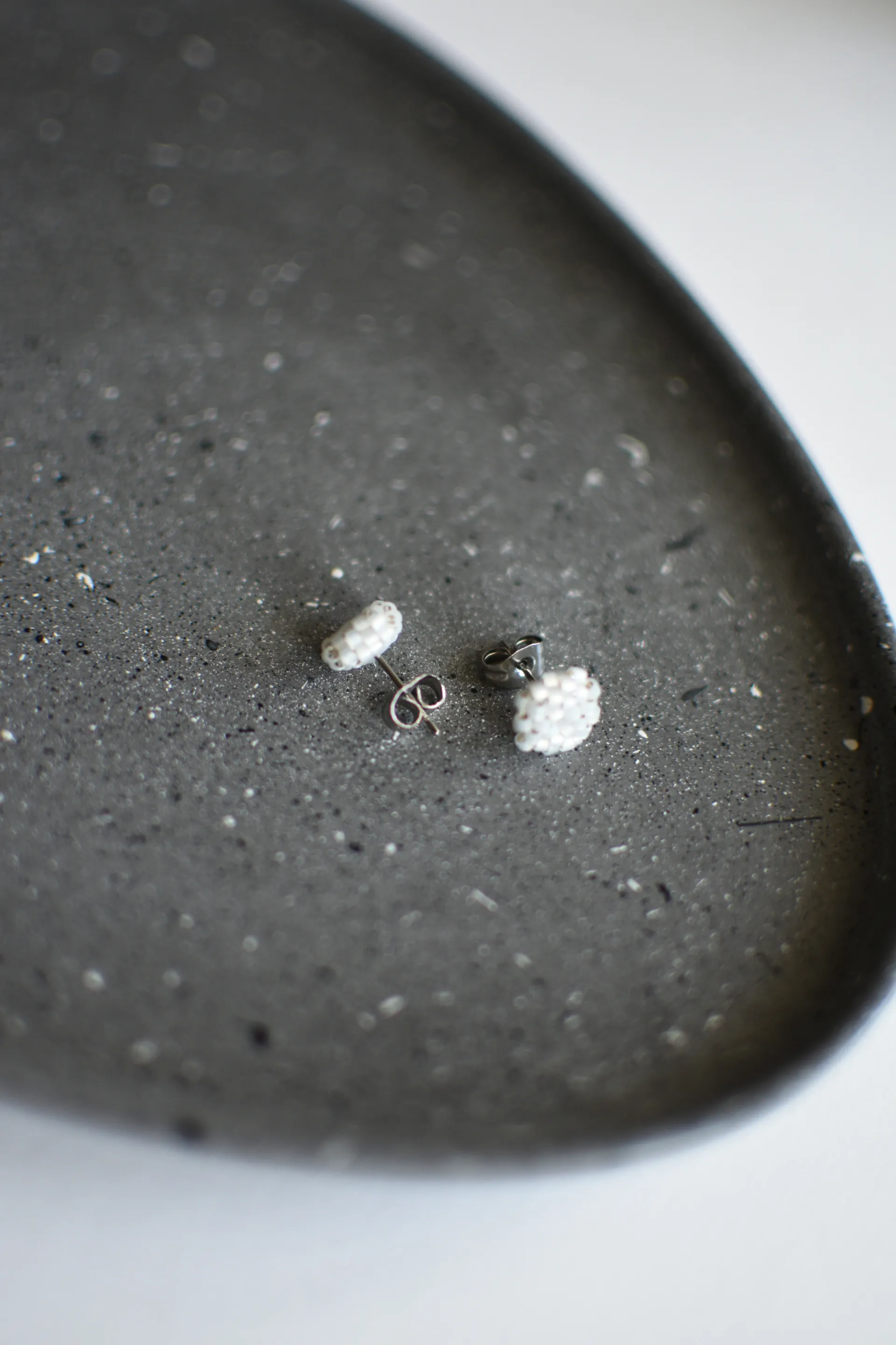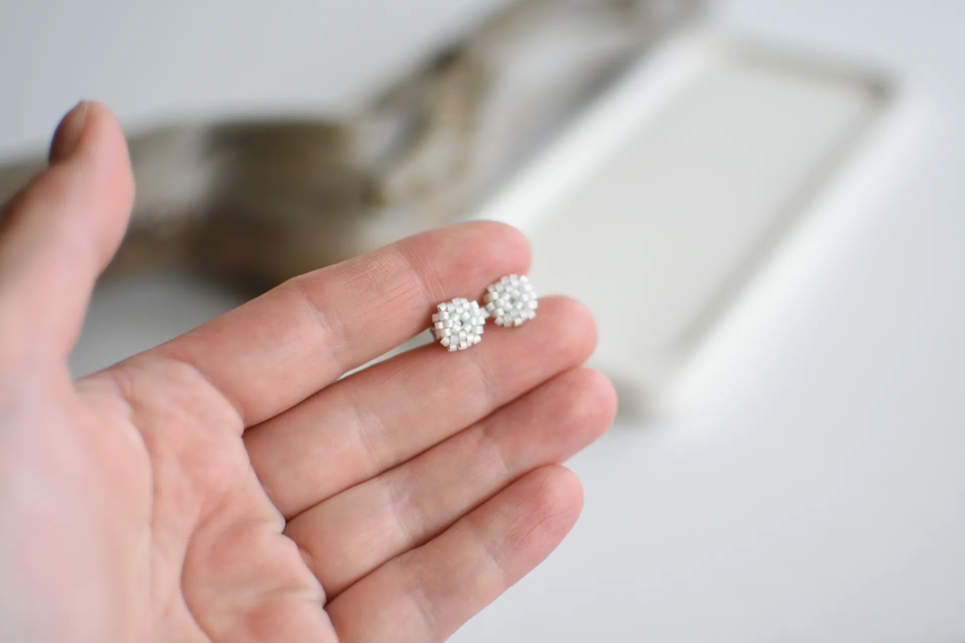 Миниатюрные серьги пуссеты из бисера опалового белого цвета.