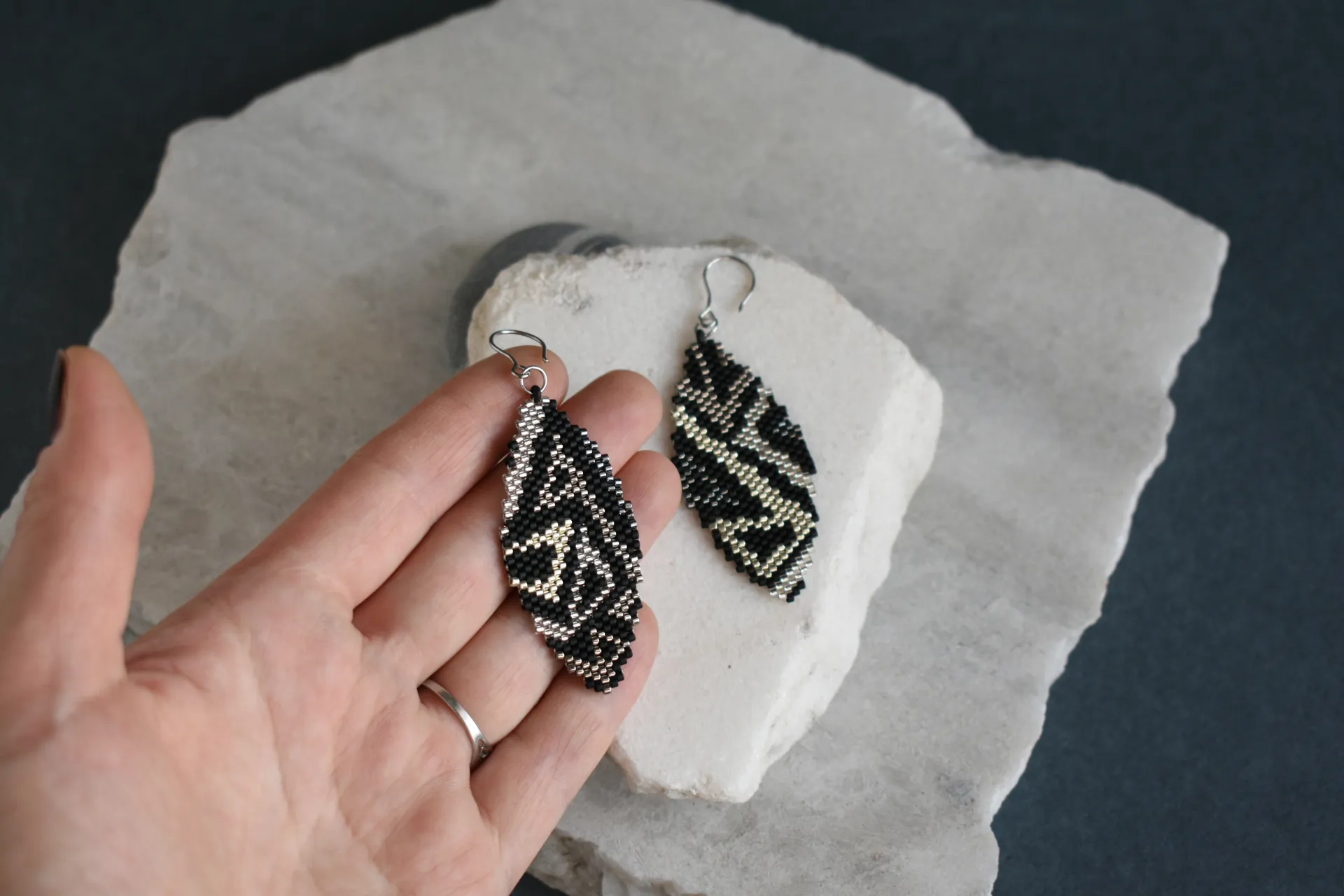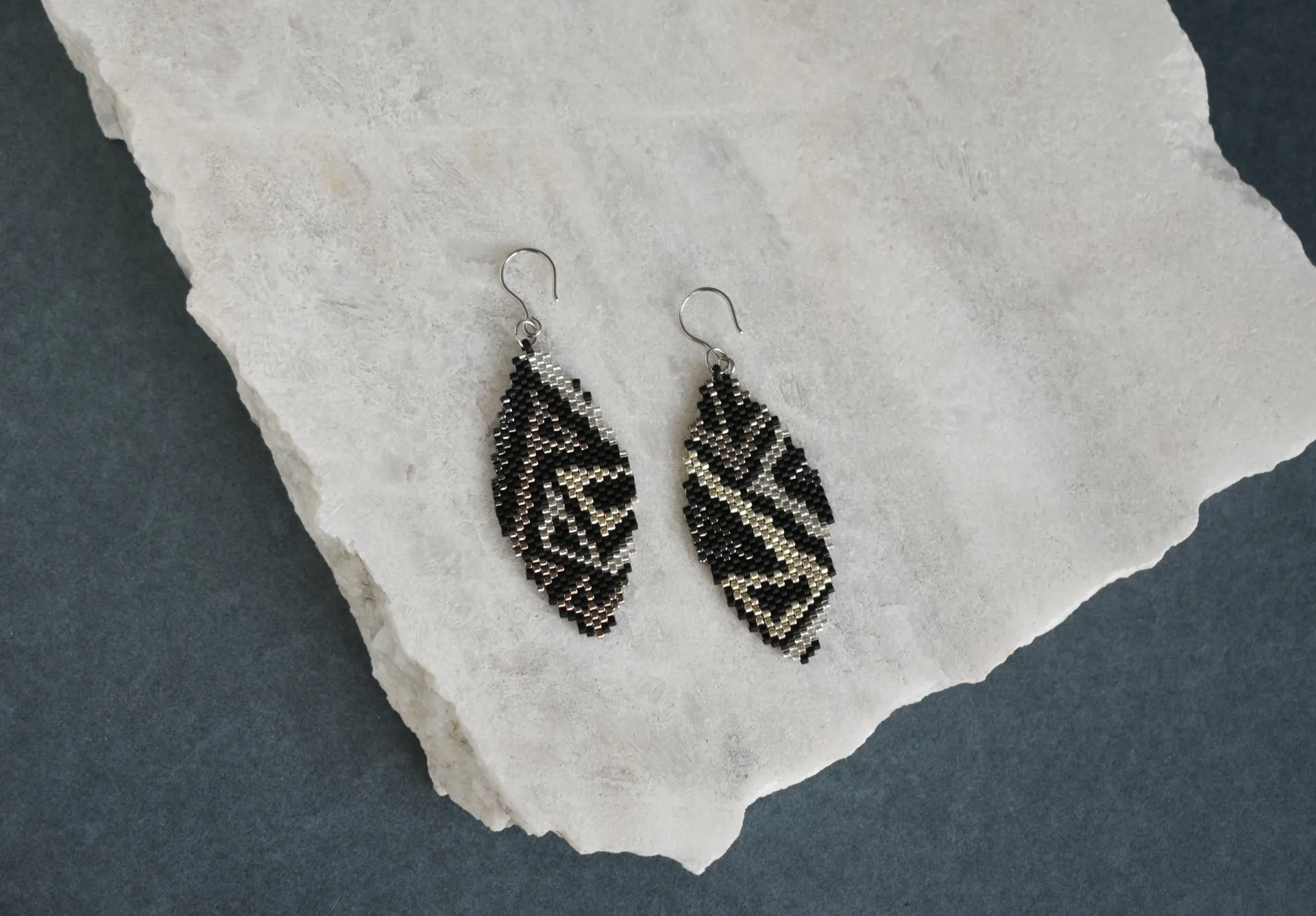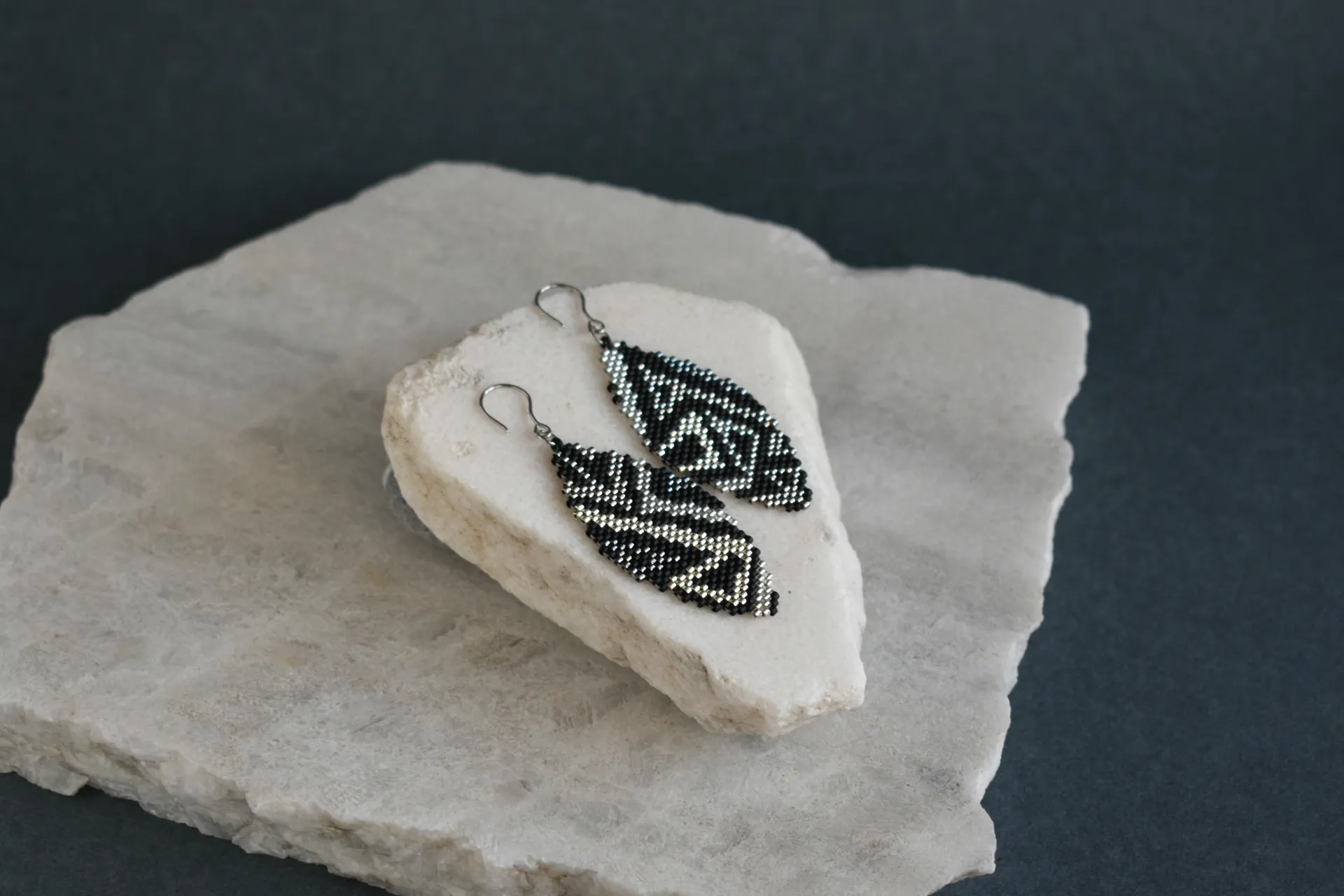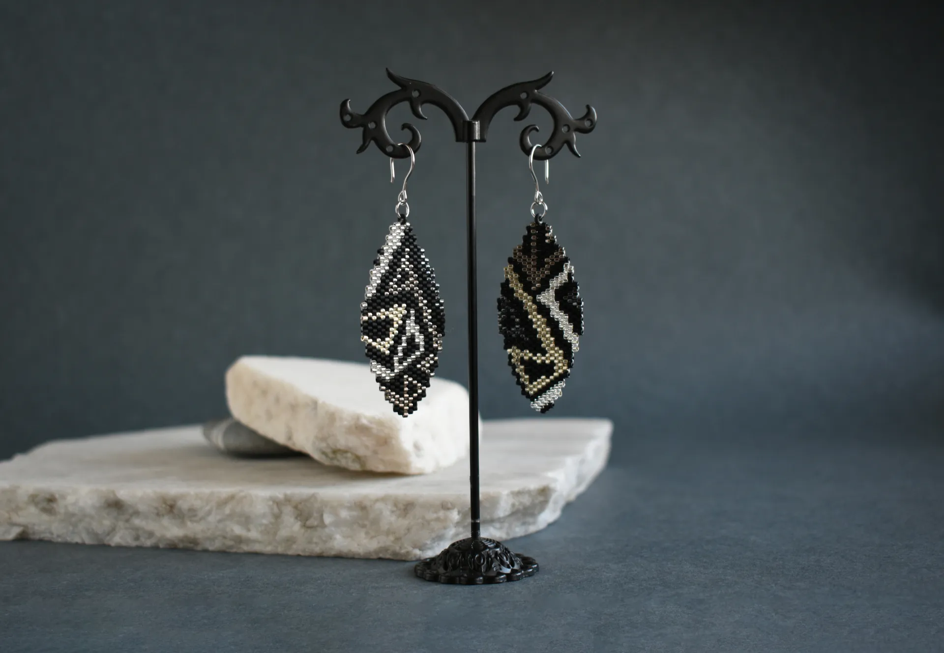Геометрические серьги с абстрактным рисунком из металлических оттенков на матовом черном фоне. Современный минимализм с акцентом на индивидуальность.