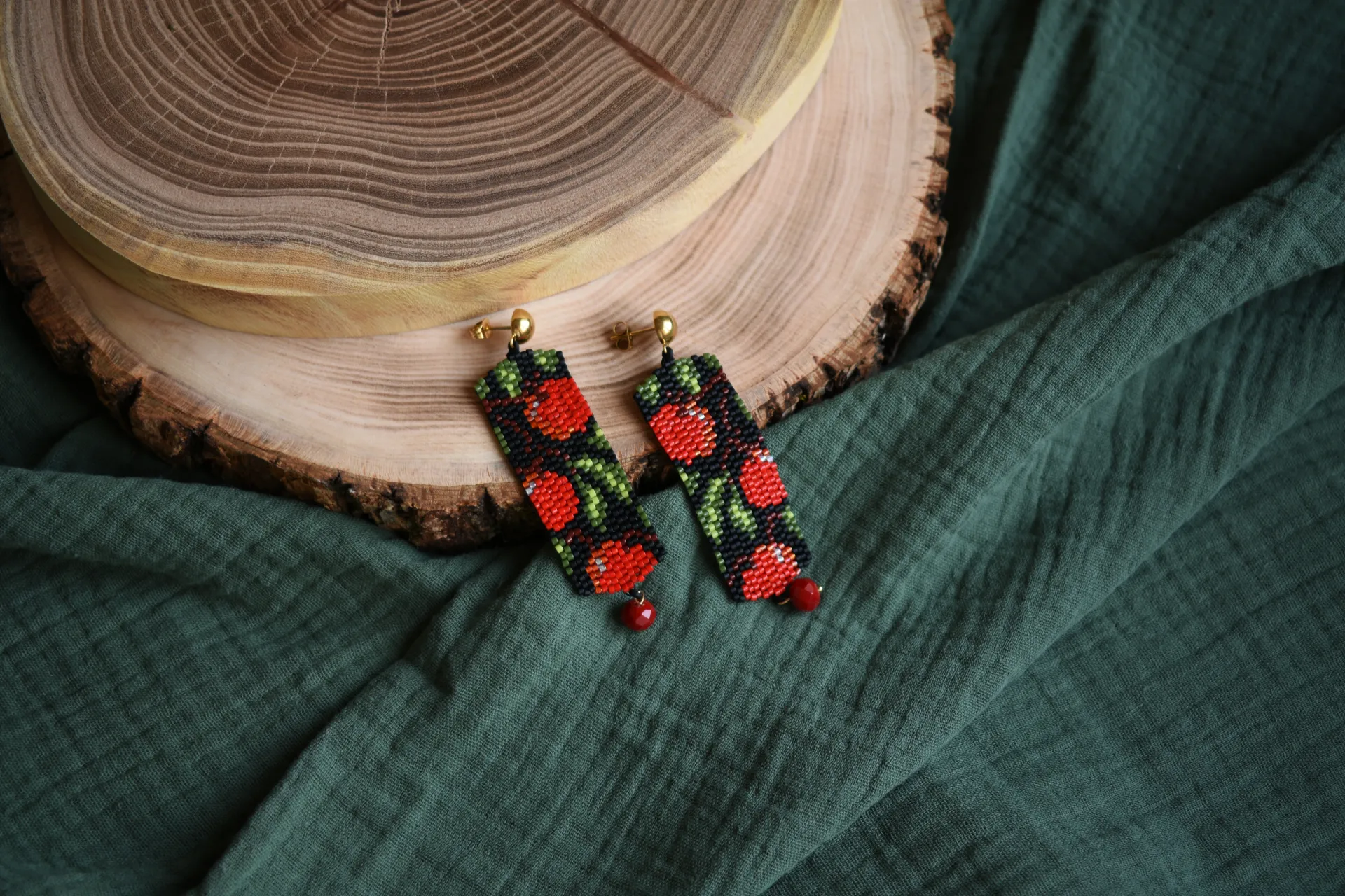 Эффектные серьги-гвоздики. Яркие красные яблоки на черном фоне по авторской схеме.