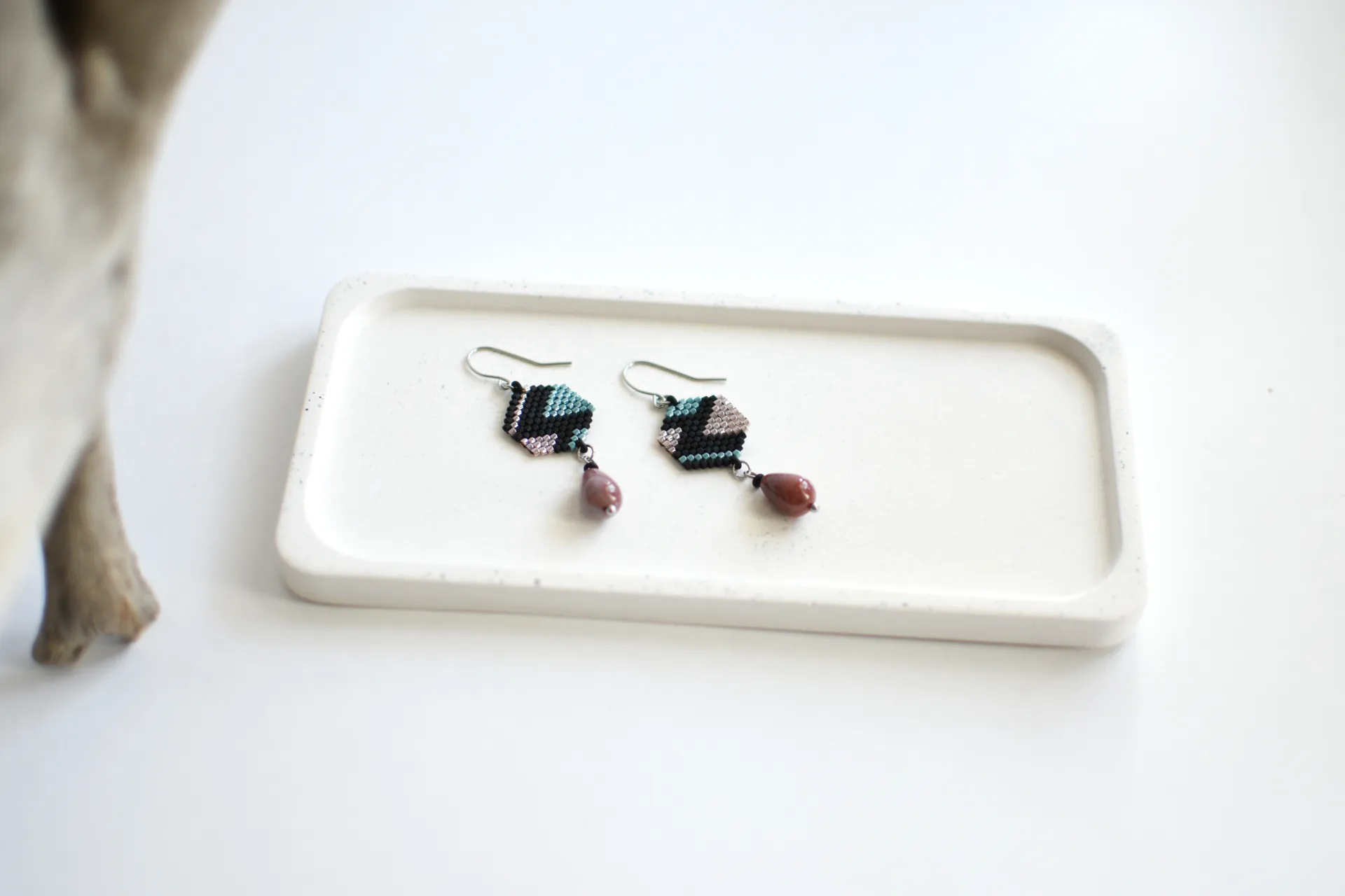 Небольшие асимметричные серьги из бисера с каплями индийской яшмы.