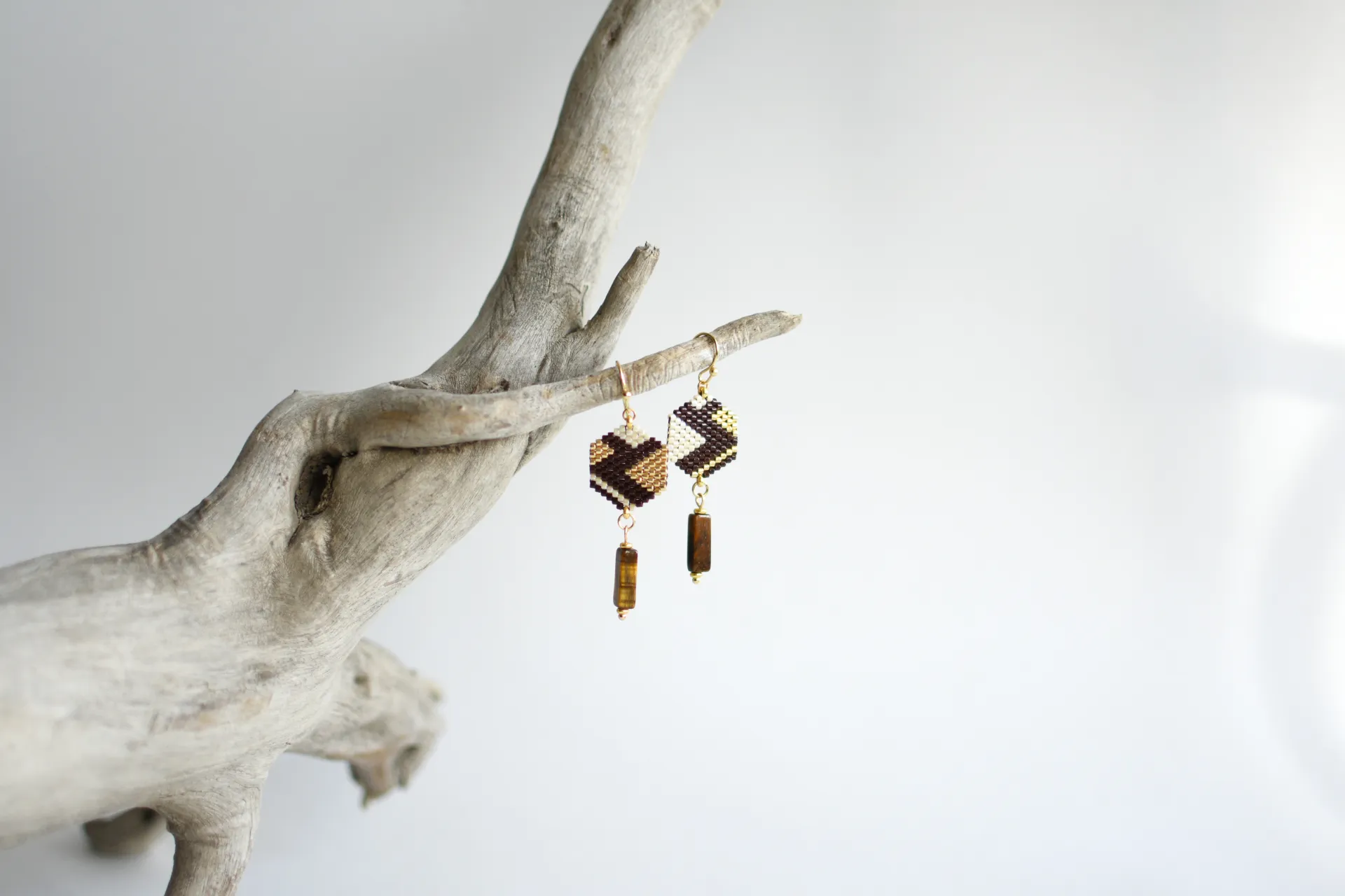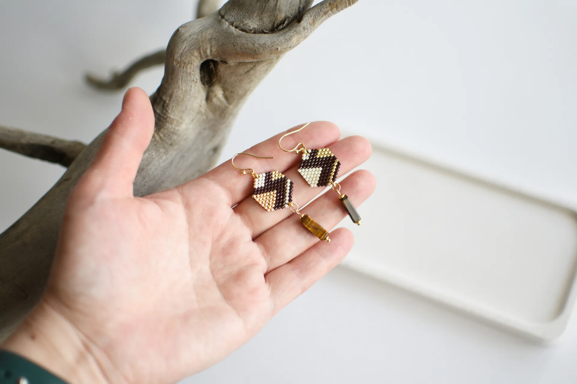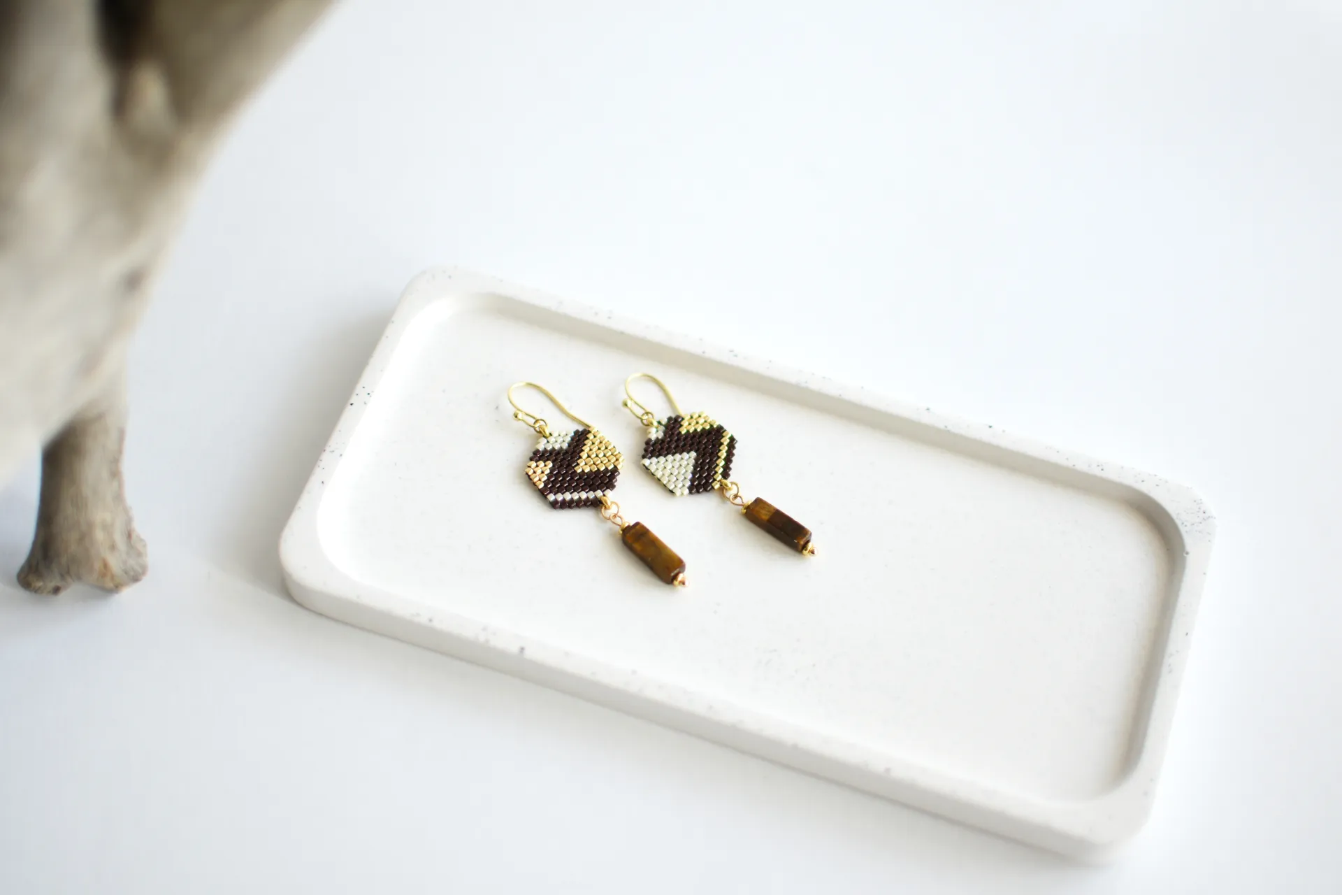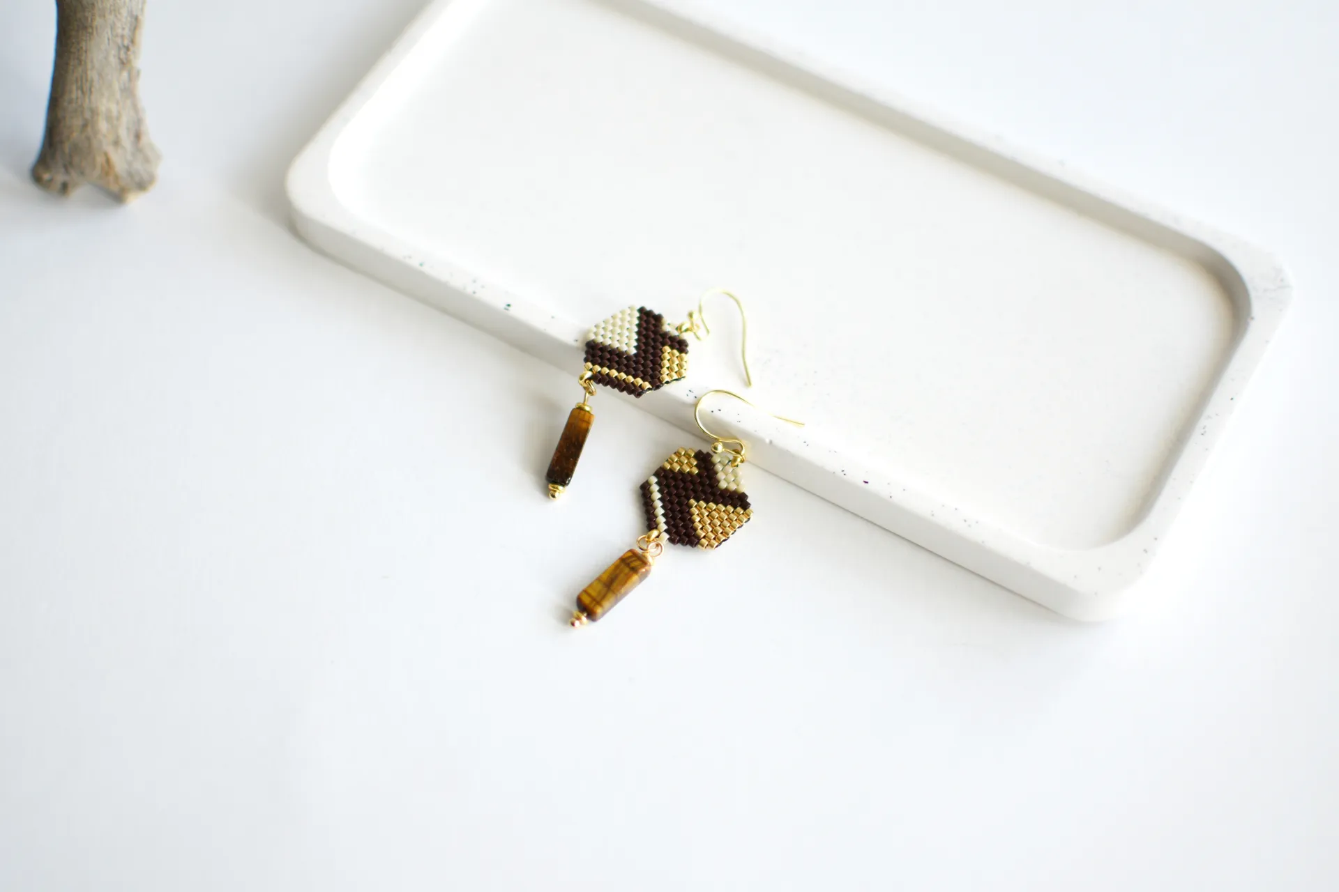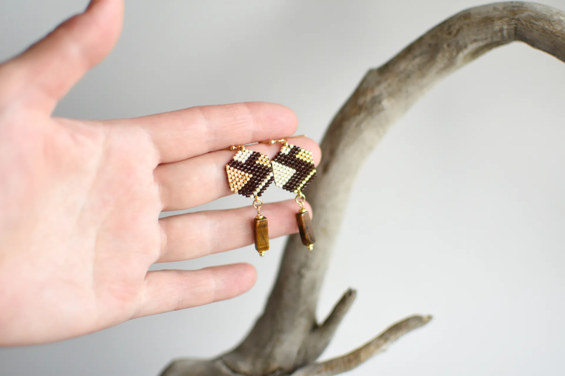 Небольшие серьги с асимметричным рисунком и бусинами тигрового глаза.