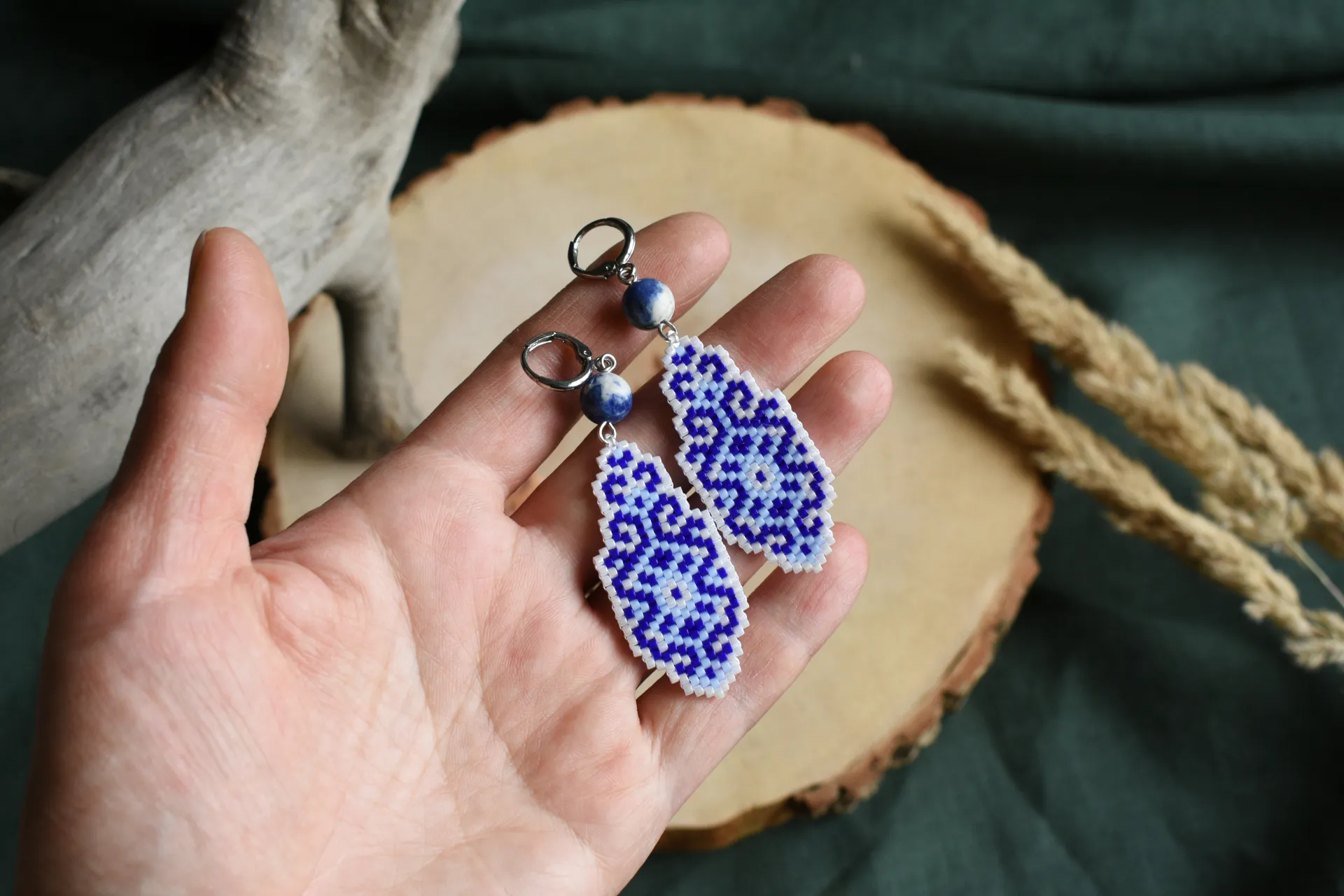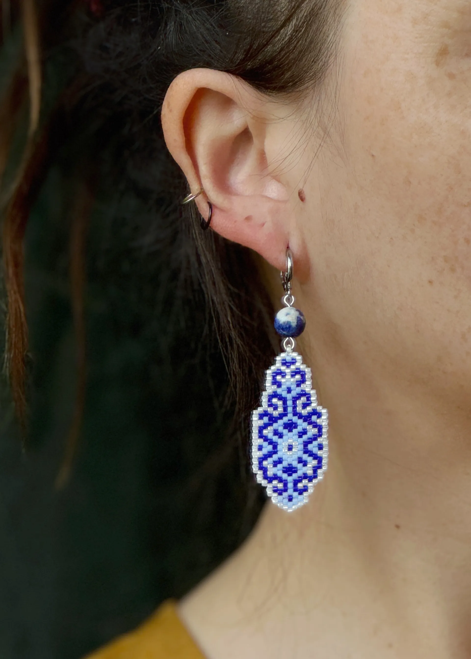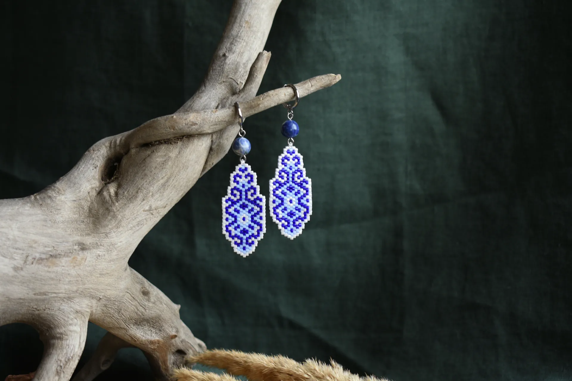 Серьги из бисера с орнаментом с всине-белых тонах. Вдохновлены узорами керамики, дополнены бусинами натурального камня - содалита.