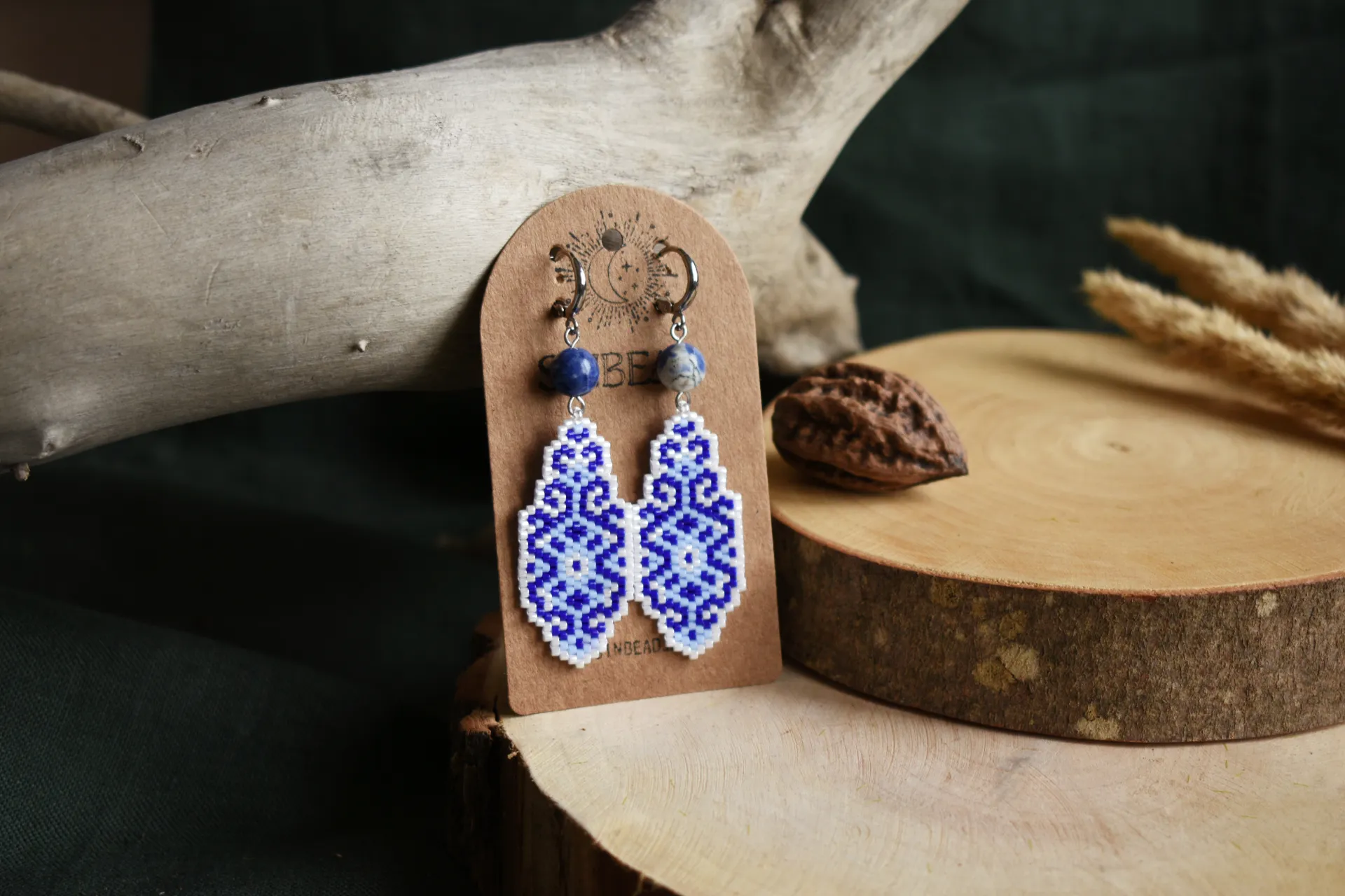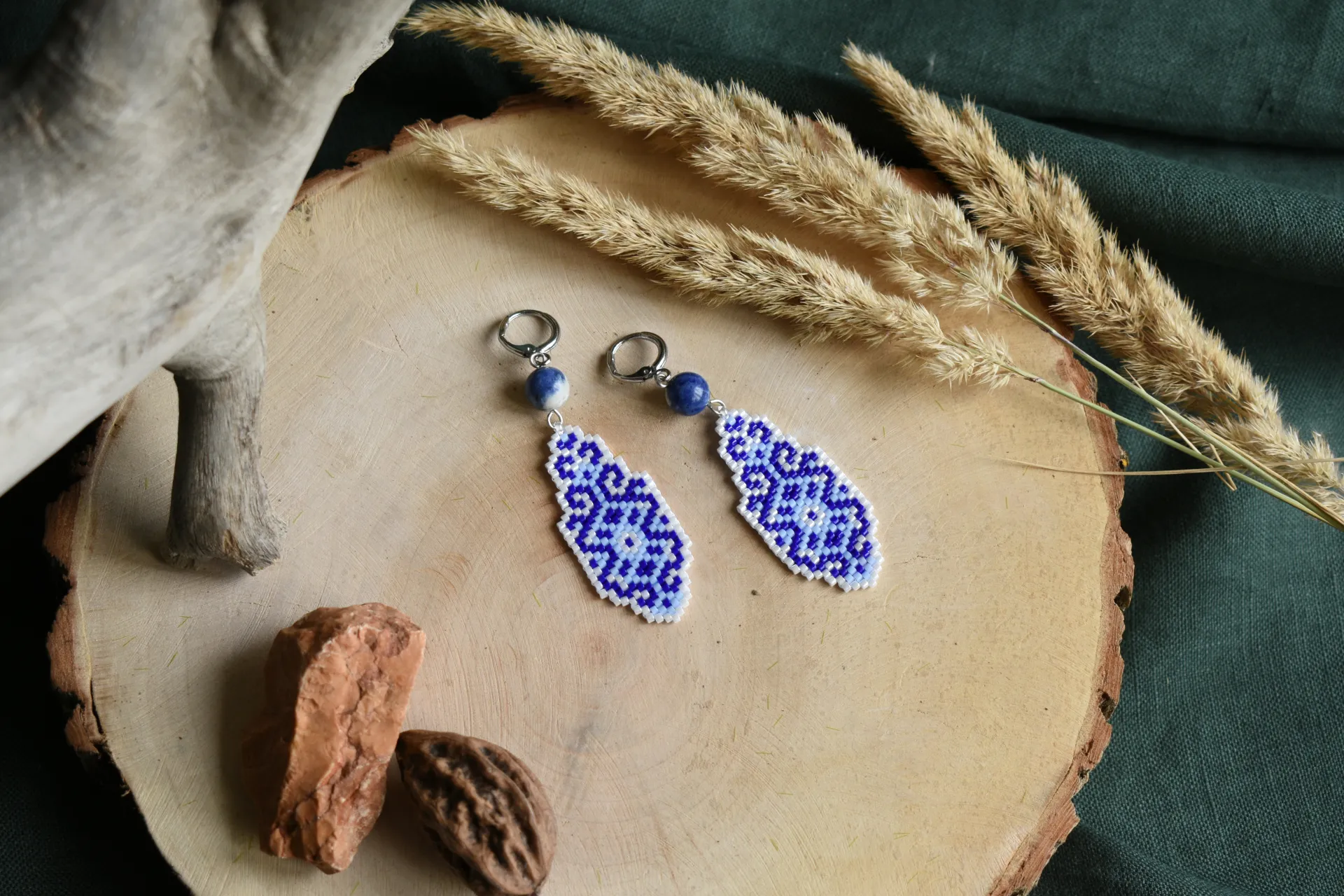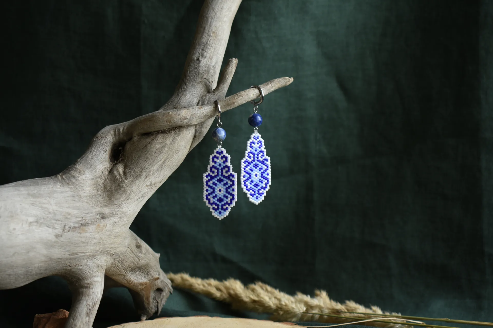 Серьги из бисера с орнаментом с всине-белых тонах. Вдохновлены узорами керамики, дополнены бусинами натурального камня - содалита.