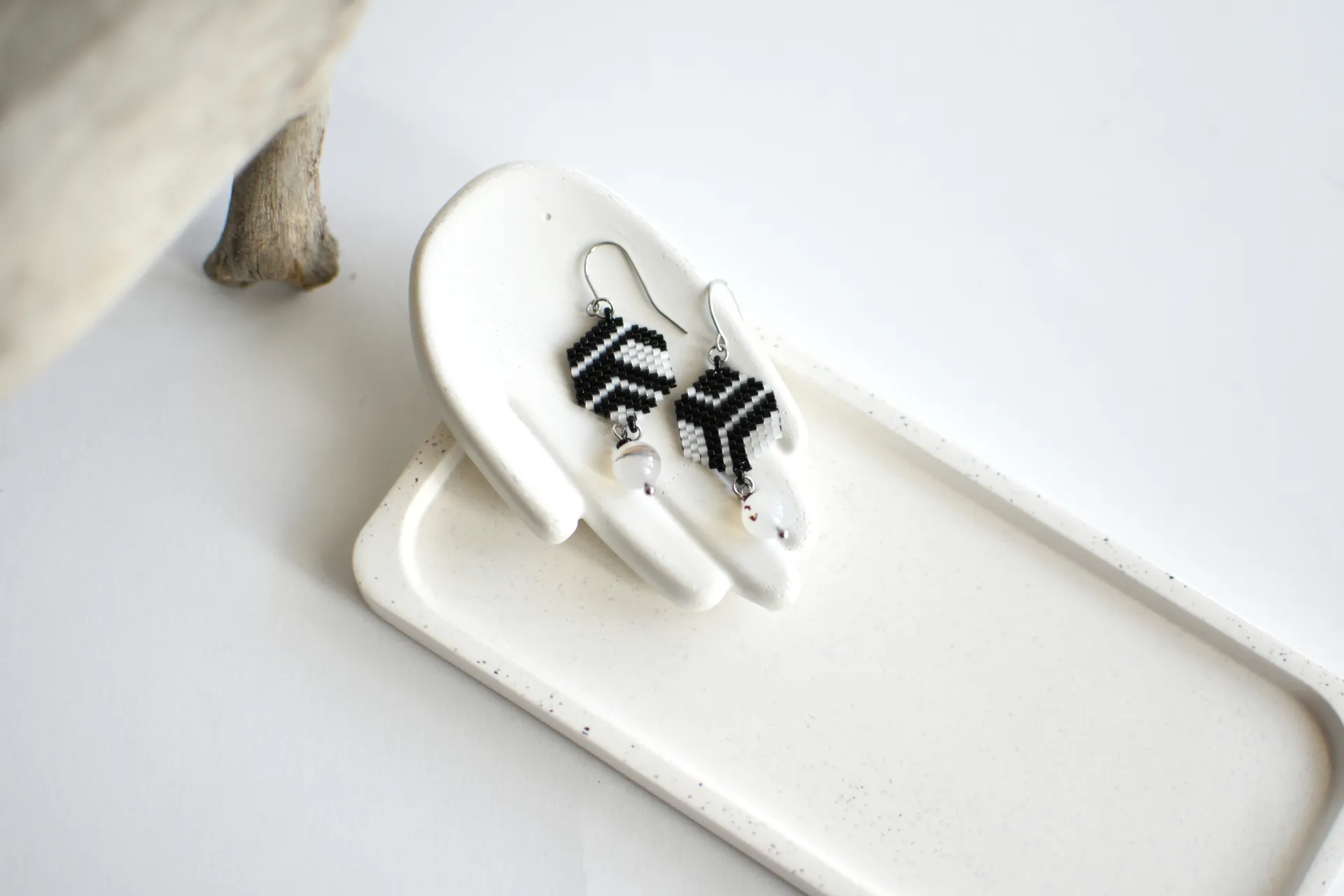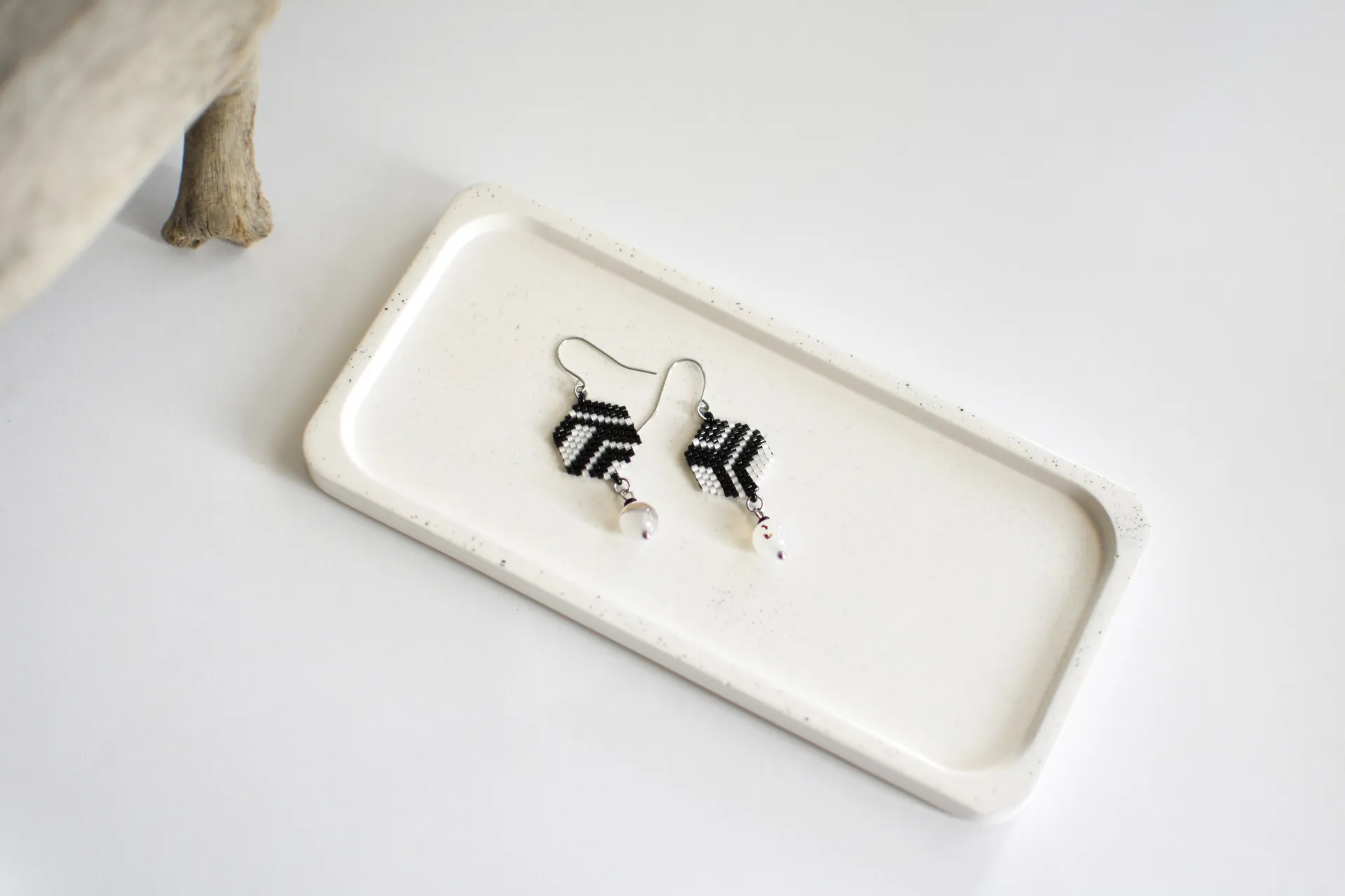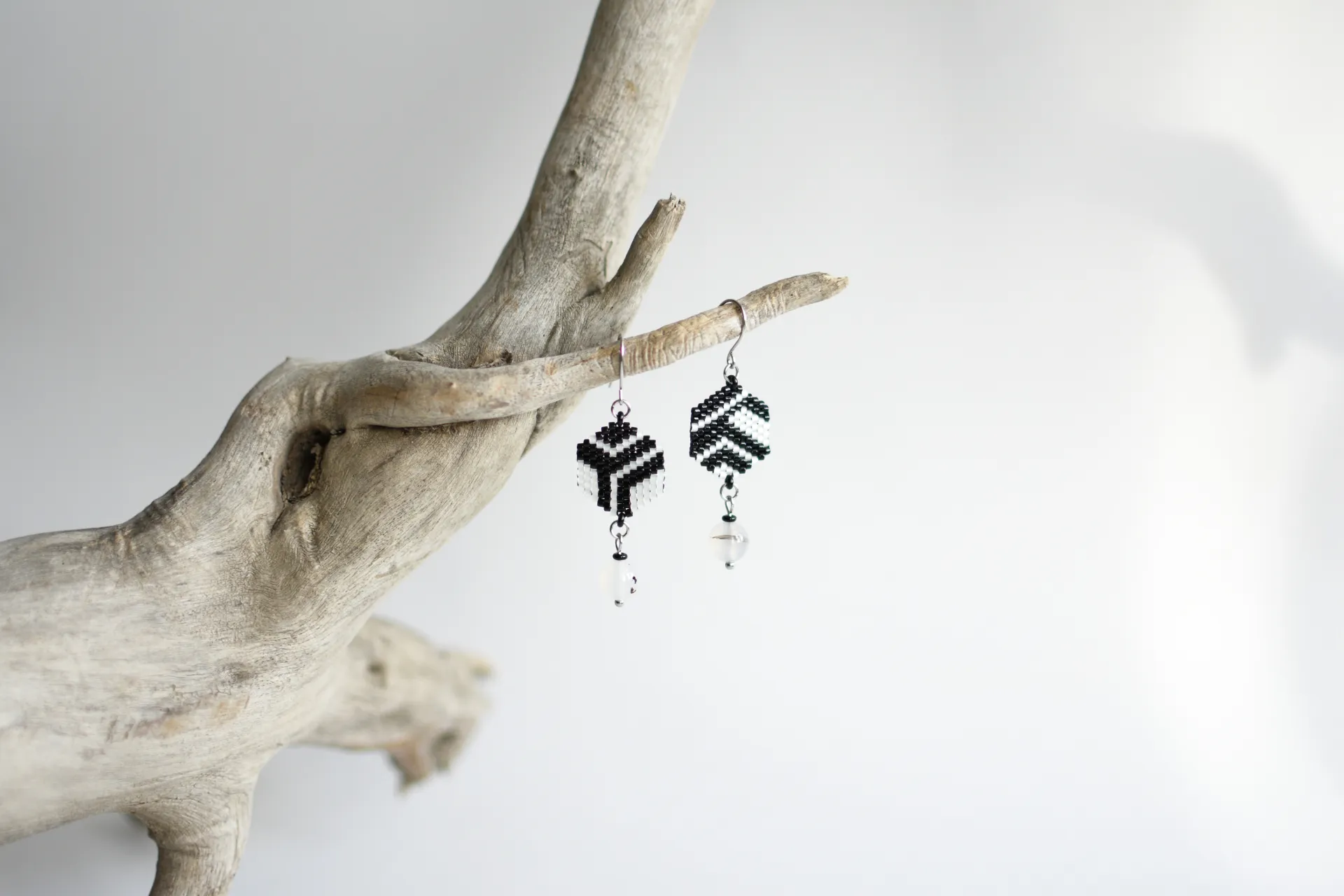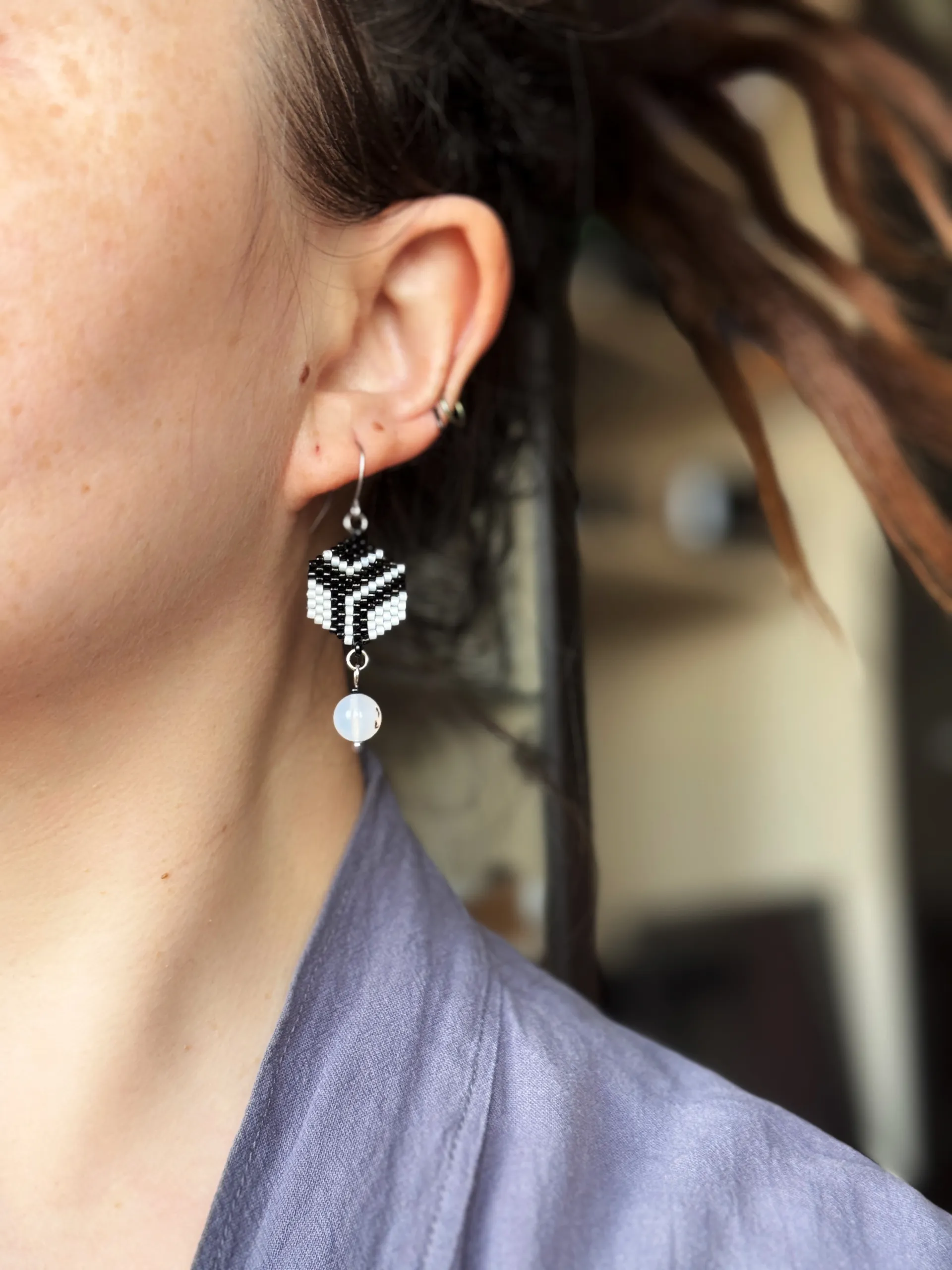 Небольшие чёрно-белые серьги из бисера с асимметричным рисунком и полупрозрачными бусинами халцедона. На бусинах есть природные вкрапления.